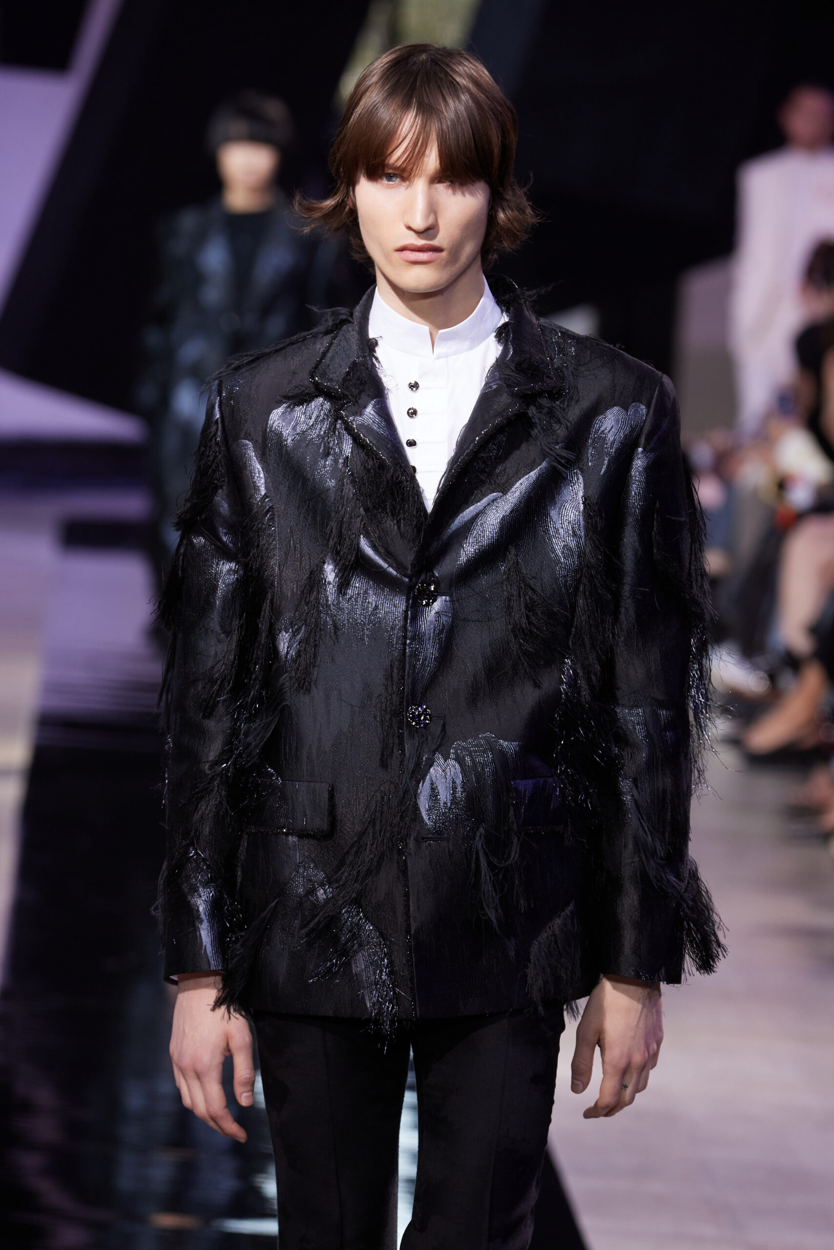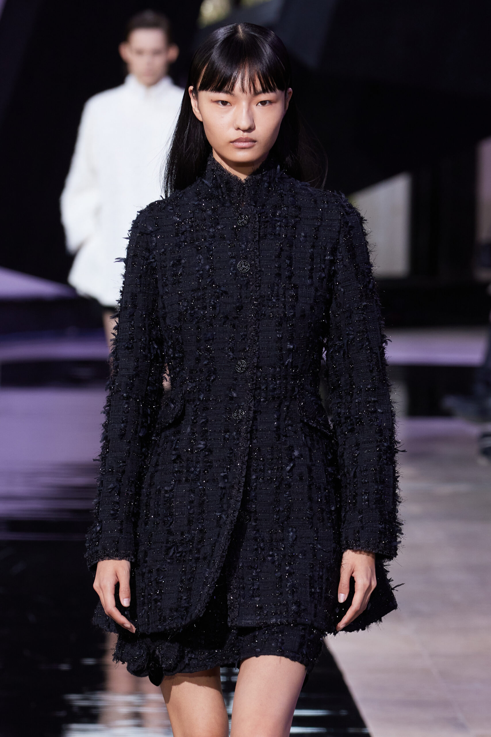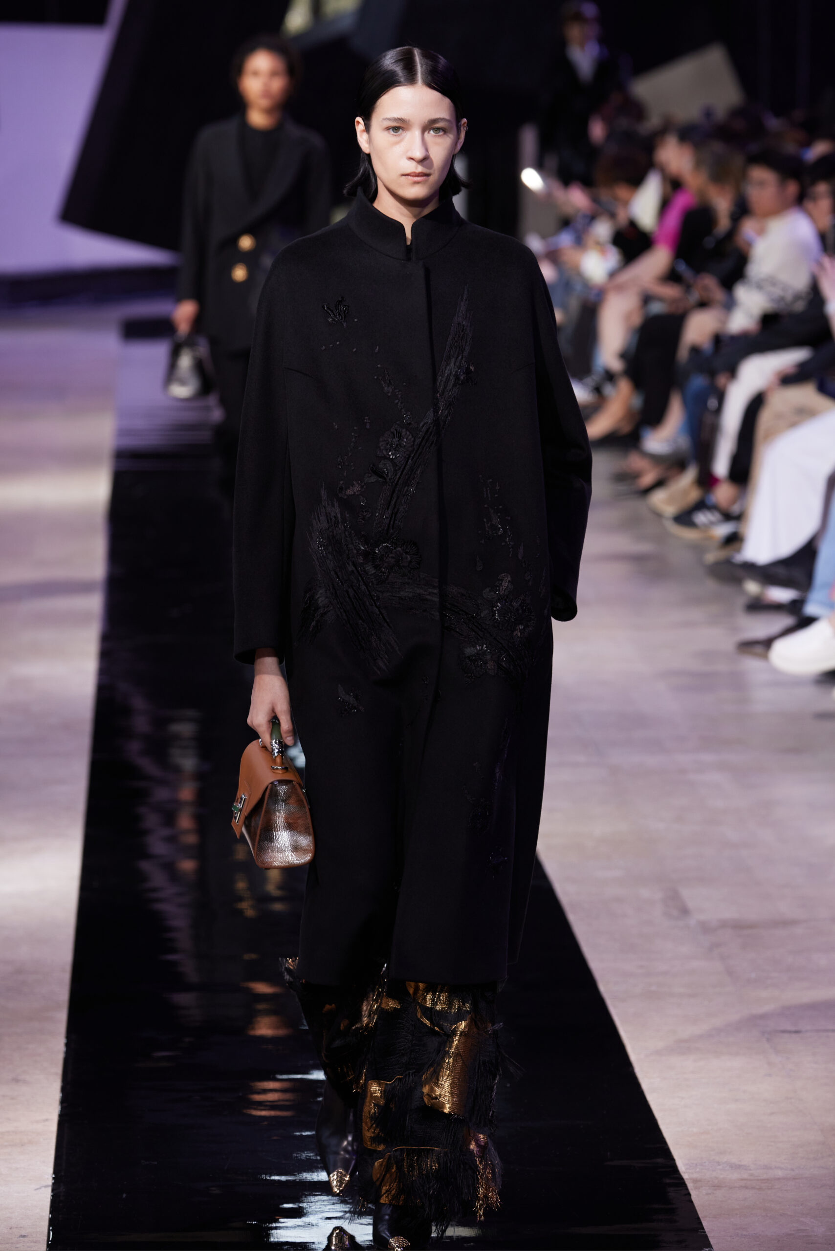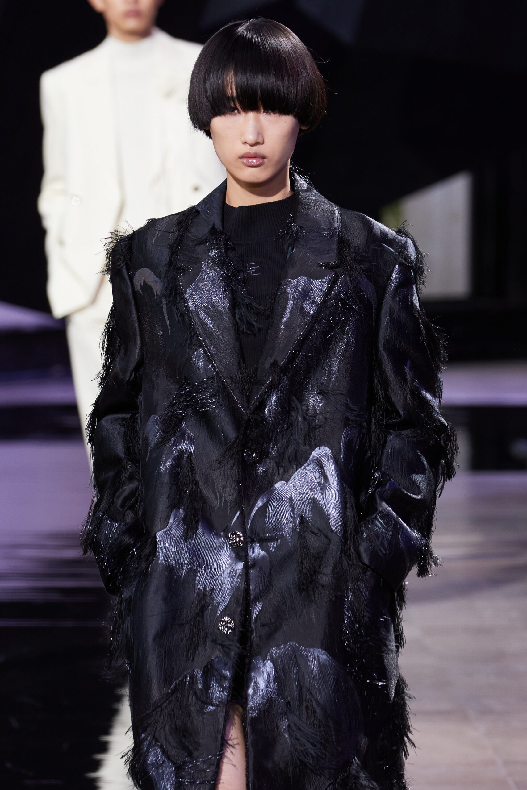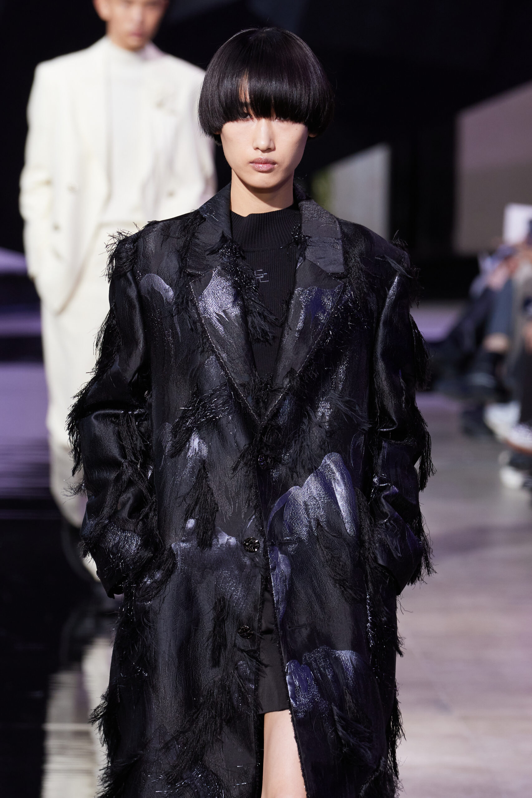Les vêtements, principalement de couleur encre, révèlent des détails sophistiqués comme des fils dorés incrustés dans des jacquards en métal noir, des superpositions de rubans sur de la broderie, des franges noires, et de la laine mohair noire, illustrant la dynamique entre le calme et l’agitation des motifs d’encre.