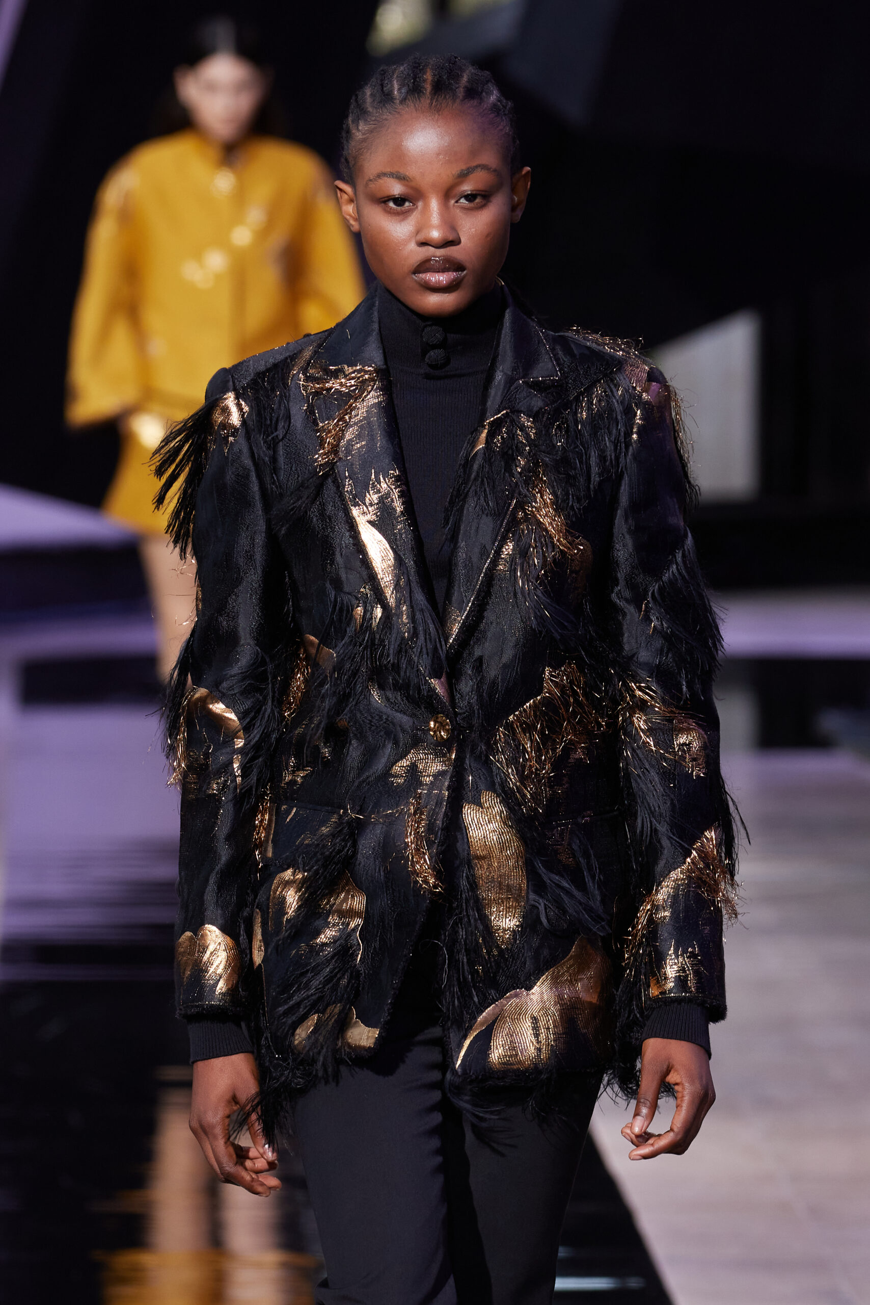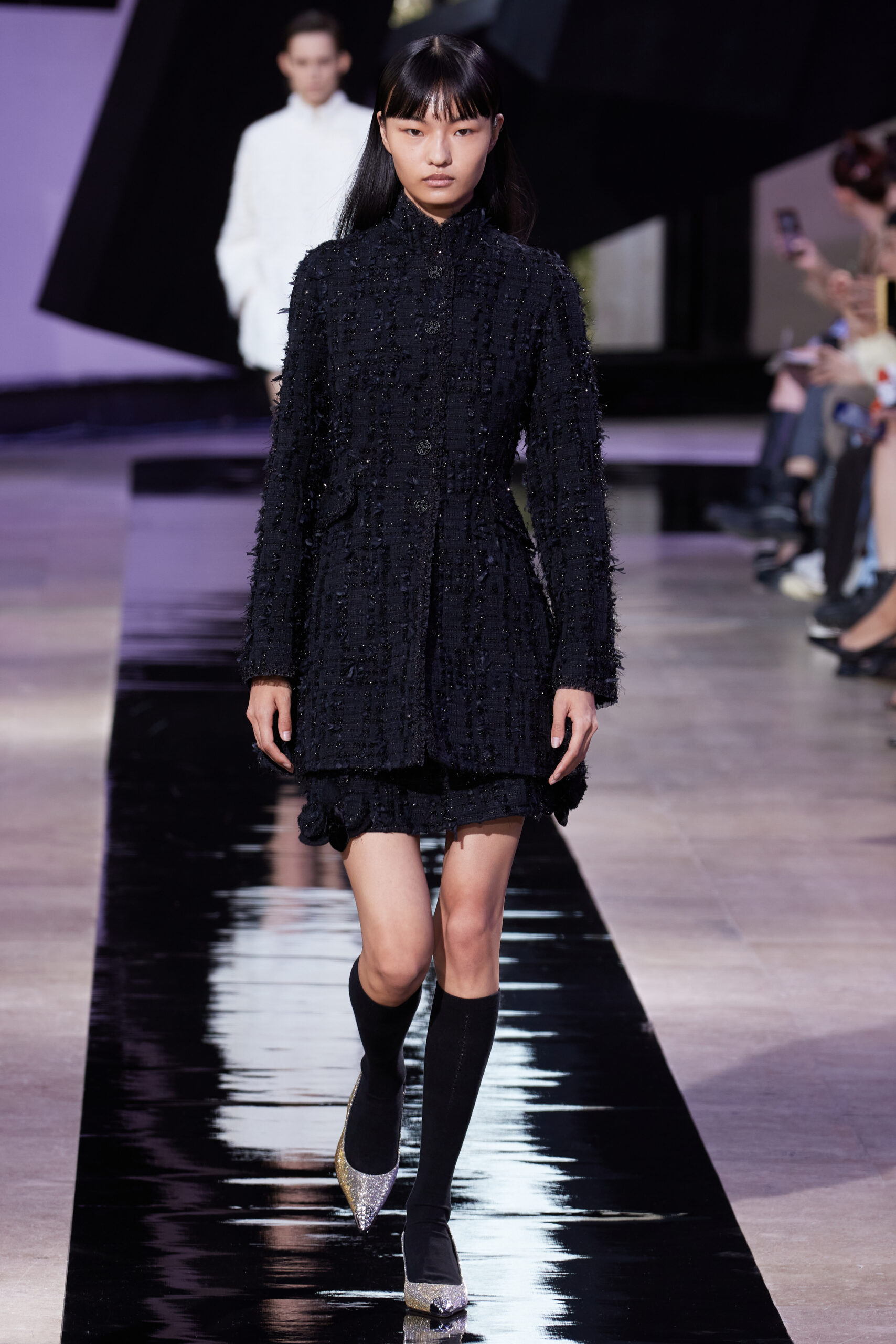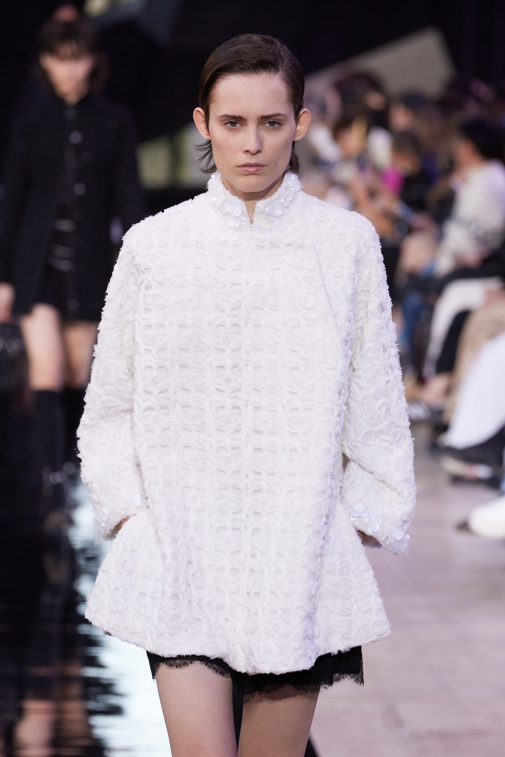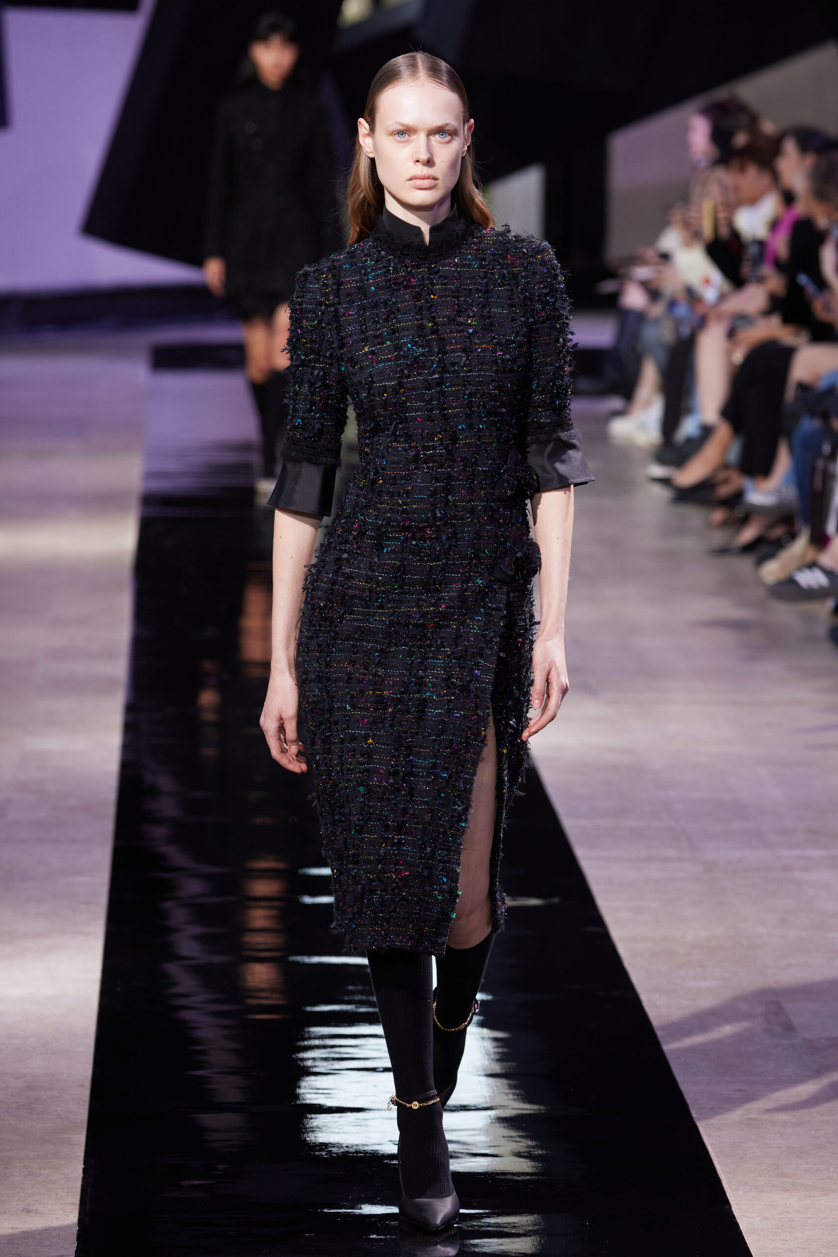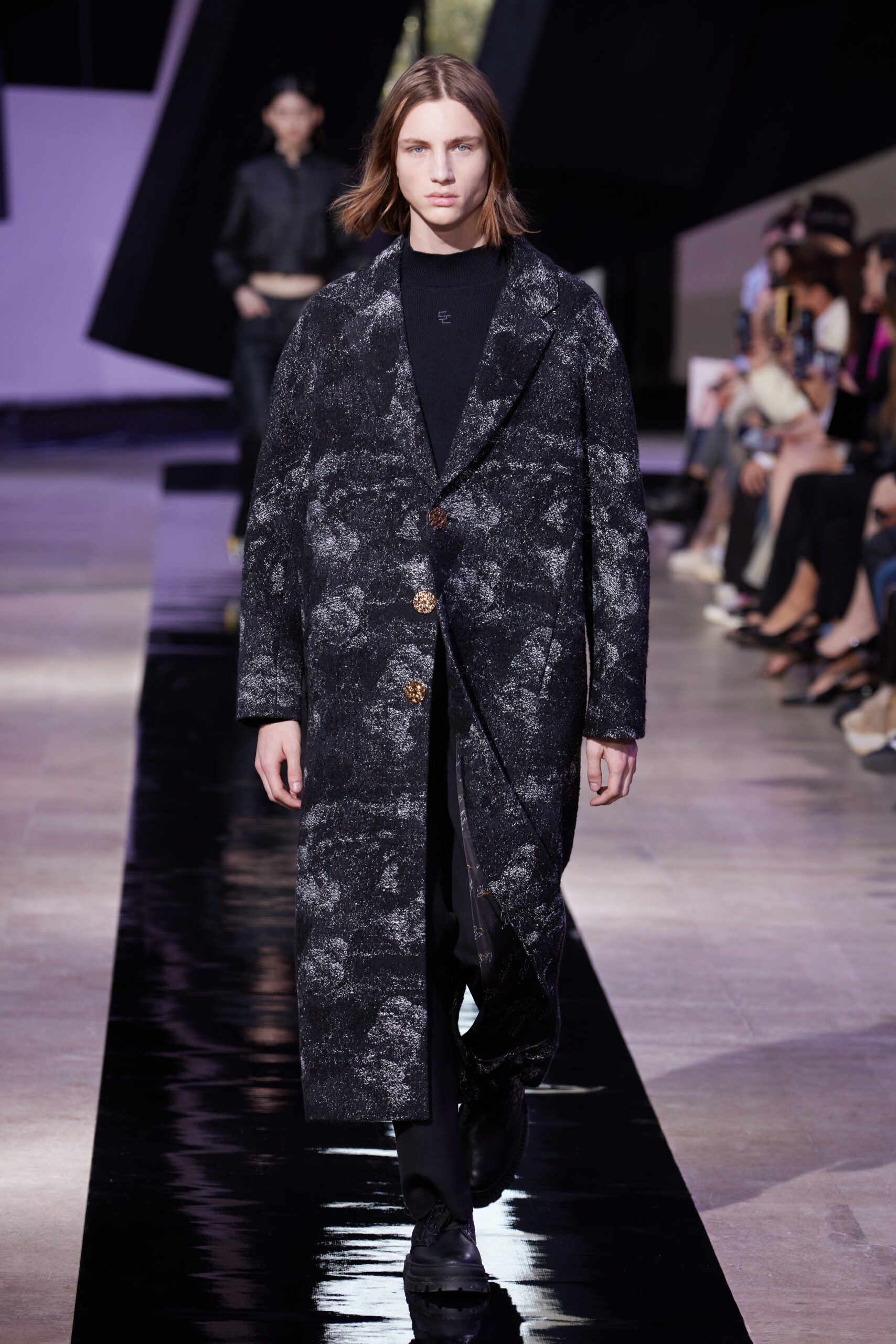 Les vêtements, principalement de couleur encre, révèlent des détails sophistiqués comme des fils dorés incrustés dans des jacquards en métal noir, des superpositions de rubans sur de la broderie, des franges noires, et de la laine mohair noire, illustrant la dynamique entre le calme et l’agitation des motifs d’encre.