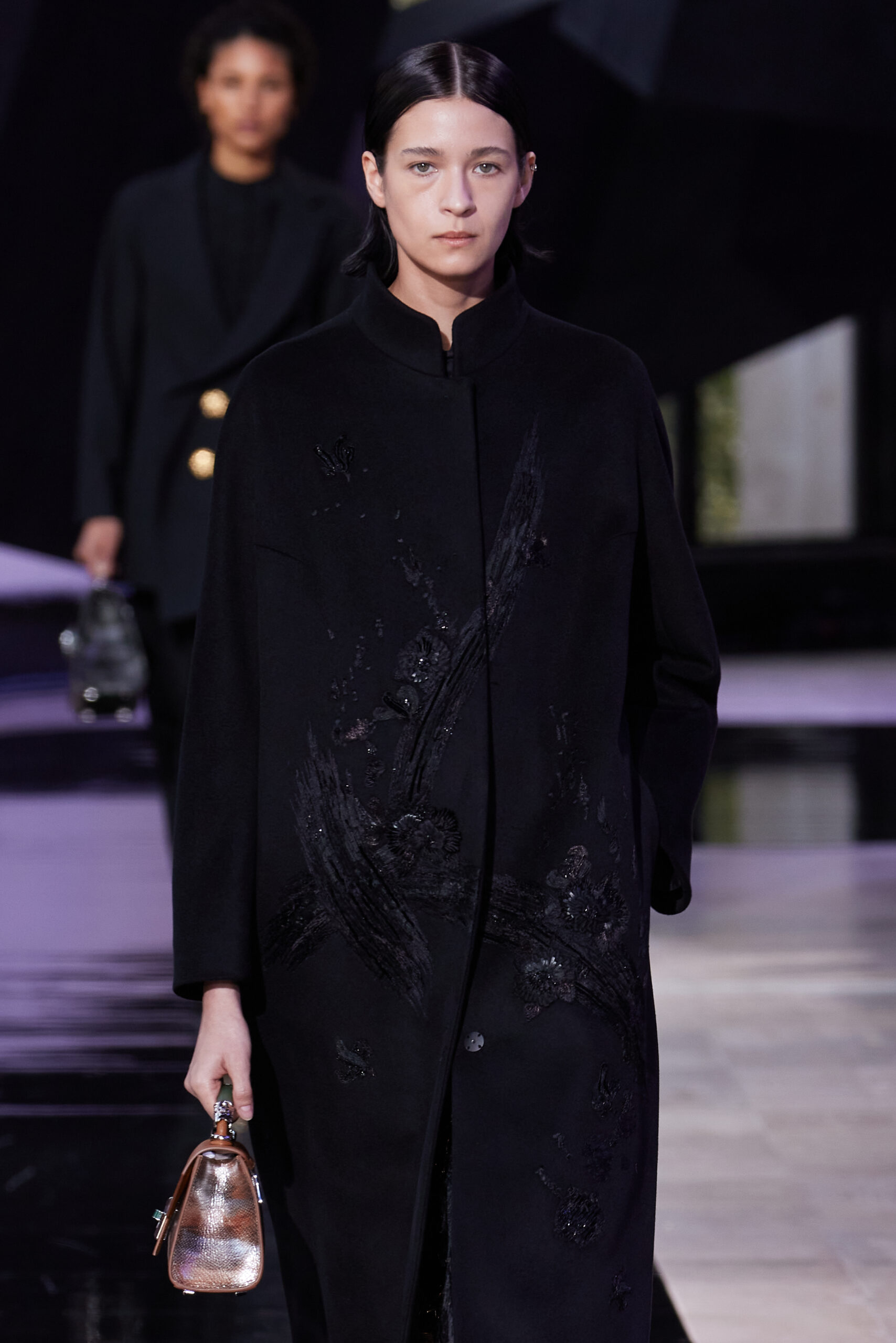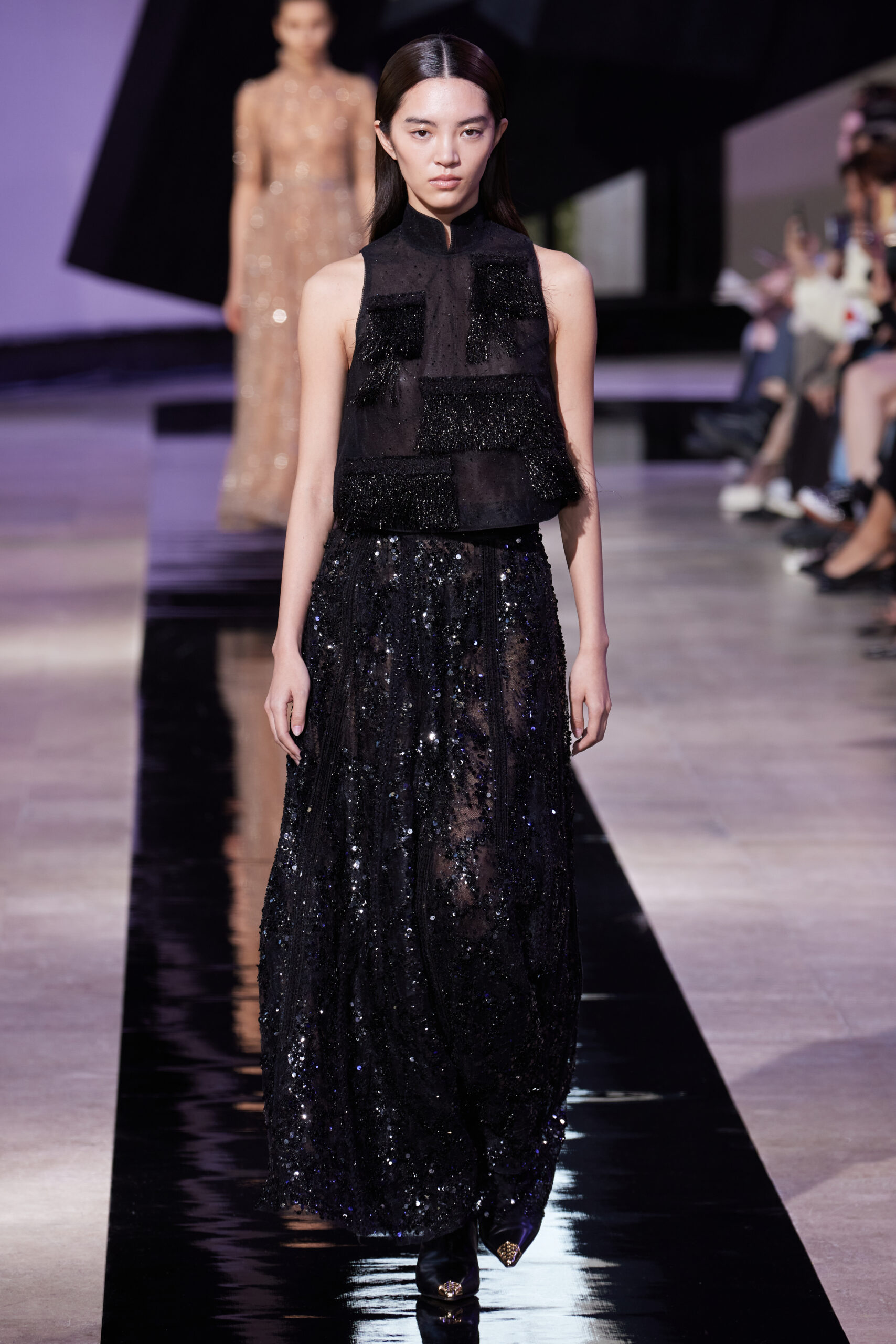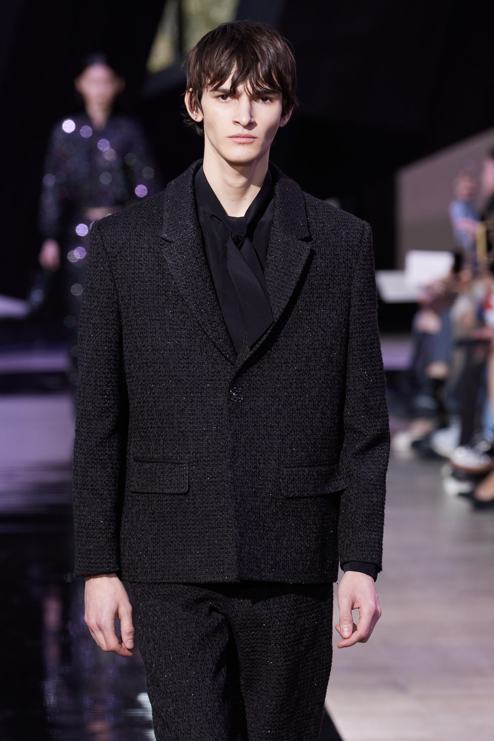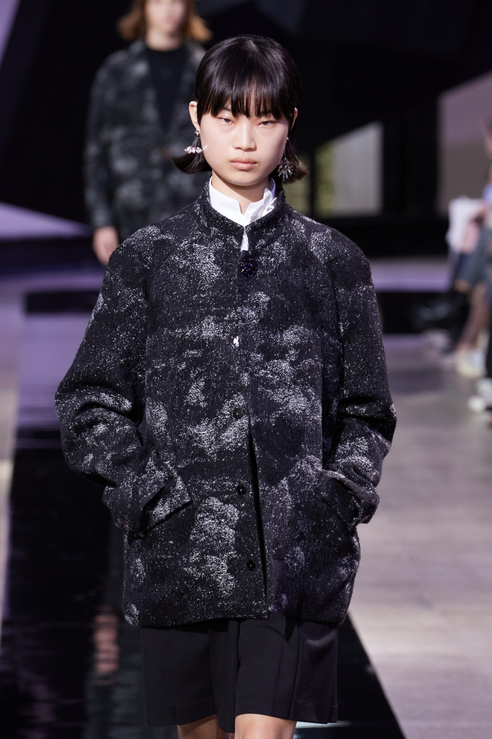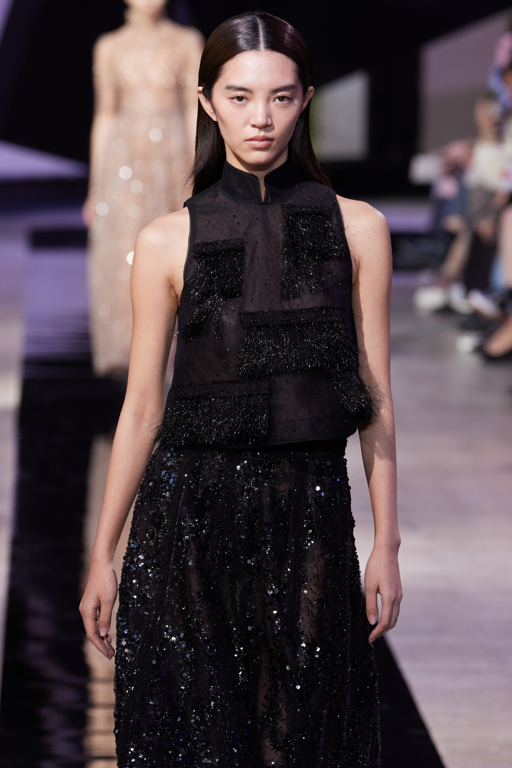 Les vêtements, principalement de couleur encre, révèlent des détails sophistiqués comme des fils dorés incrustés dans des jacquards en métal noir, des superpositions de rubans sur de la broderie, des franges noires, et de la laine mohair noire, illustrant la dynamique entre le calme et l’agitation des motifs d’encre.