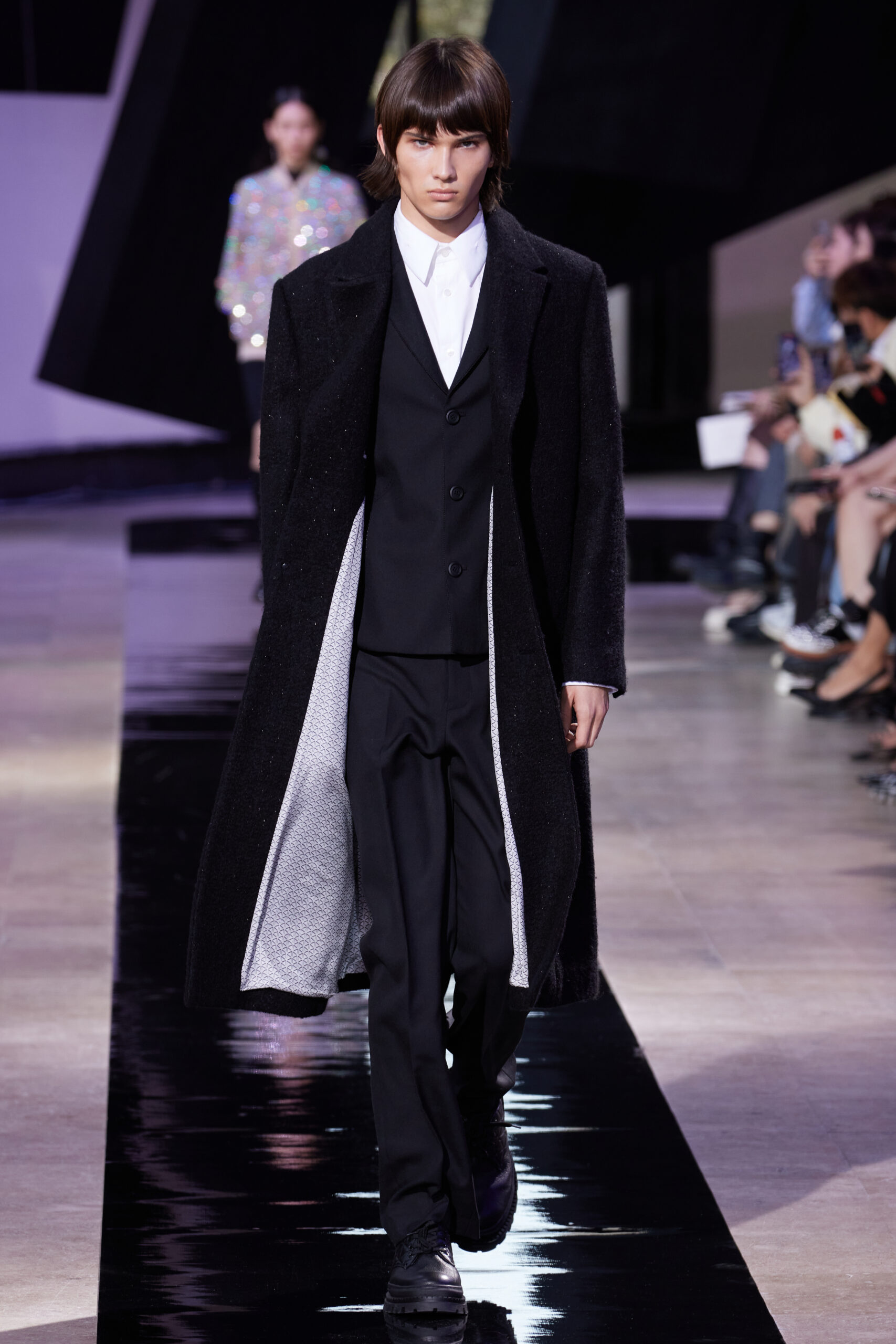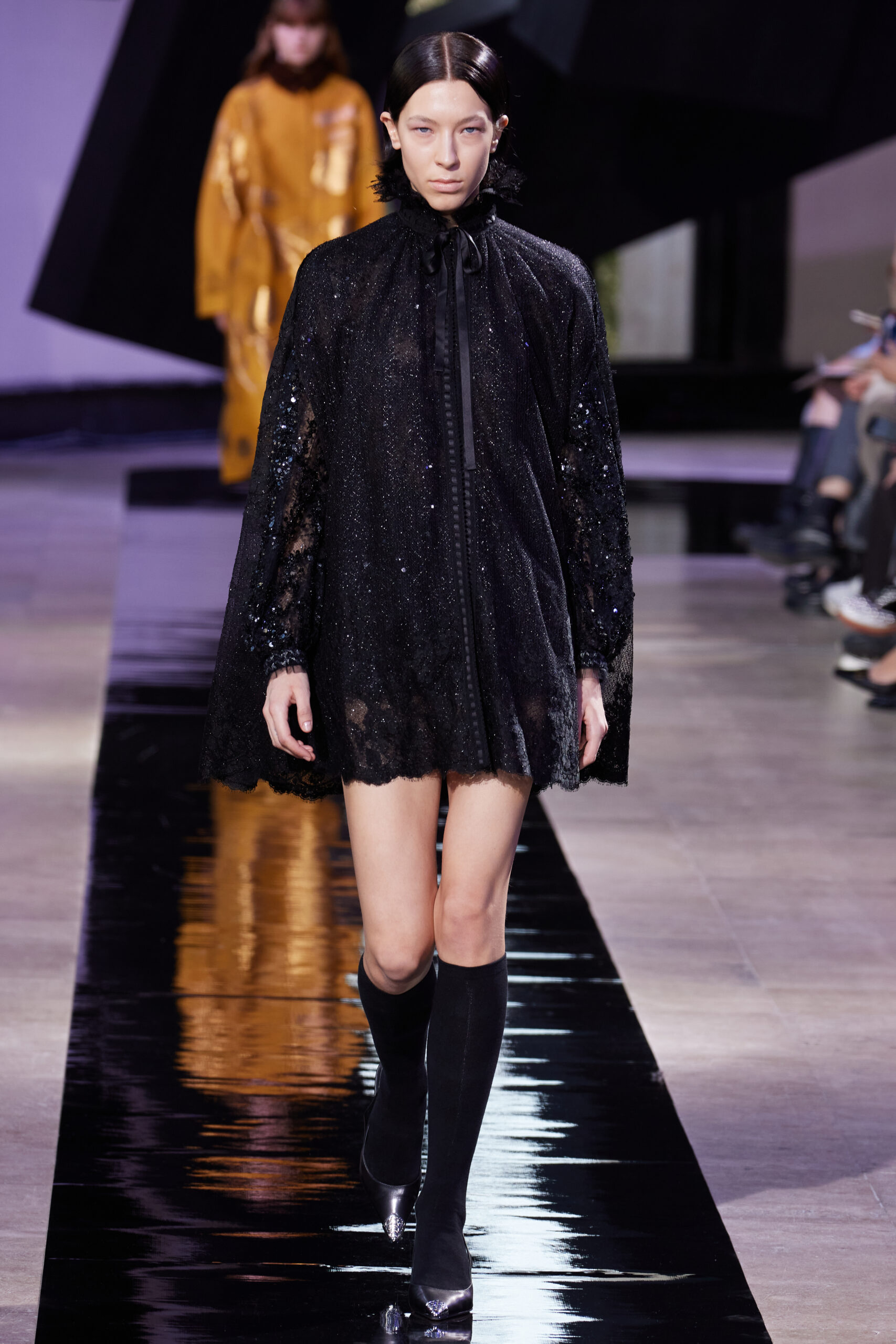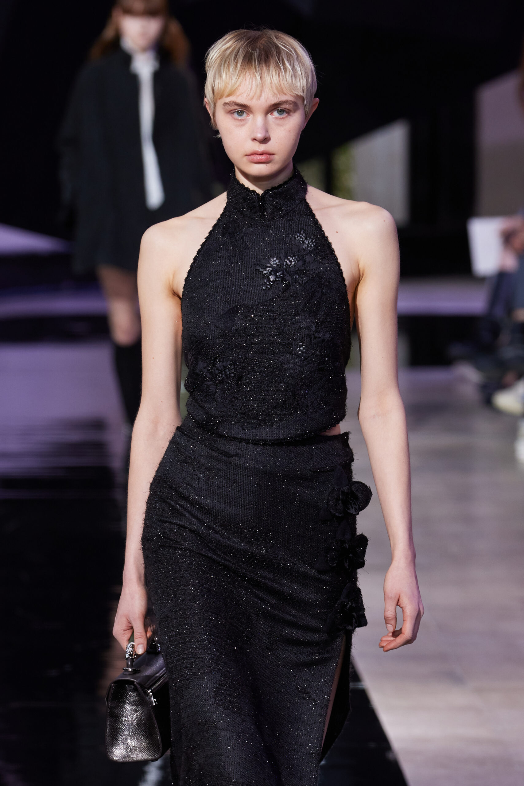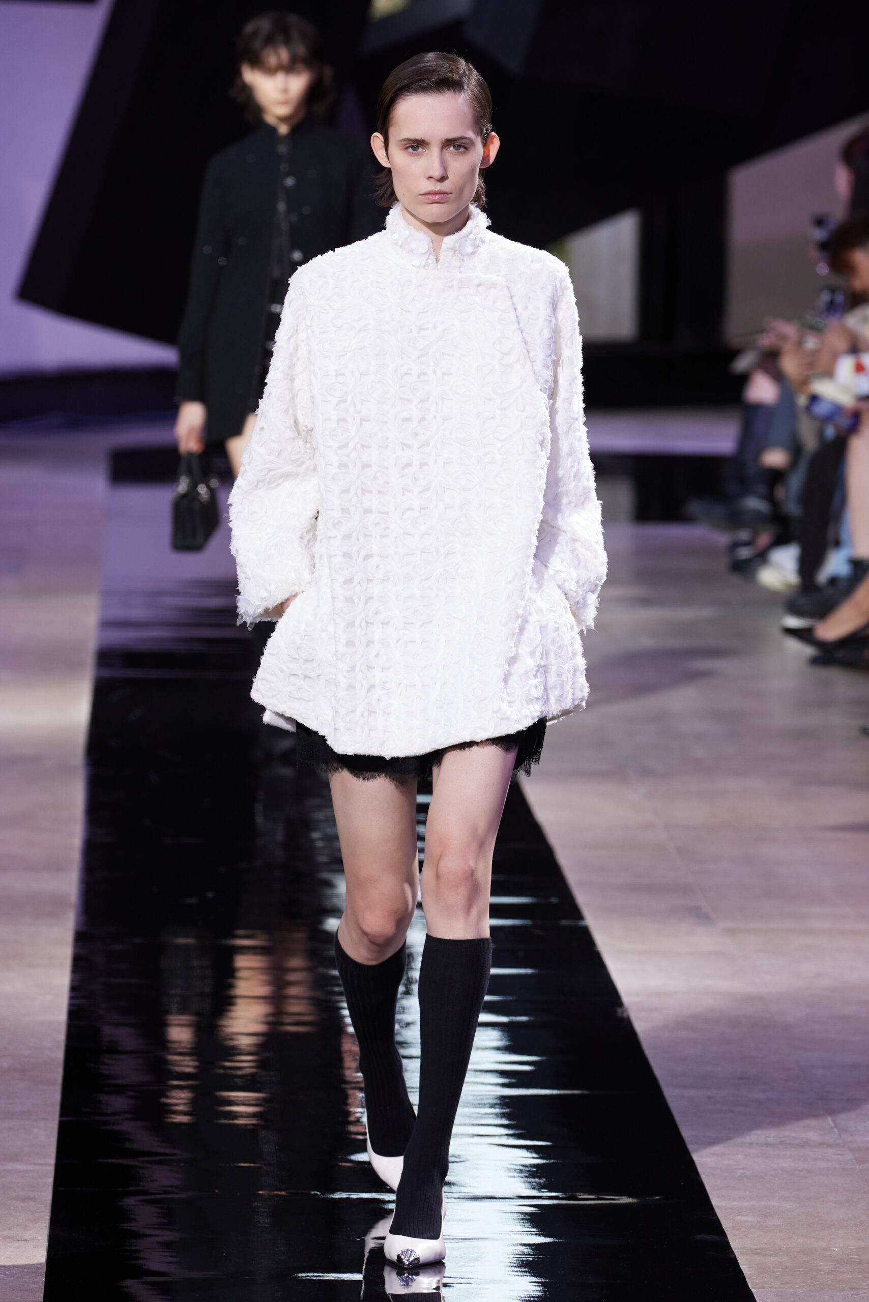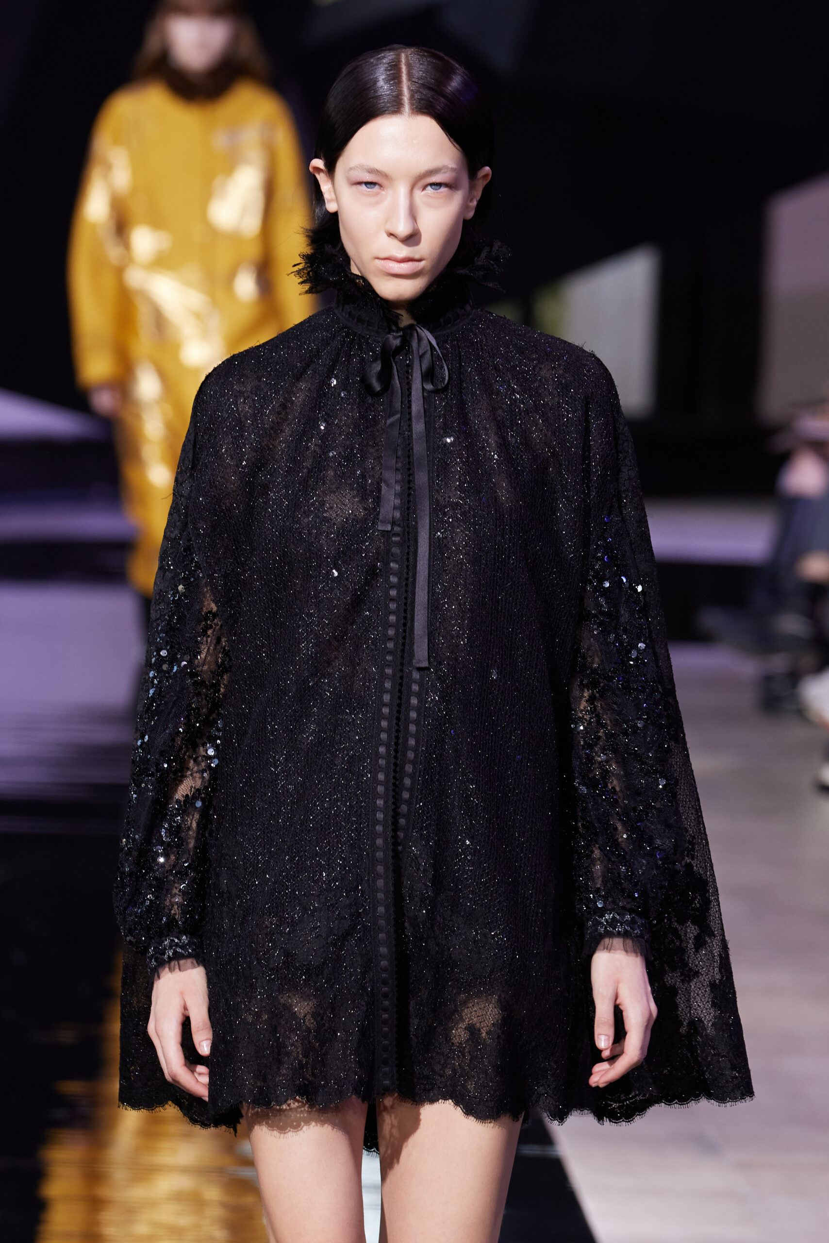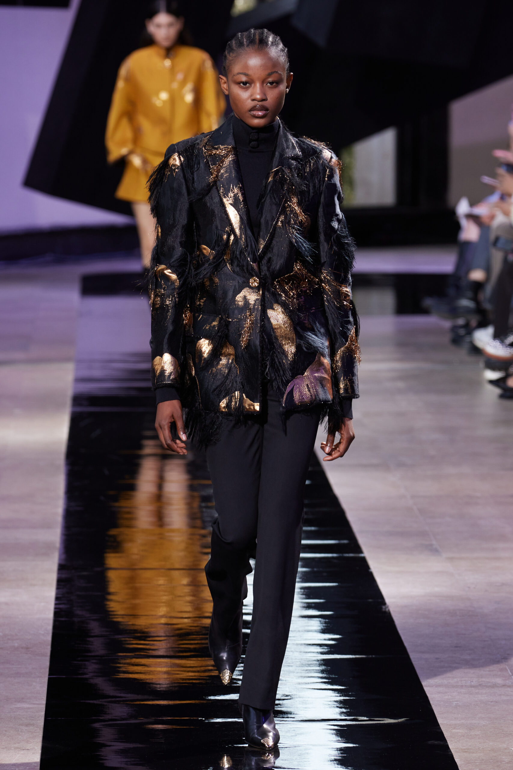 Les vêtements, principalement de couleur encre, révèlent des détails sophistiqués comme des fils dorés incrustés dans des jacquards en métal noir, des superpositions de rubans sur de la broderie, des franges noires, et de la laine mohair noire, illustrant la dynamique entre le calme et l’agitation des motifs d’encre.