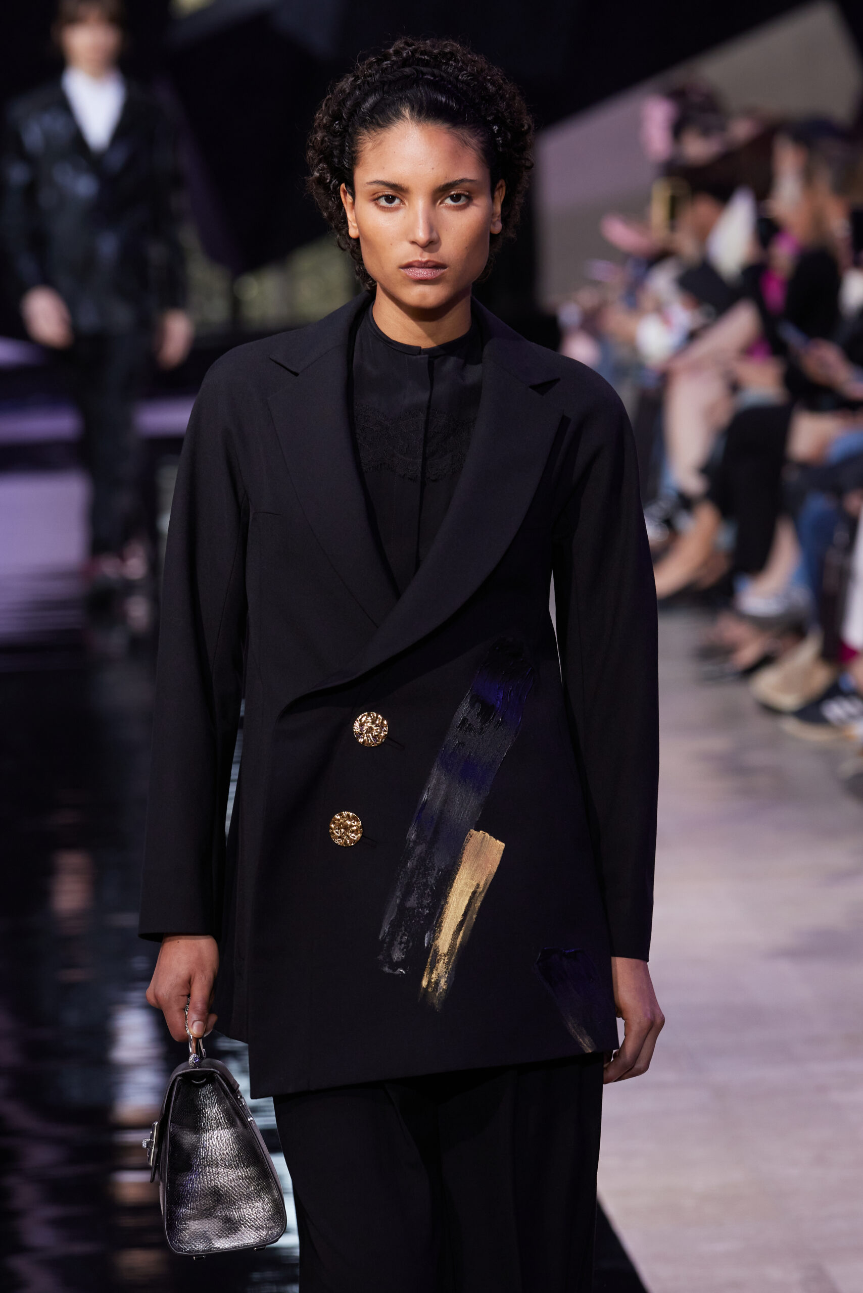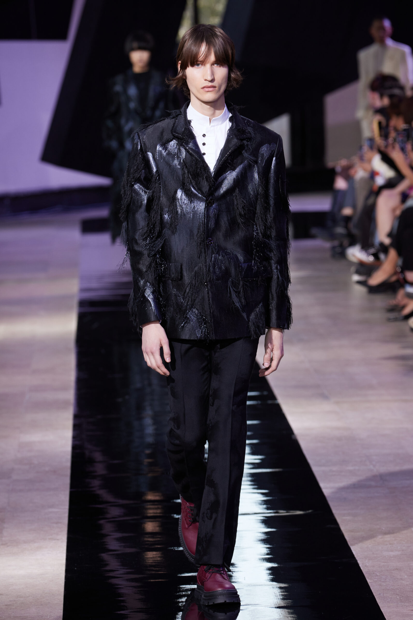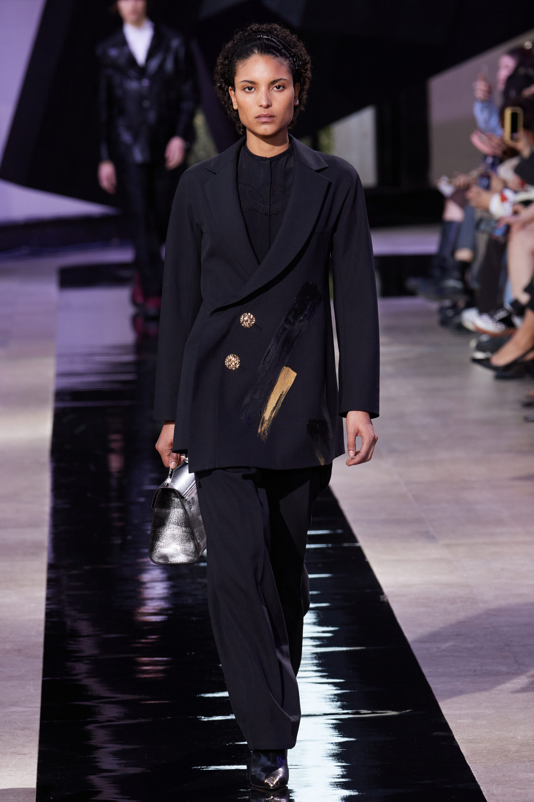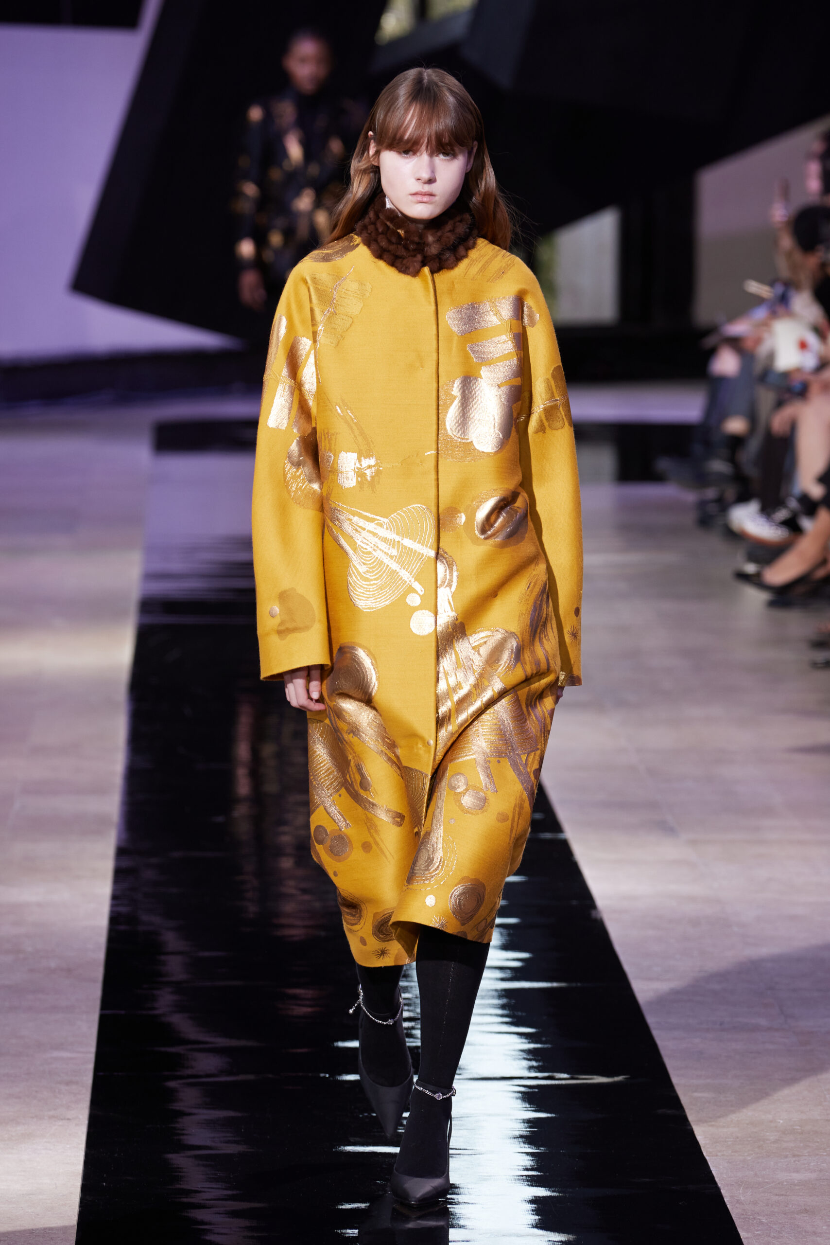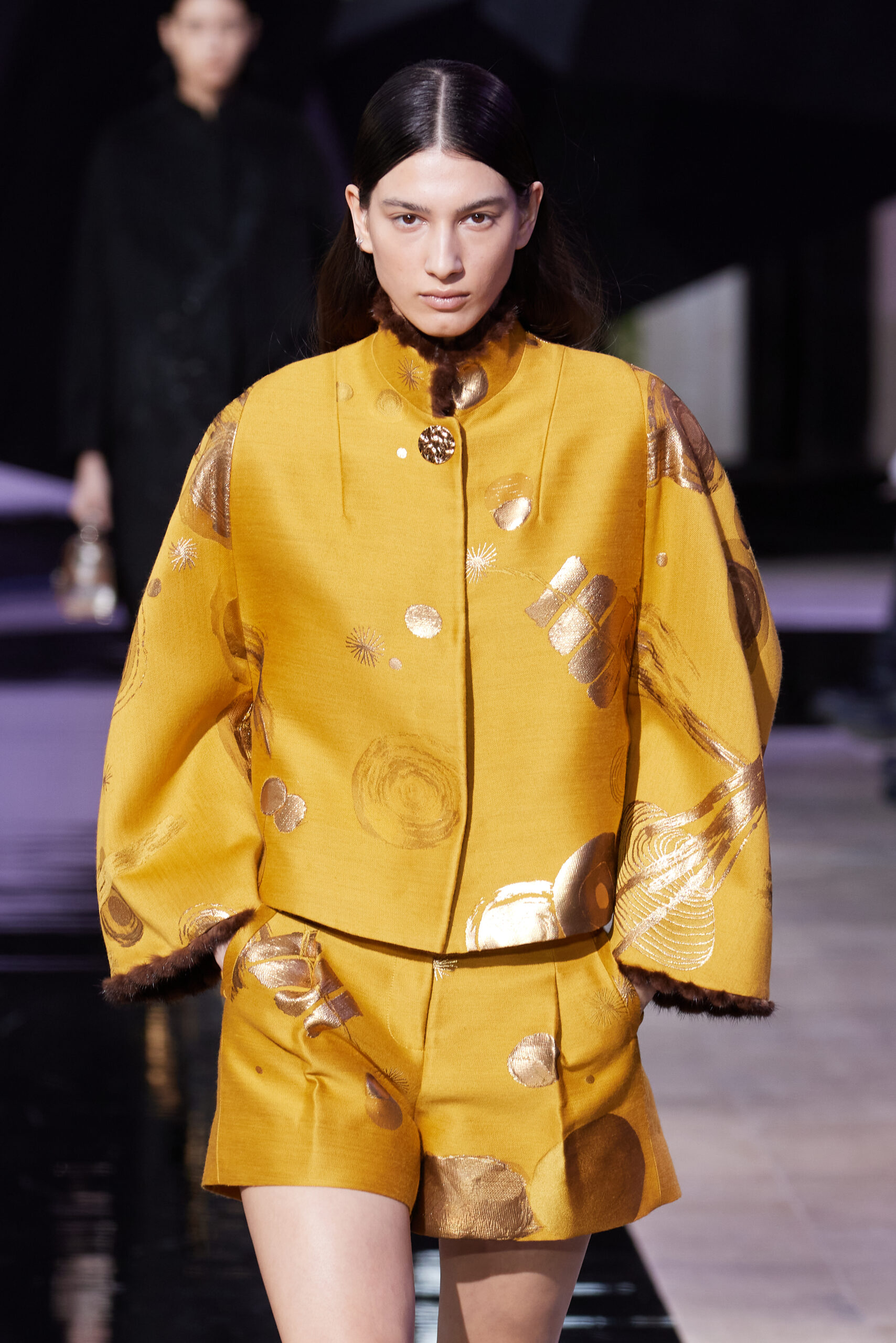 Les vêtements, principalement de couleur encre, révèlent des détails sophistiqués comme des fils dorés incrustés dans des jacquards en métal noir, des superpositions de rubans sur de la broderie, des franges noires, et de la laine mohair noire, illustrant la dynamique entre le calme et l’agitation des motifs d’encre.