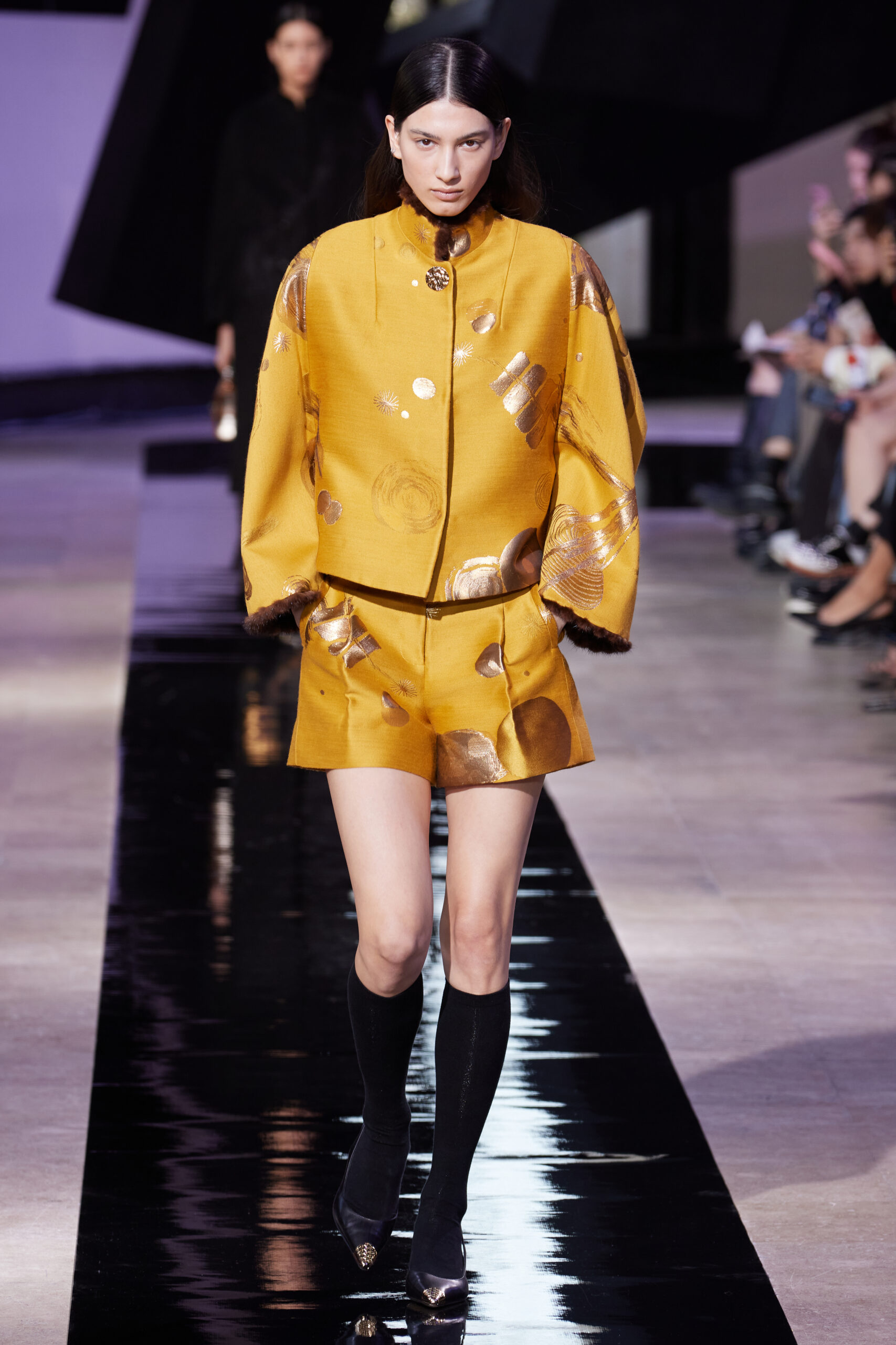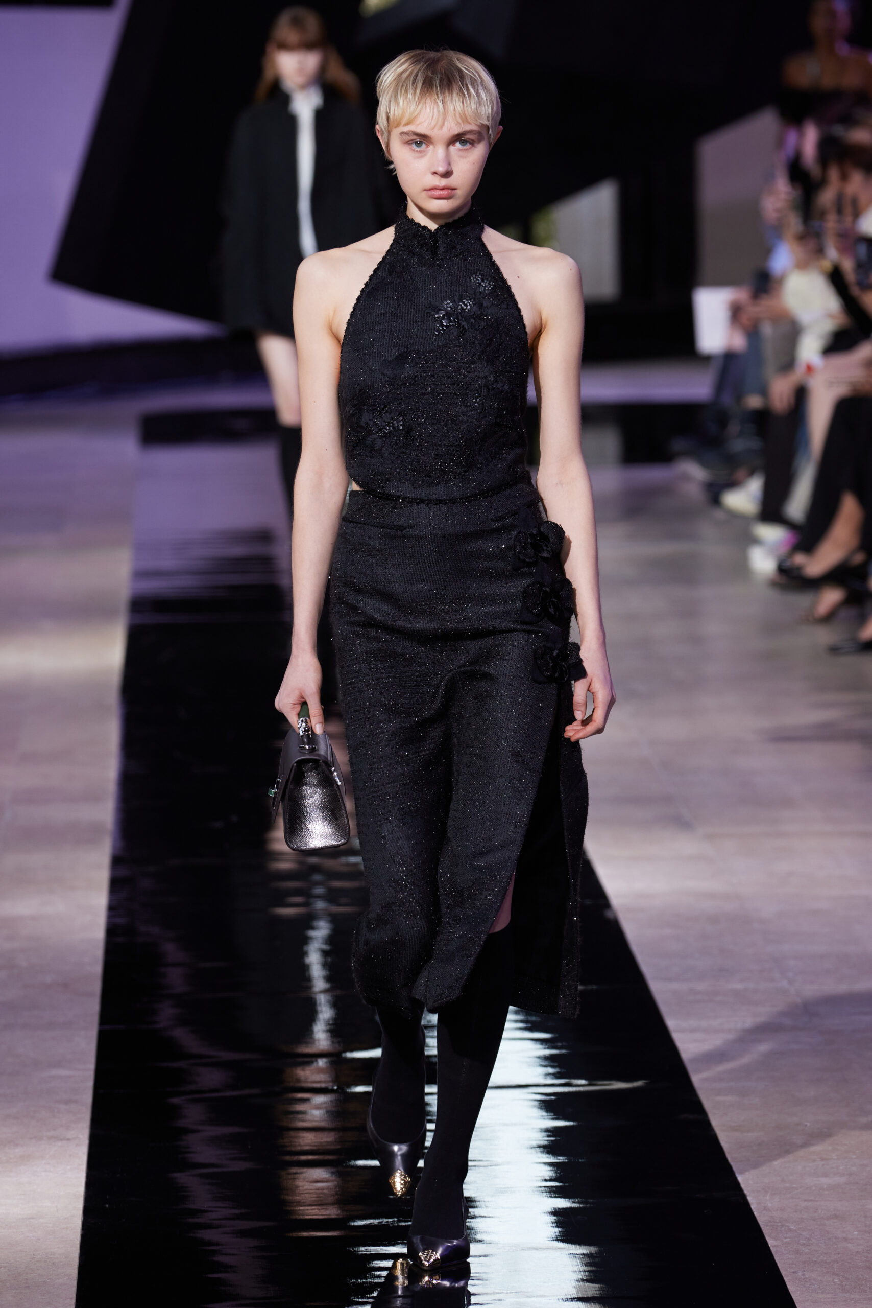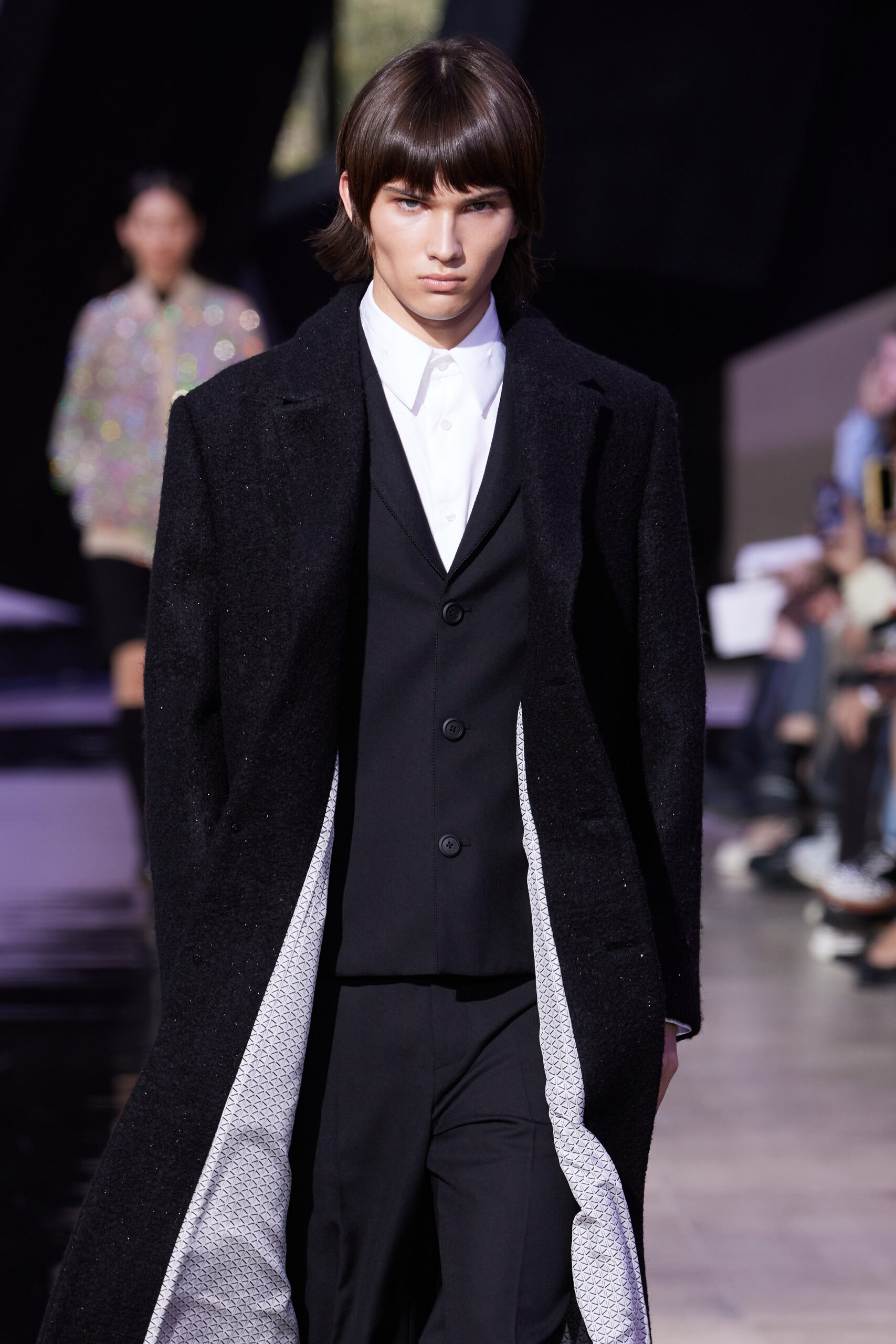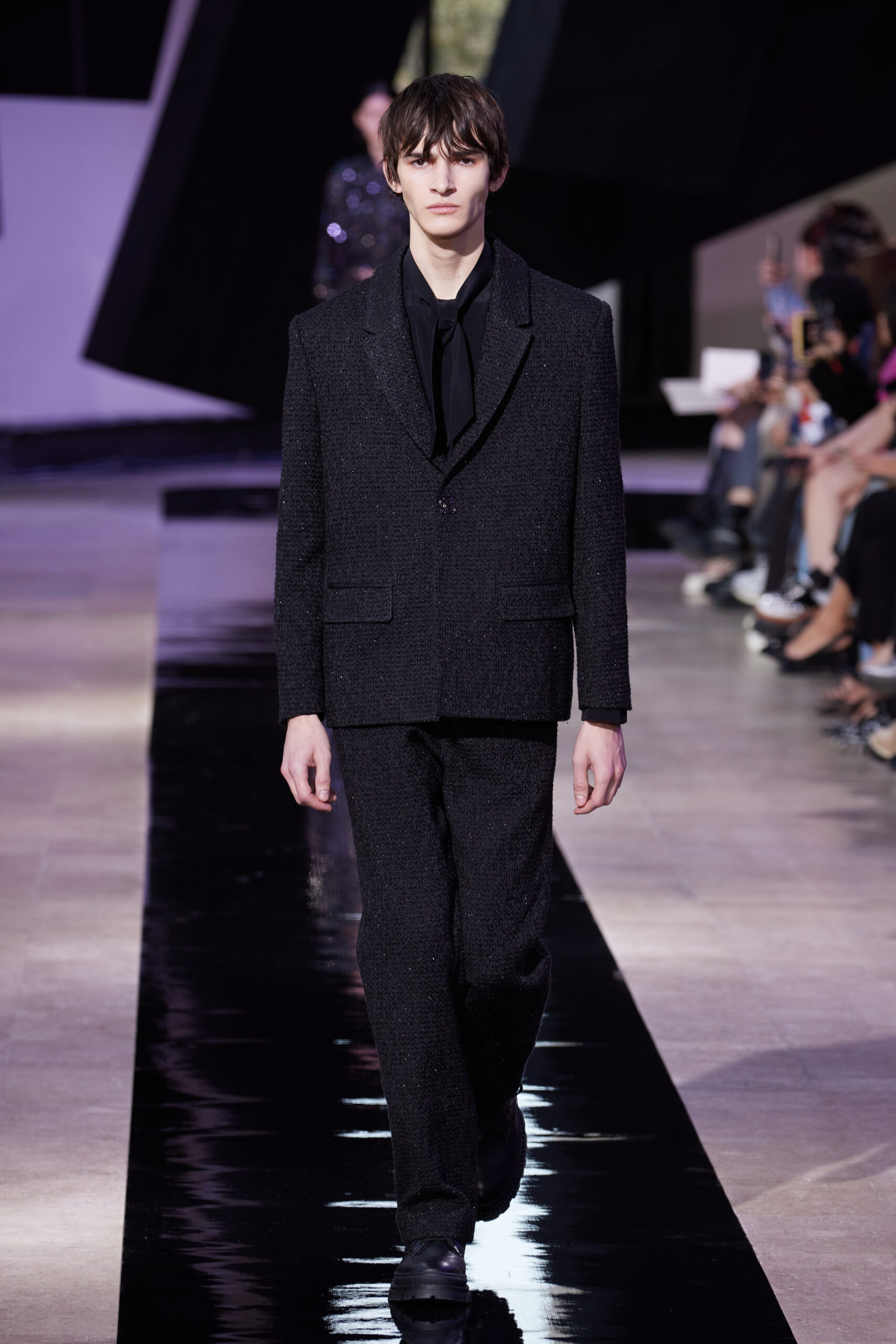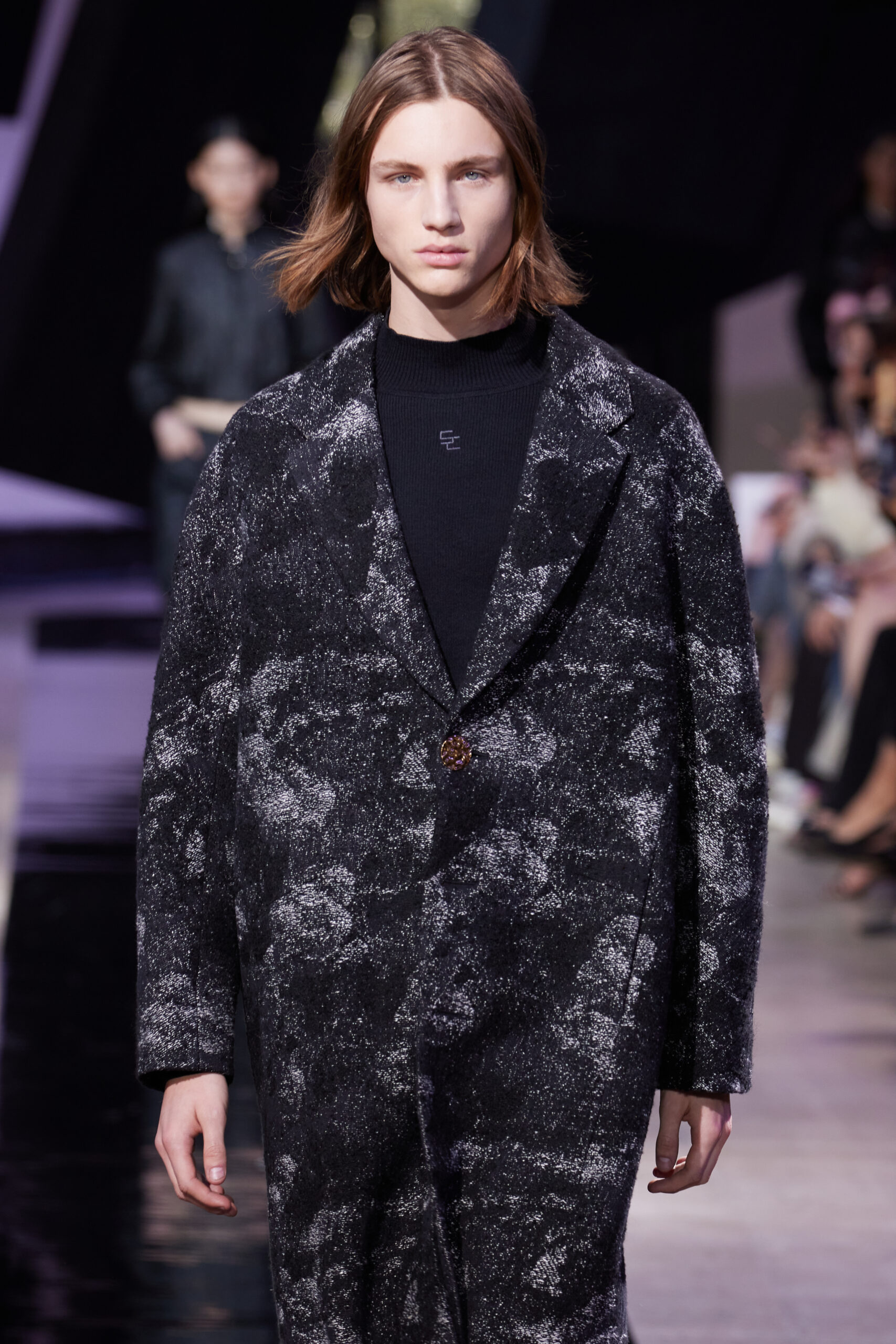 Les vêtements, principalement de couleur encre, révèlent des détails sophistiqués comme des fils dorés incrustés dans des jacquards en métal noir, des superpositions de rubans sur de la broderie, des franges noires, et de la laine mohair noire, illustrant la dynamique entre le calme et l’agitation des motifs d’encre.