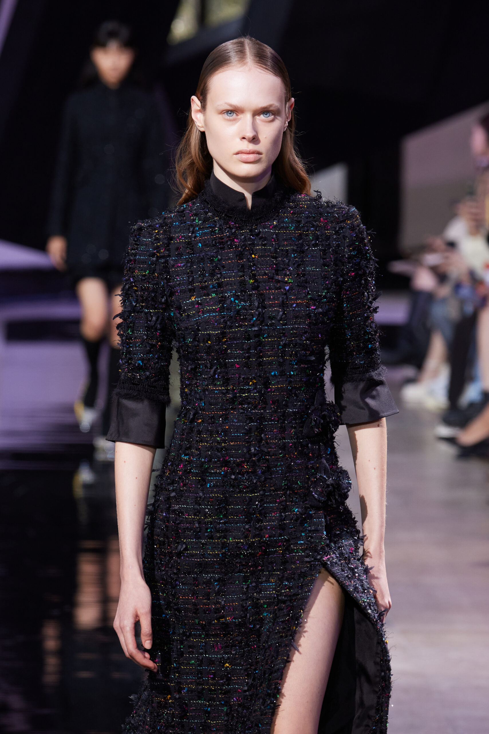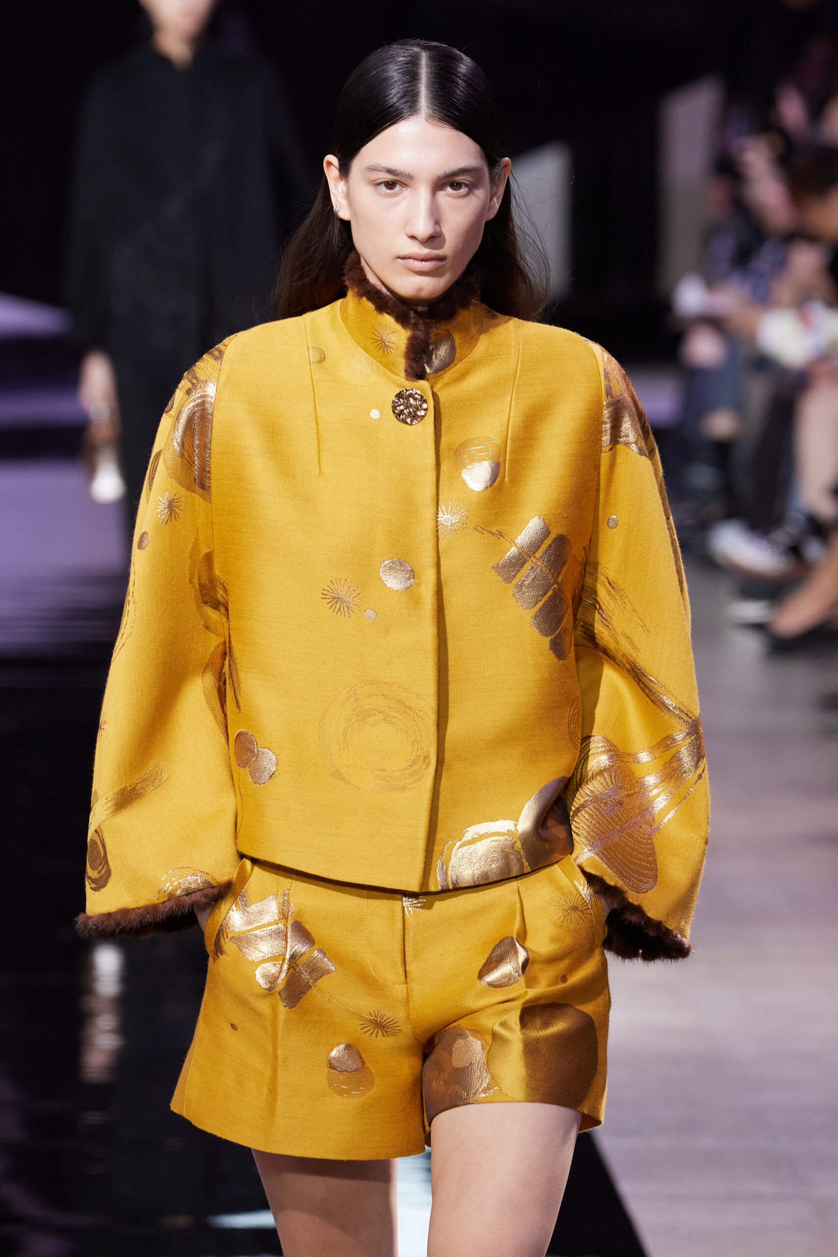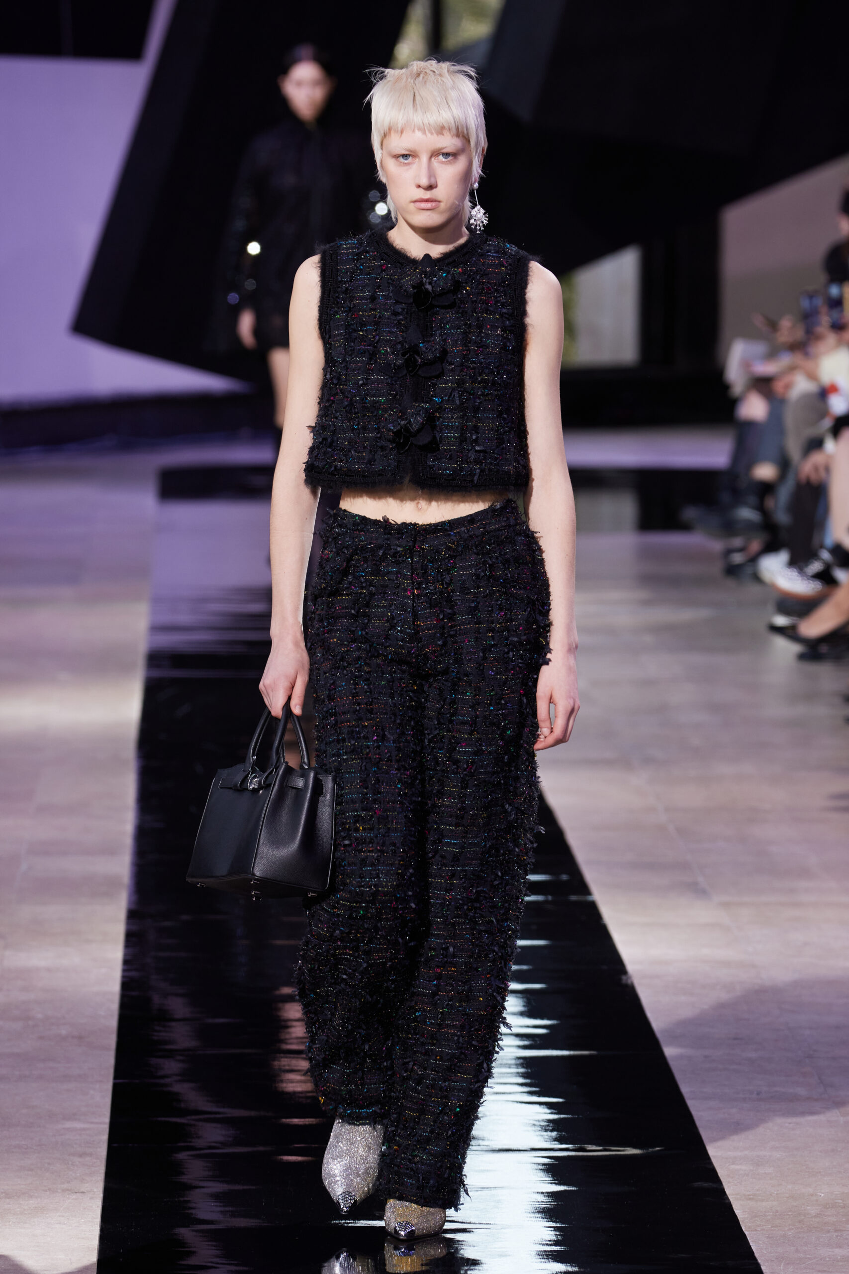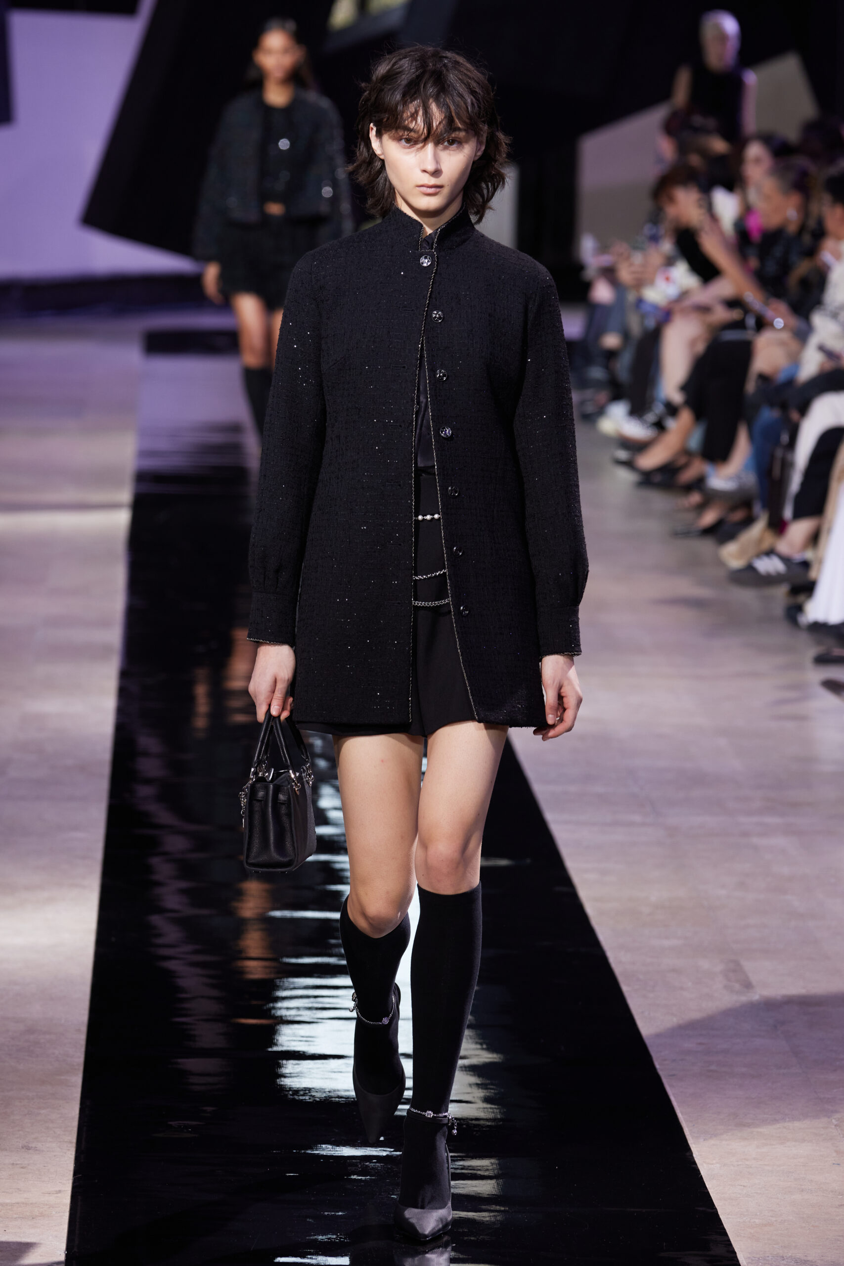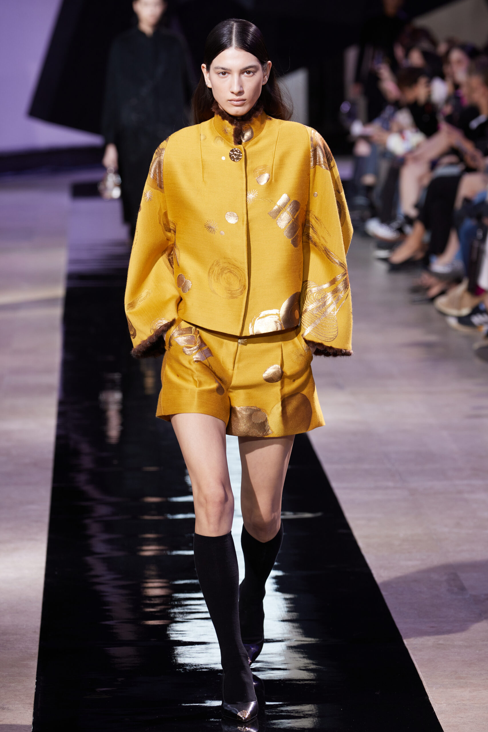 Les vêtements, principalement de couleur encre, révèlent des détails sophistiqués comme des fils dorés incrustés dans des jacquards en métal noir, des superpositions de rubans sur de la broderie, des franges noires, et de la laine mohair noire, illustrant la dynamique entre le calme et l’agitation des motifs d’encre.