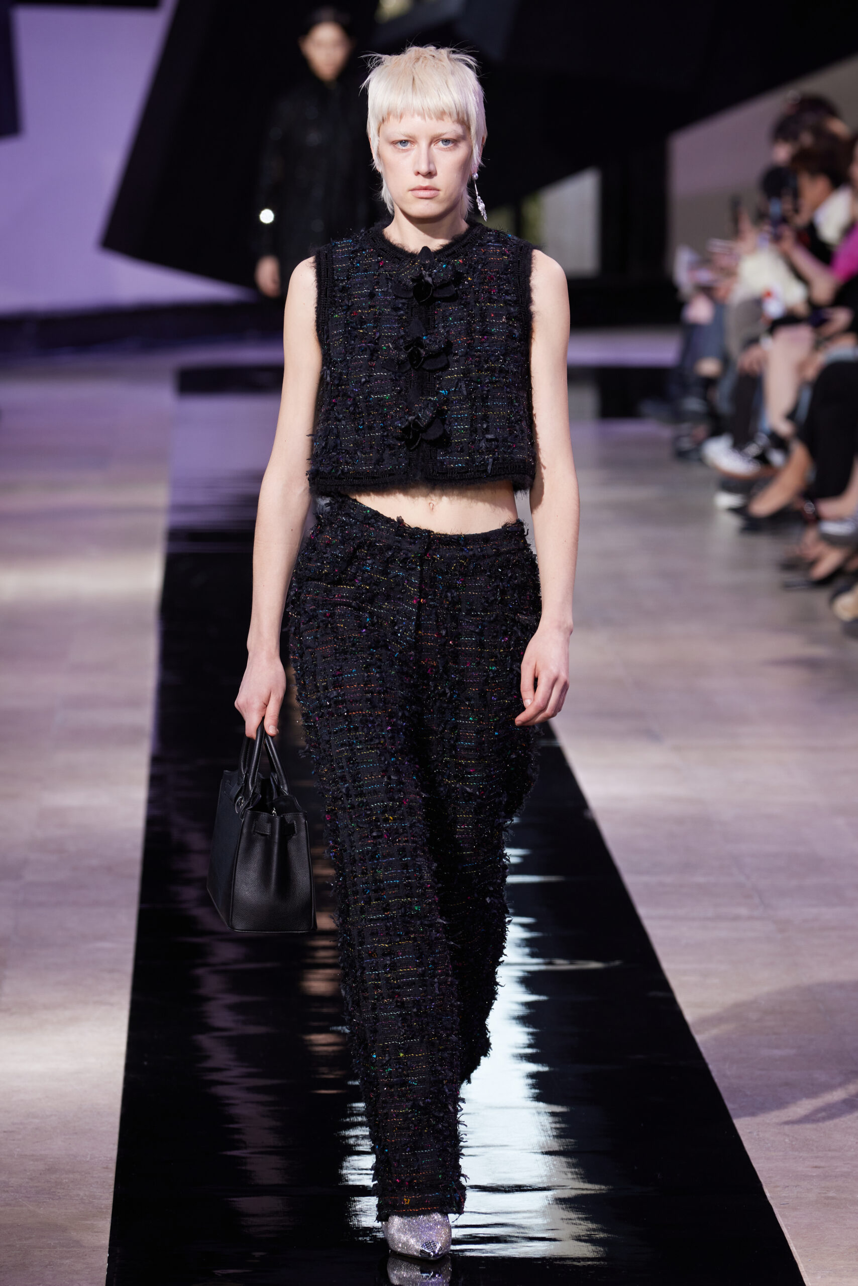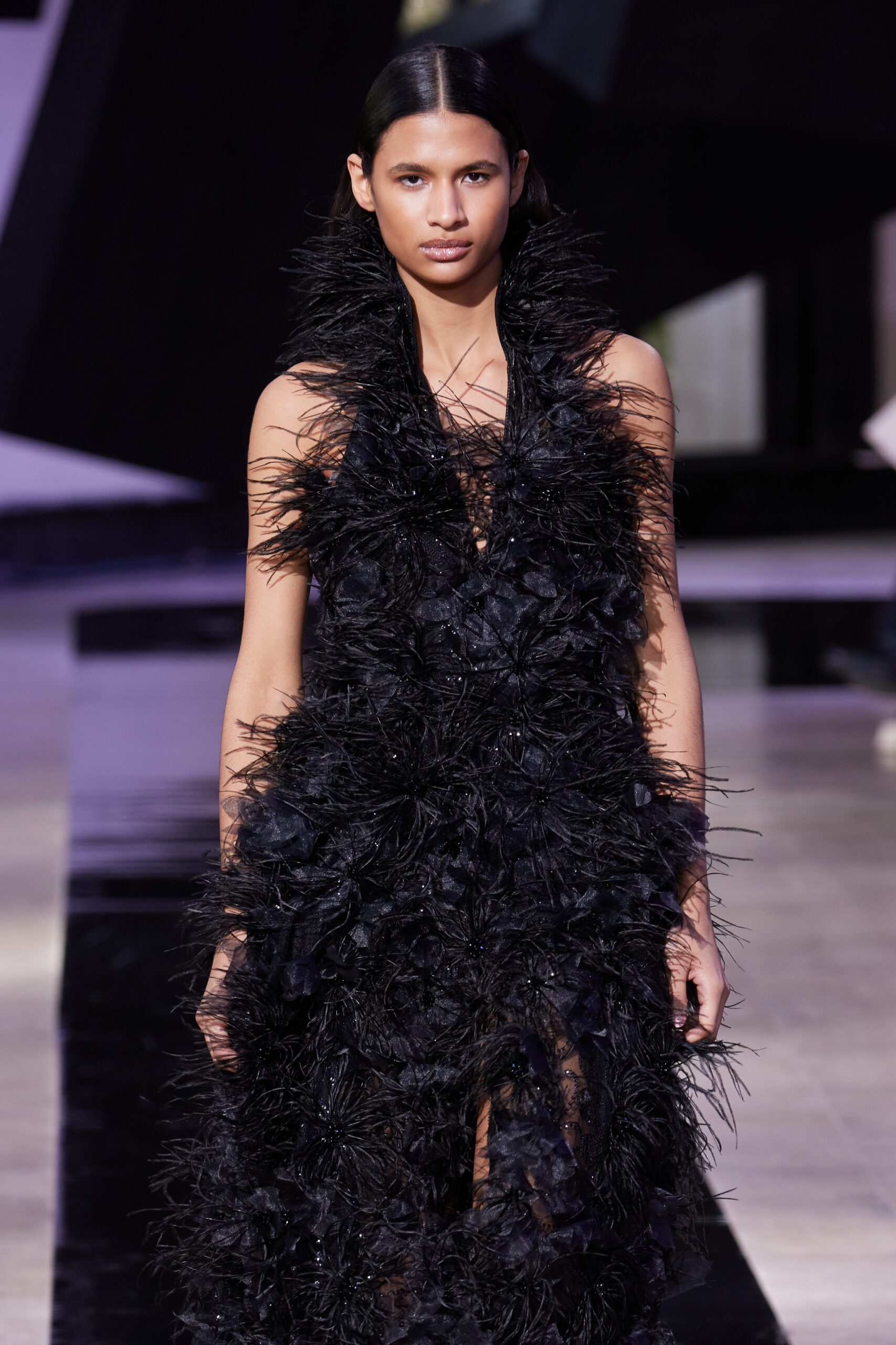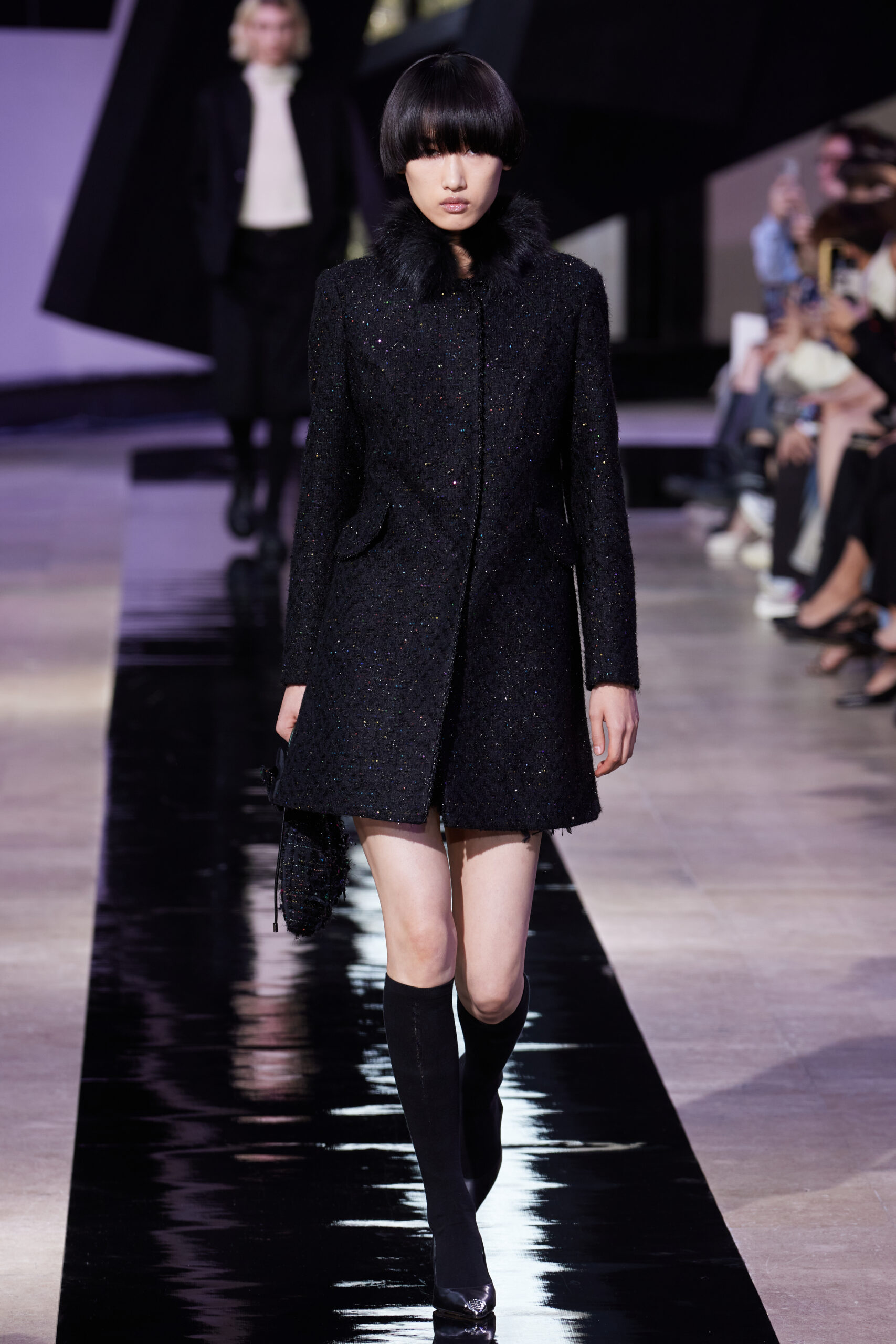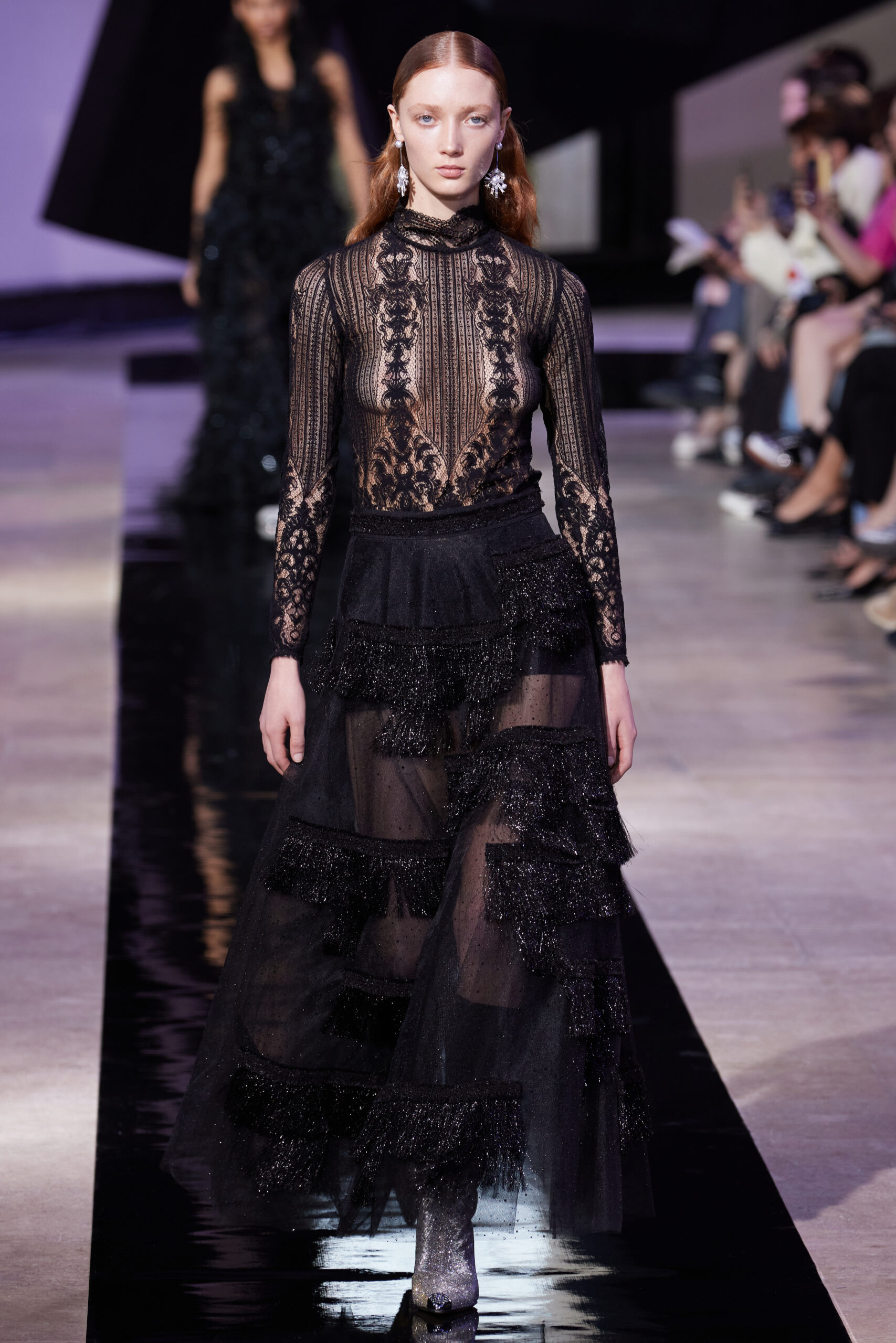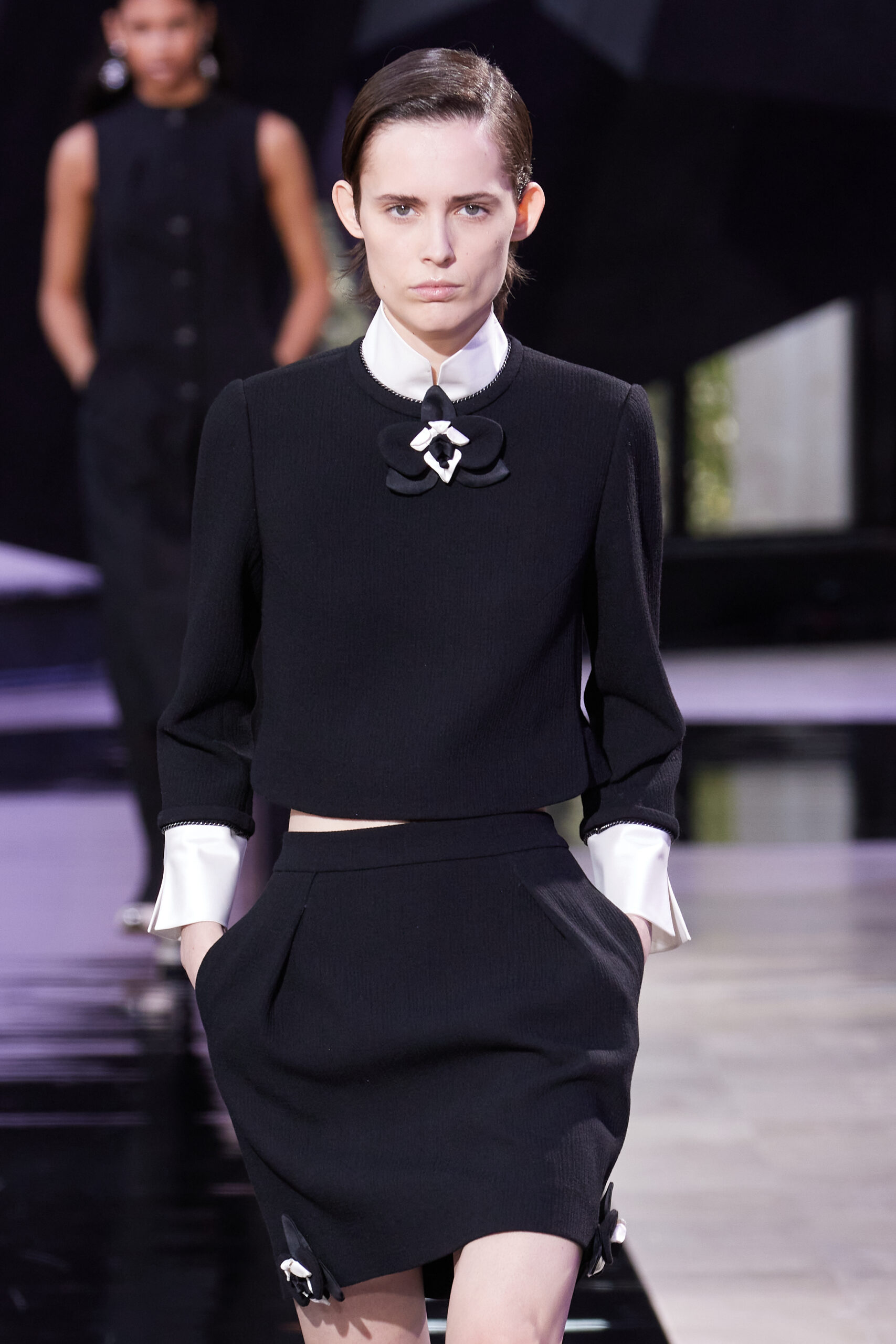 Les vêtements, principalement de couleur encre, révèlent des détails sophistiqués comme des fils dorés incrustés dans des jacquards en métal noir, des superpositions de rubans sur de la broderie, des franges noires, et de la laine mohair noire, illustrant la dynamique entre le calme et l’agitation des motifs d’encre.