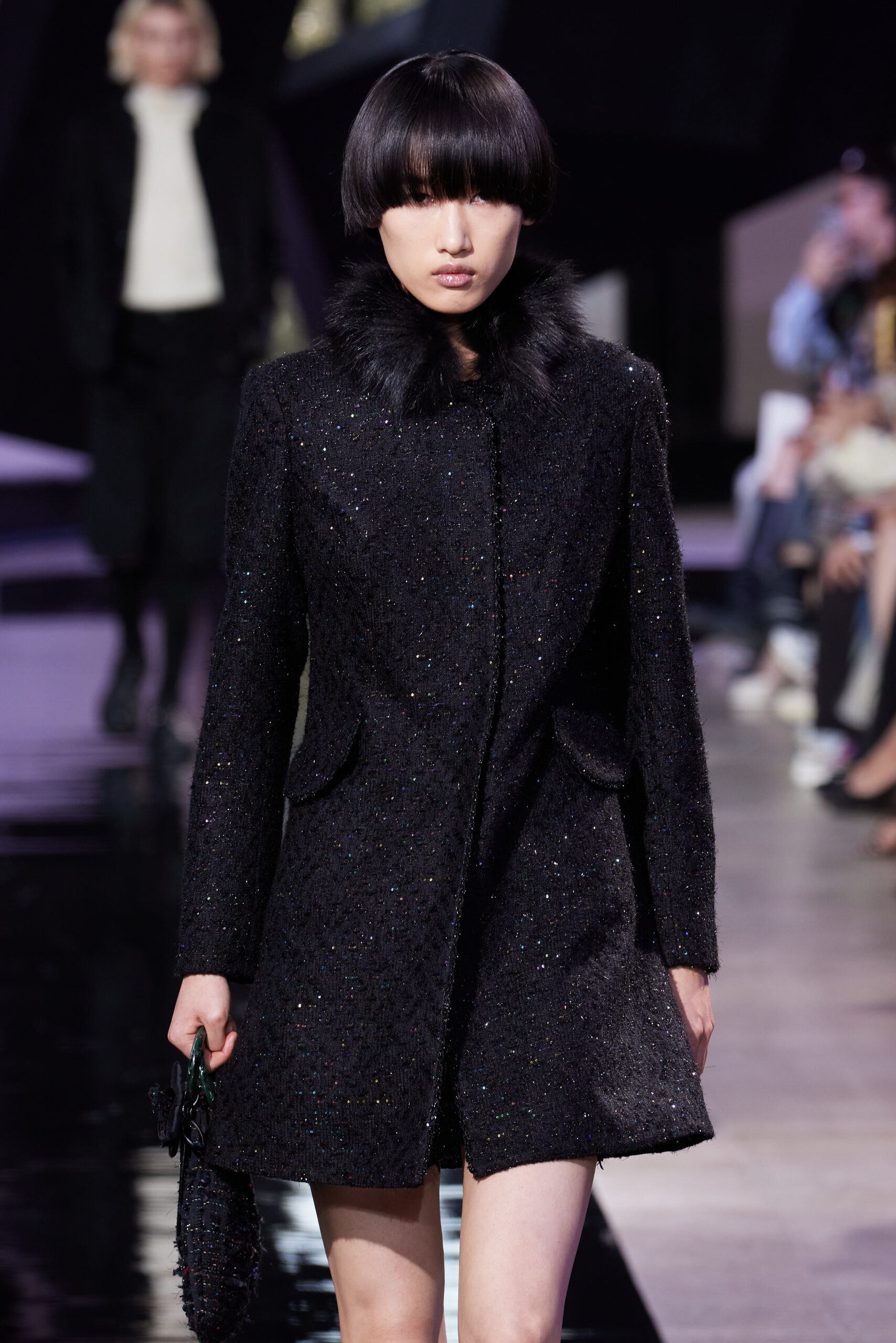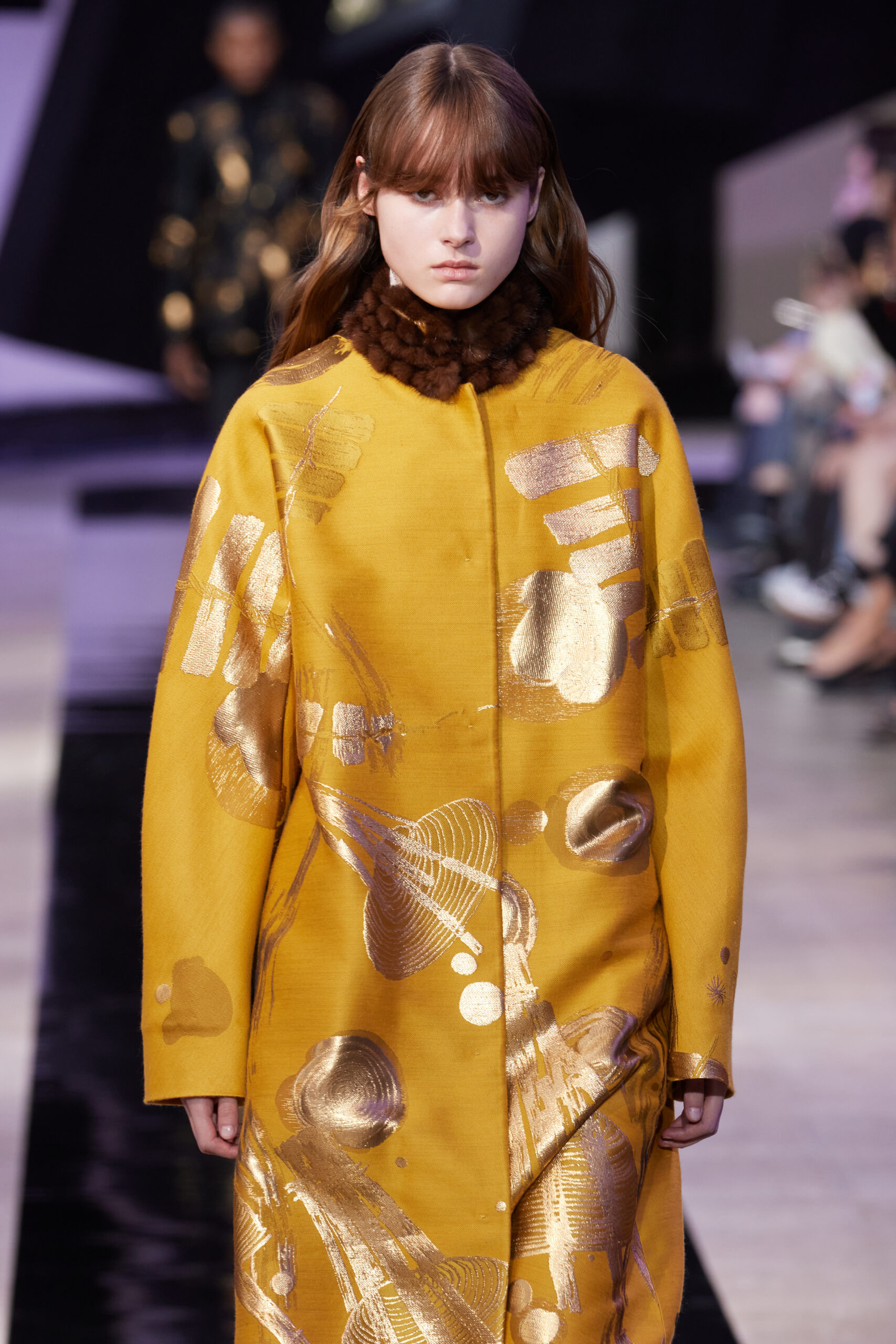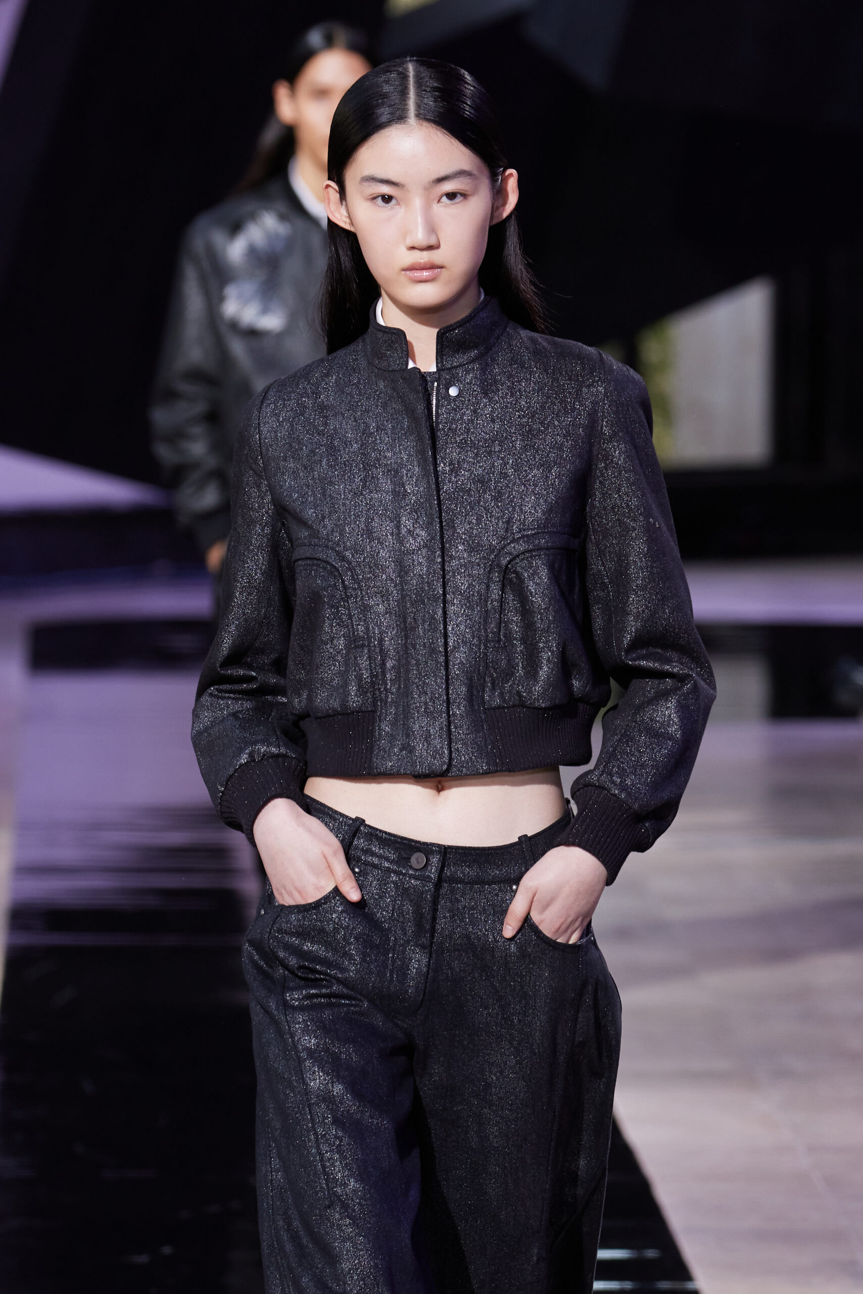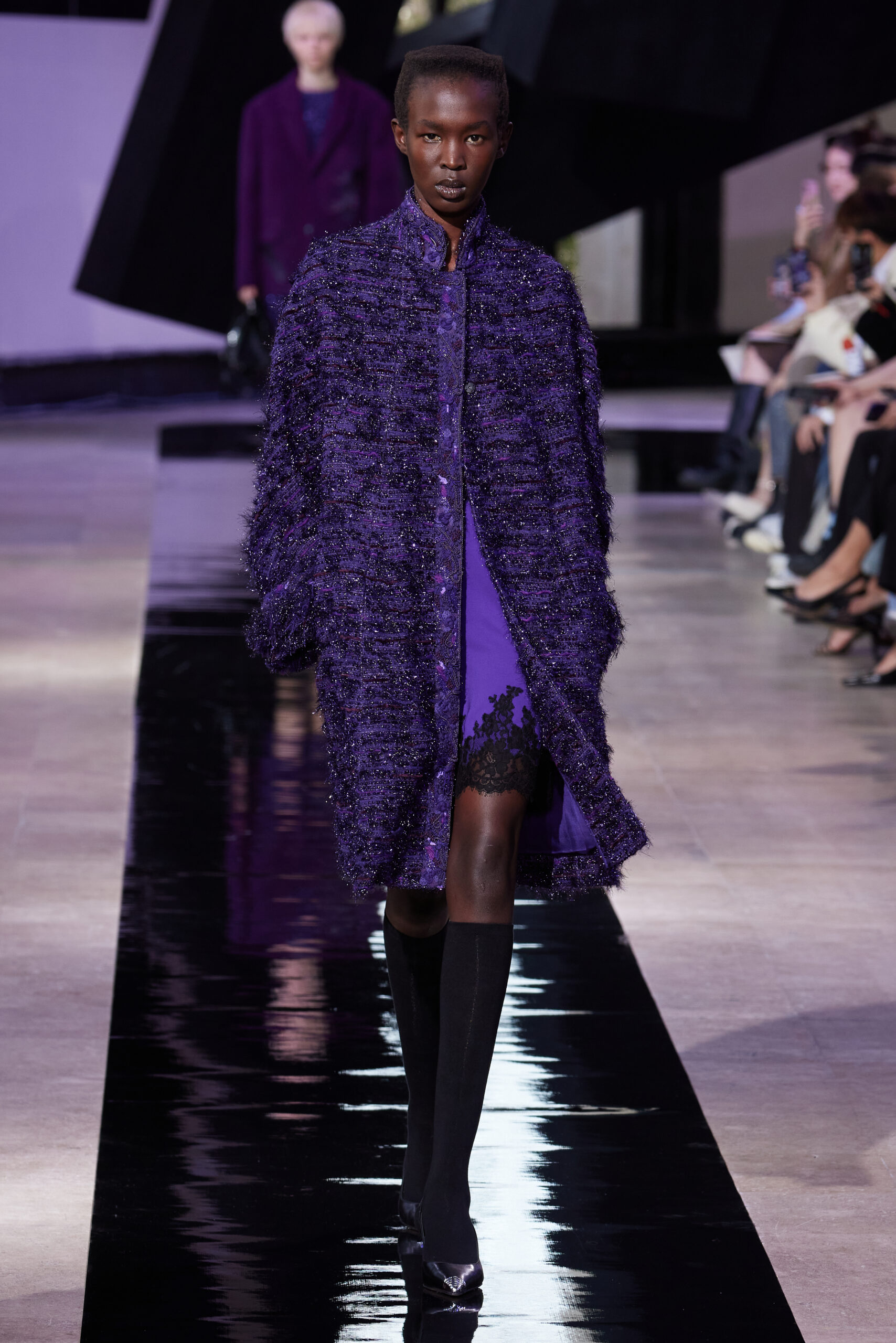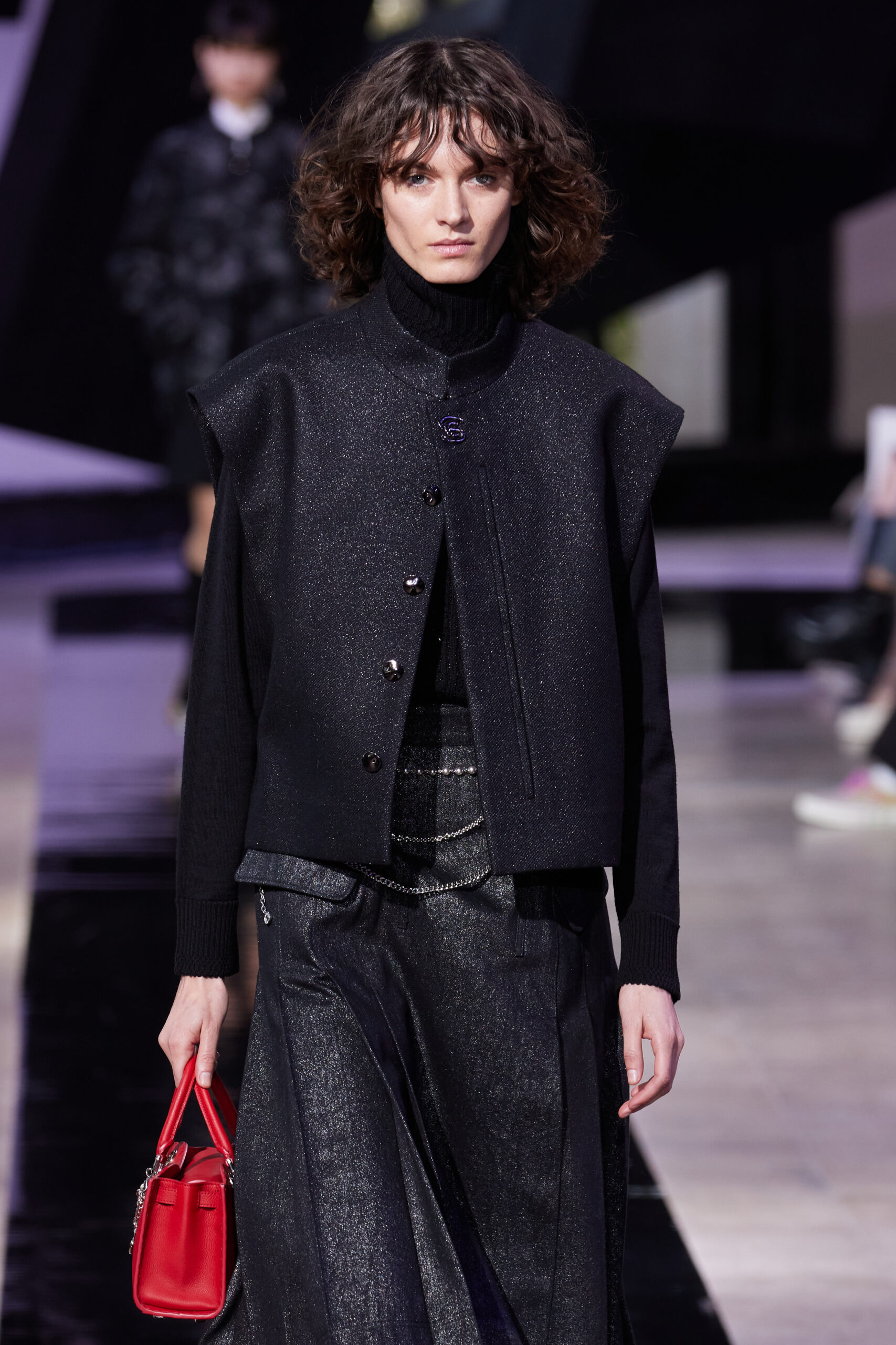 Les vêtements, principalement de couleur encre, révèlent des détails sophistiqués comme des fils dorés incrustés dans des jacquards en métal noir, des superpositions de rubans sur de la broderie, des franges noires, et de la laine mohair noire, illustrant la dynamique entre le calme et l’agitation des motifs d’encre.