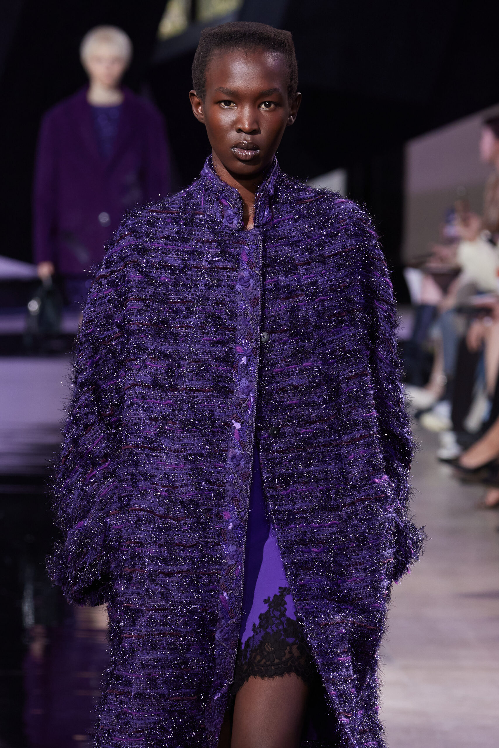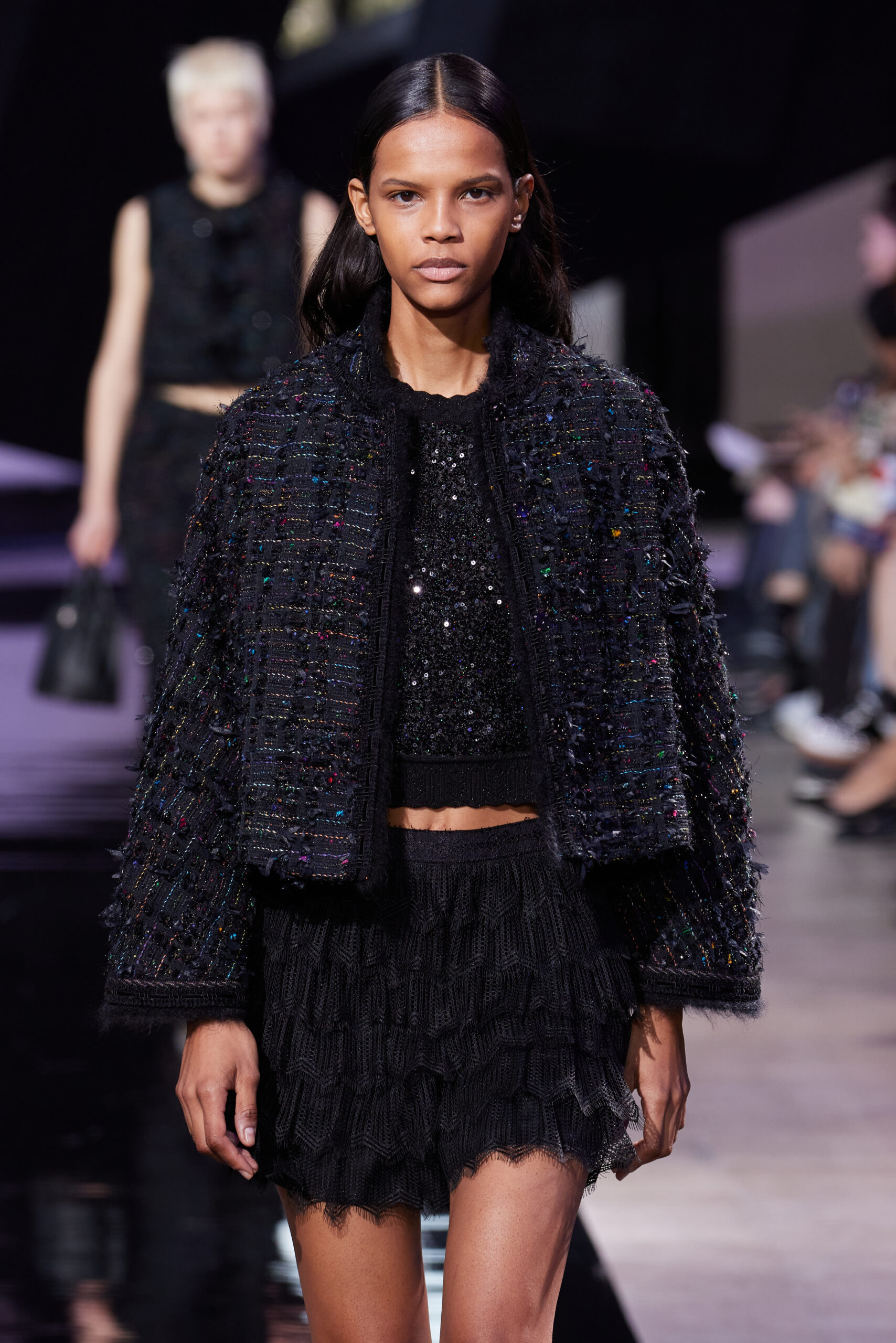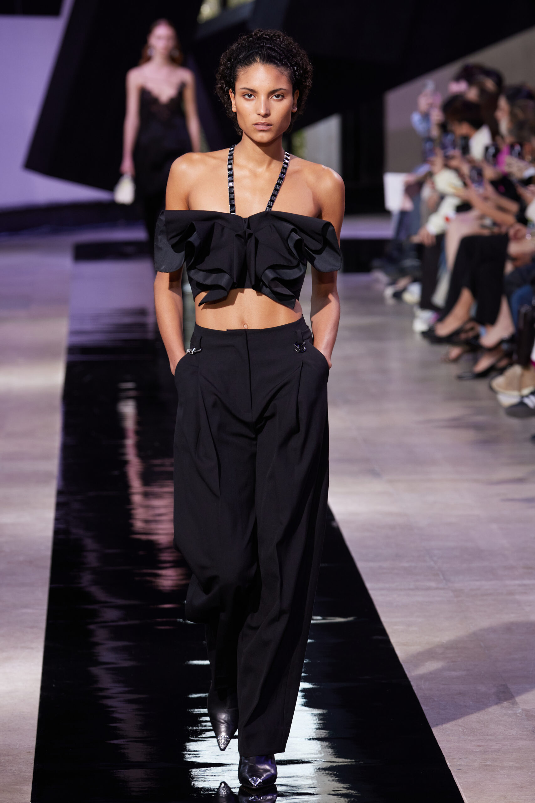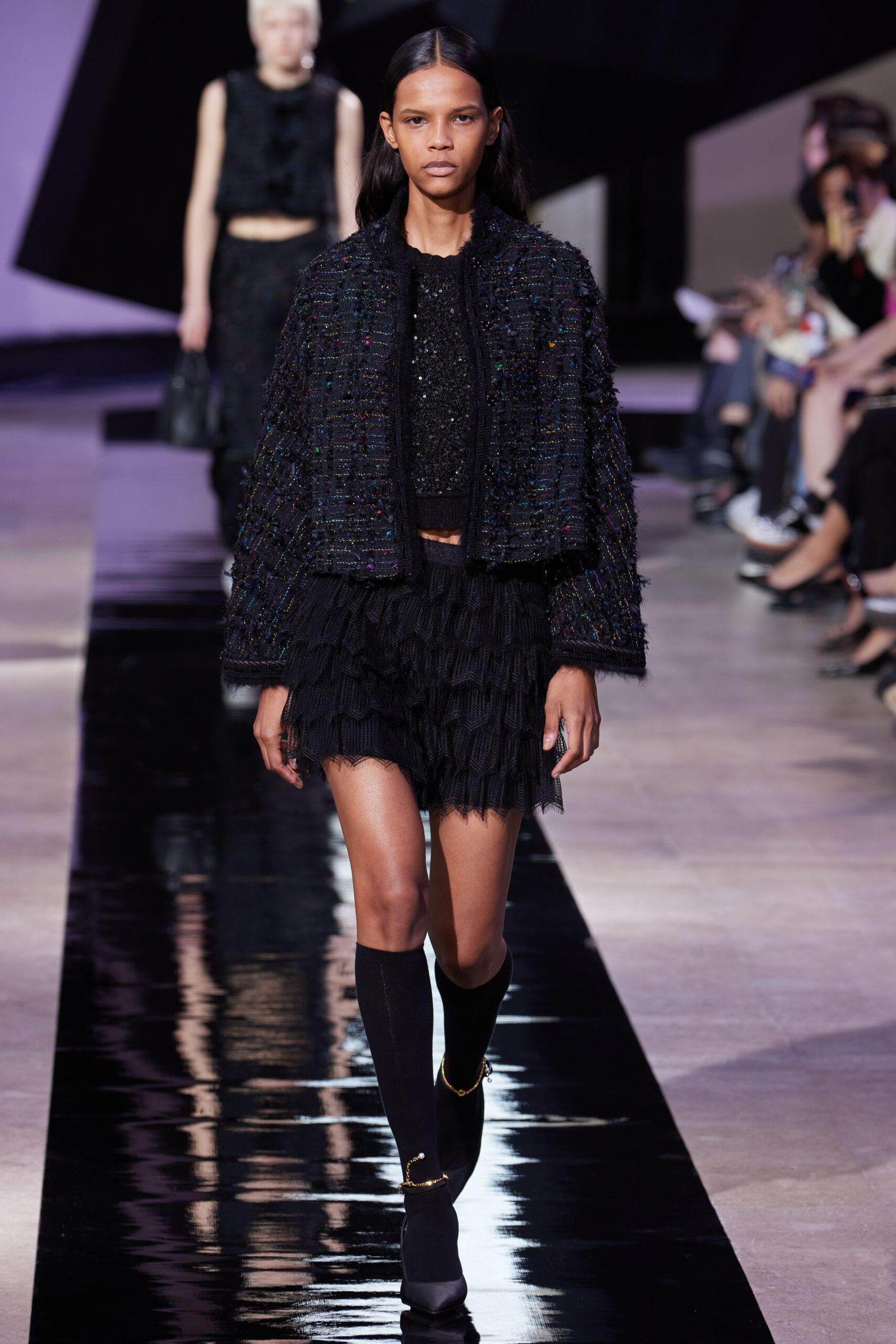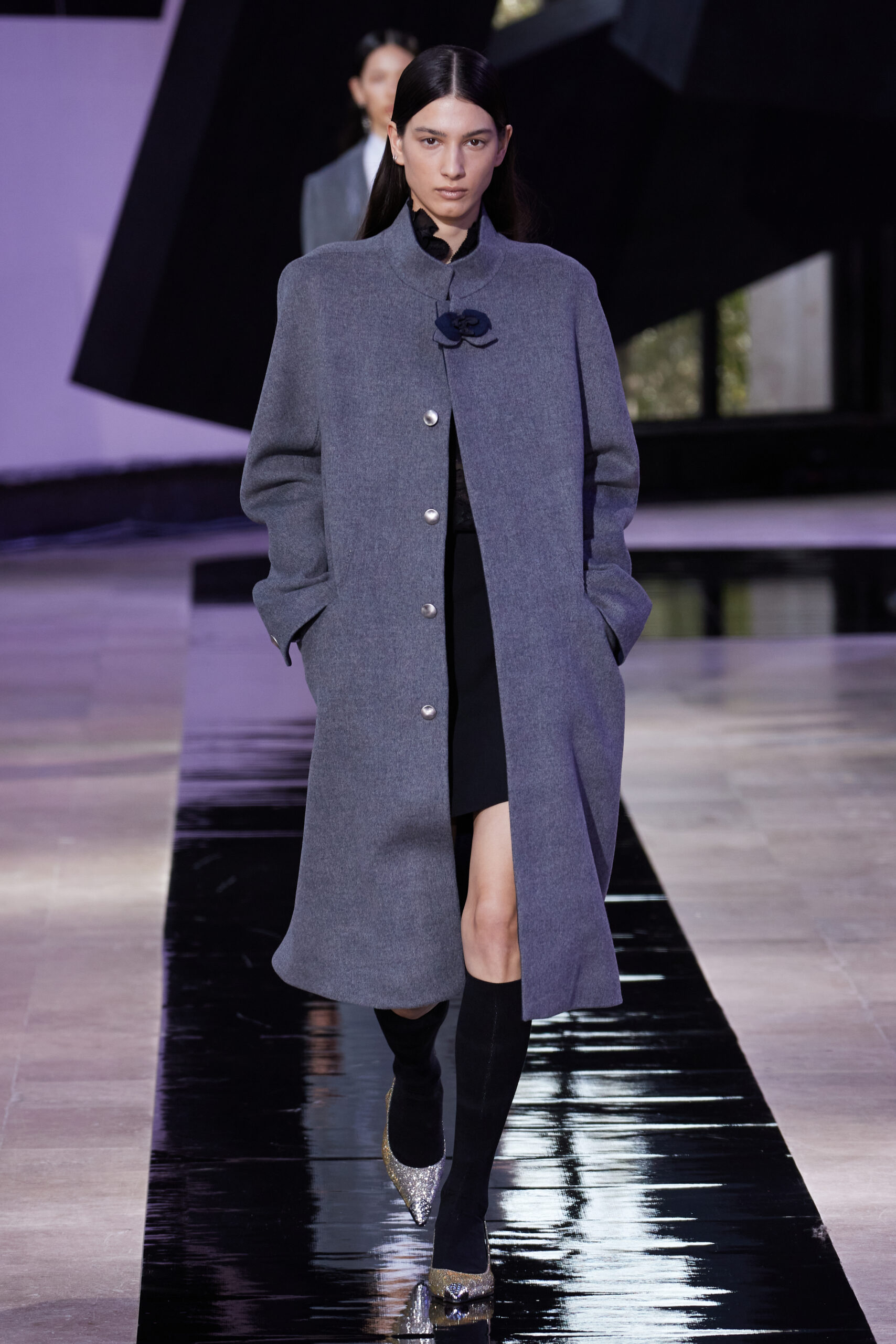 Les vêtements, principalement de couleur encre, révèlent des détails sophistiqués comme des fils dorés incrustés dans des jacquards en métal noir, des superpositions de rubans sur de la broderie, des franges noires, et de la laine mohair noire, illustrant la dynamique entre le calme et l’agitation des motifs d’encre.