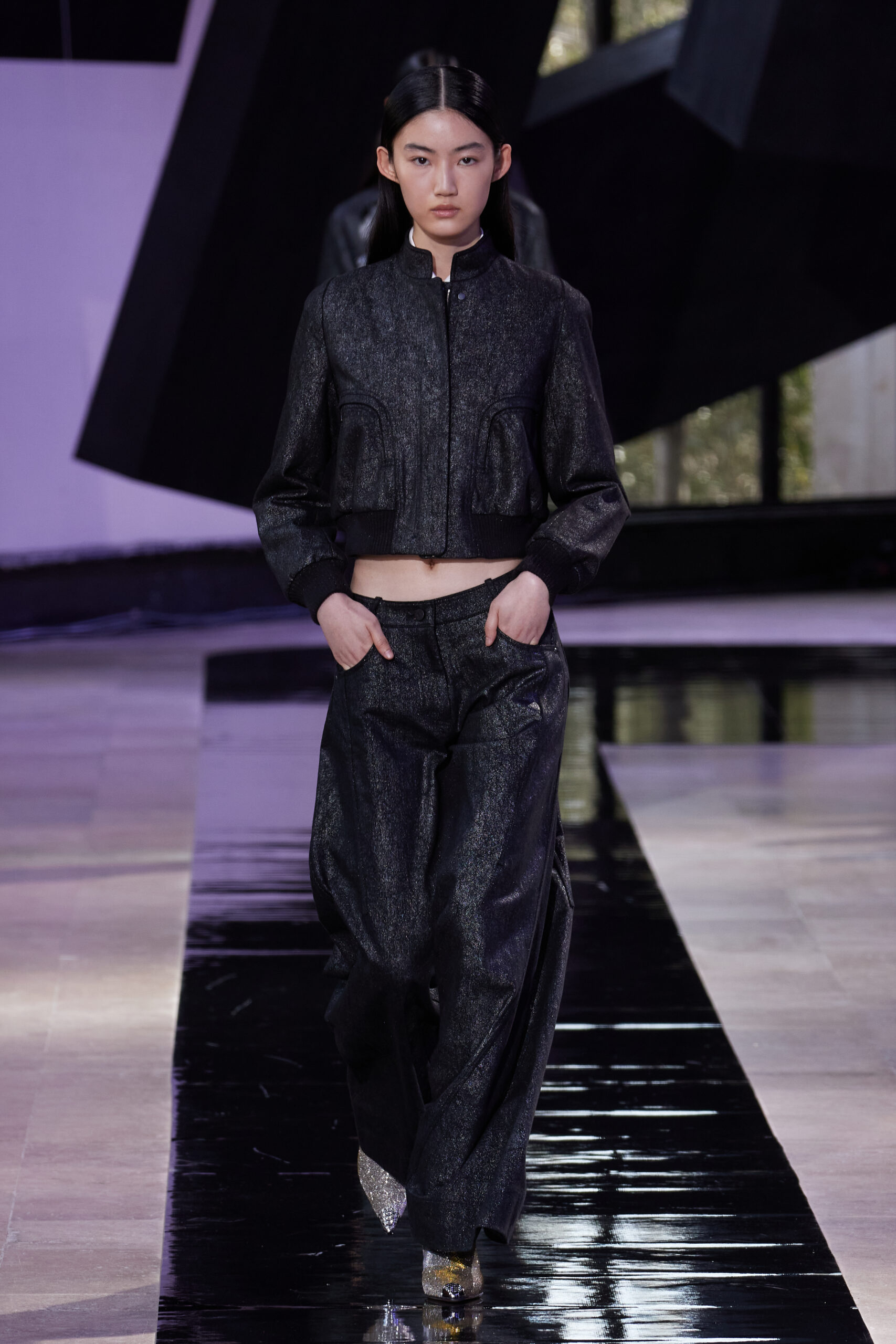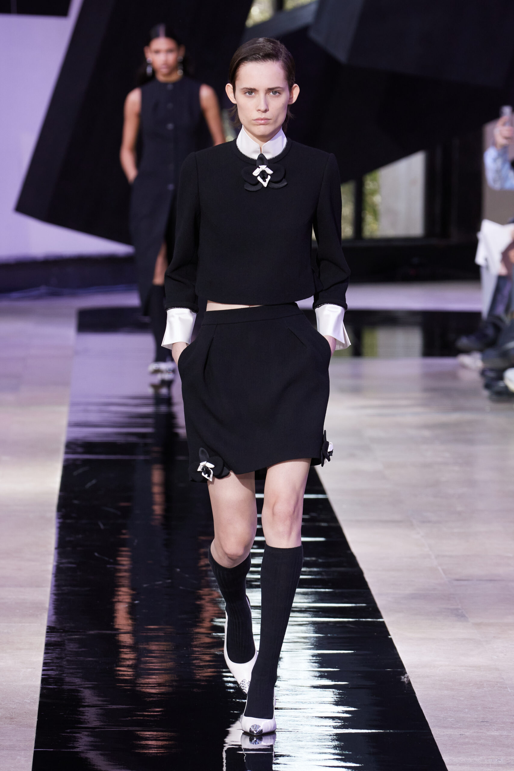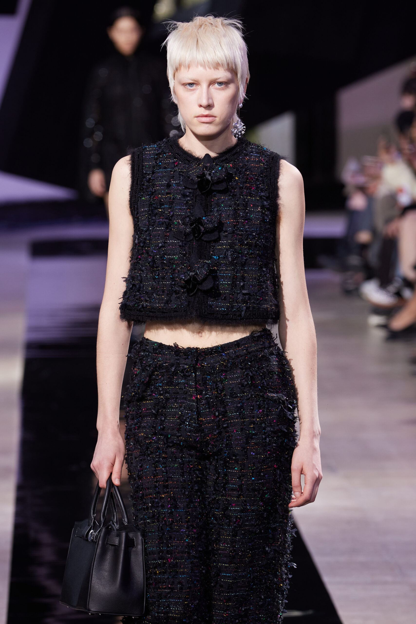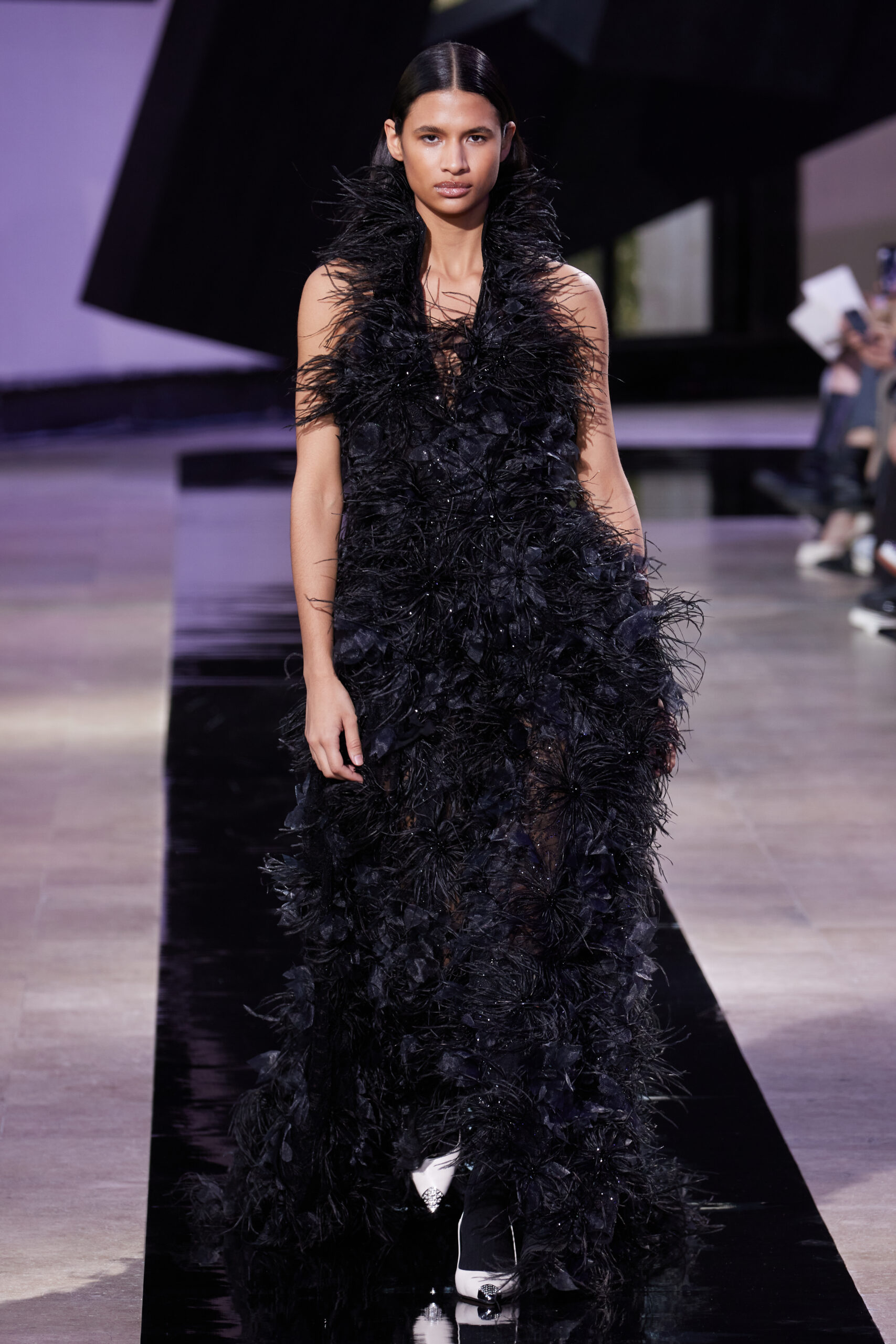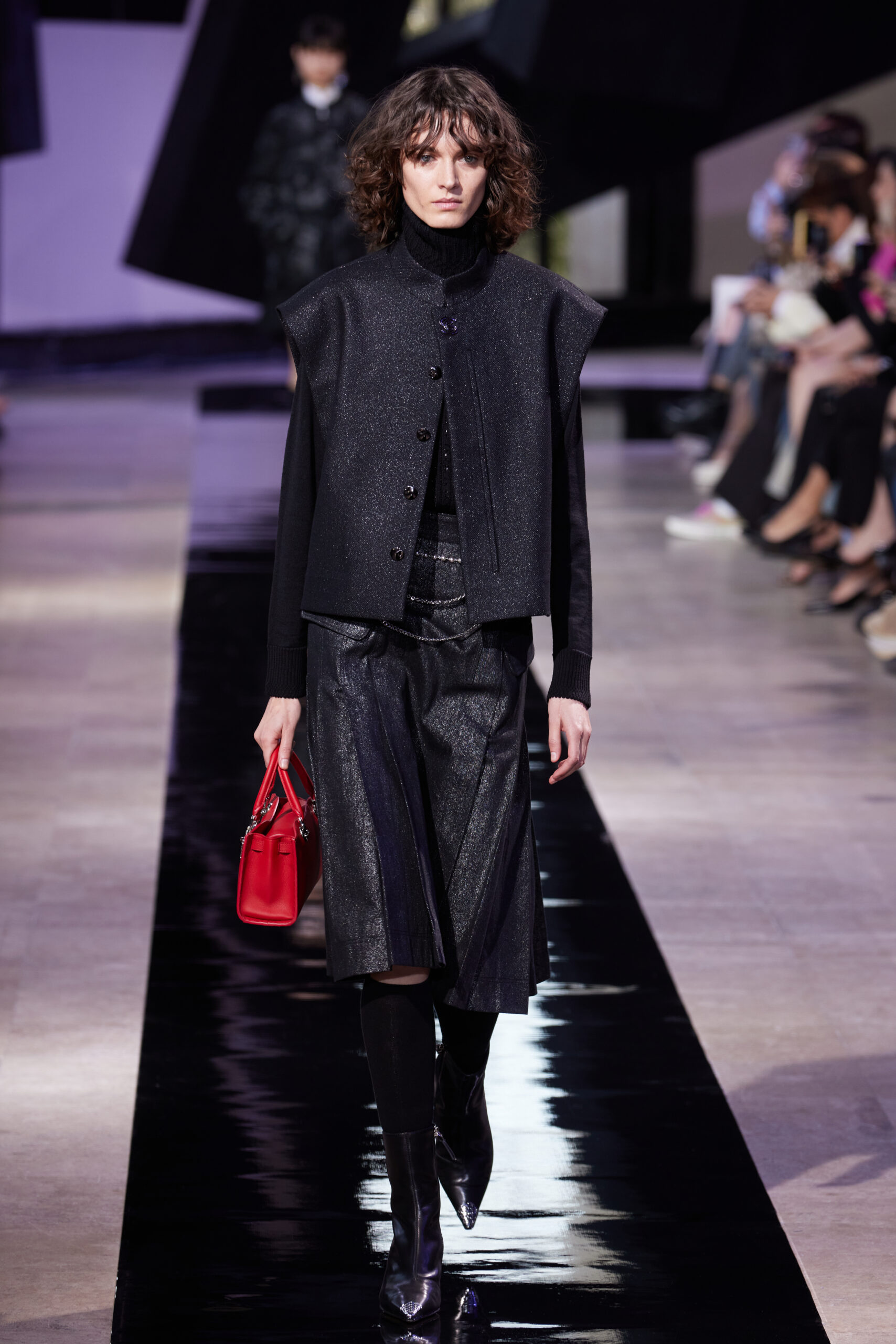 Les vêtements, principalement de couleur encre, révèlent des détails sophistiqués comme des fils dorés incrustés dans des jacquards en métal noir, des superpositions de rubans sur de la broderie, des franges noires, et de la laine mohair noire, illustrant la dynamique entre le calme et l’agitation des motifs d’encre.