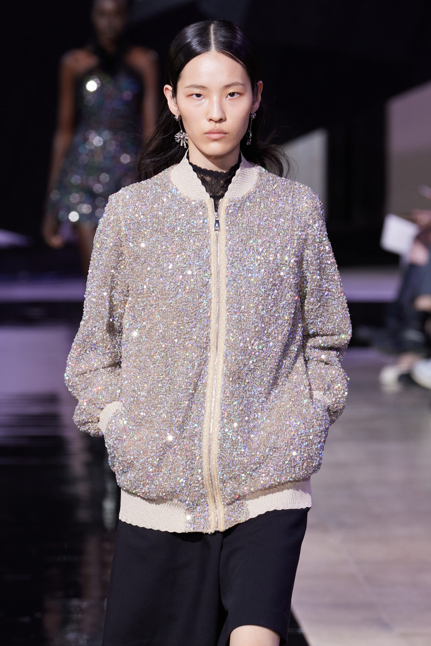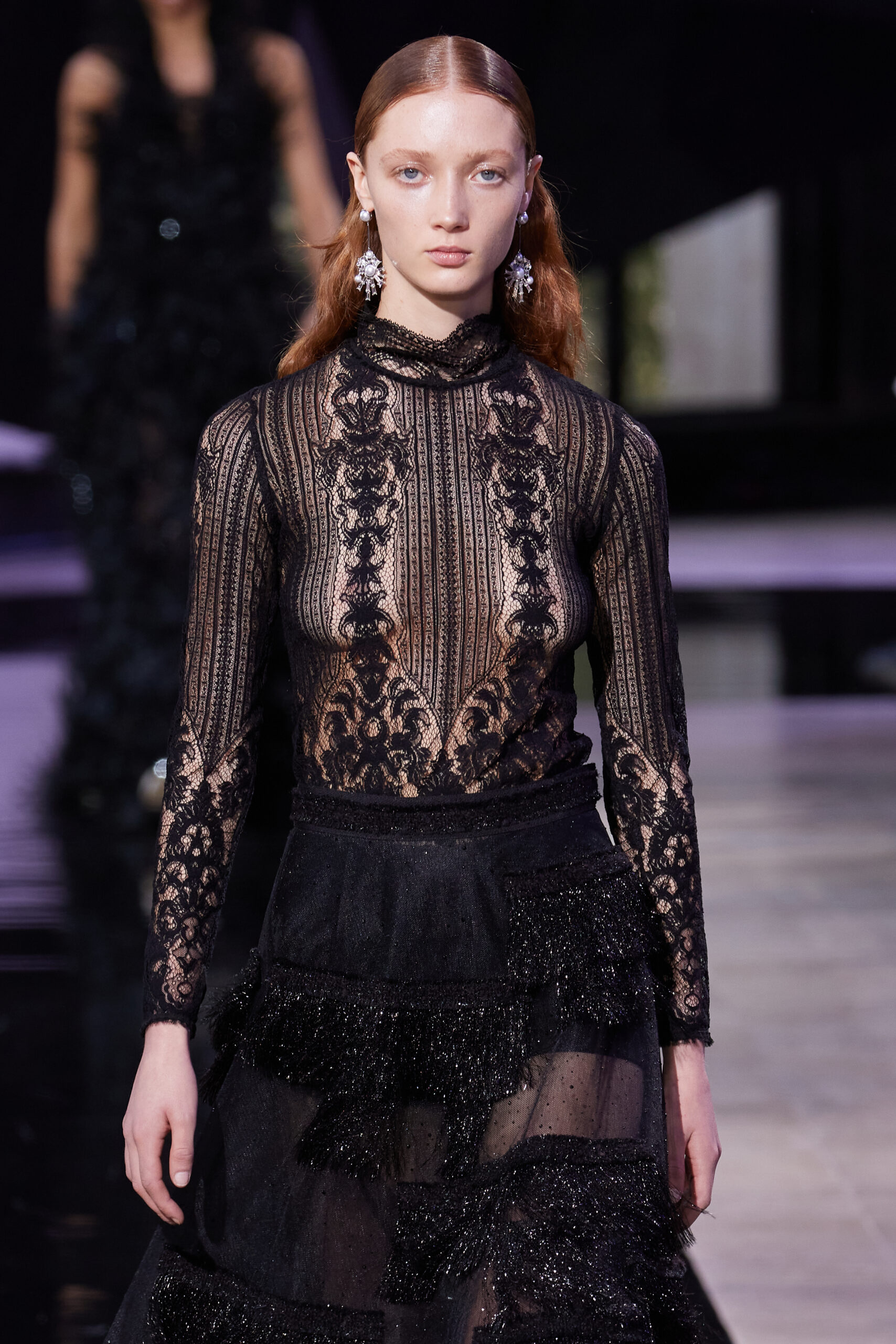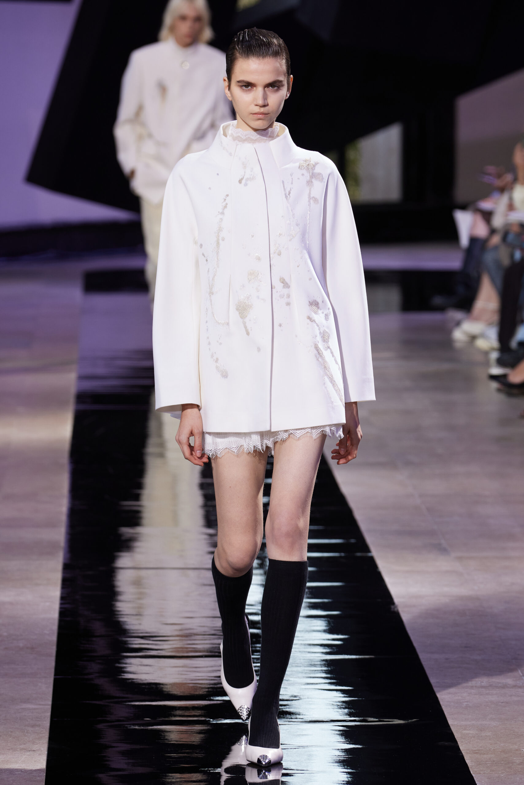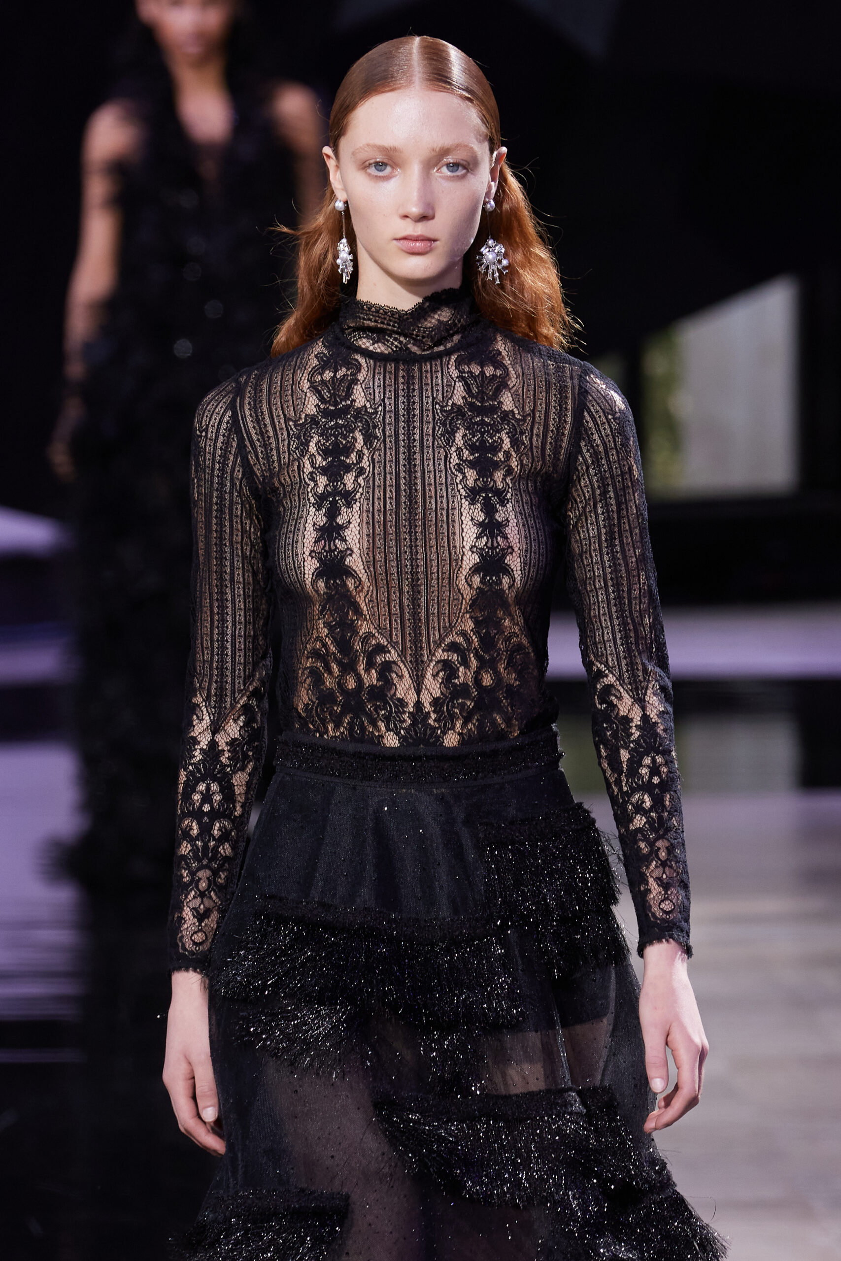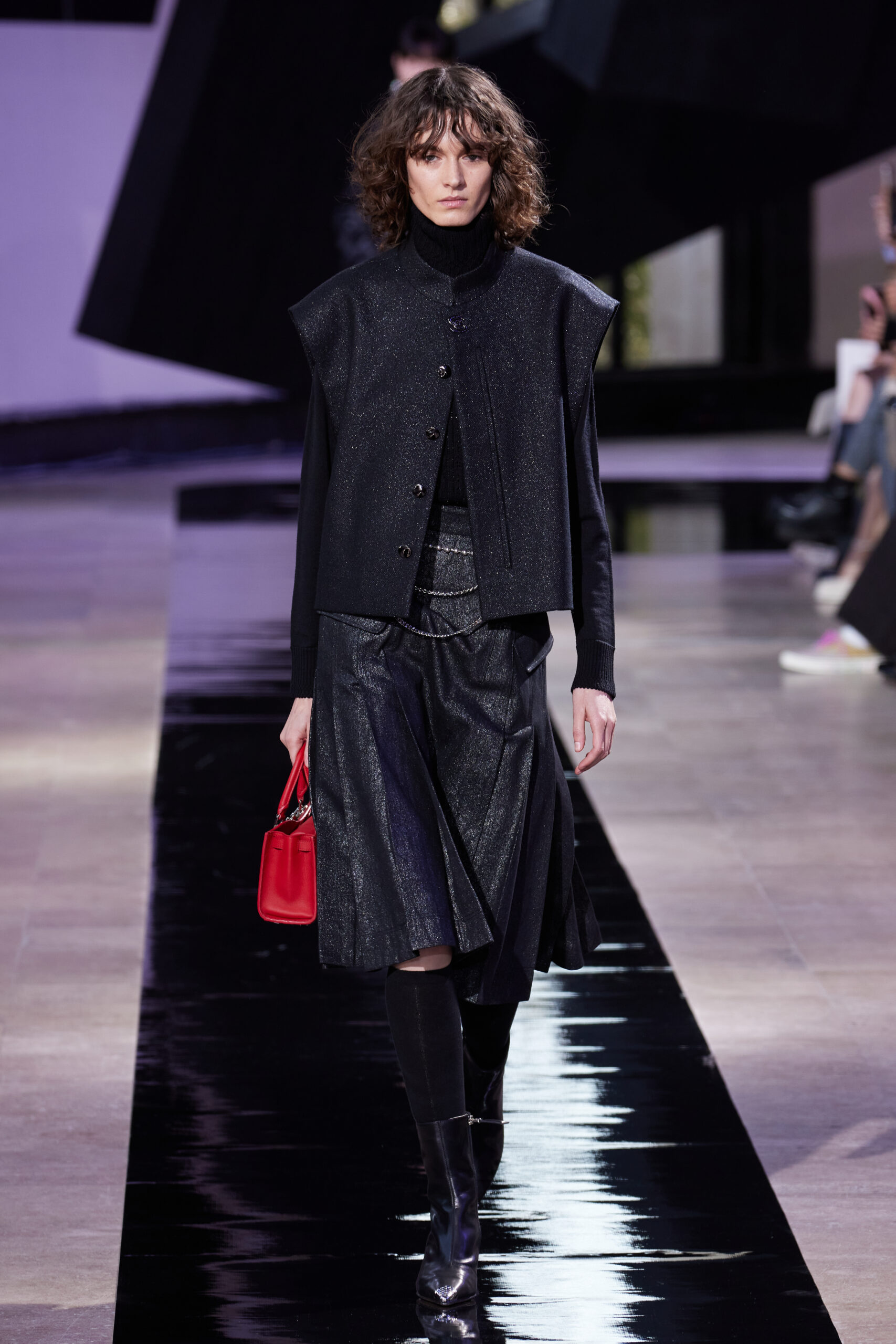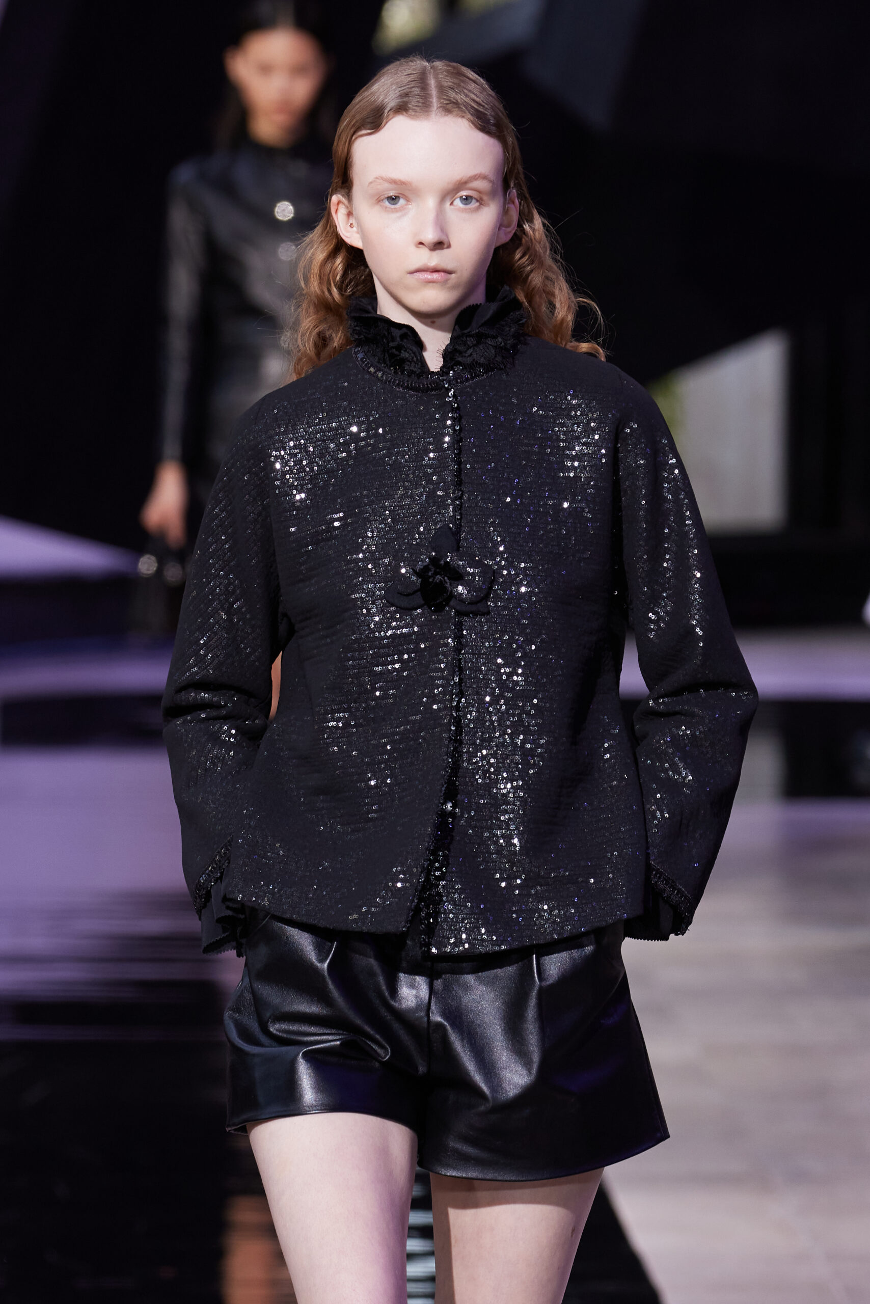 Les vêtements, principalement de couleur encre, révèlent des détails sophistiqués comme des fils dorés incrustés dans des jacquards en métal noir, des superpositions de rubans sur de la broderie, des franges noires, et de la laine mohair noire, illustrant la dynamique entre le calme et l’agitation des motifs d’encre.