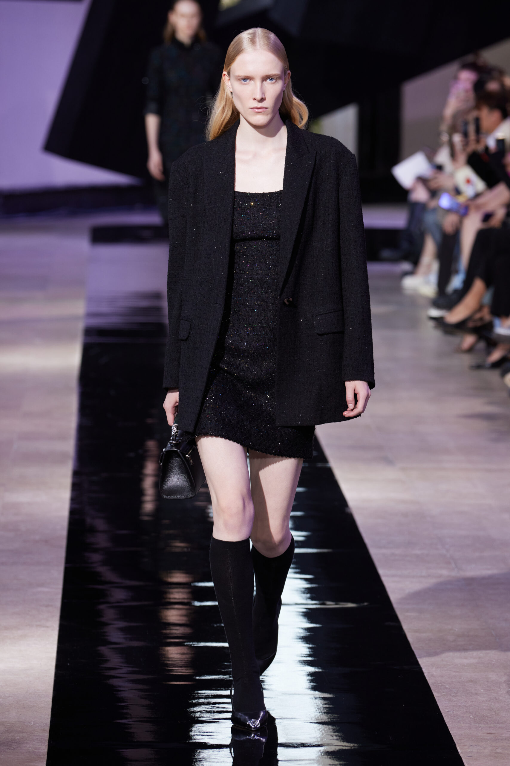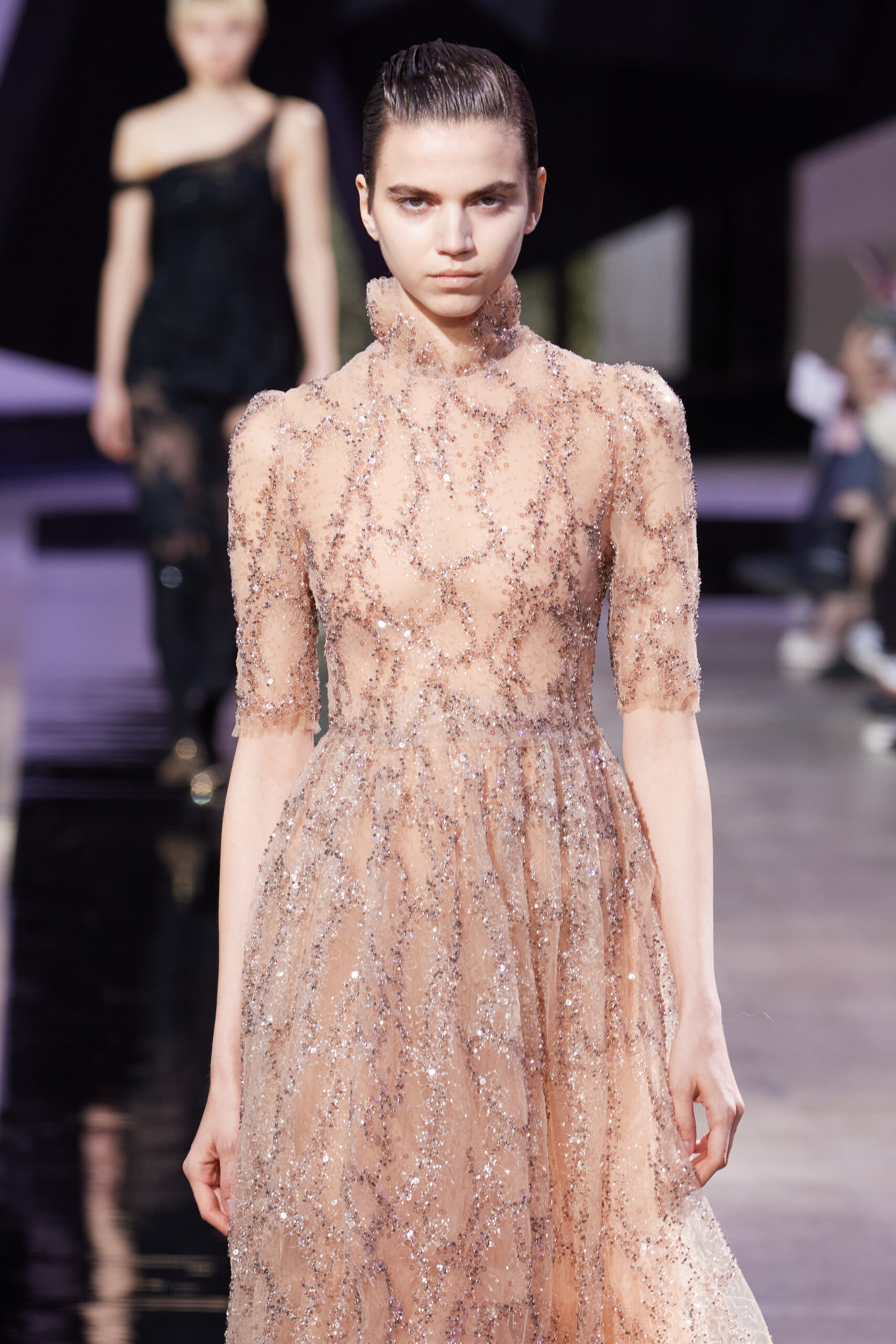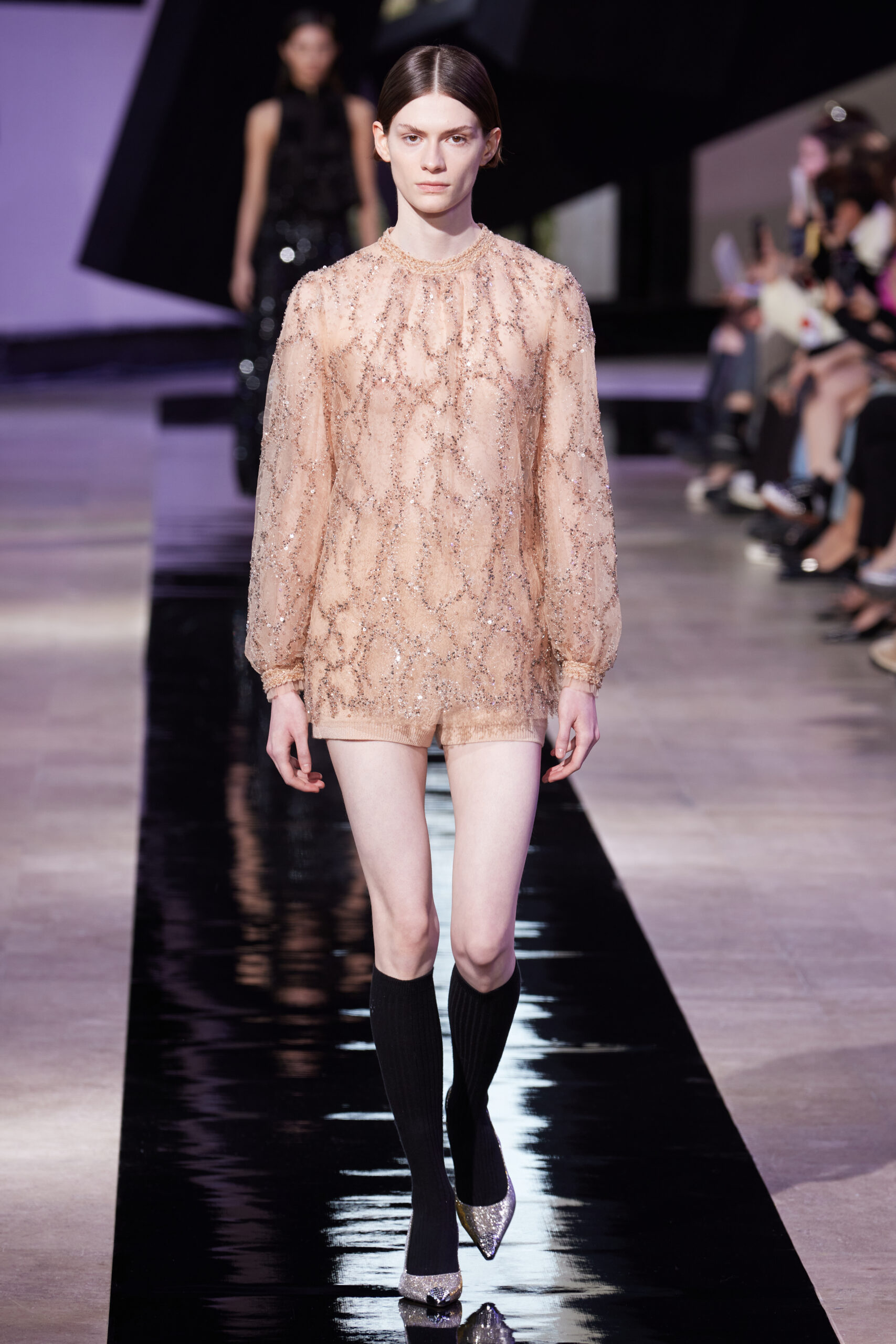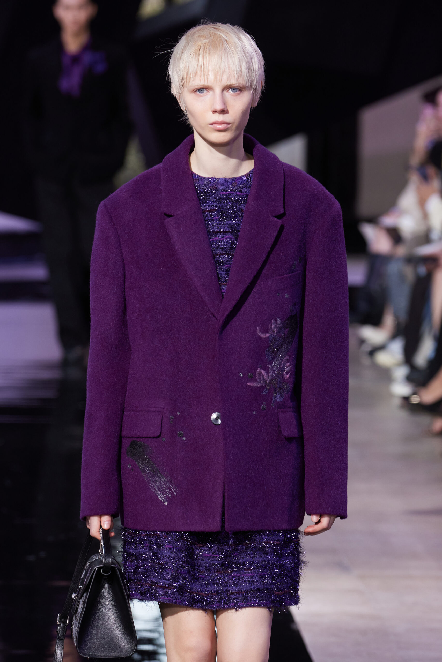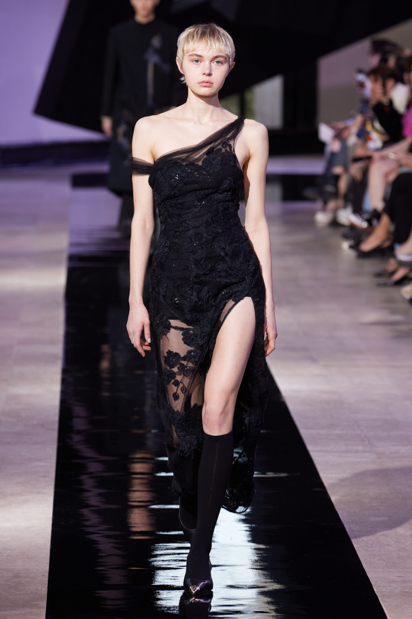 Les vêtements, principalement de couleur encre, révèlent des détails sophistiqués comme des fils dorés incrustés dans des jacquards en métal noir, des superpositions de rubans sur de la broderie, des franges noires, et de la laine mohair noire, illustrant la dynamique entre le calme et l’agitation des motifs d’encre.