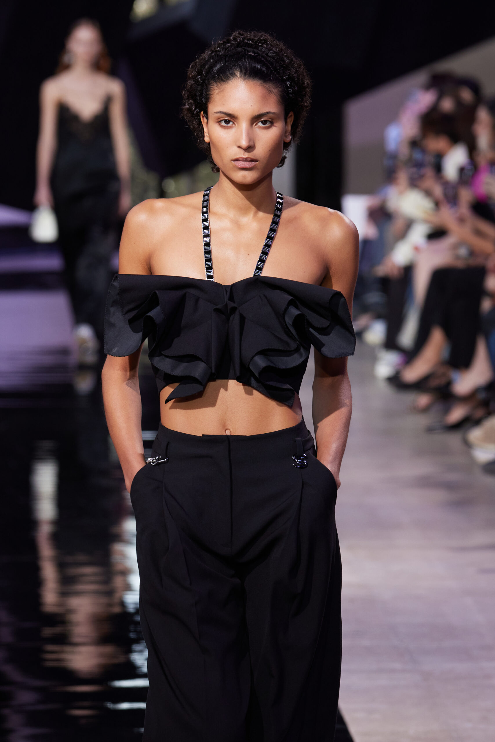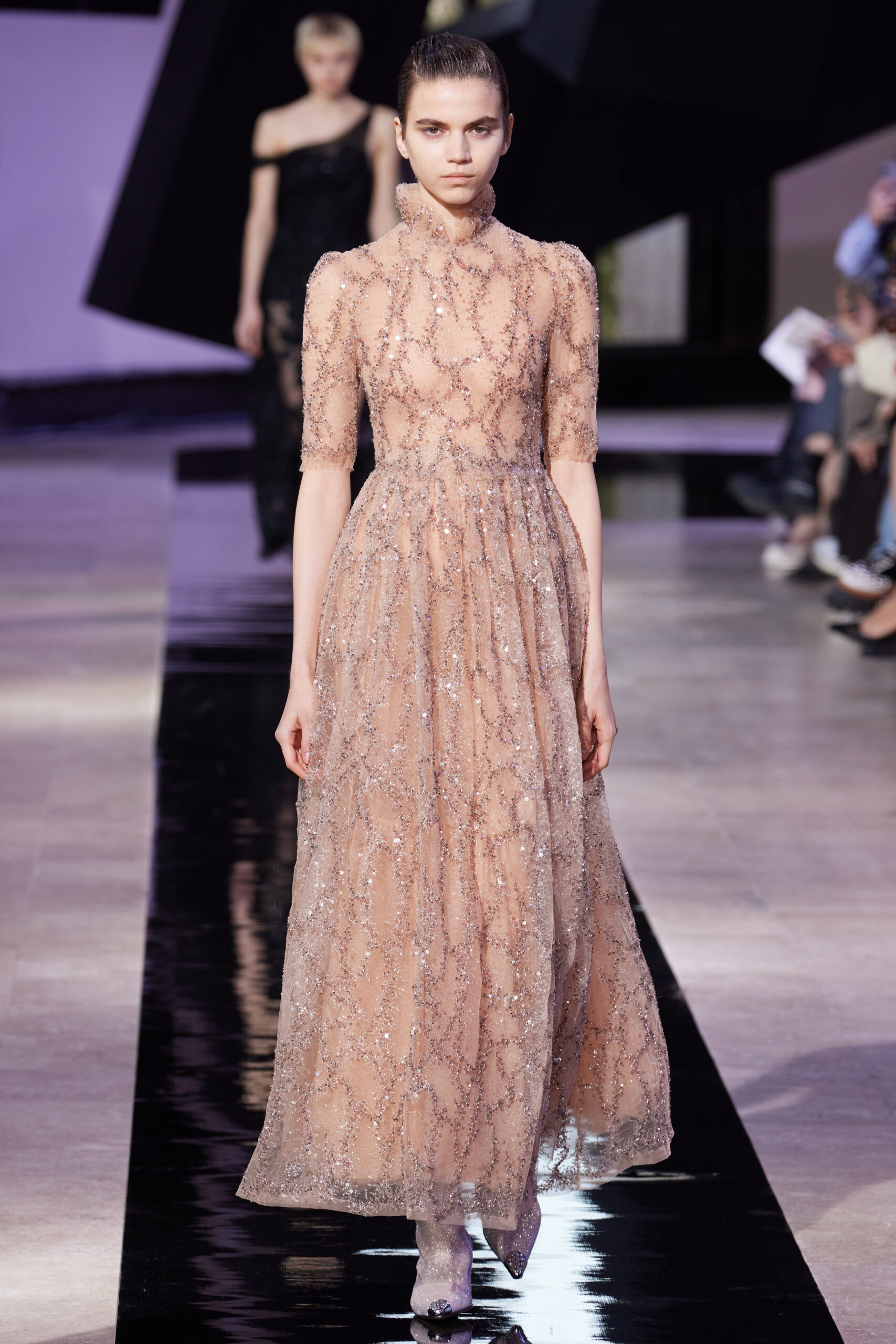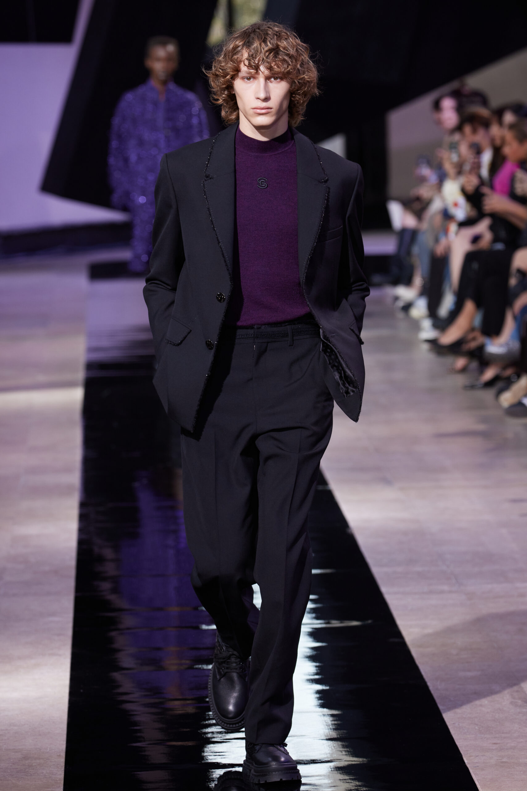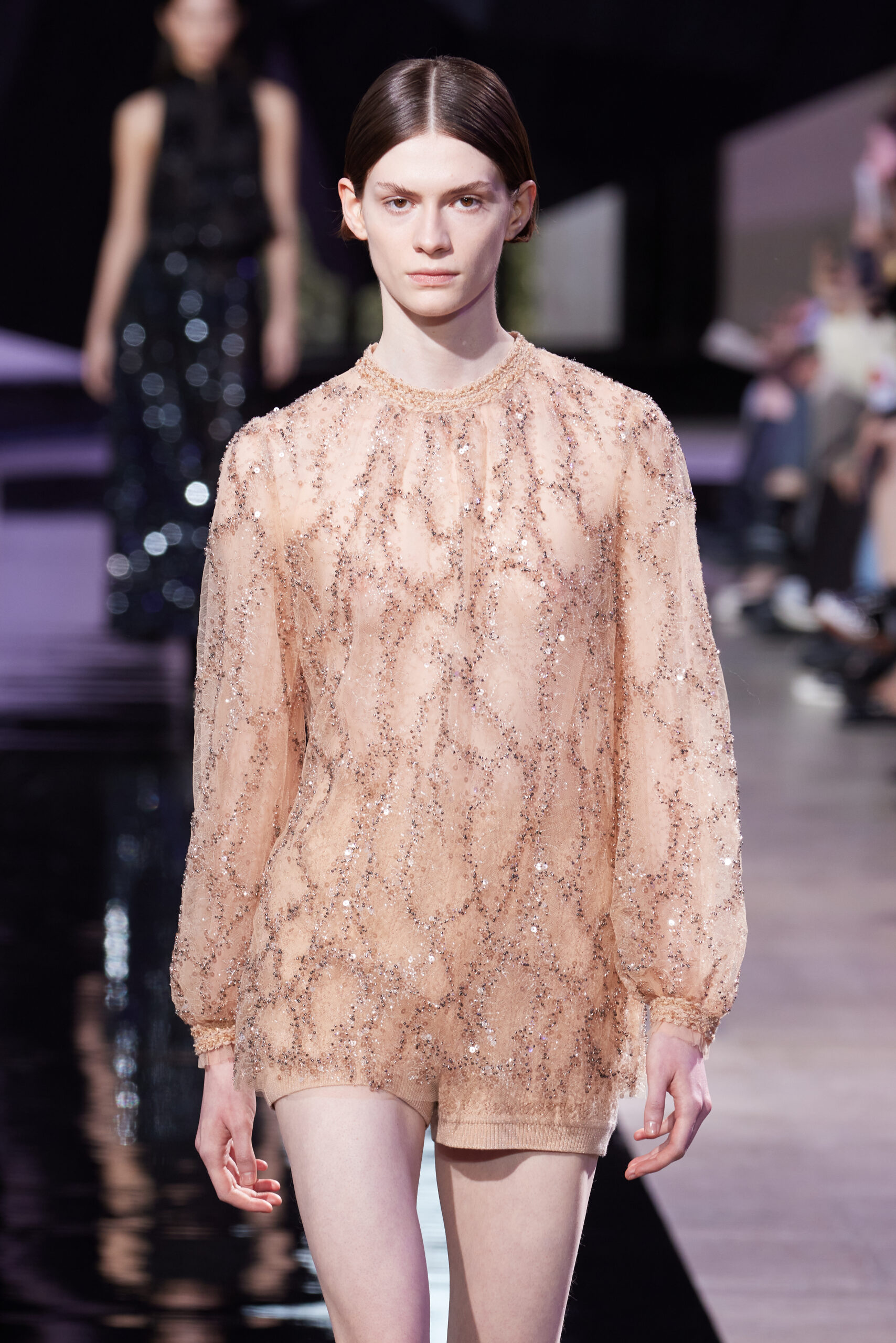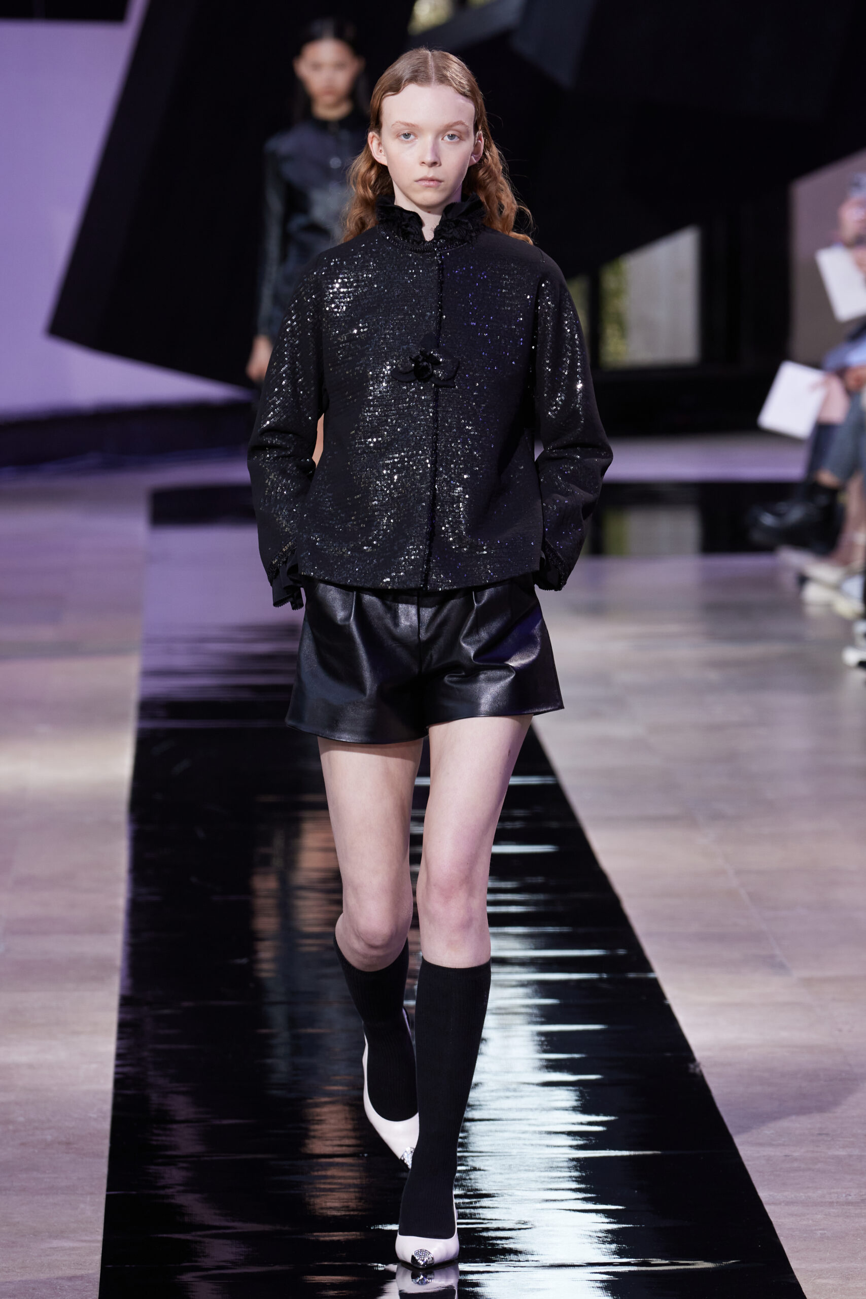 Les vêtements, principalement de couleur encre, révèlent des détails sophistiqués comme des fils dorés incrustés dans des jacquards en métal noir, des superpositions de rubans sur de la broderie, des franges noires, et de la laine mohair noire, illustrant la dynamique entre le calme et l’agitation des motifs d’encre.