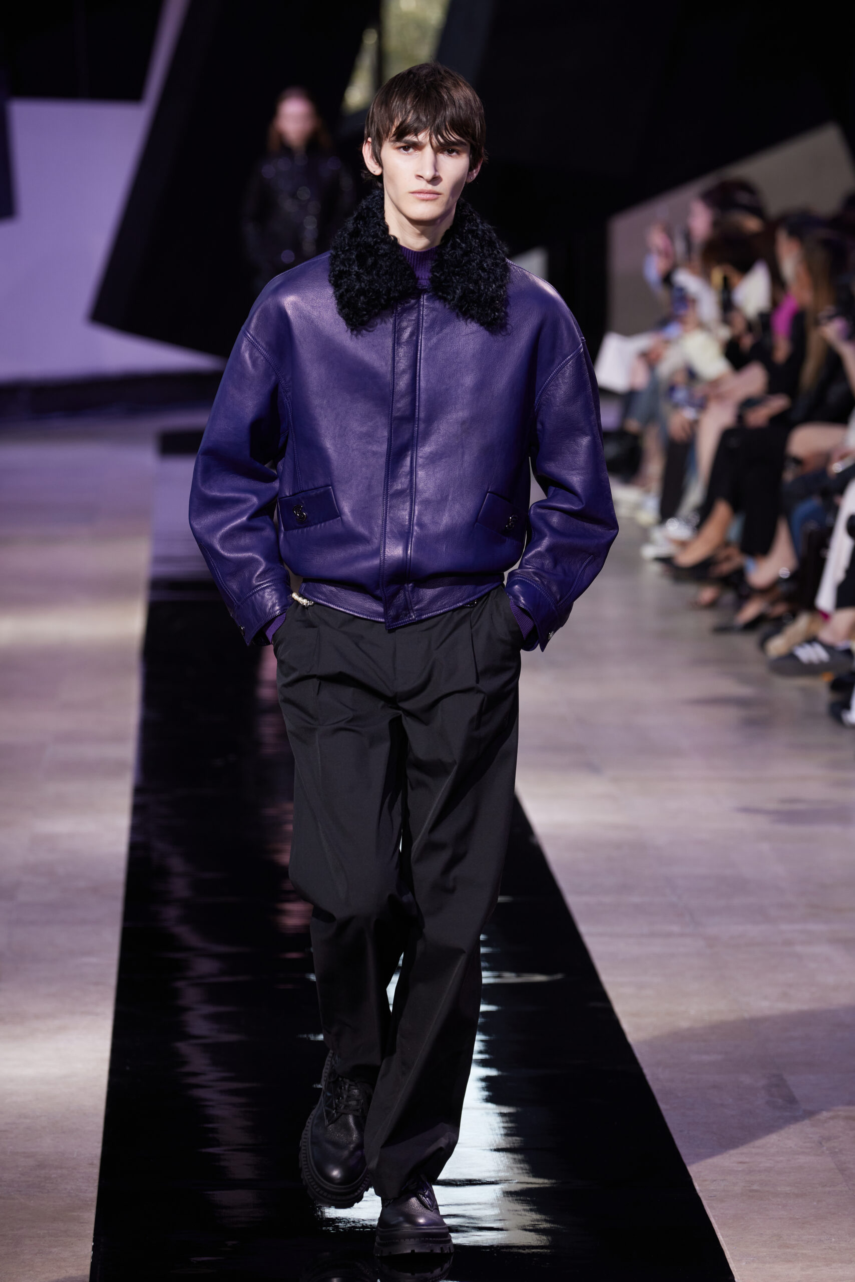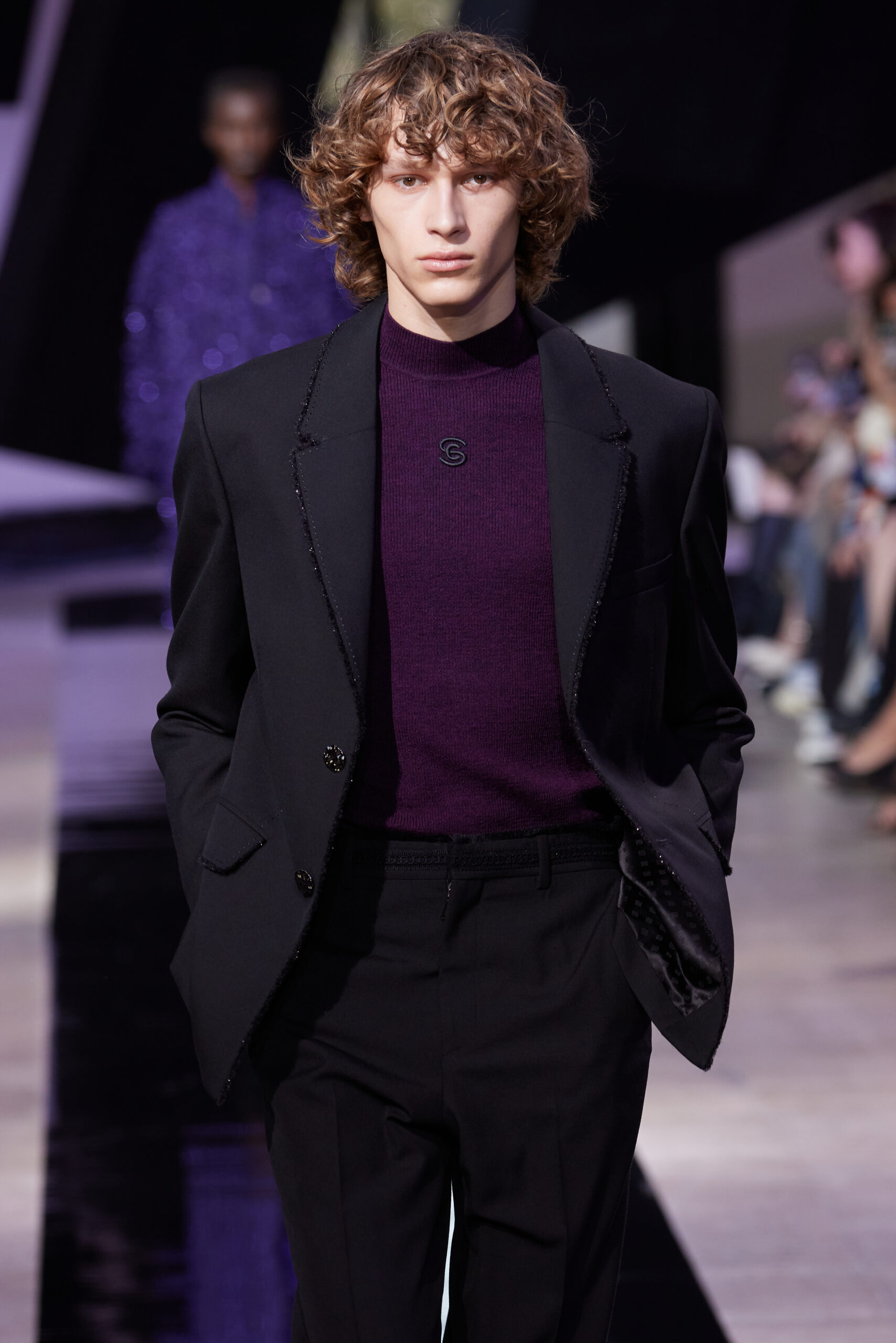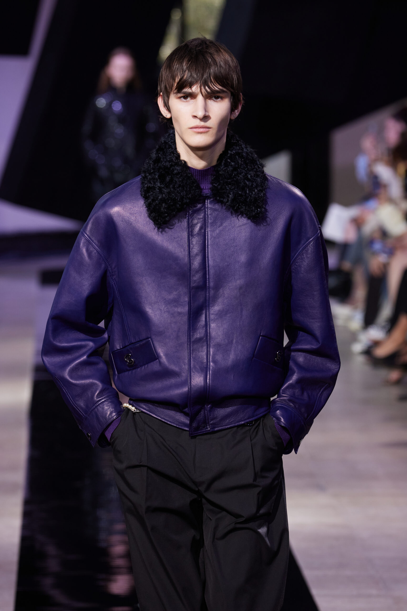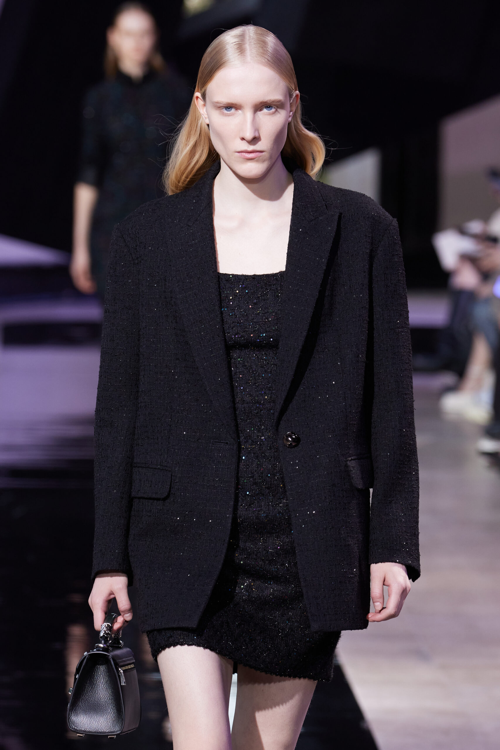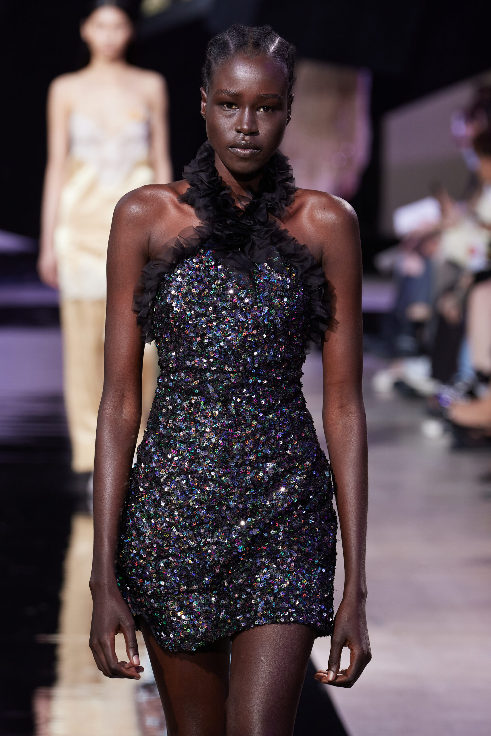 Les vêtements, principalement de couleur encre, révèlent des détails sophistiqués comme des fils dorés incrustés dans des jacquards en métal noir, des superpositions de rubans sur de la broderie, des franges noires, et de la laine mohair noire, illustrant la dynamique entre le calme et l’agitation des motifs d’encre.