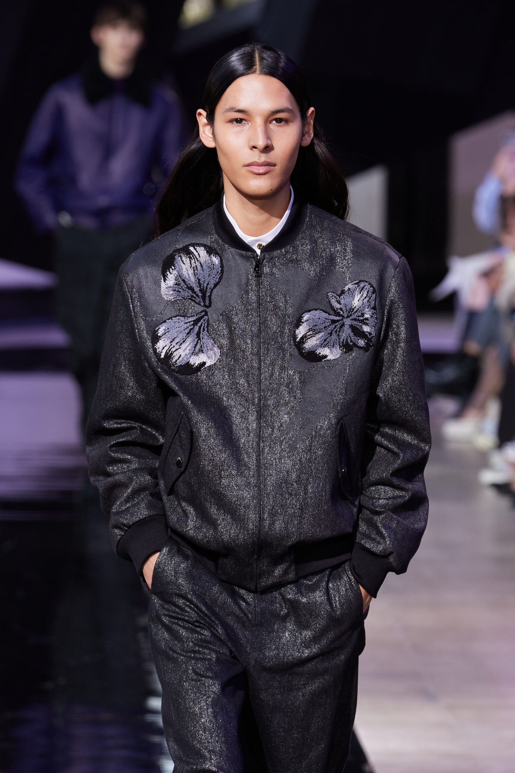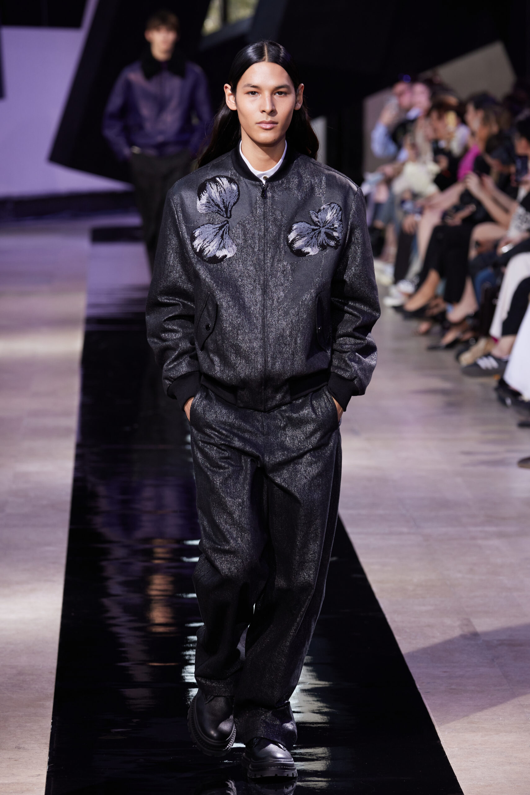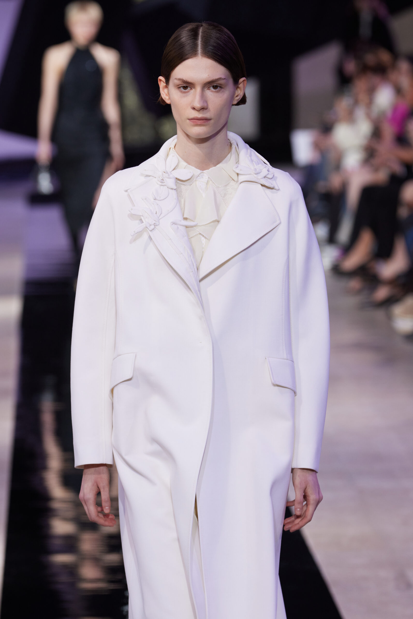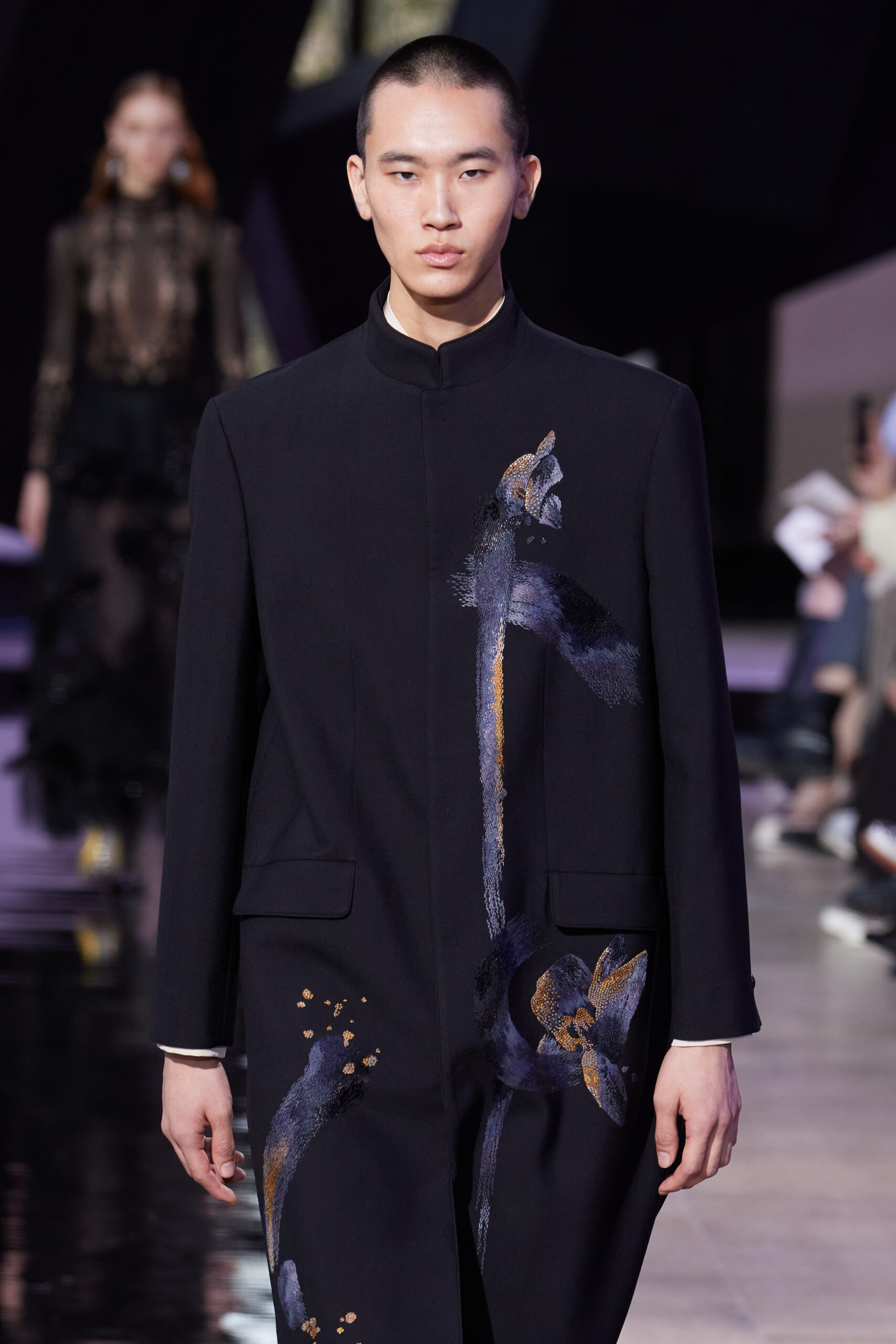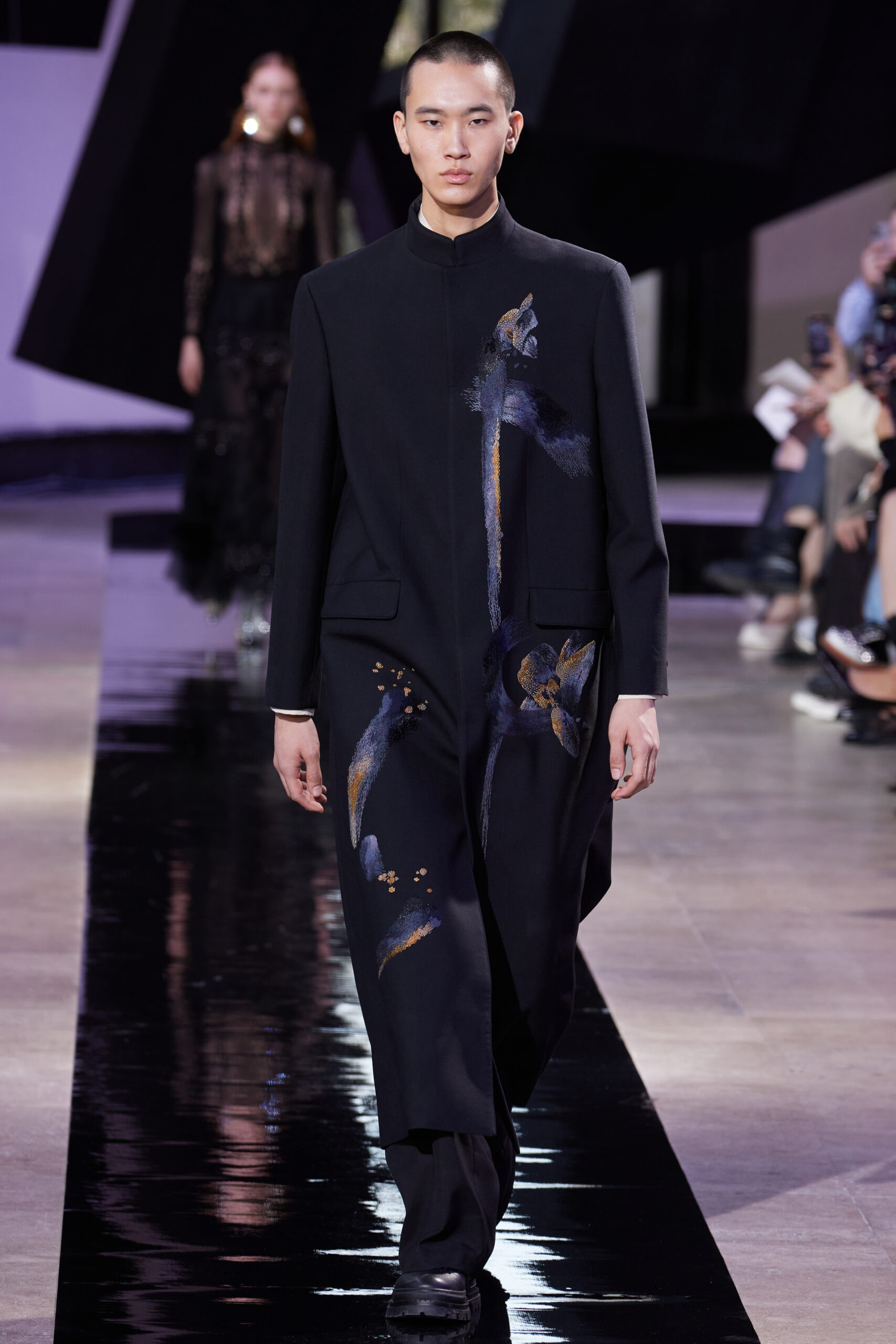 Dans cette collection, le noir de l’encre est décliné en cinq nuances : charbon, lourd, fort, léger, et pâle. Ces teintes se retrouvent dans des motifs floraux brodés en multiples couches, évoquant des orchidées d’encre, et donnent vie à des « fleurs d’encre » à travers des enroulements complexes, emblèmes de la collection.