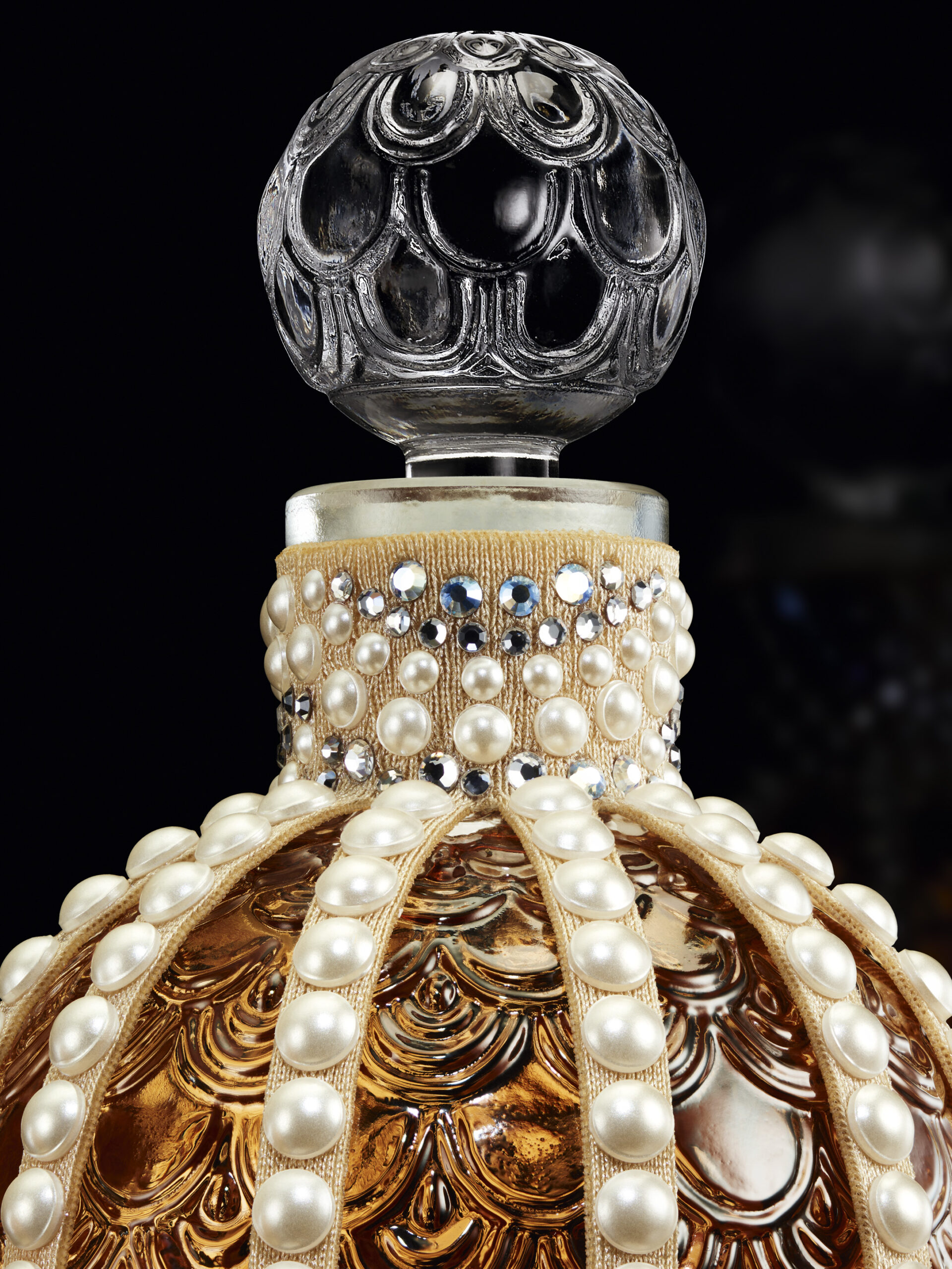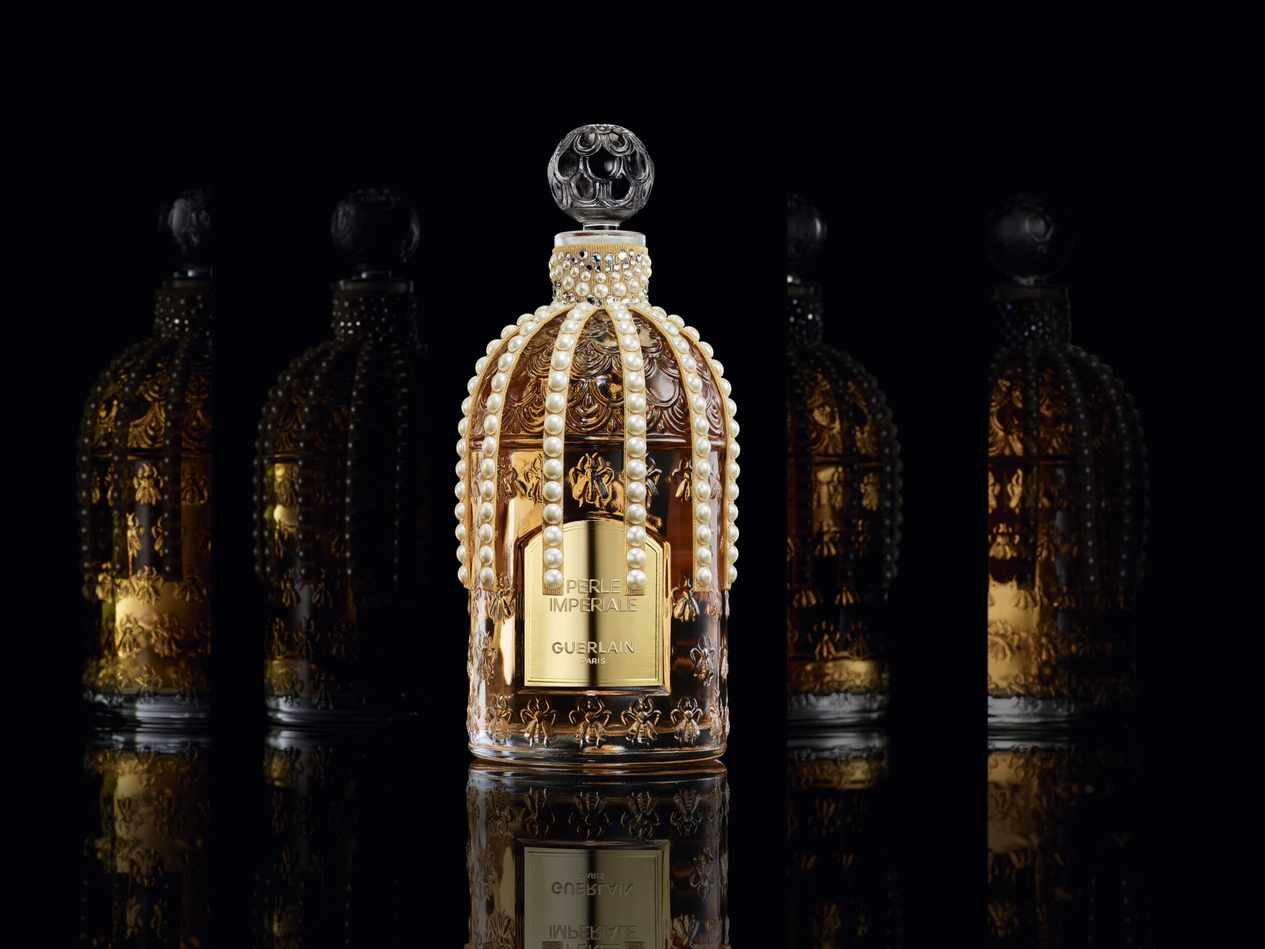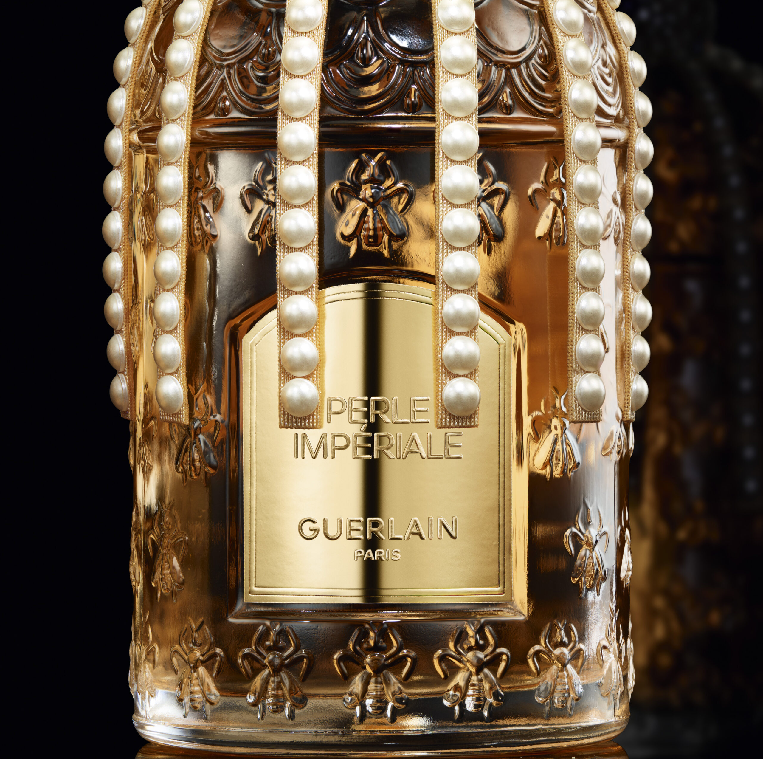 Le Flacon aux Abeilles, symbole emblématique de la Maison Guerlain, s’habille pour l’occasion d’une parure Swarovski inédite. Le col de ce flacon iconique se pare de cabochons à la blancheur perlée et de cristaux éclatants, disposés avec soin sur un ruban crème, conférant à l’ensemble une grâce infinie et une opulence orientale moderne. Cette métamorphose résulte d’un savoir-faire artisanal d’exception, où chaque ornement reflète un luxe contemplatif, vecteur d’émotions profondes et de fascination.