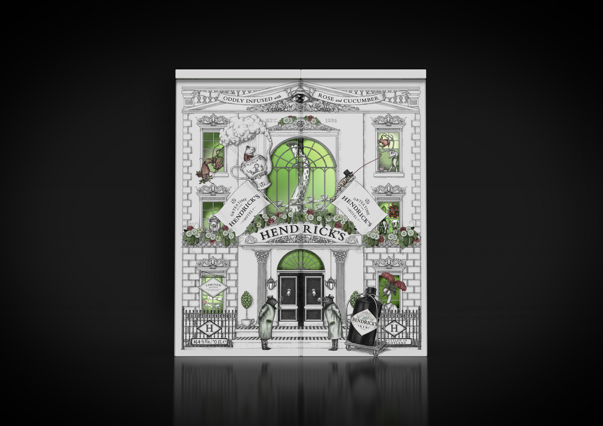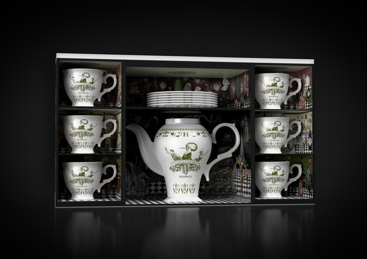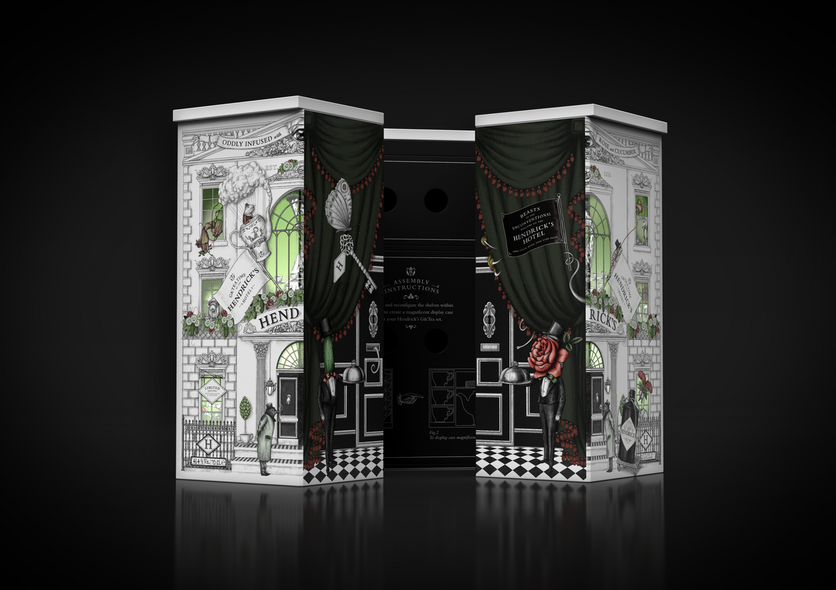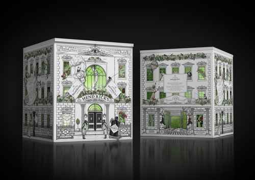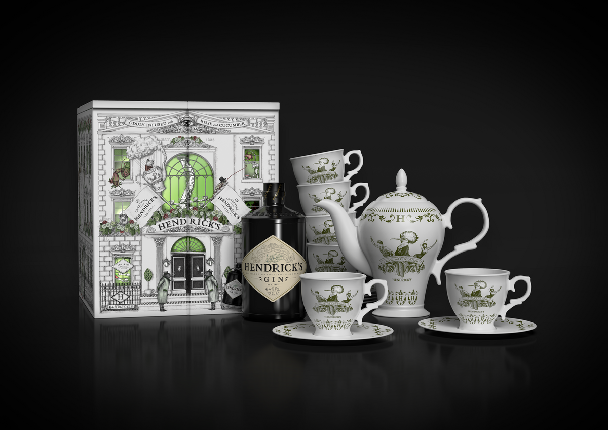 Le coffret, inspiré du Grand Gin Hotel, révèle un univers insolite et captivant, une véritable invitation à l’aventure d’Hendrick’s. À l’intérieur, un service à thé sur mesure, composé d’une théière, de six tasses et de six soucoupes, est joliment présenté aux côtés d’une bouteille d’Hendrick’s Original de 70cl. Chaque élément du service à thé est orné d’illustrations minutieuses, reflétant l’univers unique d’Hendrick’s.