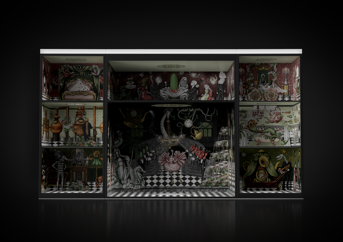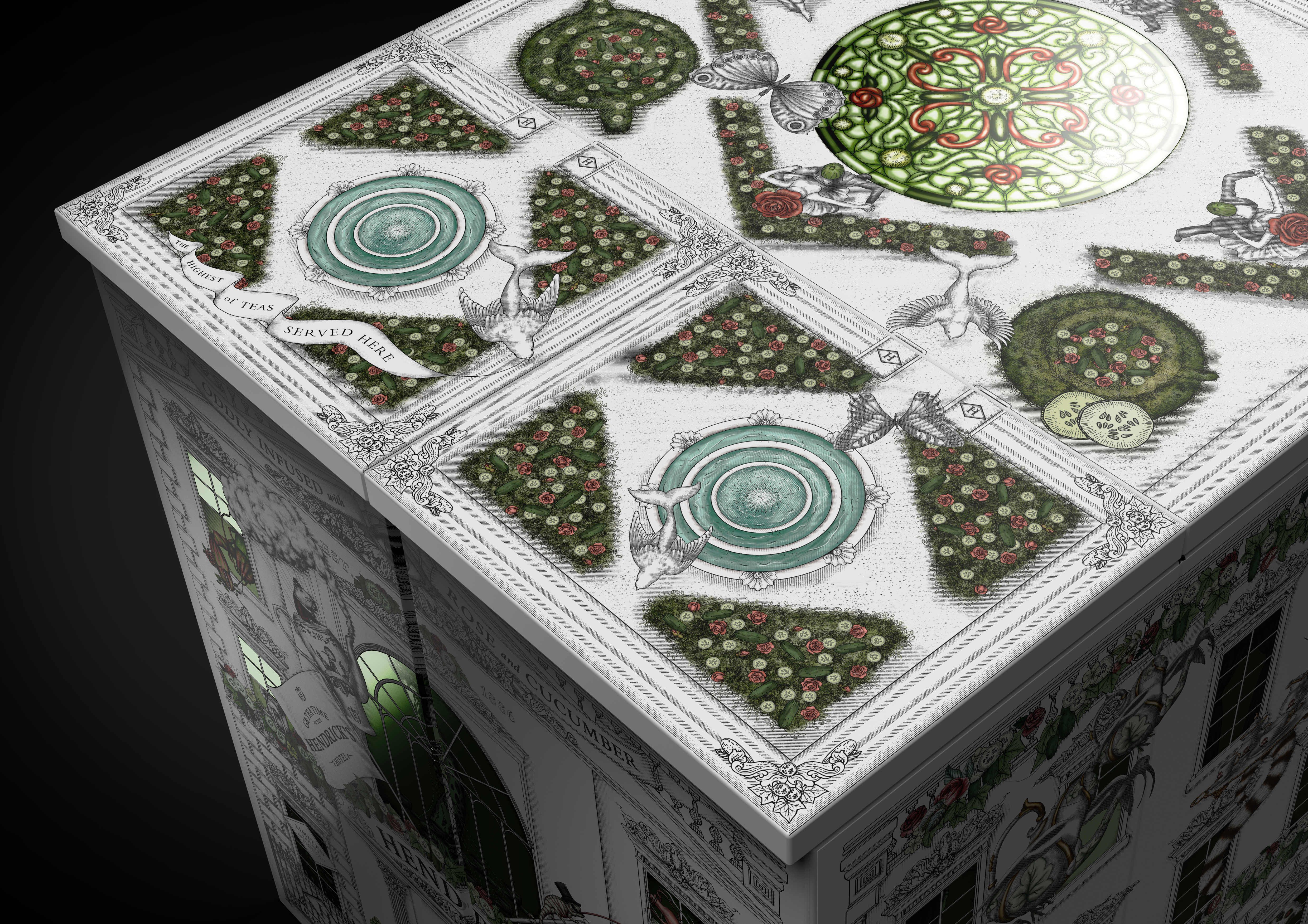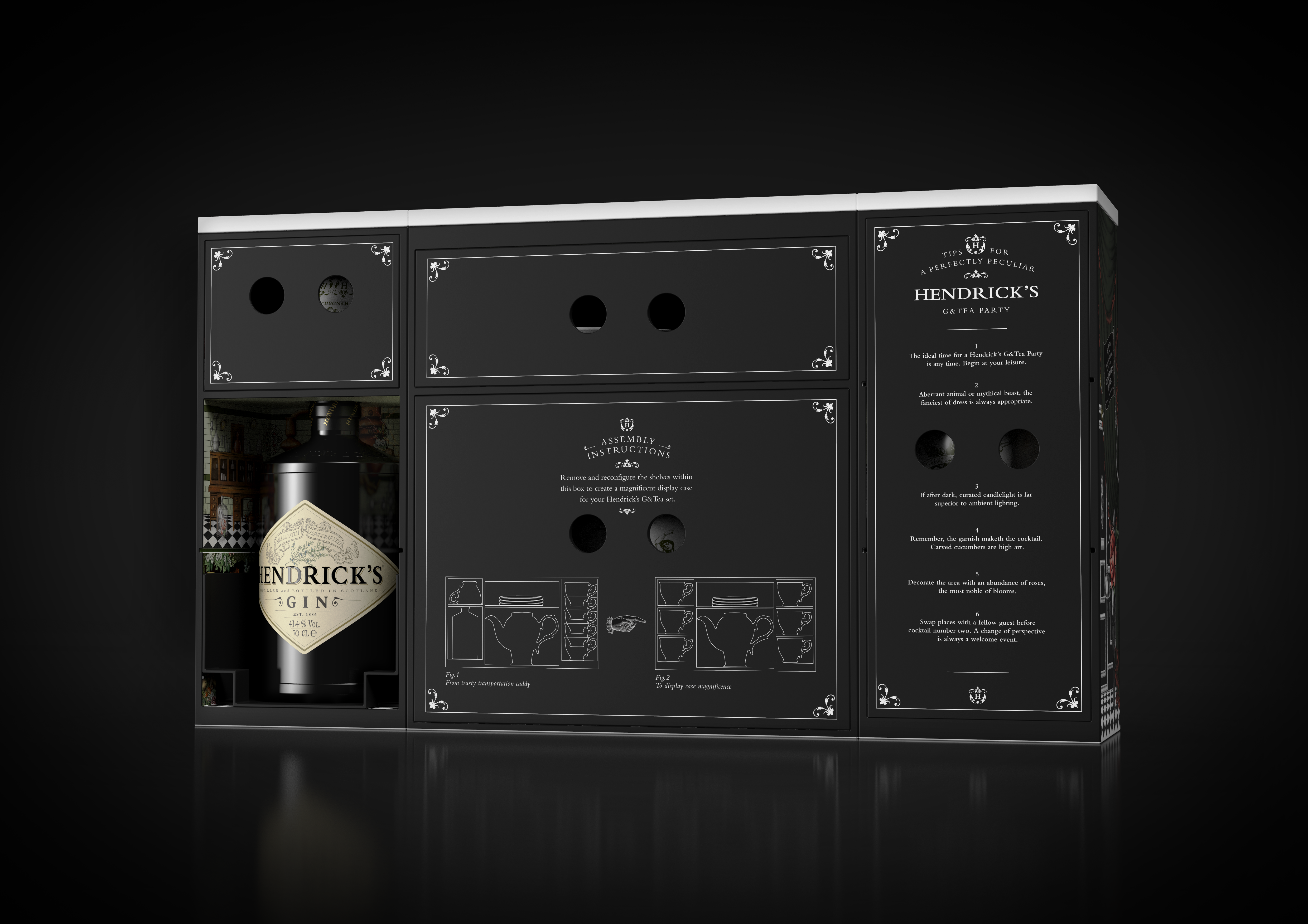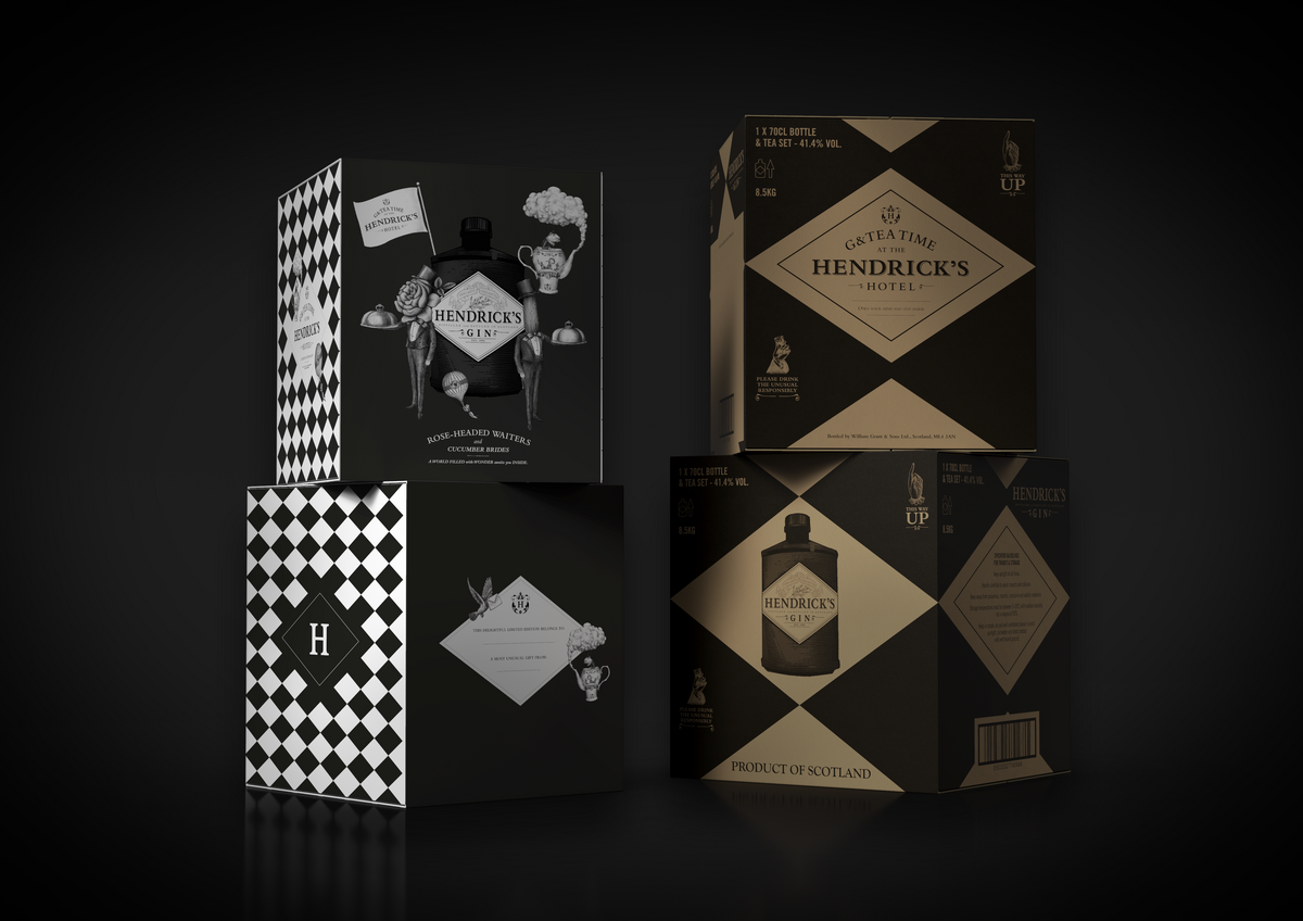 Le coffret, inspiré du Grand Gin Hotel, révèle un univers insolite et captivant, une véritable invitation à l’aventure d’Hendrick’s. À l’intérieur, un service à thé sur mesure, composé d’une théière, de six tasses et de six soucoupes, est joliment présenté aux côtés d’une bouteille d’Hendrick’s Original de 70cl. Chaque élément du service à thé est orné d’illustrations minutieuses, reflétant l’univers unique d’Hendrick’s.