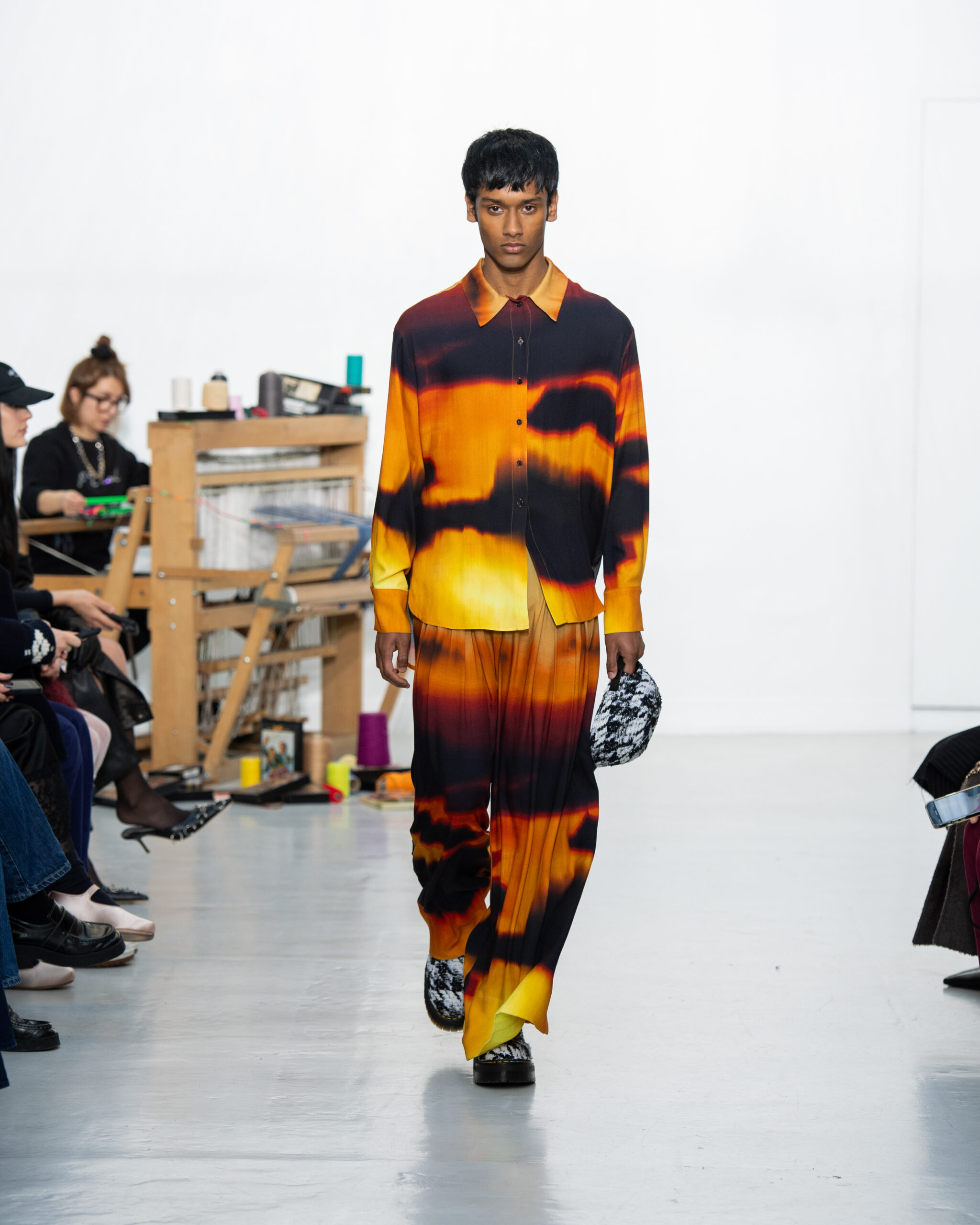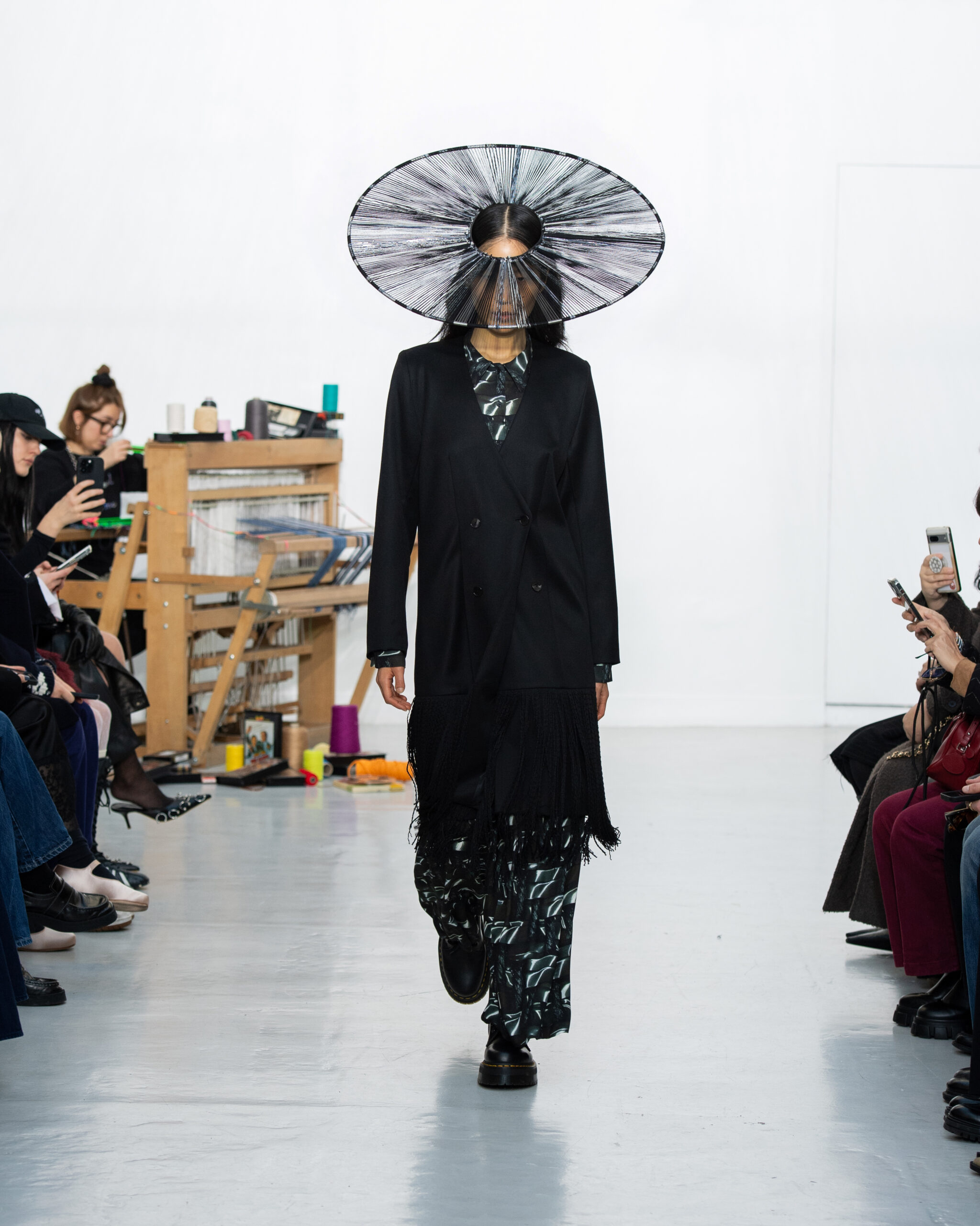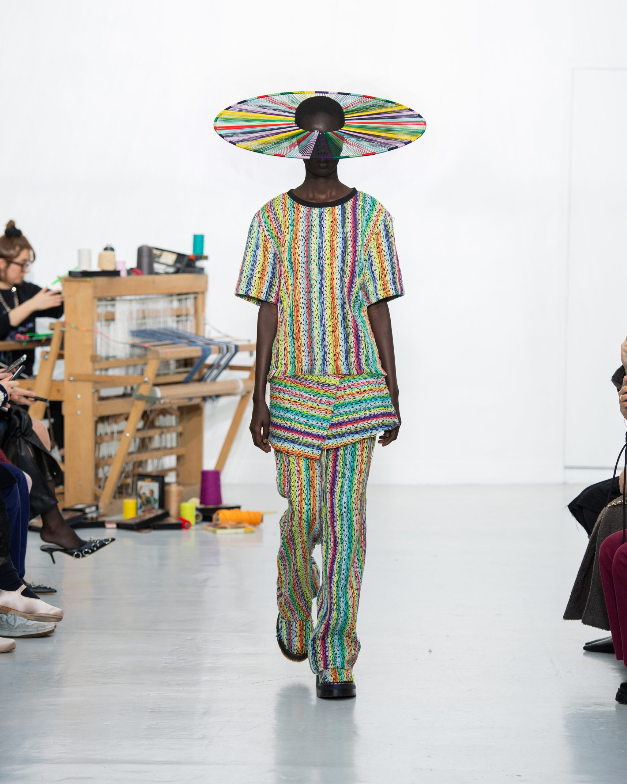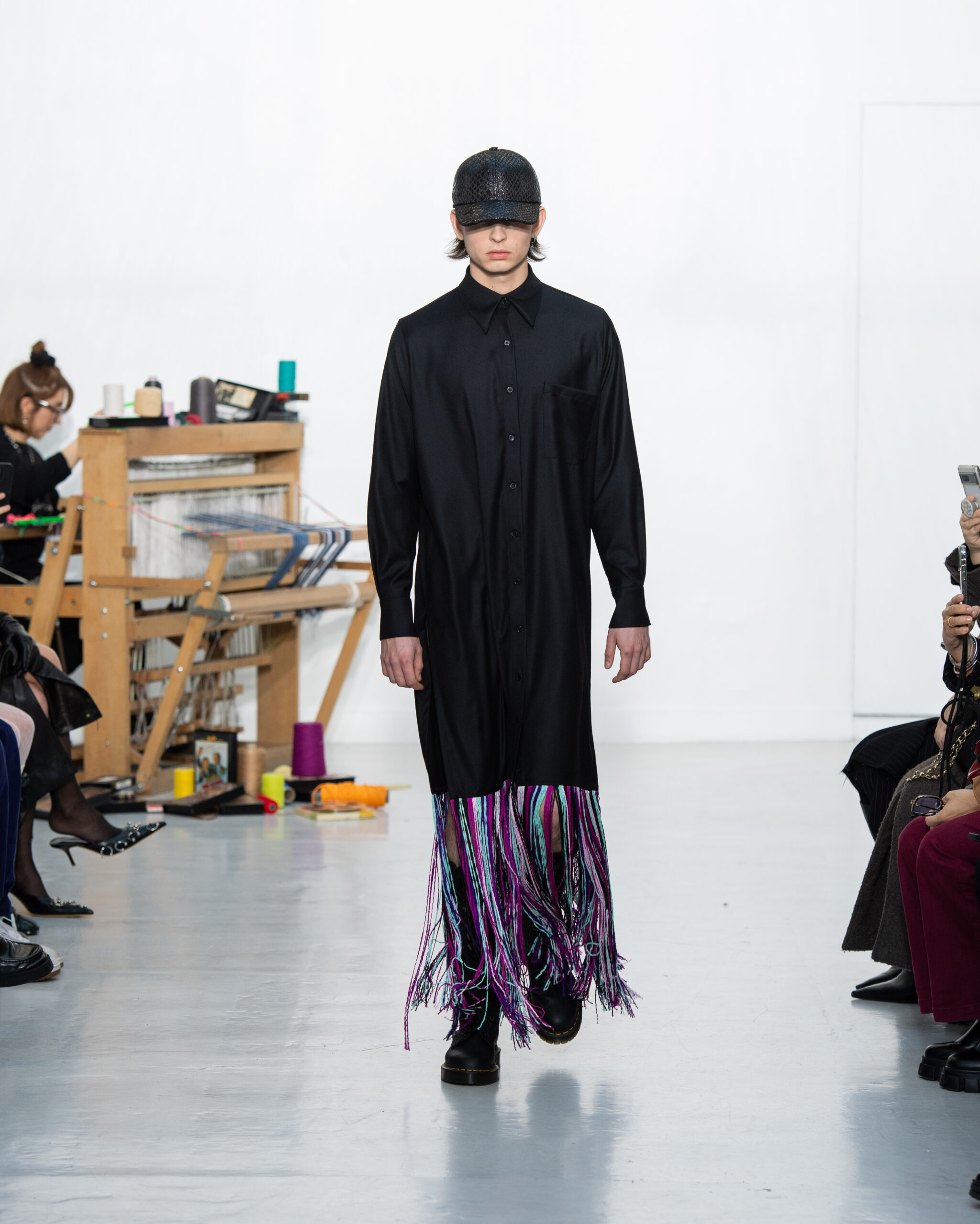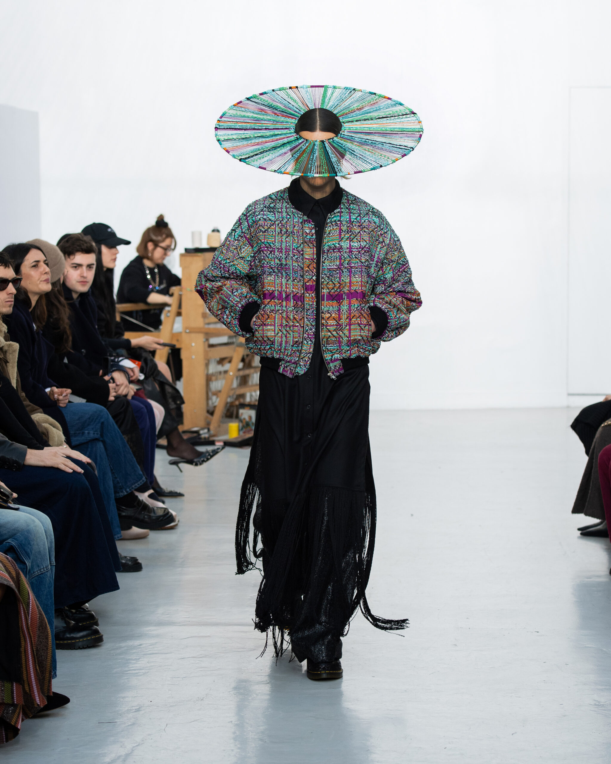 Inspiré par le métier à tisser et les fils, Benmoyal a conçu une expérience immersive : 300 miniatures de métiers à tisser envoyées en guise d’invitations et une scénographie évoquant un métier à tisser géant. Dans ce décor, les mannequins, vêtus de tissus tissés uniques de la tête aux pieds, y compris une collaboration avec Dr. Martens, ont défilé, tandis que des tisserands démontraient leur savoir-faire au milieu des spectateurs. Axée sur le dépassement des limites du design textile, la collection présente 35 looks, incluant la renaissance du tissu emblématique de Benmoyal fait de cassettes recyclées, réimaginé avec un effet peau de serpent synthétique.