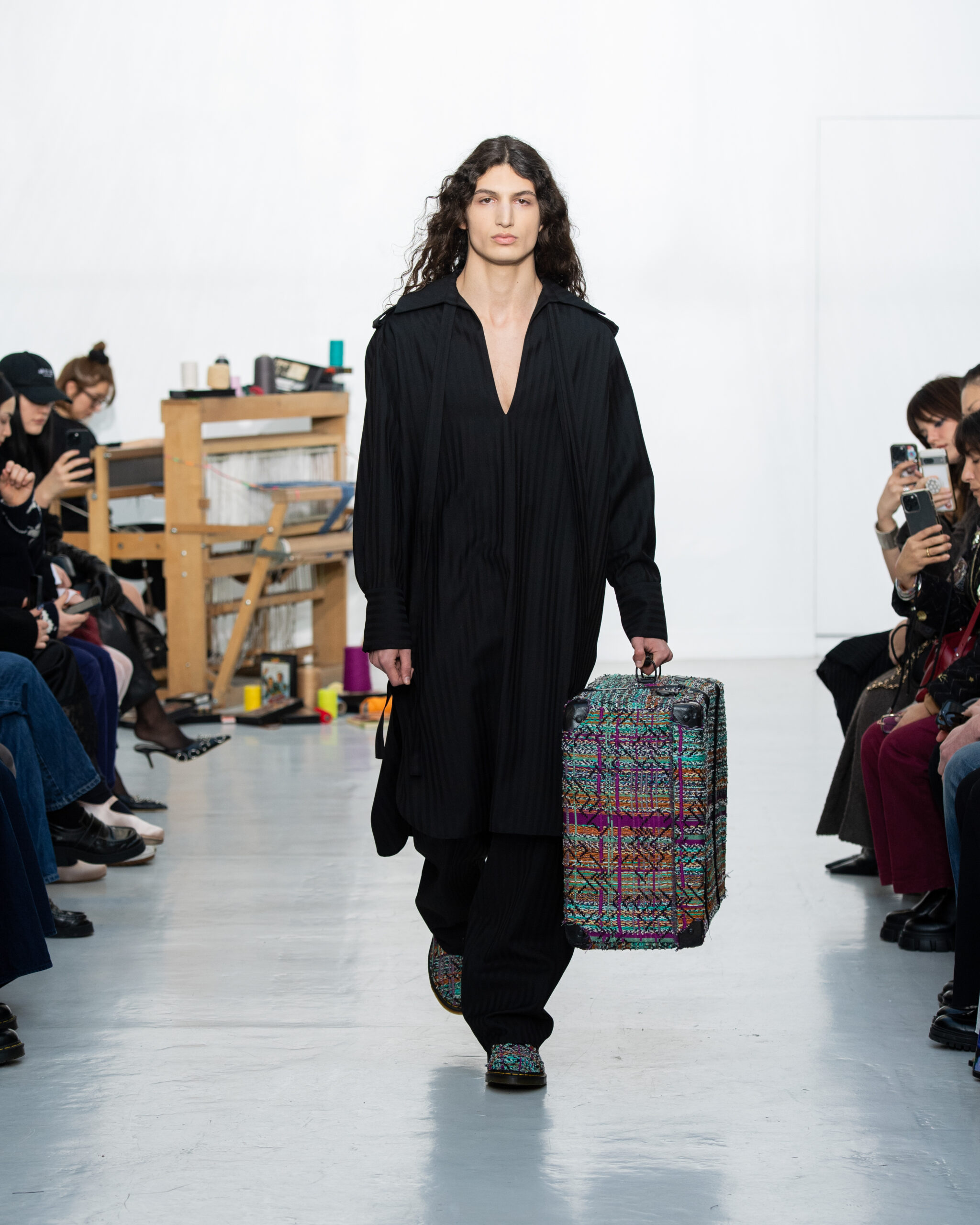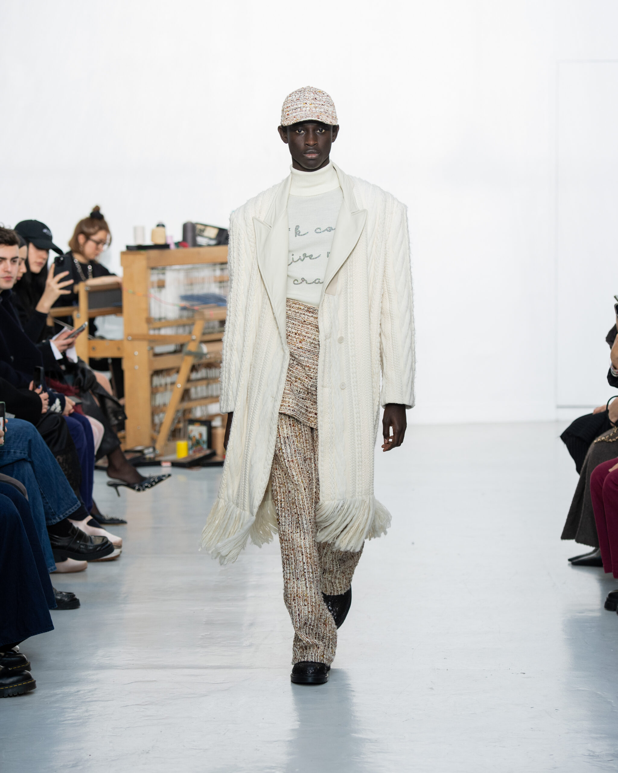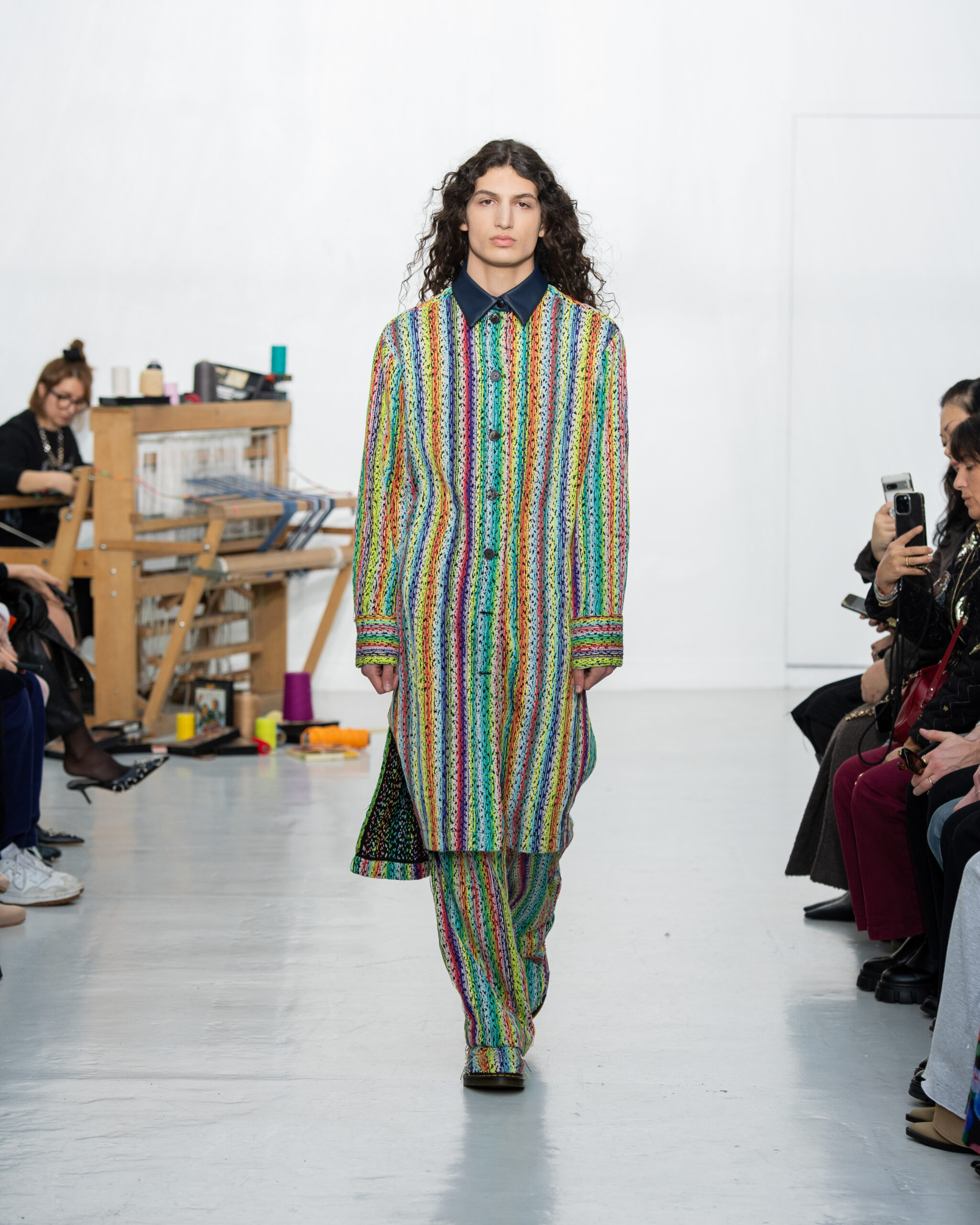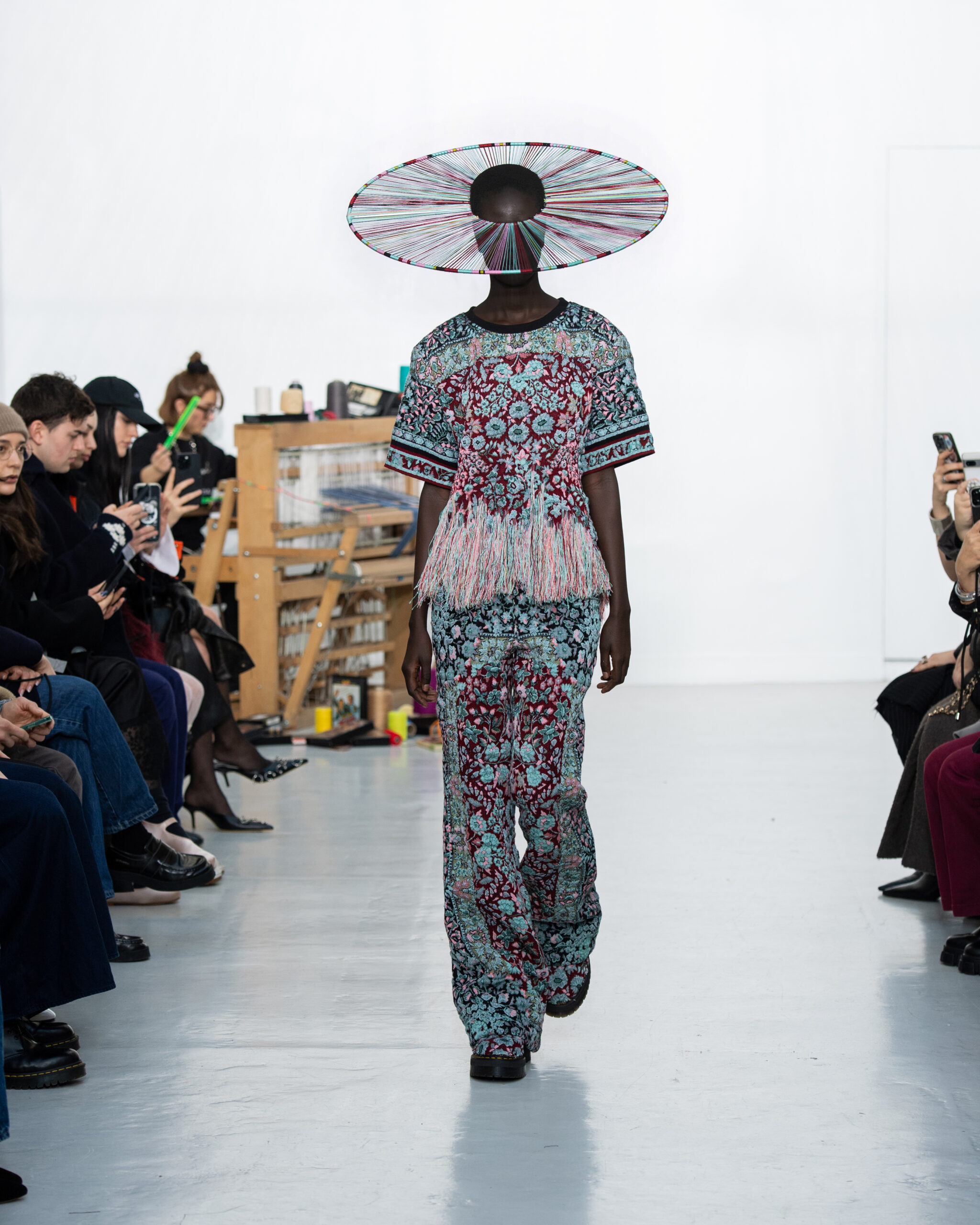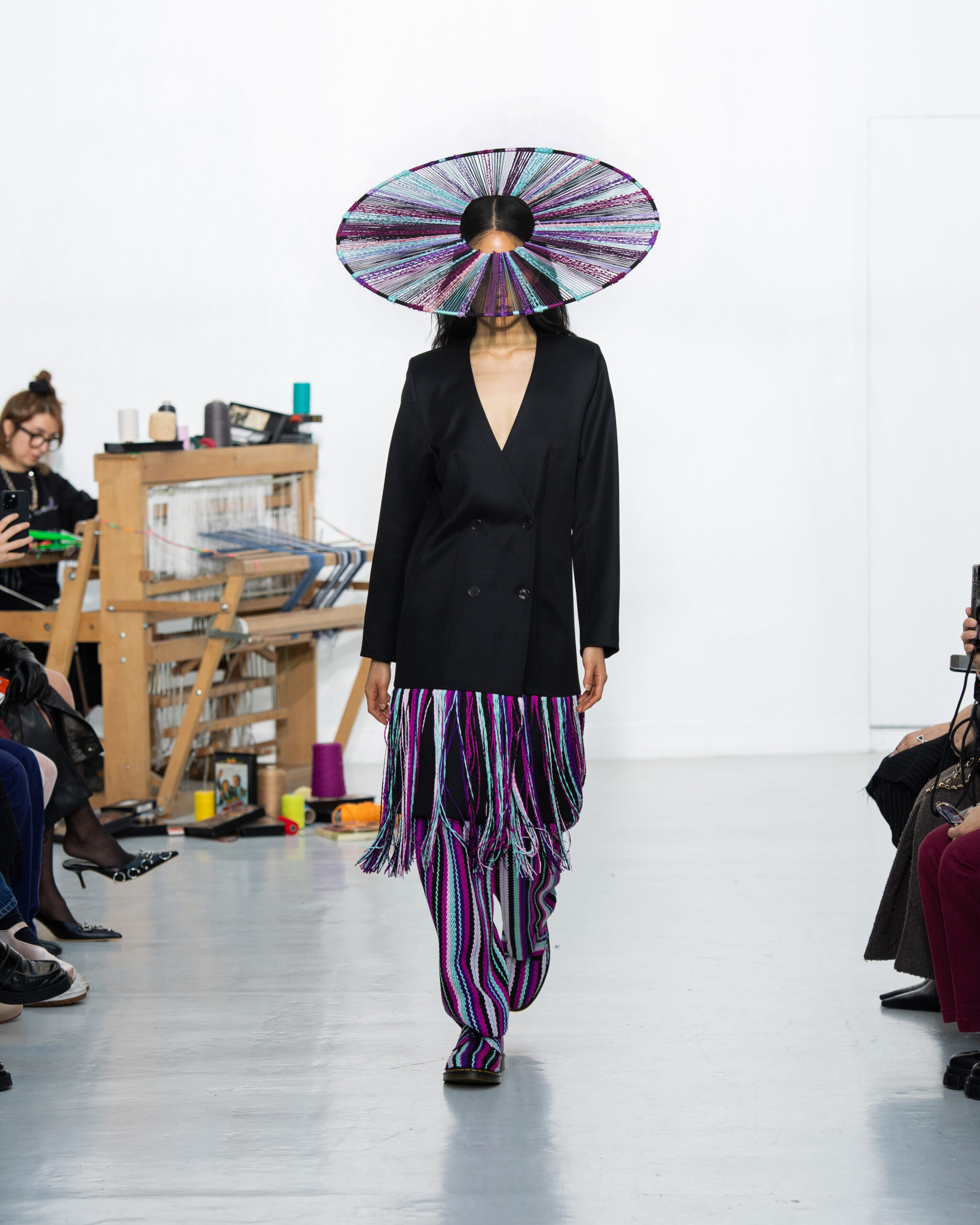 Inspiré par le métier à tisser et les fils, Benmoyal a conçu une expérience immersive : 300 miniatures de métiers à tisser envoyées en guise d’invitations et une scénographie évoquant un métier à tisser géant. Dans ce décor, les mannequins, vêtus de tissus tissés uniques de la tête aux pieds, y compris une collaboration avec Dr. Martens, ont défilé, tandis que des tisserands démontraient leur savoir-faire au milieu des spectateurs. Axée sur le dépassement des limites du design textile, la collection présente 35 looks, incluant la renaissance du tissu emblématique de Benmoyal fait de cassettes recyclées, réimaginé avec un effet peau de serpent synthétique.