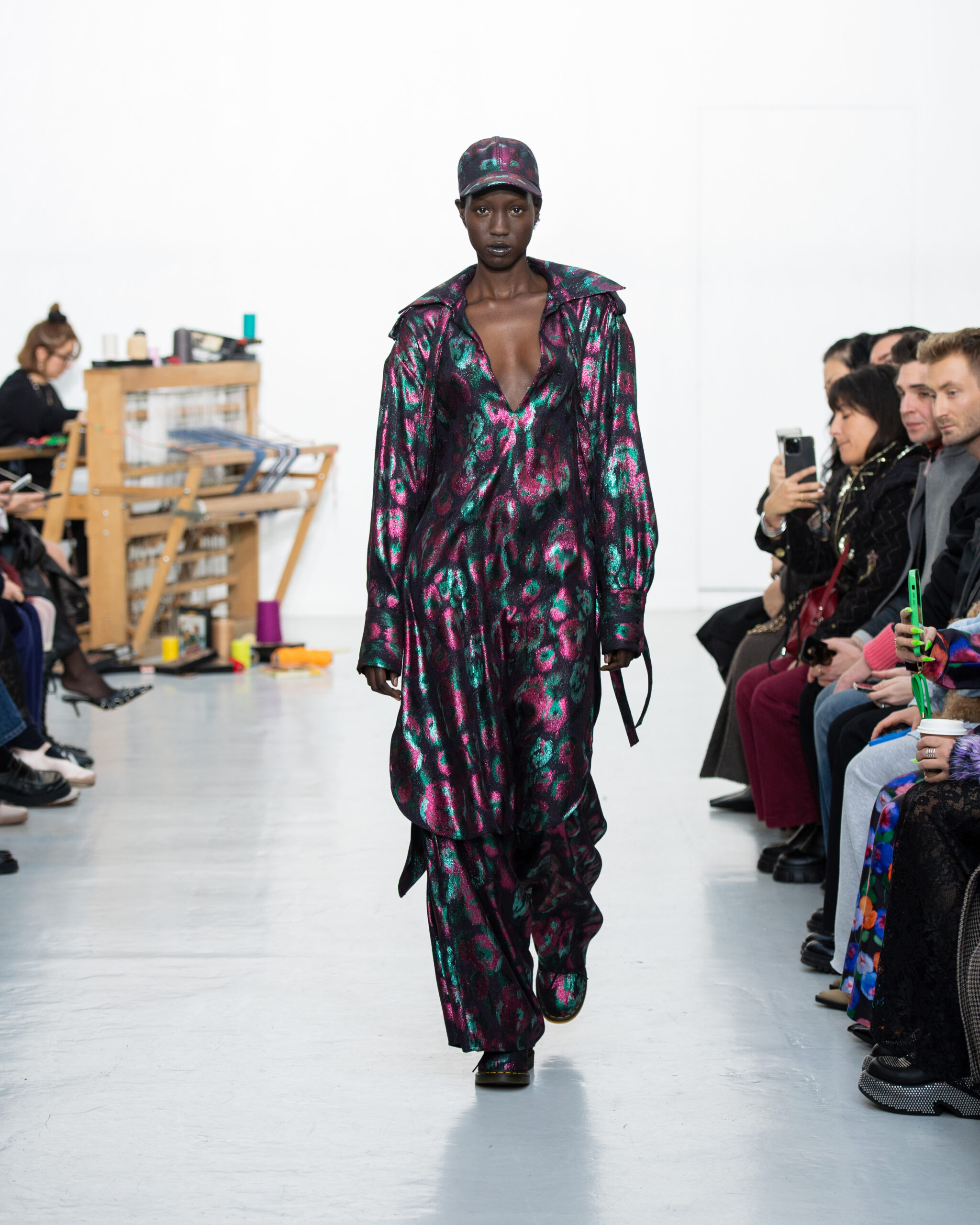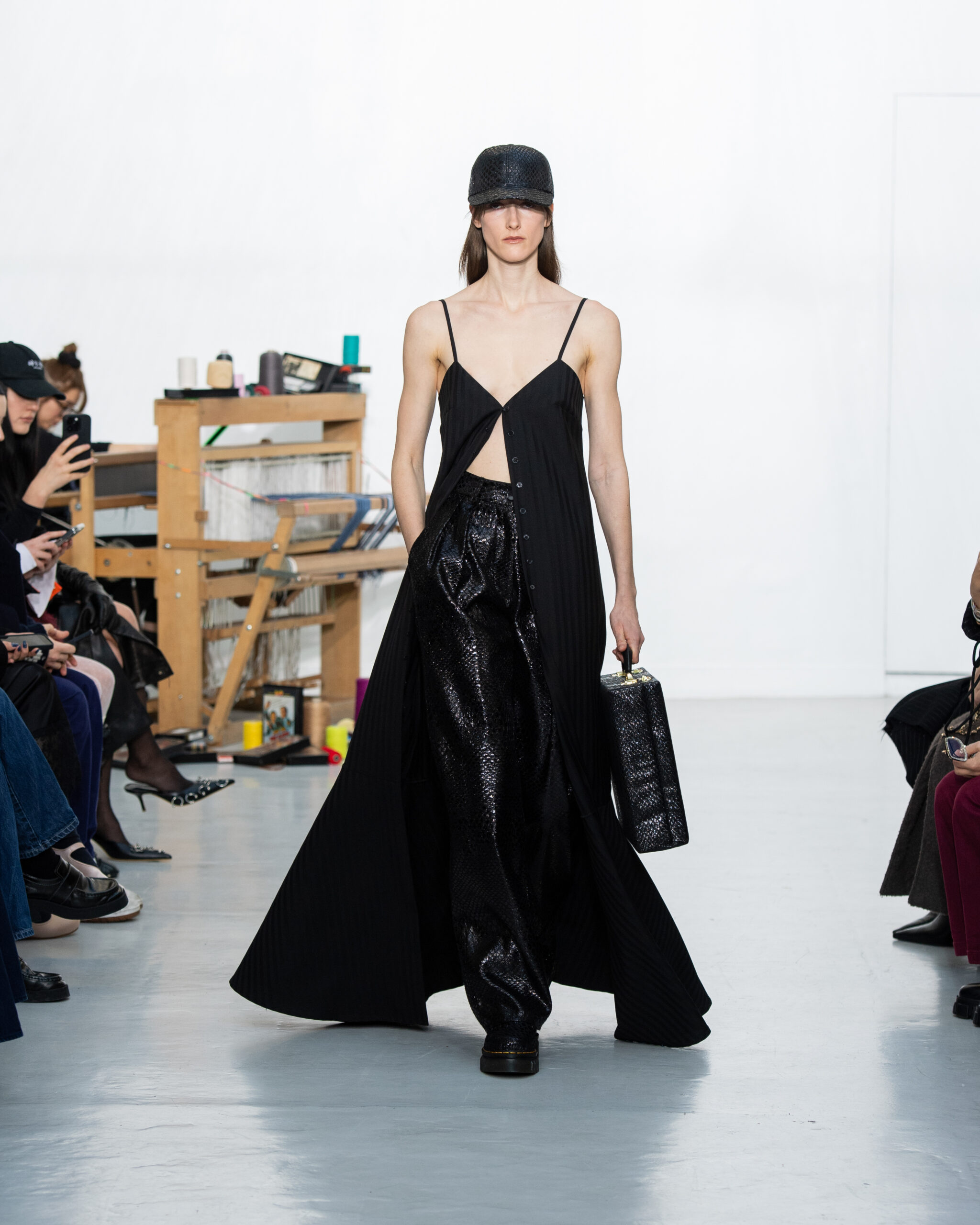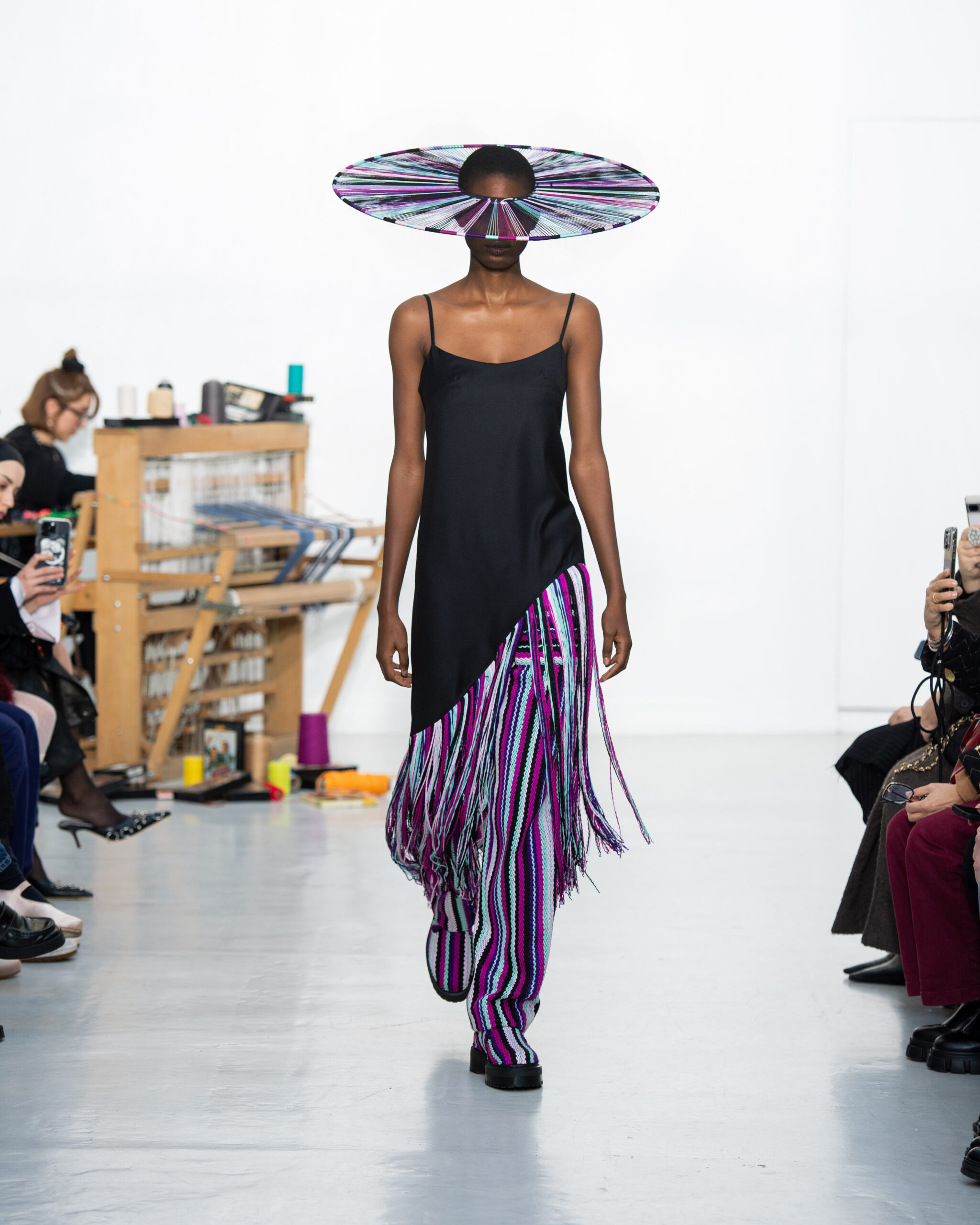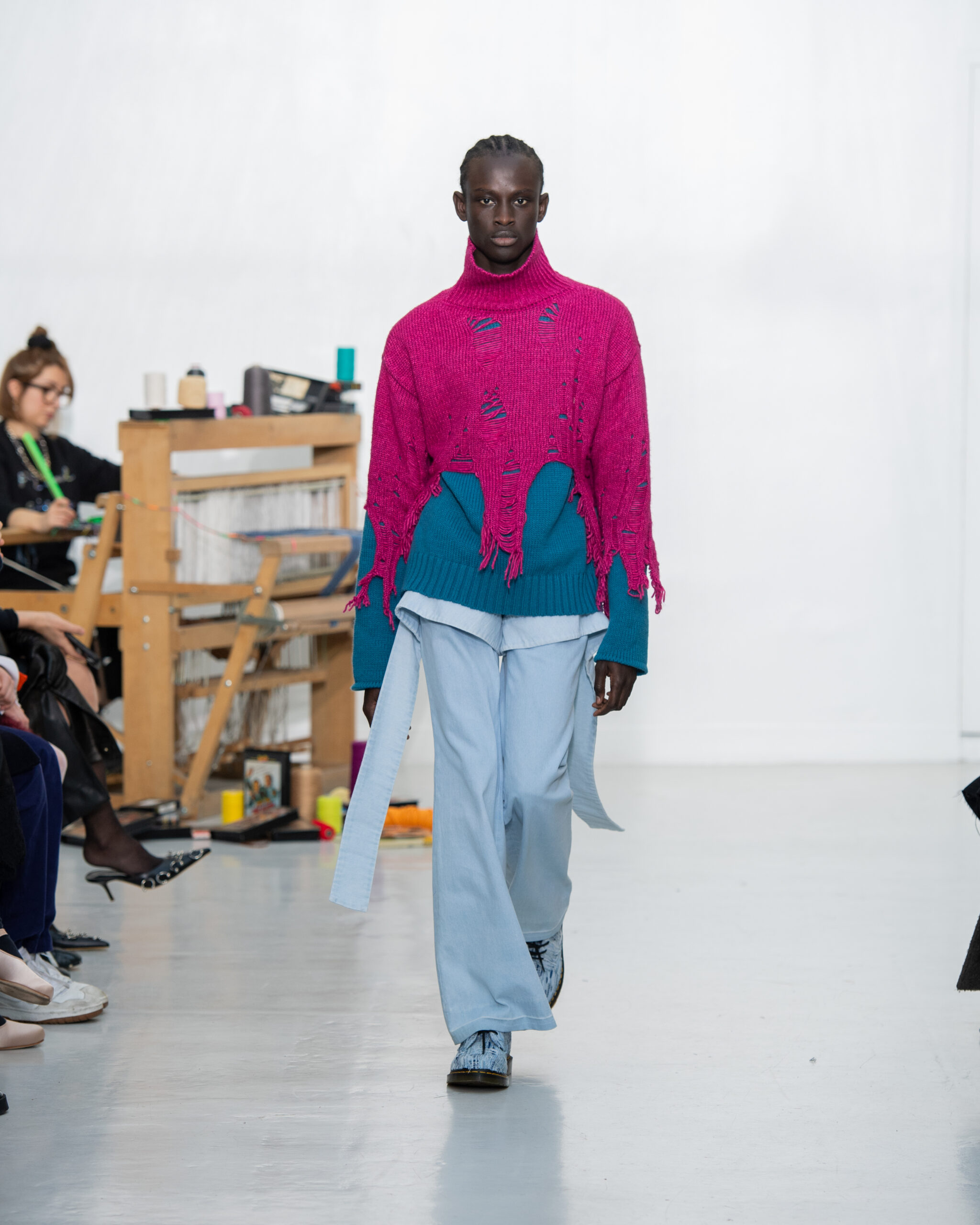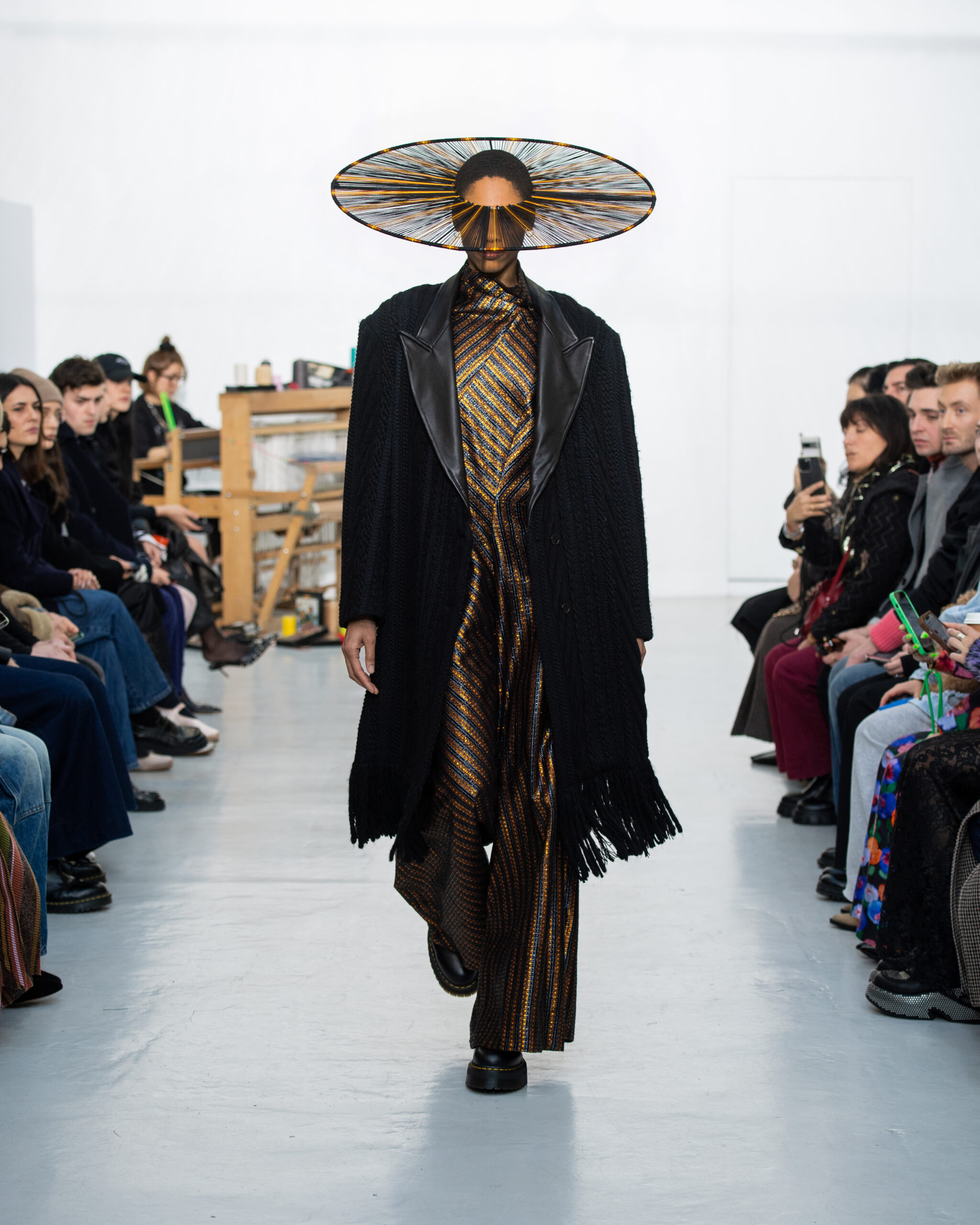 Inspiré par le métier à tisser et les fils, Benmoyal a conçu une expérience immersive : 300 miniatures de métiers à tisser envoyées en guise d’invitations et une scénographie évoquant un métier à tisser géant. Dans ce décor, les mannequins, vêtus de tissus tissés uniques de la tête aux pieds, y compris une collaboration avec Dr. Martens, ont défilé, tandis que des tisserands démontraient leur savoir-faire au milieu des spectateurs. Axée sur le dépassement des limites du design textile, la collection présente 35 looks, incluant la renaissance du tissu emblématique de Benmoyal fait de cassettes recyclées, réimaginé avec un effet peau de serpent synthétique.