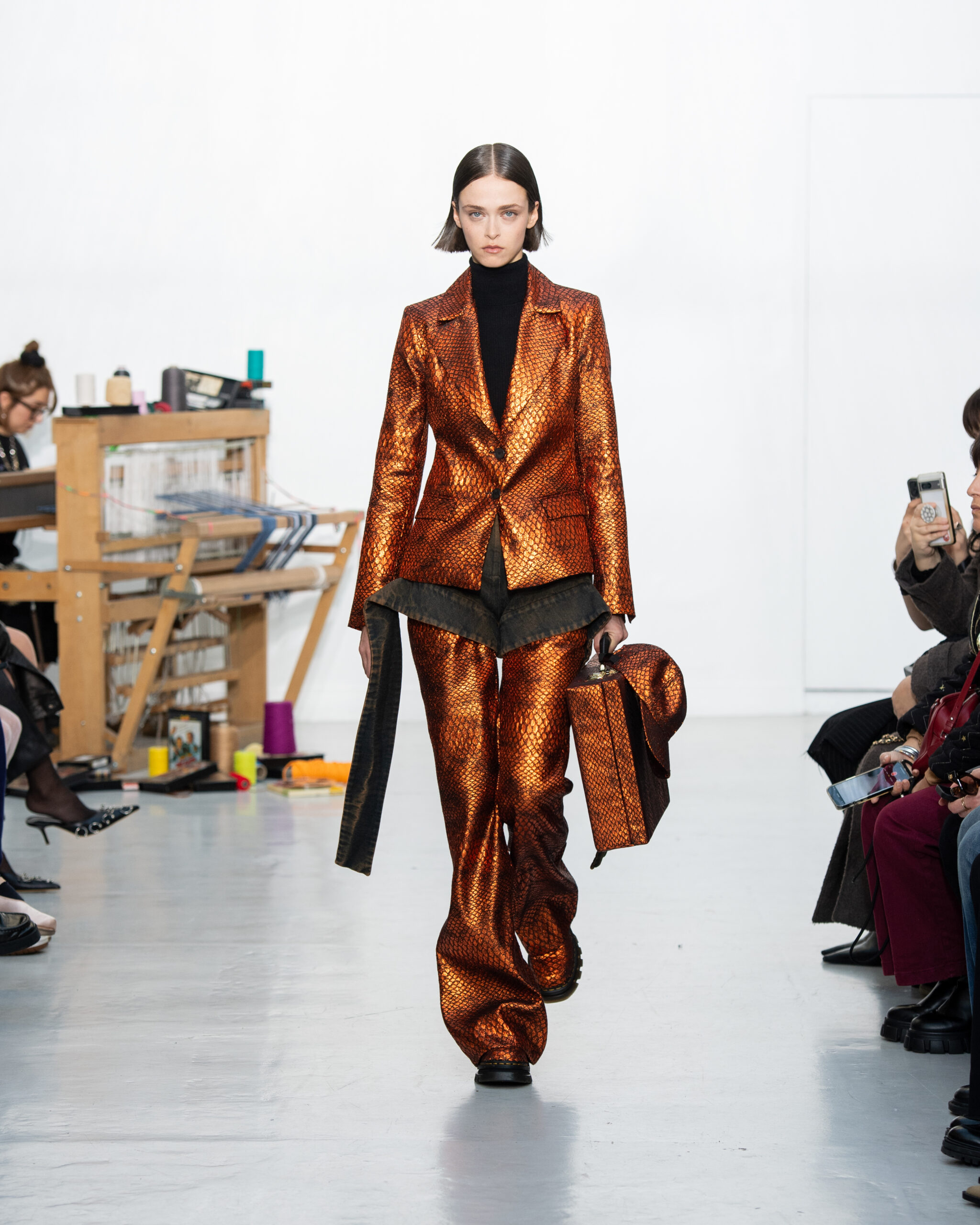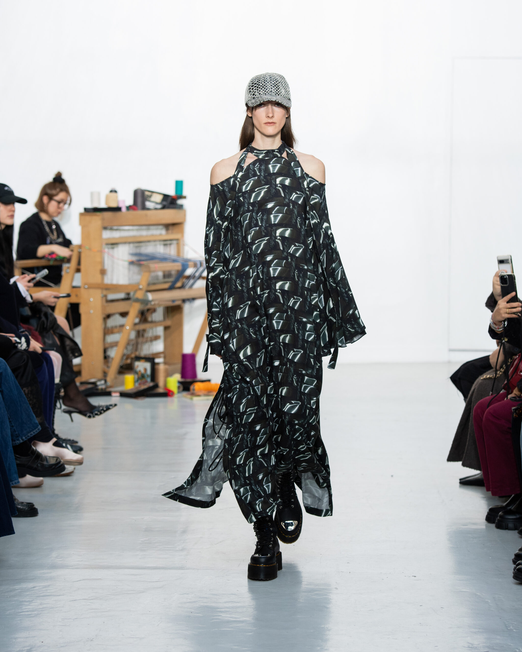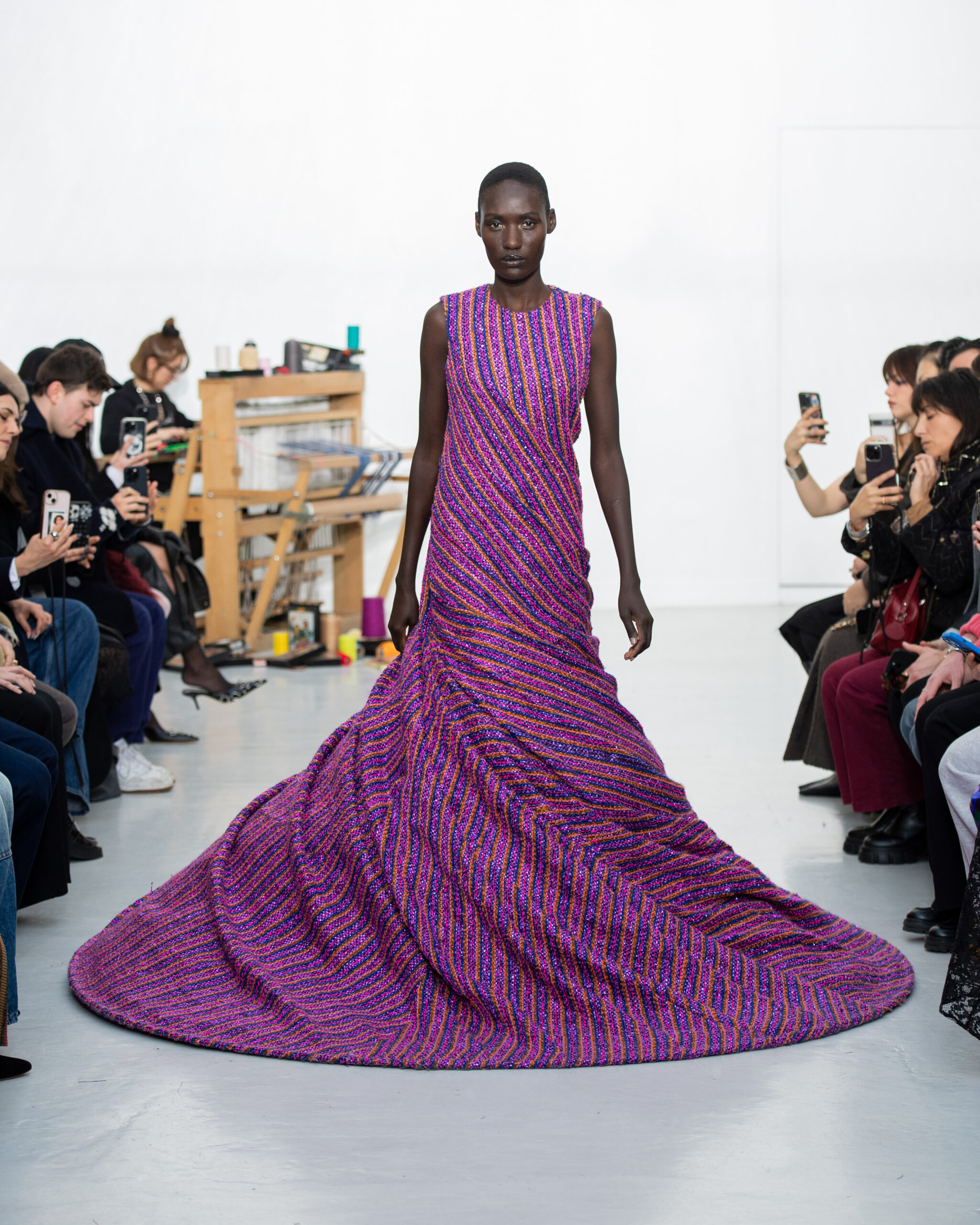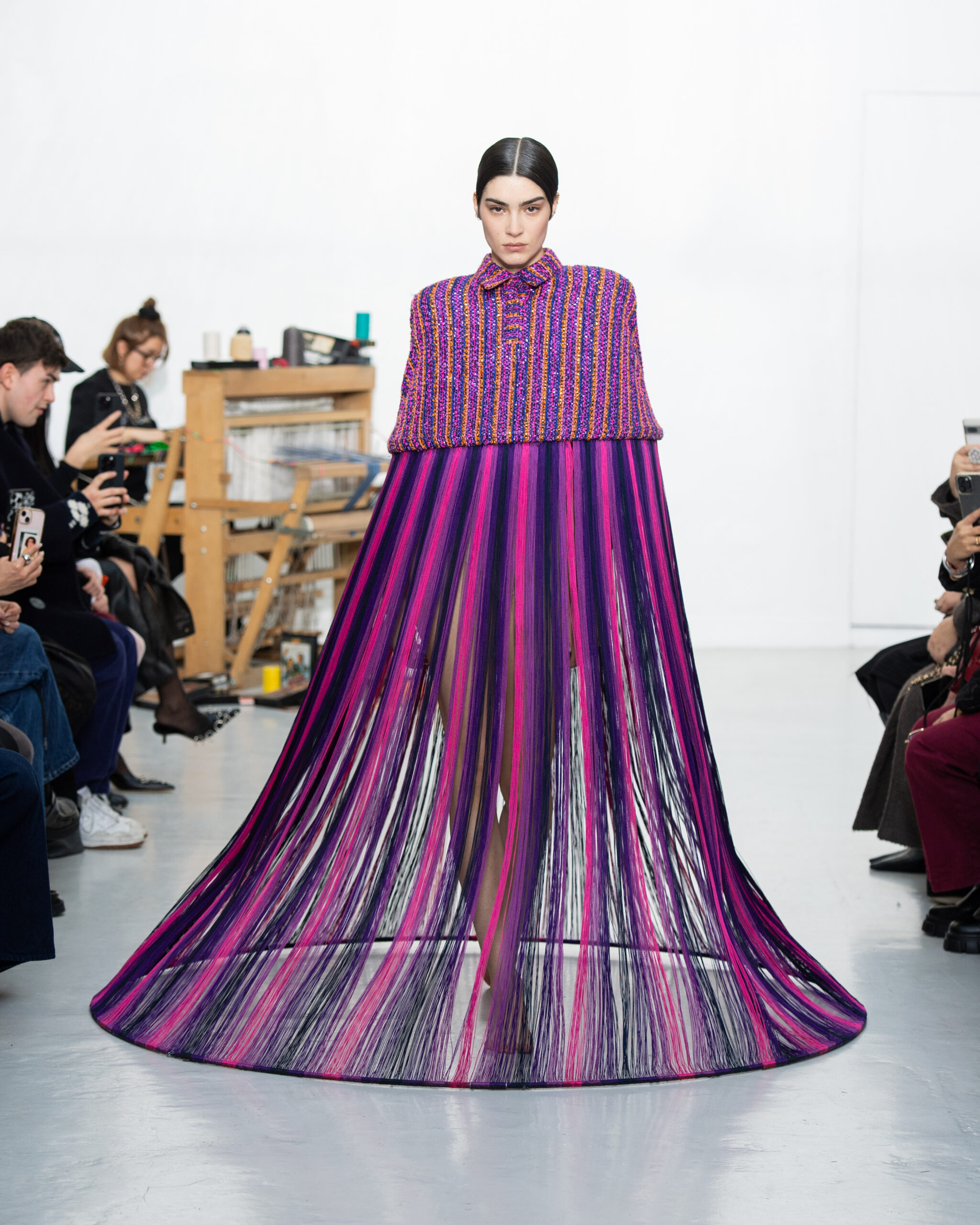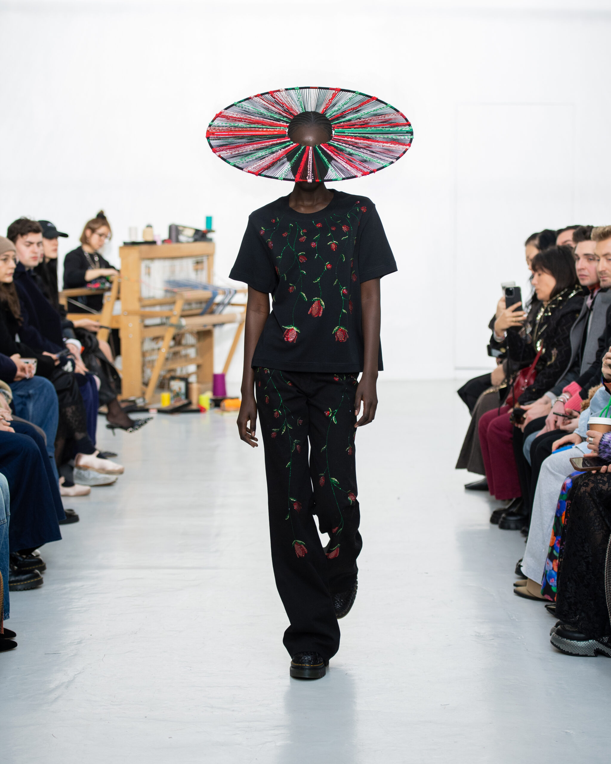 Inspiré par le métier à tisser et les fils, Benmoyal a conçu une expérience immersive : 300 miniatures de métiers à tisser envoyées en guise d’invitations et une scénographie évoquant un métier à tisser géant. Dans ce décor, les mannequins, vêtus de tissus tissés uniques de la tête aux pieds, y compris une collaboration avec Dr. Martens, ont défilé, tandis que des tisserands démontraient leur savoir-faire au milieu des spectateurs. Axée sur le dépassement des limites du design textile, la collection présente 35 looks, incluant la renaissance du tissu emblématique de Benmoyal fait de cassettes recyclées, réimaginé avec un effet peau de serpent synthétique.