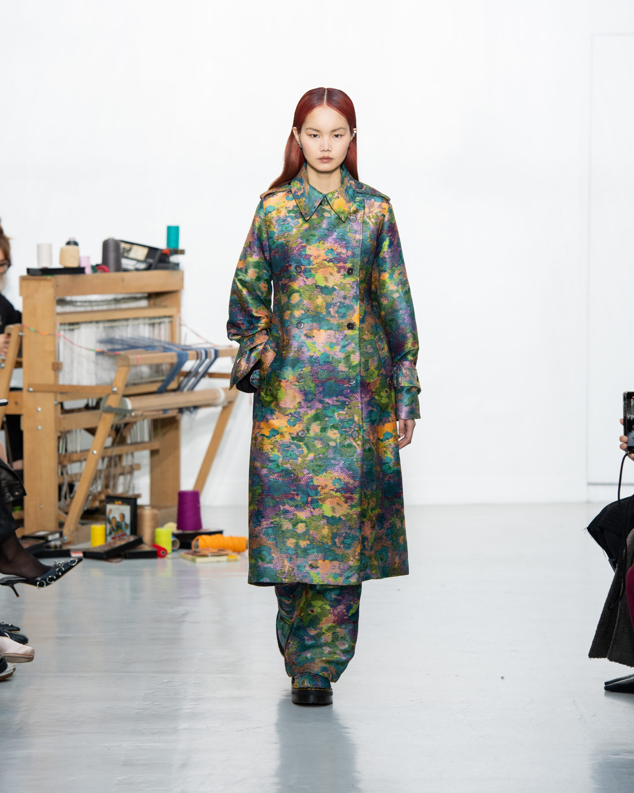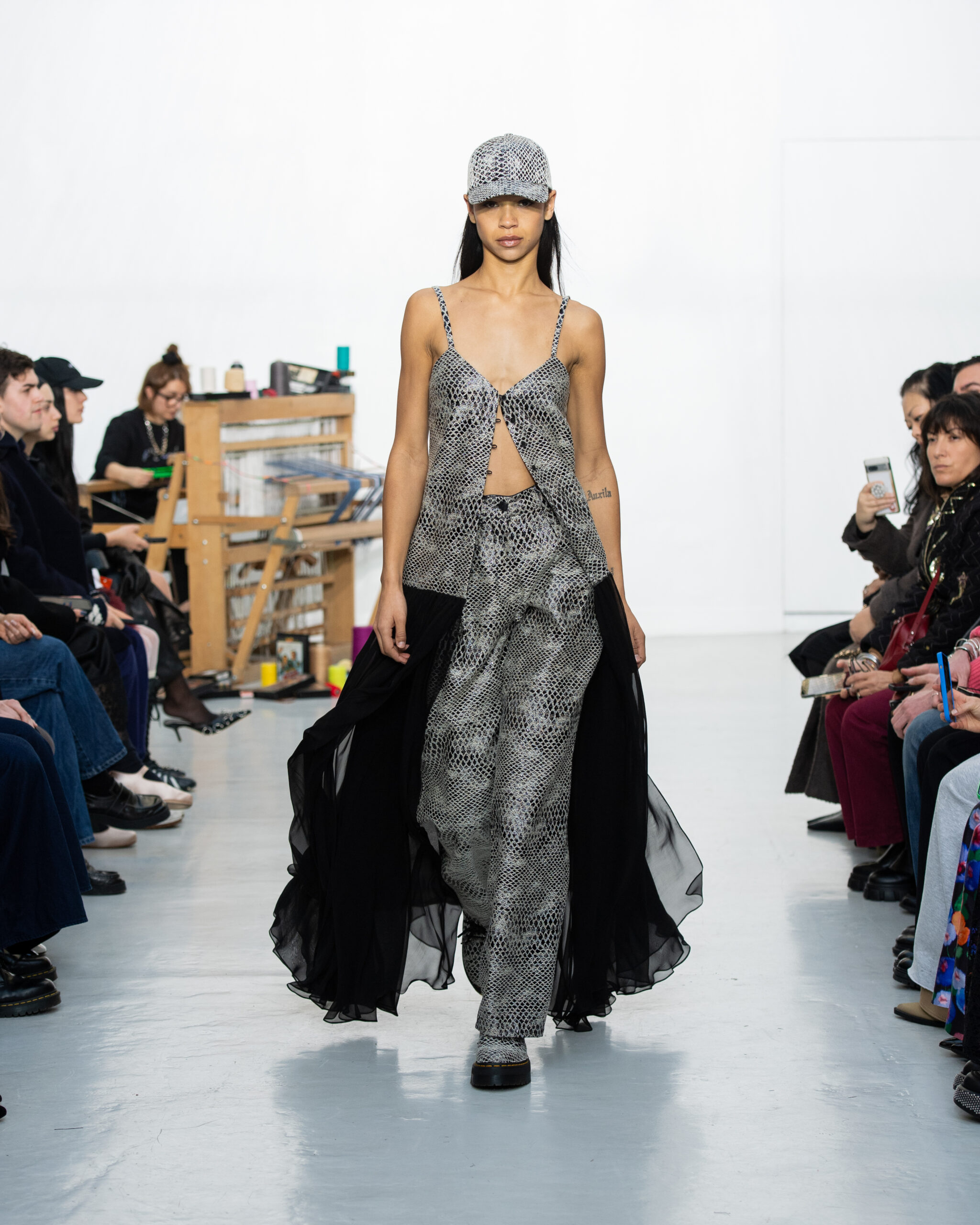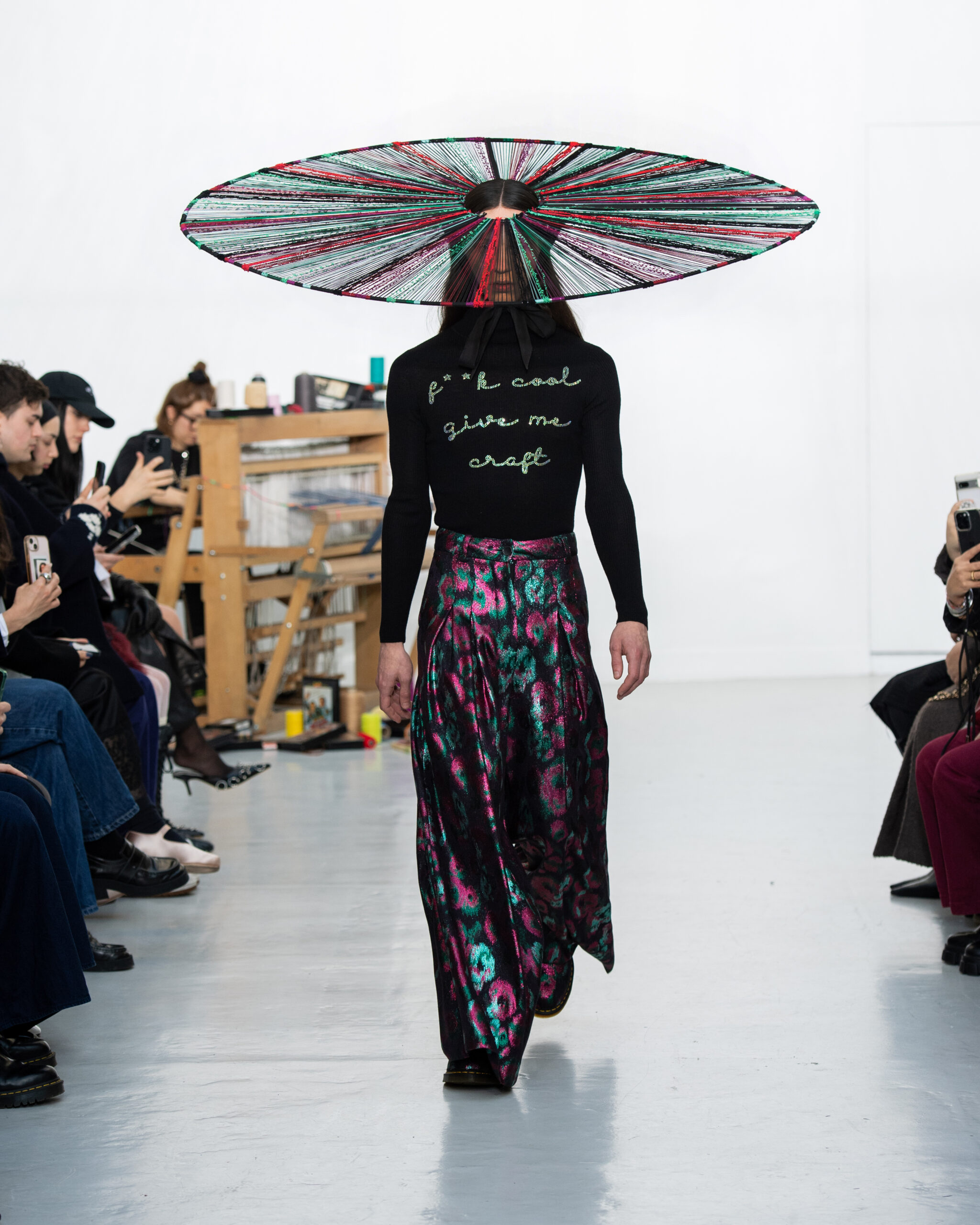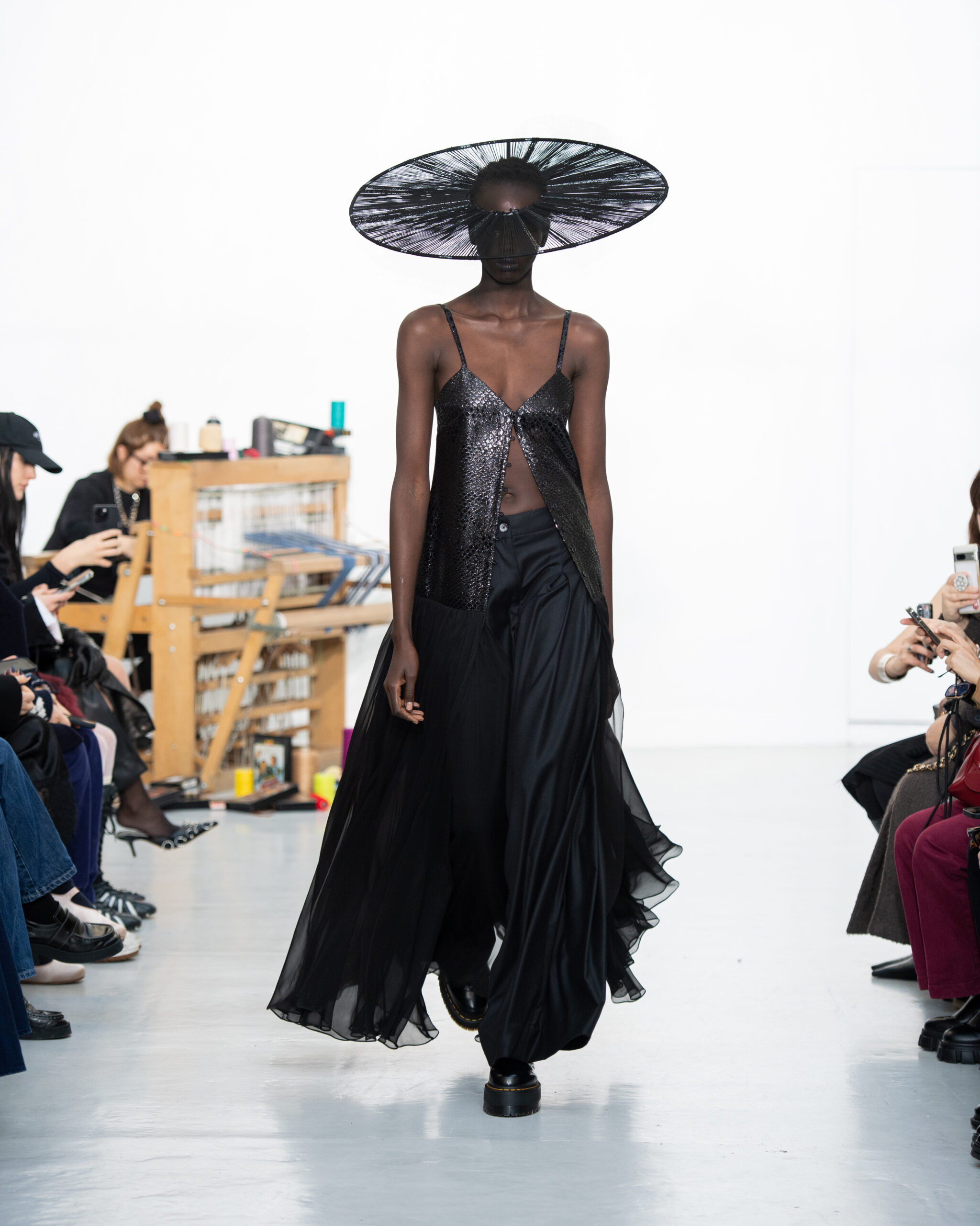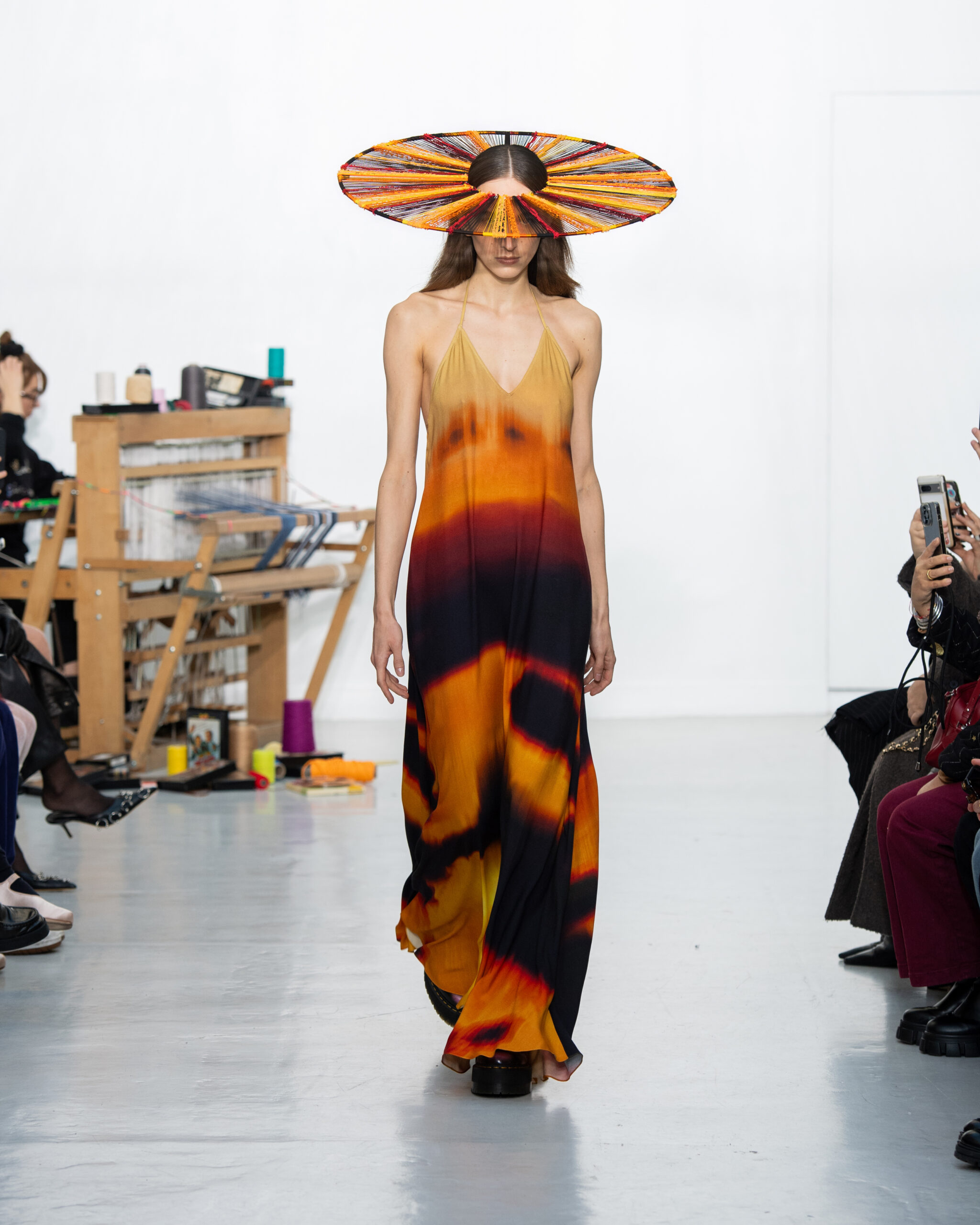 Inspiré par le métier à tisser et les fils, Benmoyal a conçu une expérience immersive : 300 miniatures de métiers à tisser envoyées en guise d’invitations et une scénographie évoquant un métier à tisser géant. Dans ce décor, les mannequins, vêtus de tissus tissés uniques de la tête aux pieds, y compris une collaboration avec Dr. Martens, ont défilé, tandis que des tisserands démontraient leur savoir-faire au milieu des spectateurs. Axée sur le dépassement des limites du design textile, la collection présente 35 looks, incluant la renaissance du tissu emblématique de Benmoyal fait de cassettes recyclées, réimaginé avec un effet peau de serpent synthétique.