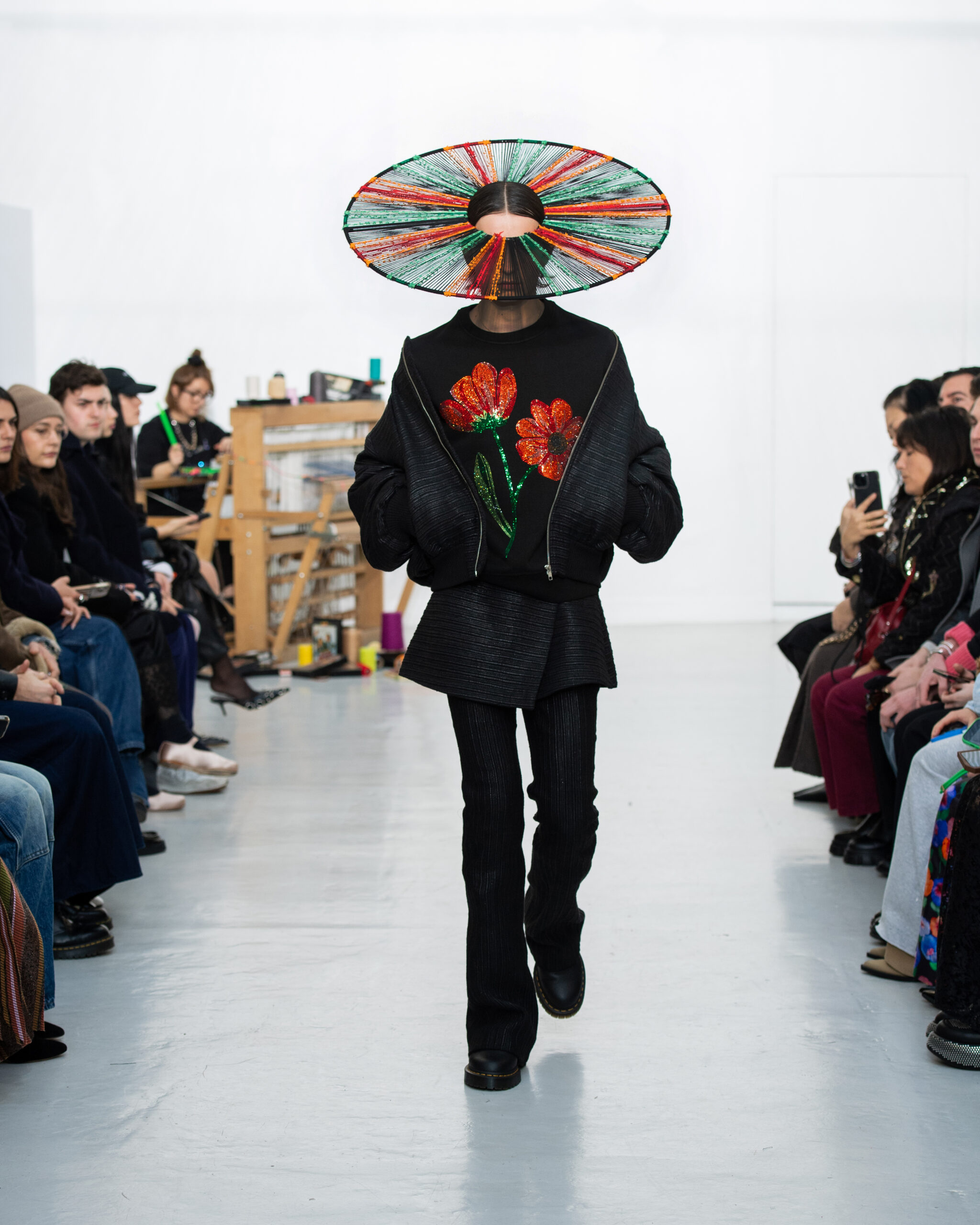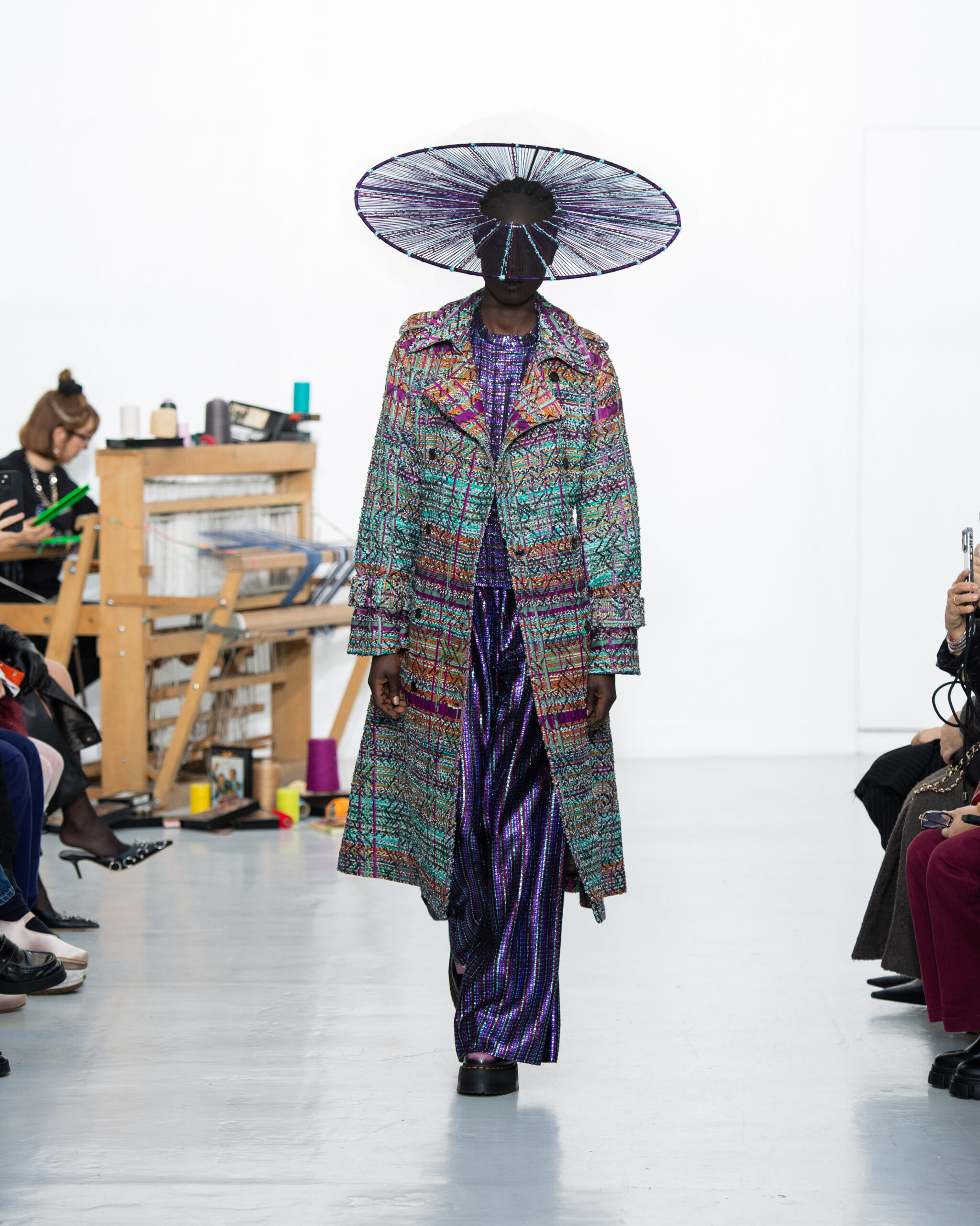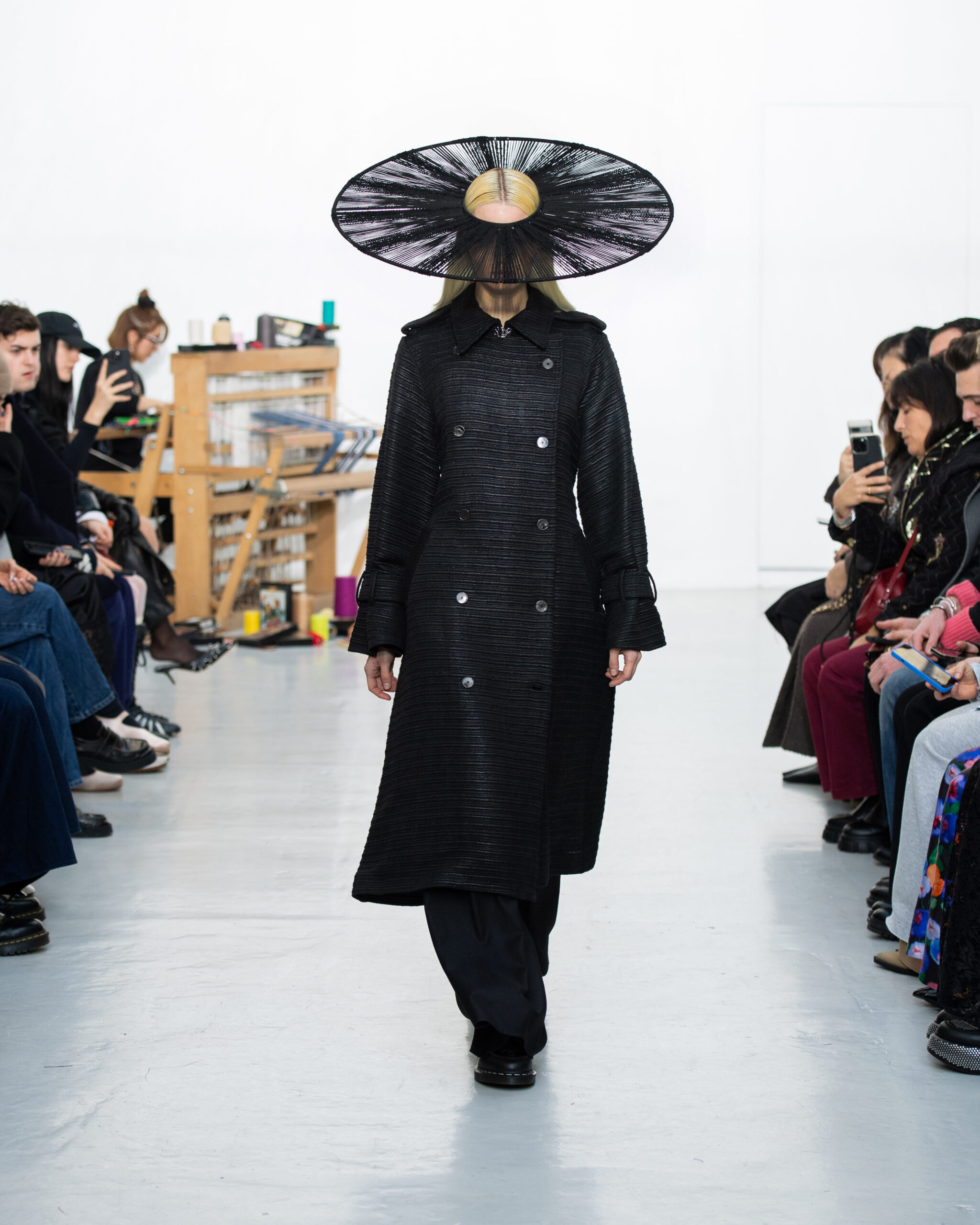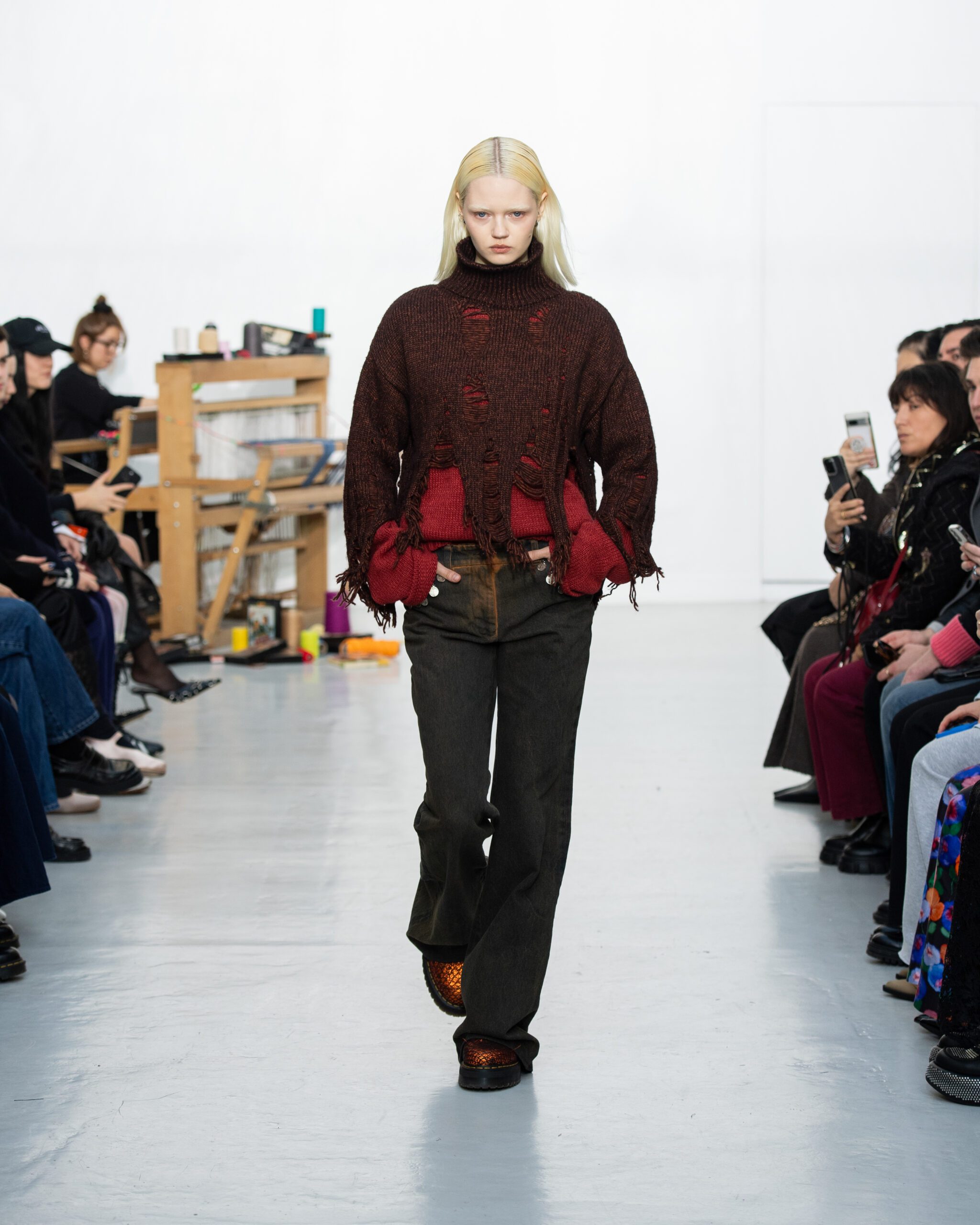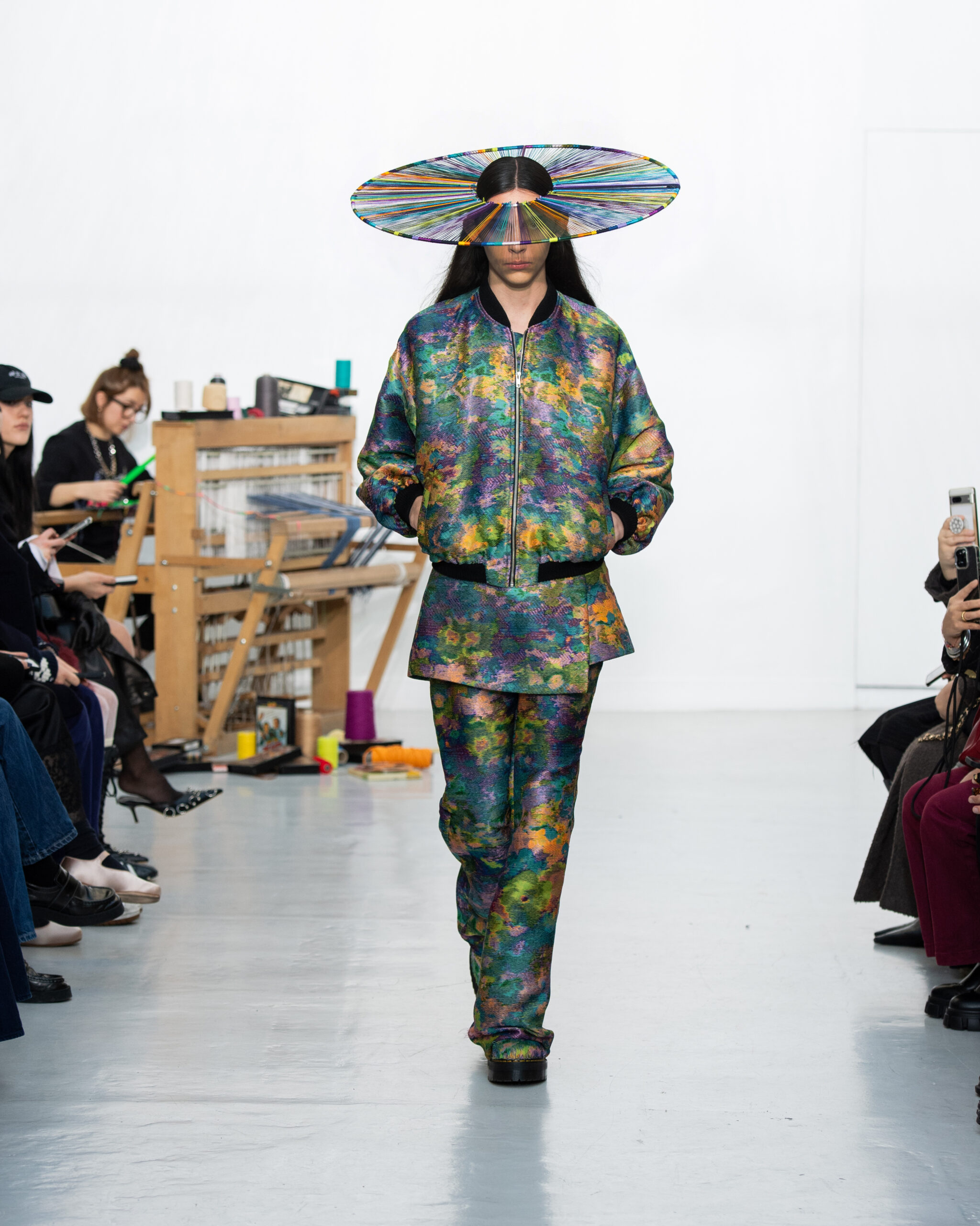 Inspiré par le métier à tisser et les fils, Benmoyal a conçu une expérience immersive : 300 miniatures de métiers à tisser envoyées en guise d’invitations et une scénographie évoquant un métier à tisser géant. Dans ce décor, les mannequins, vêtus de tissus tissés uniques de la tête aux pieds, y compris une collaboration avec Dr. Martens, ont défilé, tandis que des tisserands démontraient leur savoir-faire au milieu des spectateurs. Axée sur le dépassement des limites du design textile, la collection présente 35 looks, incluant la renaissance du tissu emblématique de Benmoyal fait de cassettes recyclées, réimaginé avec un effet peau de serpent synthétique.