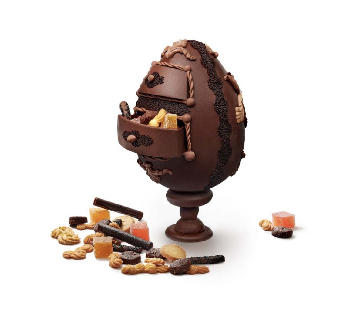 L’œuf est soigneusement façonné avec une coque en chocolat noir, intégrant des tiroirs qui cachent une sélection de biscuits fins. L’arrière de l’œuf se compose de chocolat noir Guanaja et de Gianduja noir et lait, tandis que son socle est généreusement garni d’un praliné noisette.