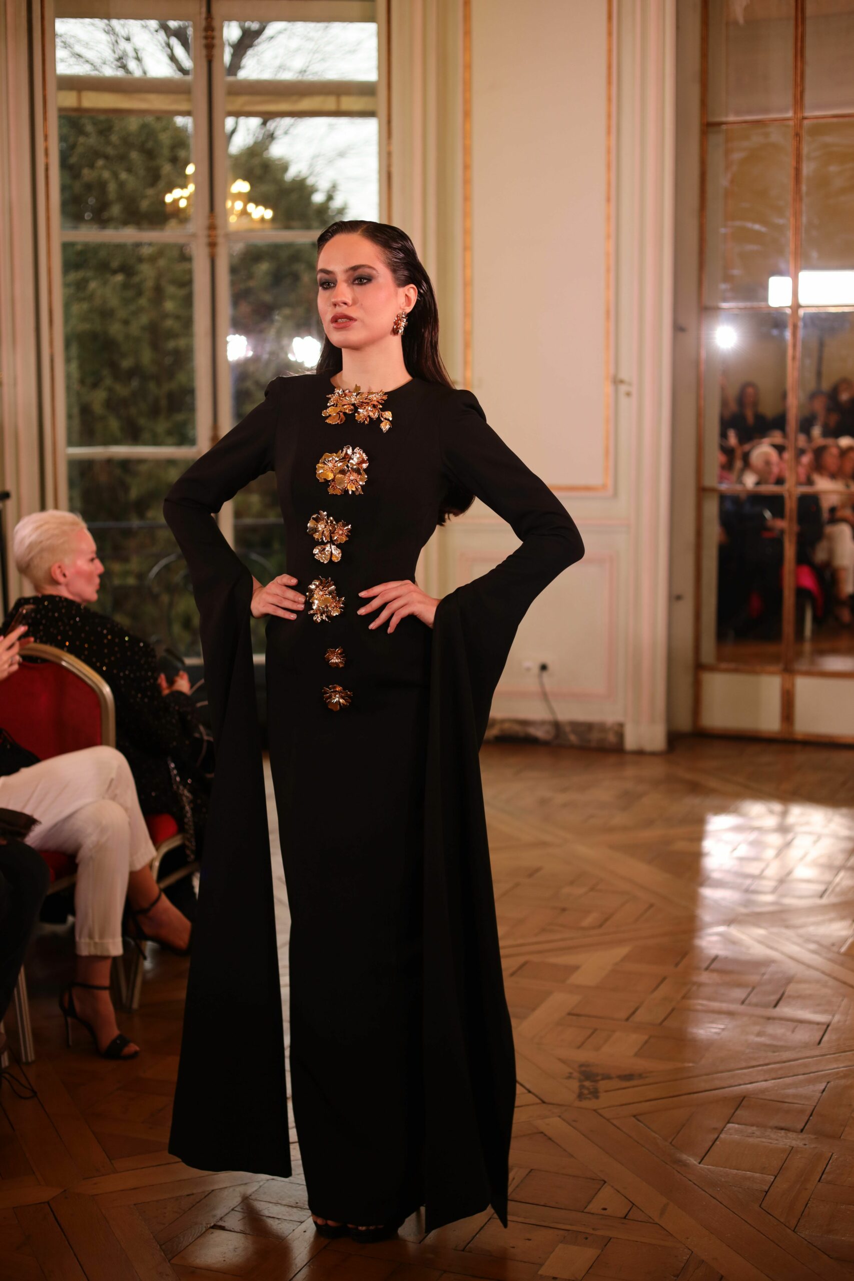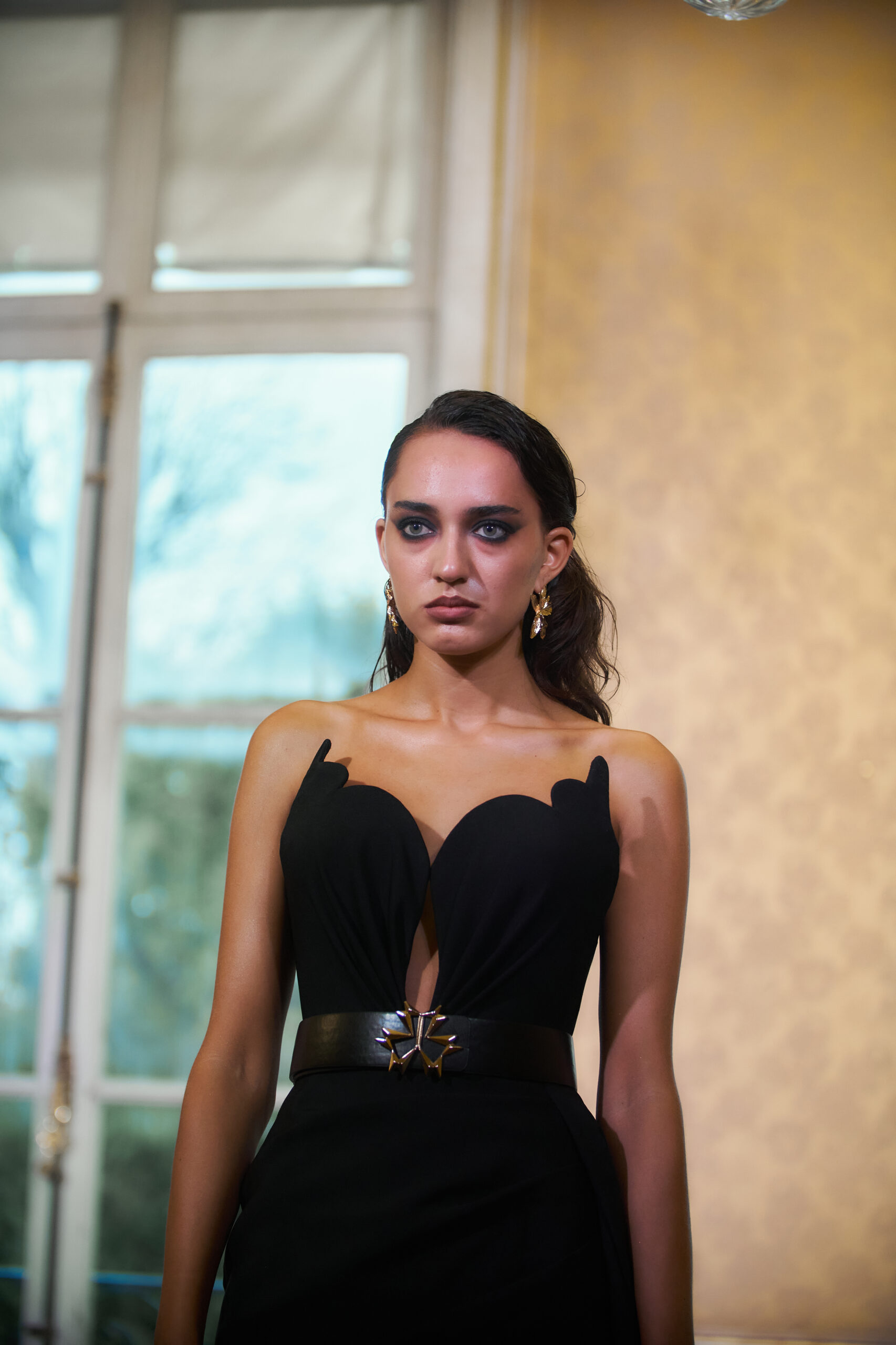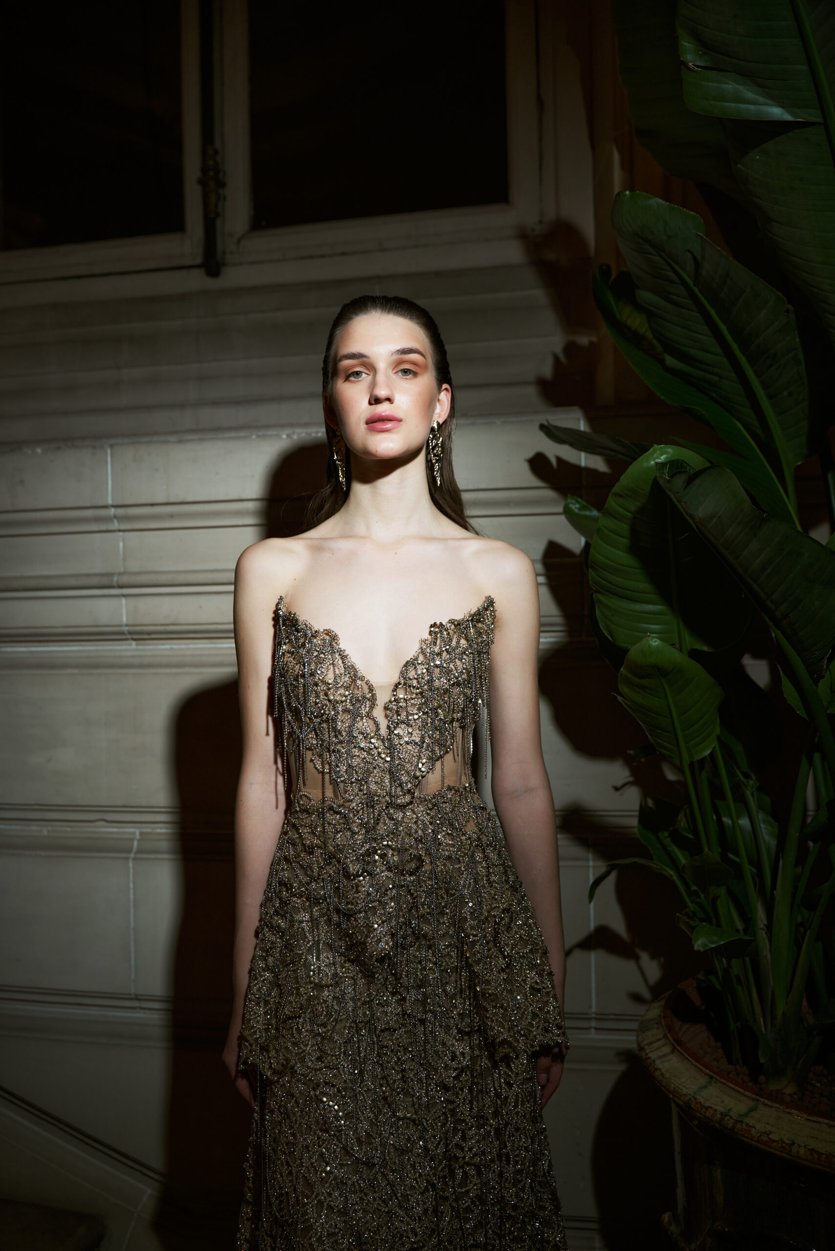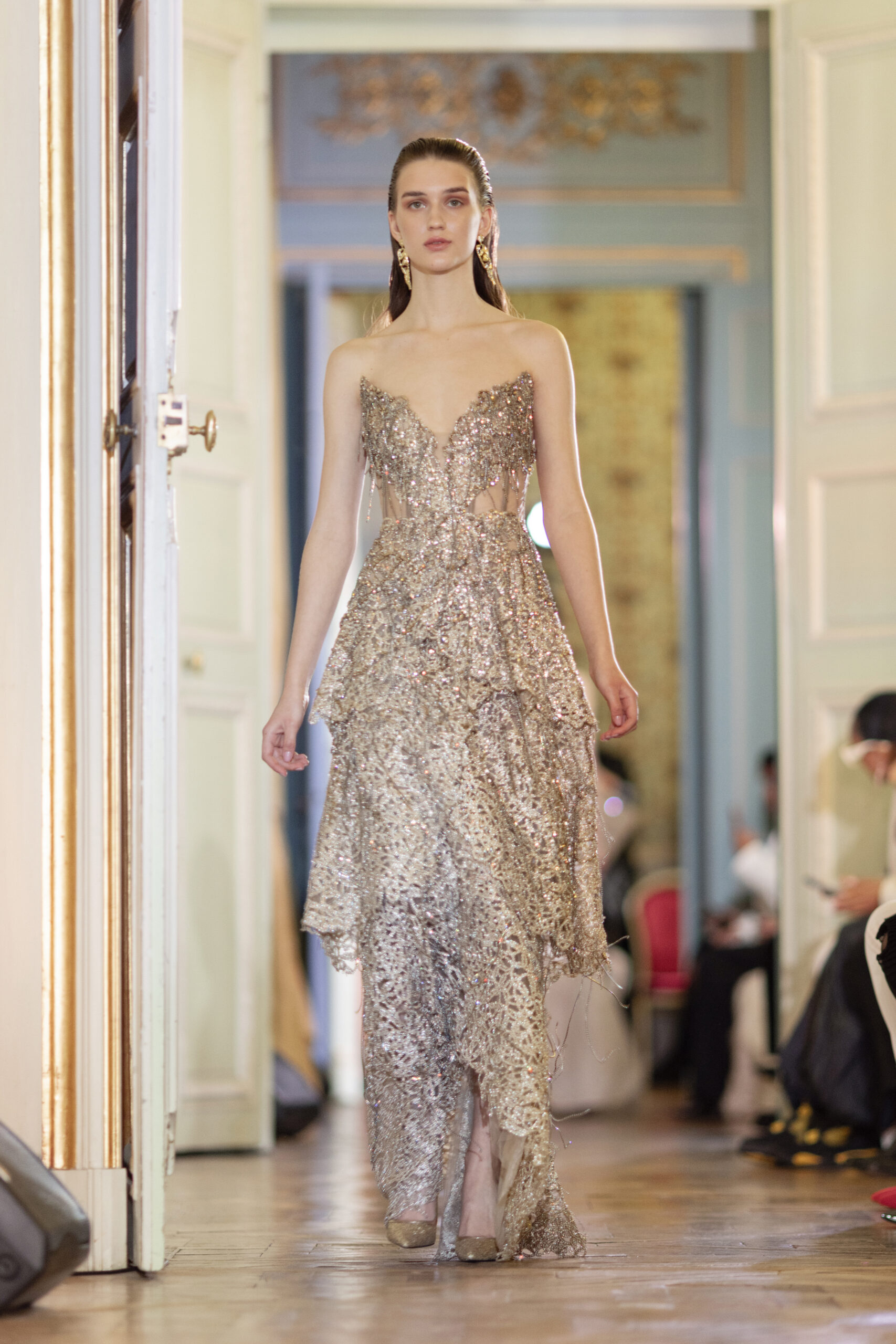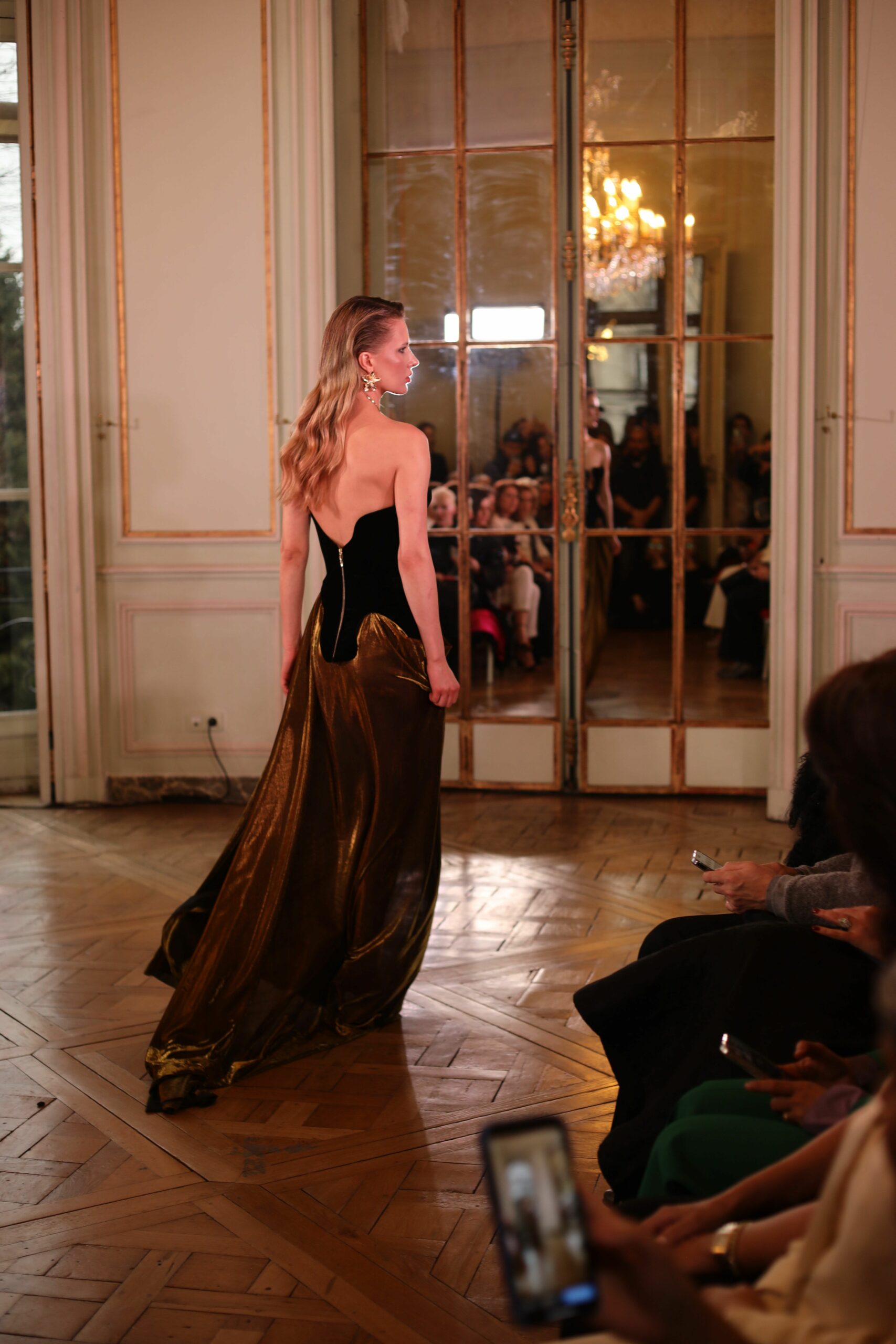 Laith Maalouf a enchanté l’audience avec sa collection inspirée des déesses, Amora: Une Symphonie de Structure et de Fluidité. Fusionnant design structuré et fluidité, chaque création rend hommage aux courbes gracieuses des statues de la Renaissance, incarnant l’essence divine de la déesse Amora à travers draperies aériennes et ornements dorés luxuriants.