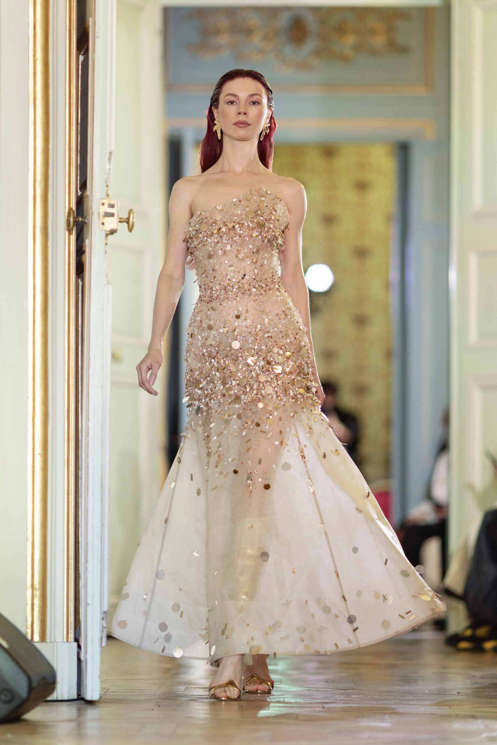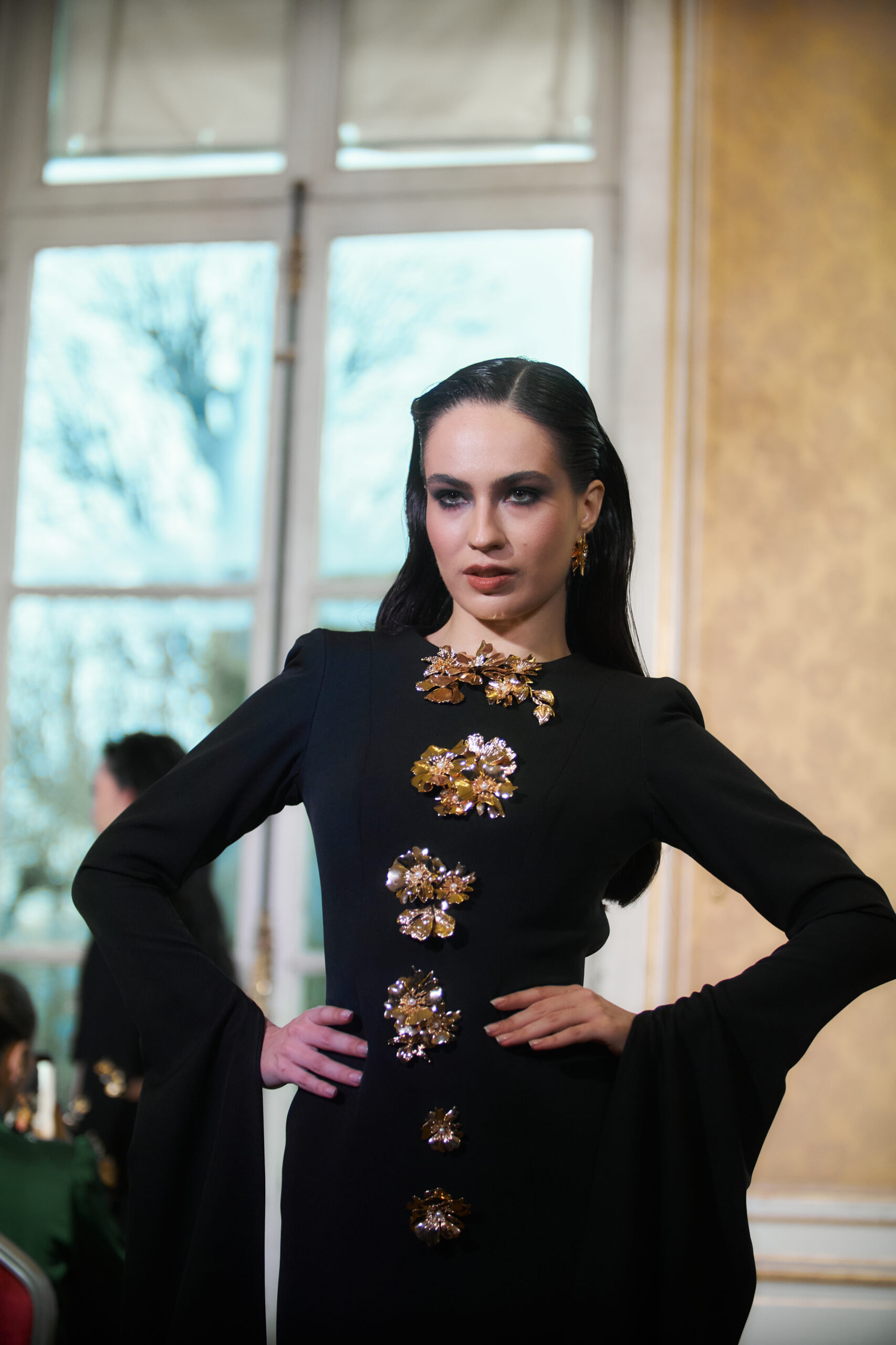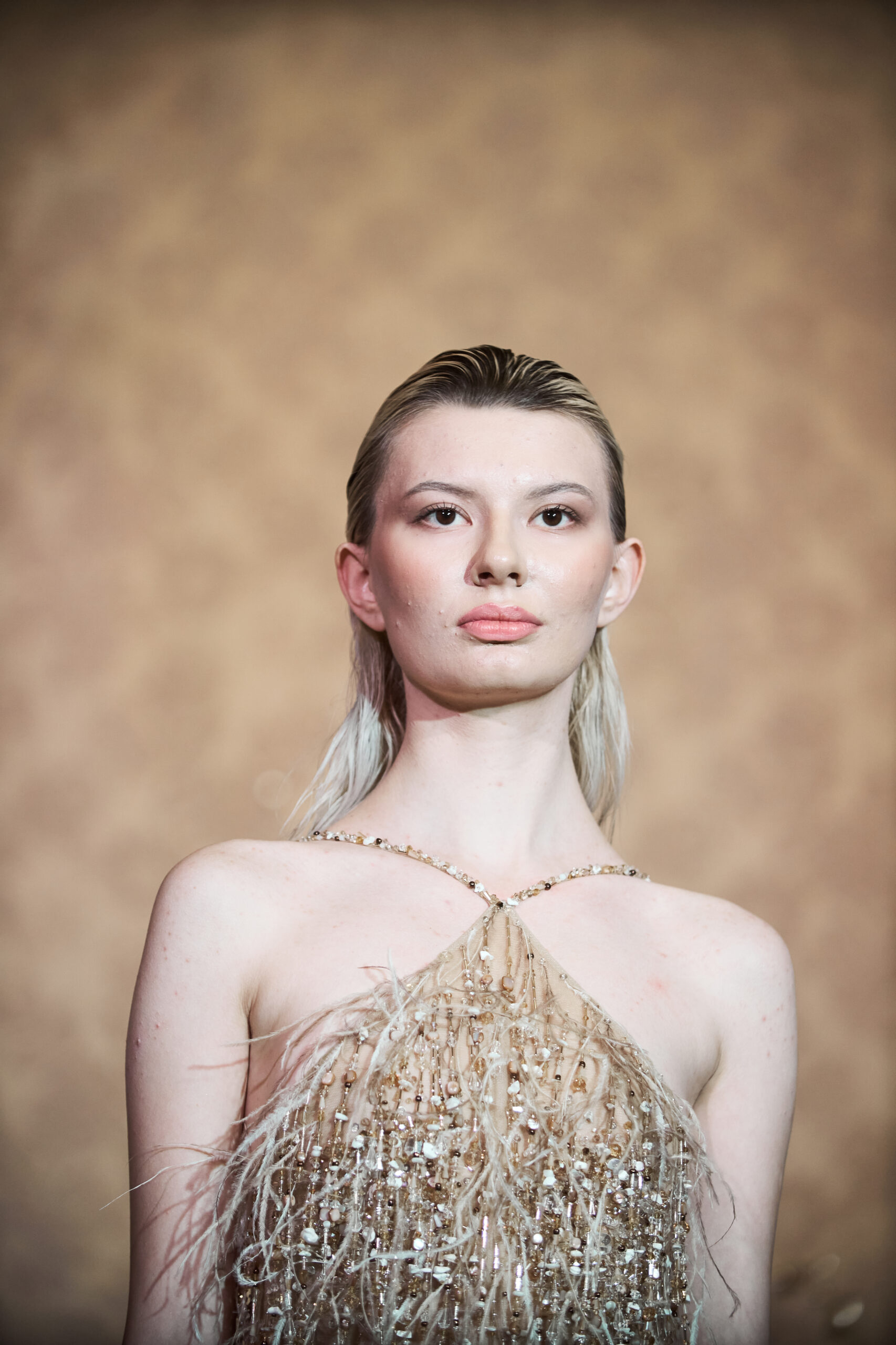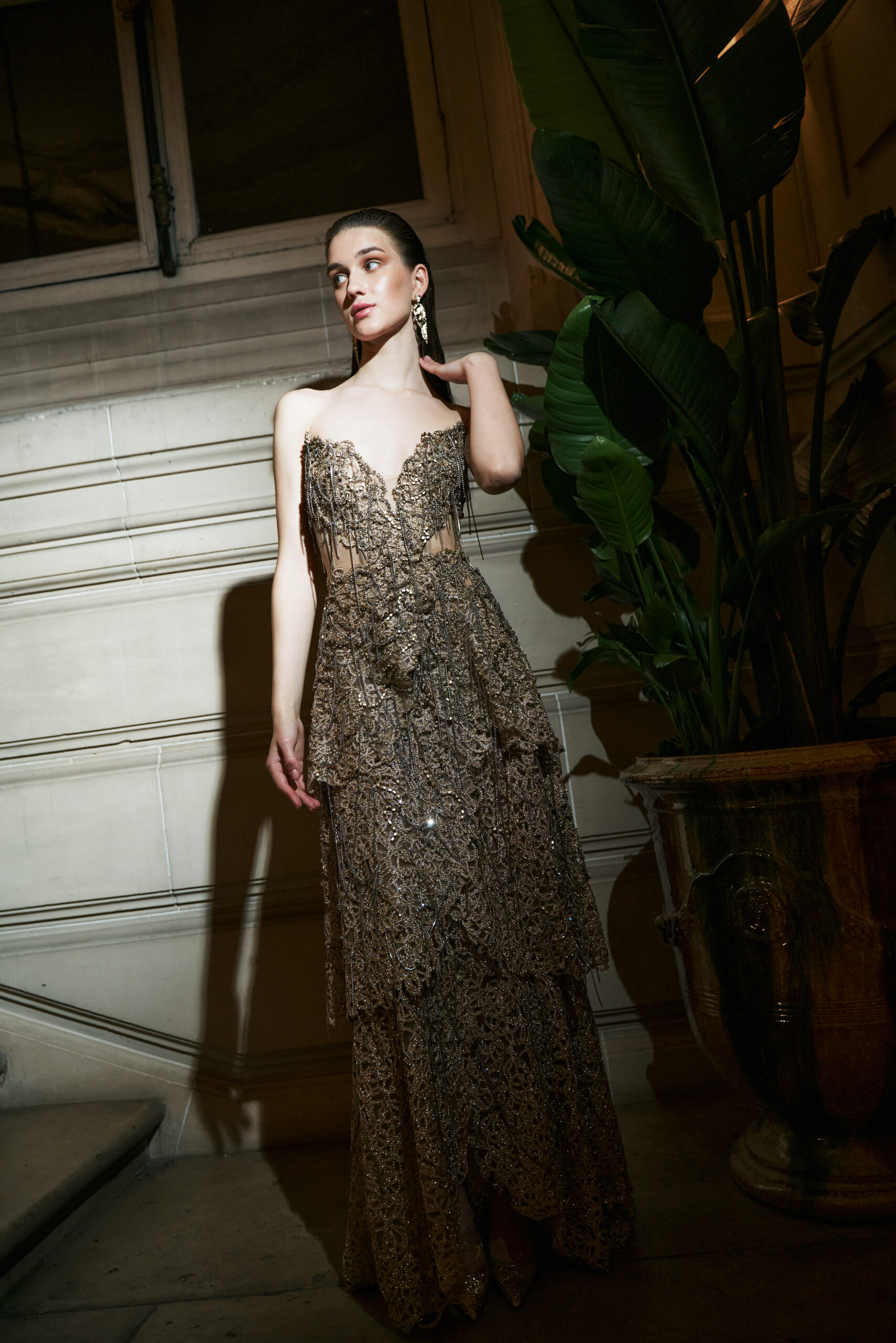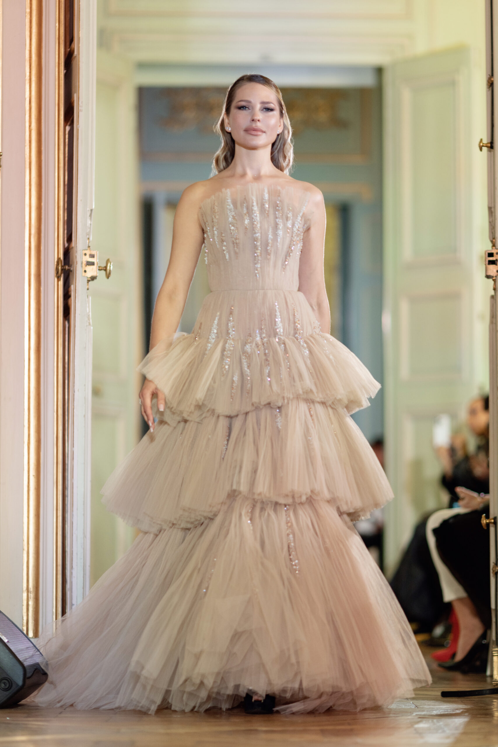 Laith Maalouf a enchanté l’audience avec sa collection inspirée des déesses, Amora: Une Symphonie de Structure et de Fluidité. Fusionnant design structuré et fluidité, chaque création rend hommage aux courbes gracieuses des statues de la Renaissance, incarnant l’essence divine de la déesse Amora à travers draperies aériennes et ornements dorés luxuriants.