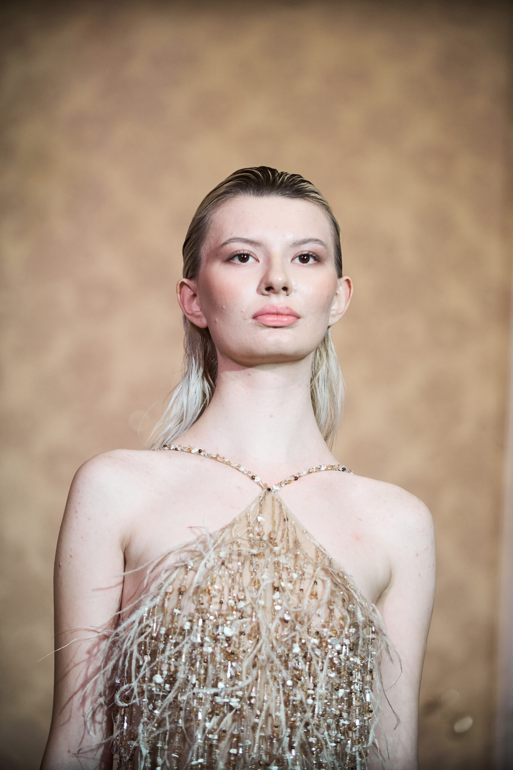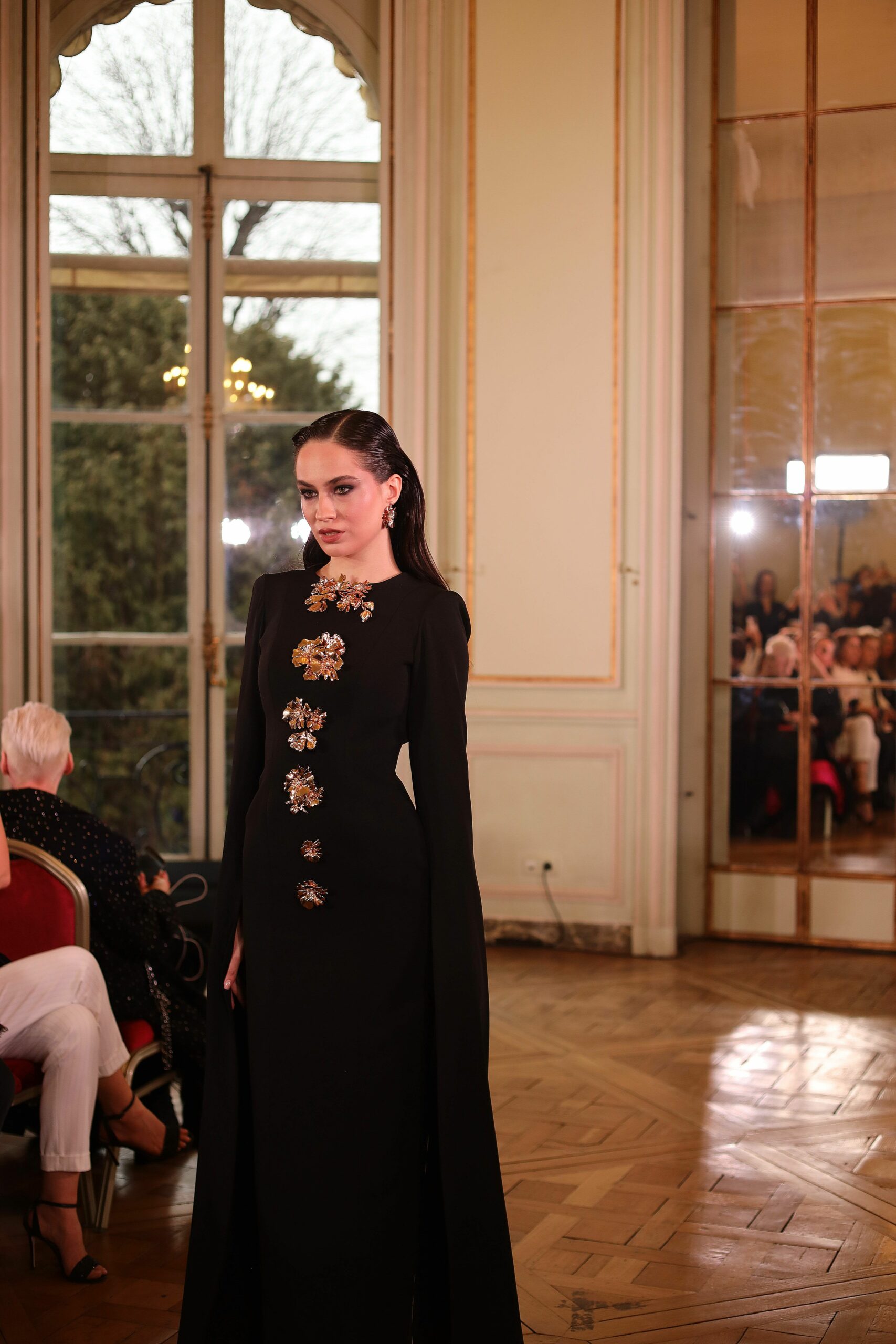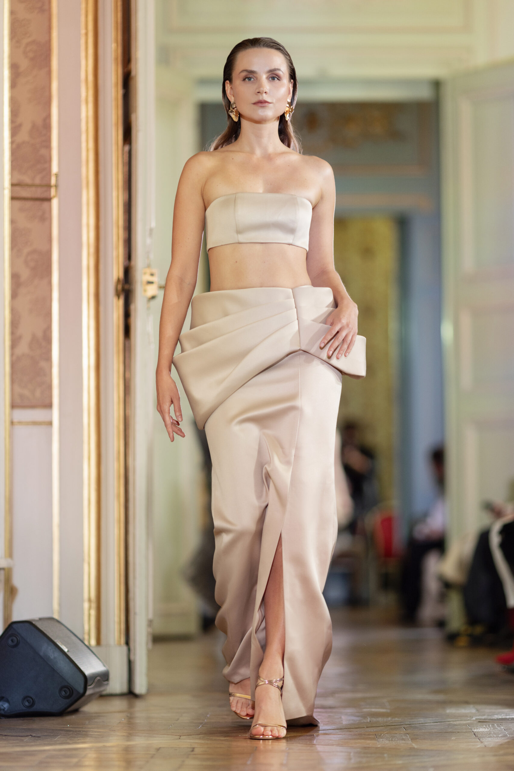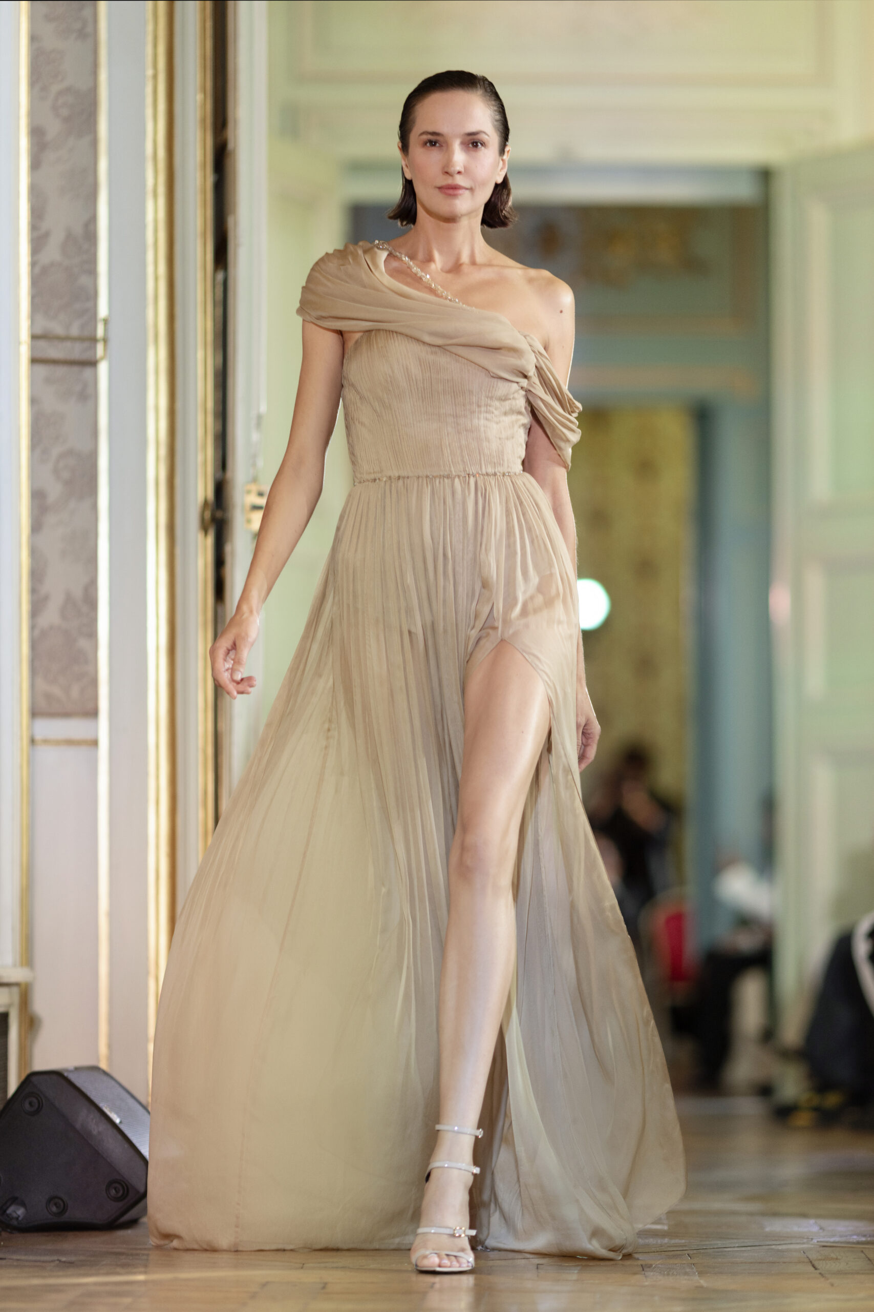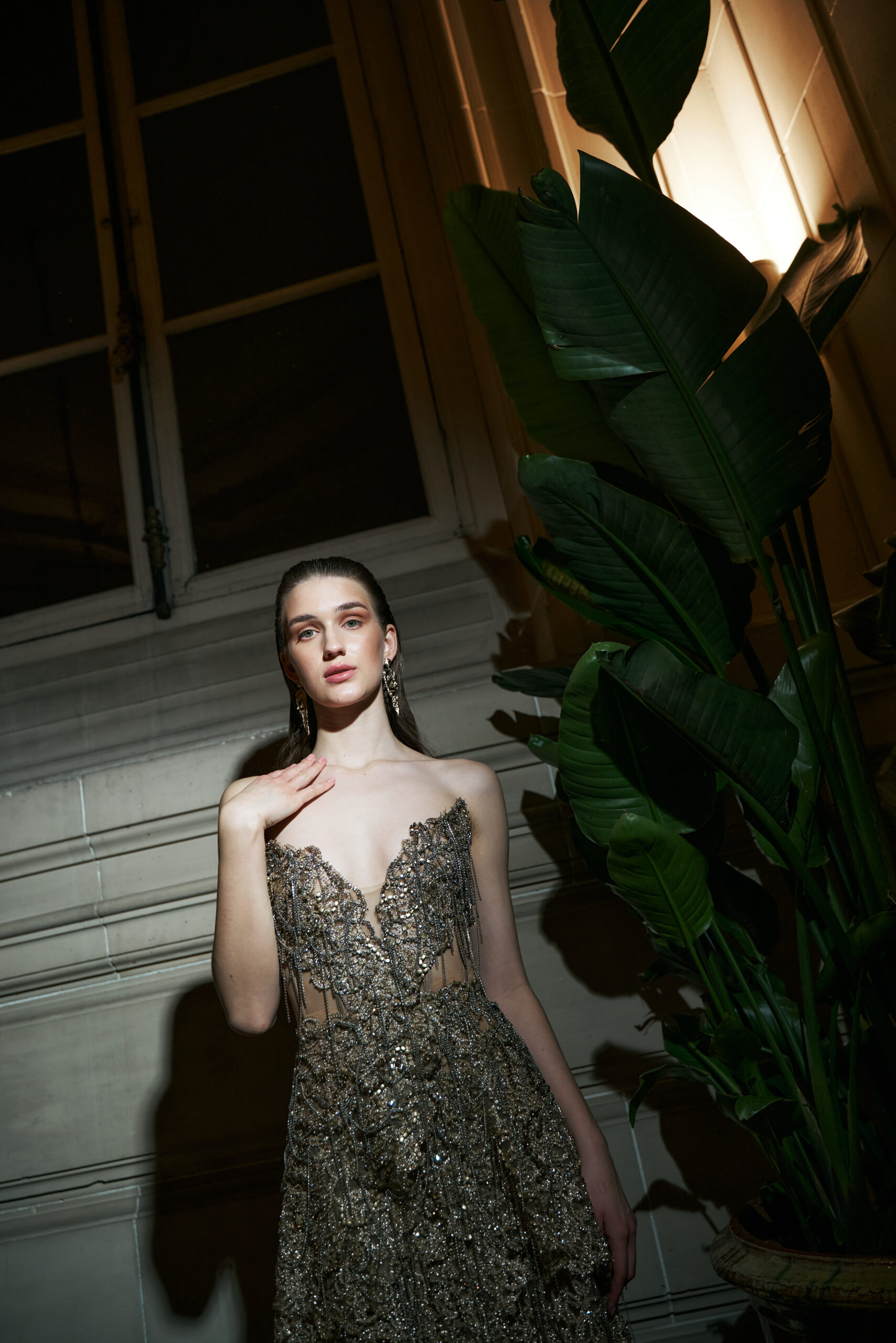 Laith Maalouf a enchanté l’audience avec sa collection inspirée des déesses, Amora: Une Symphonie de Structure et de Fluidité. Fusionnant design structuré et fluidité, chaque création rend hommage aux courbes gracieuses des statues de la Renaissance, incarnant l’essence divine de la déesse Amora à travers draperies aériennes et ornements dorés luxuriants.