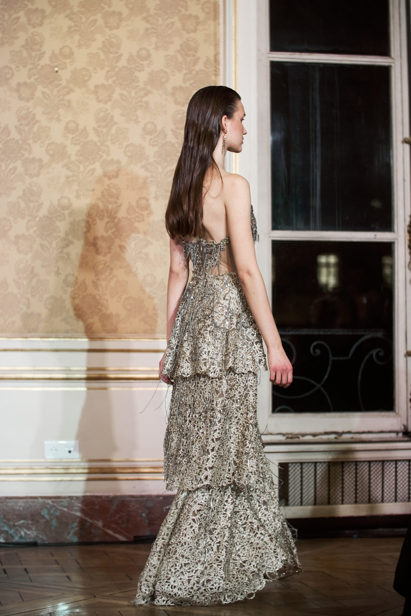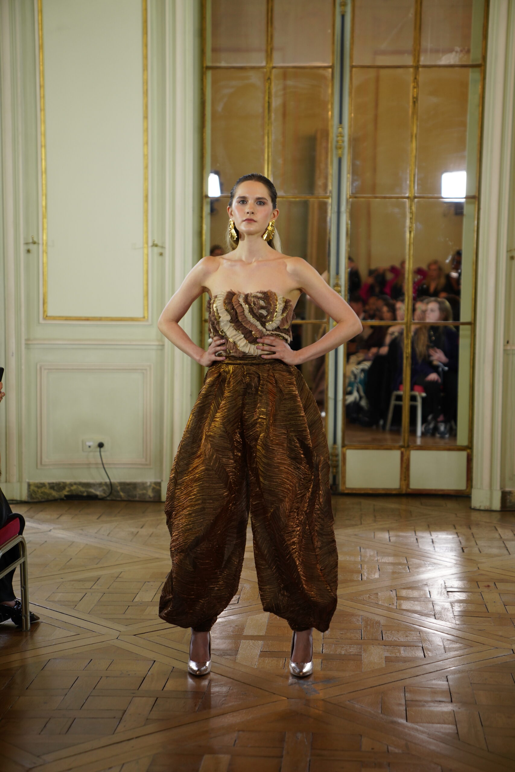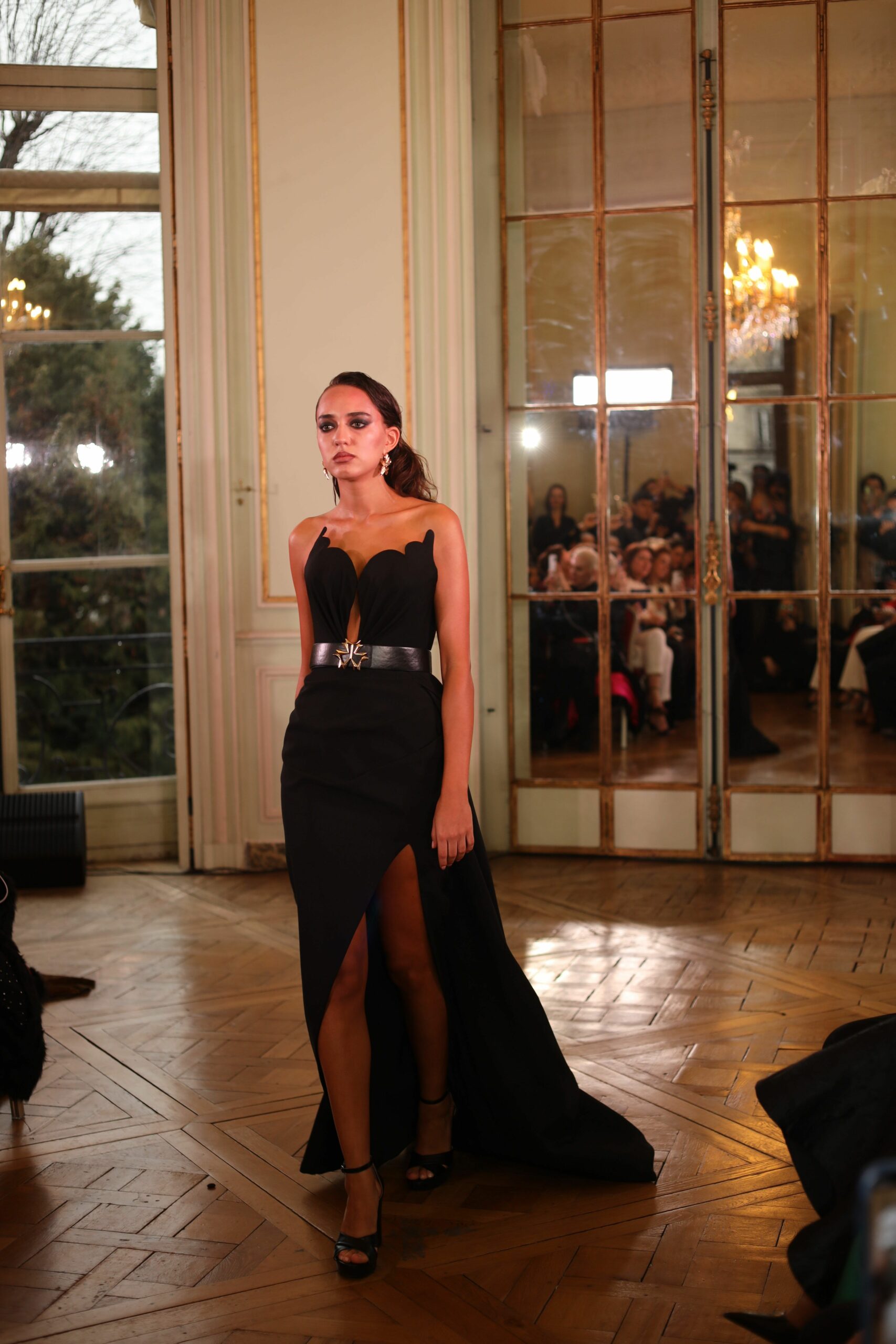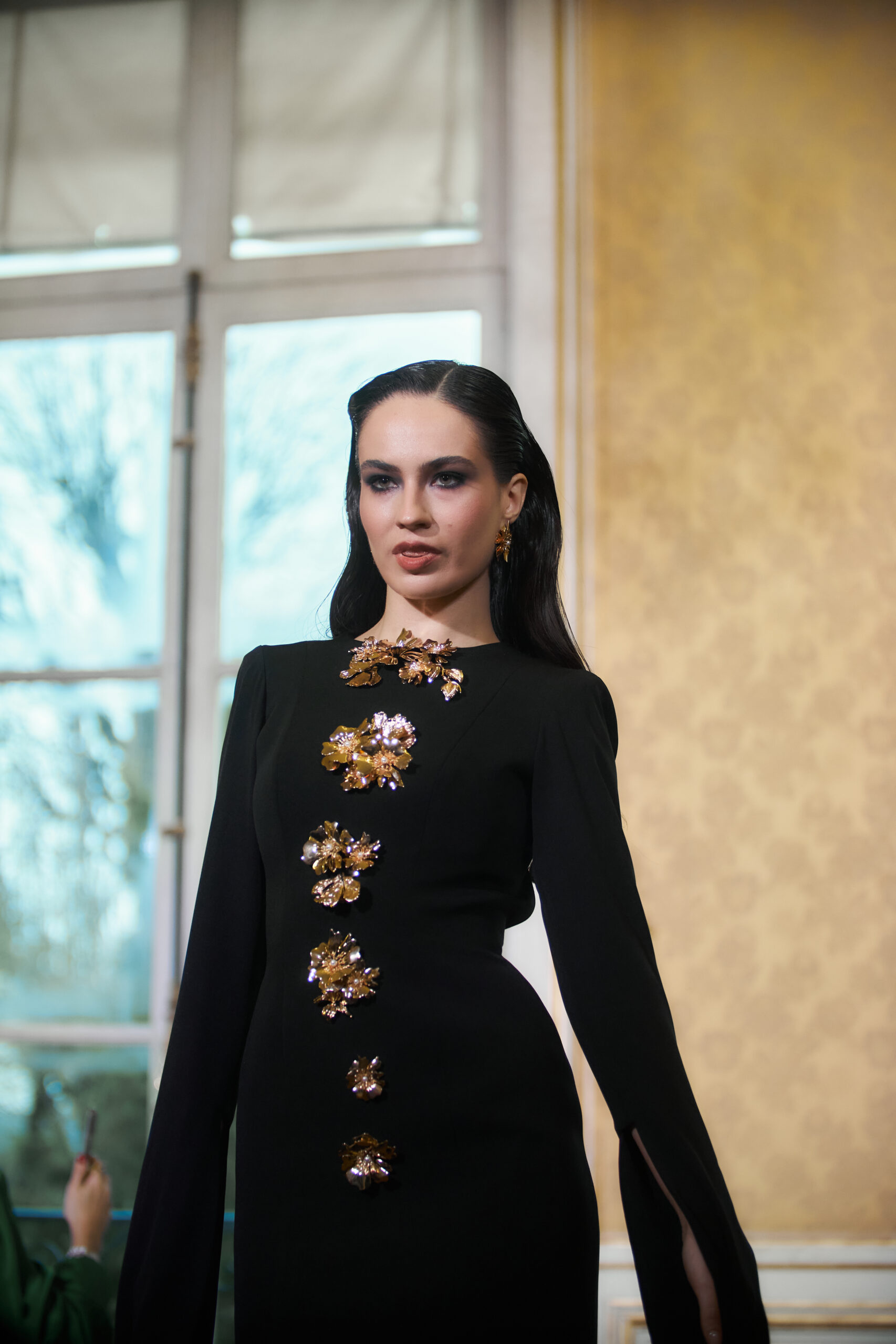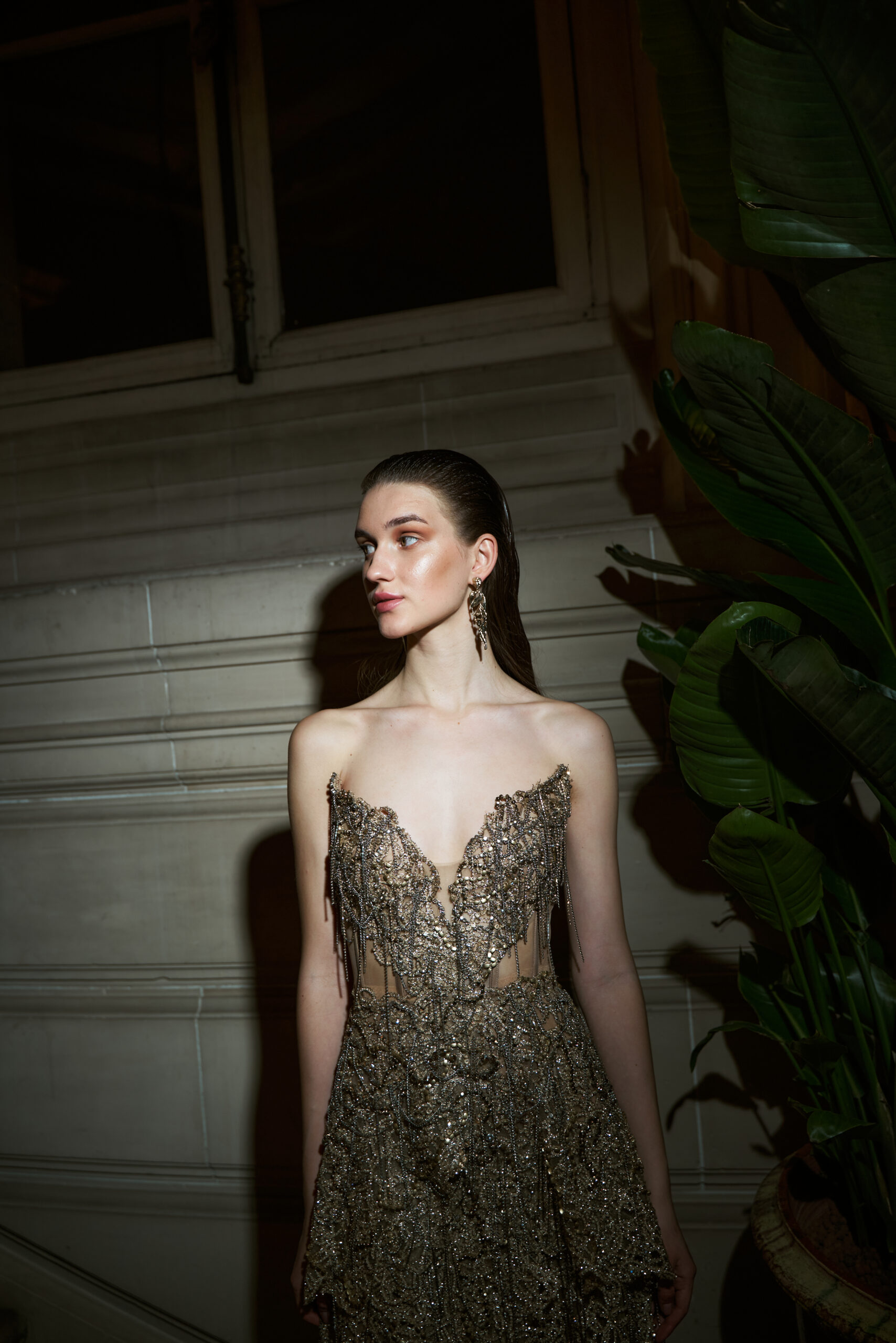 Laith Maalouf a enchanté l’audience avec sa collection inspirée des déesses, Amora: Une Symphonie de Structure et de Fluidité. Fusionnant design structuré et fluidité, chaque création rend hommage aux courbes gracieuses des statues de la Renaissance, incarnant l’essence divine de la déesse Amora à travers draperies aériennes et ornements dorés luxuriants.