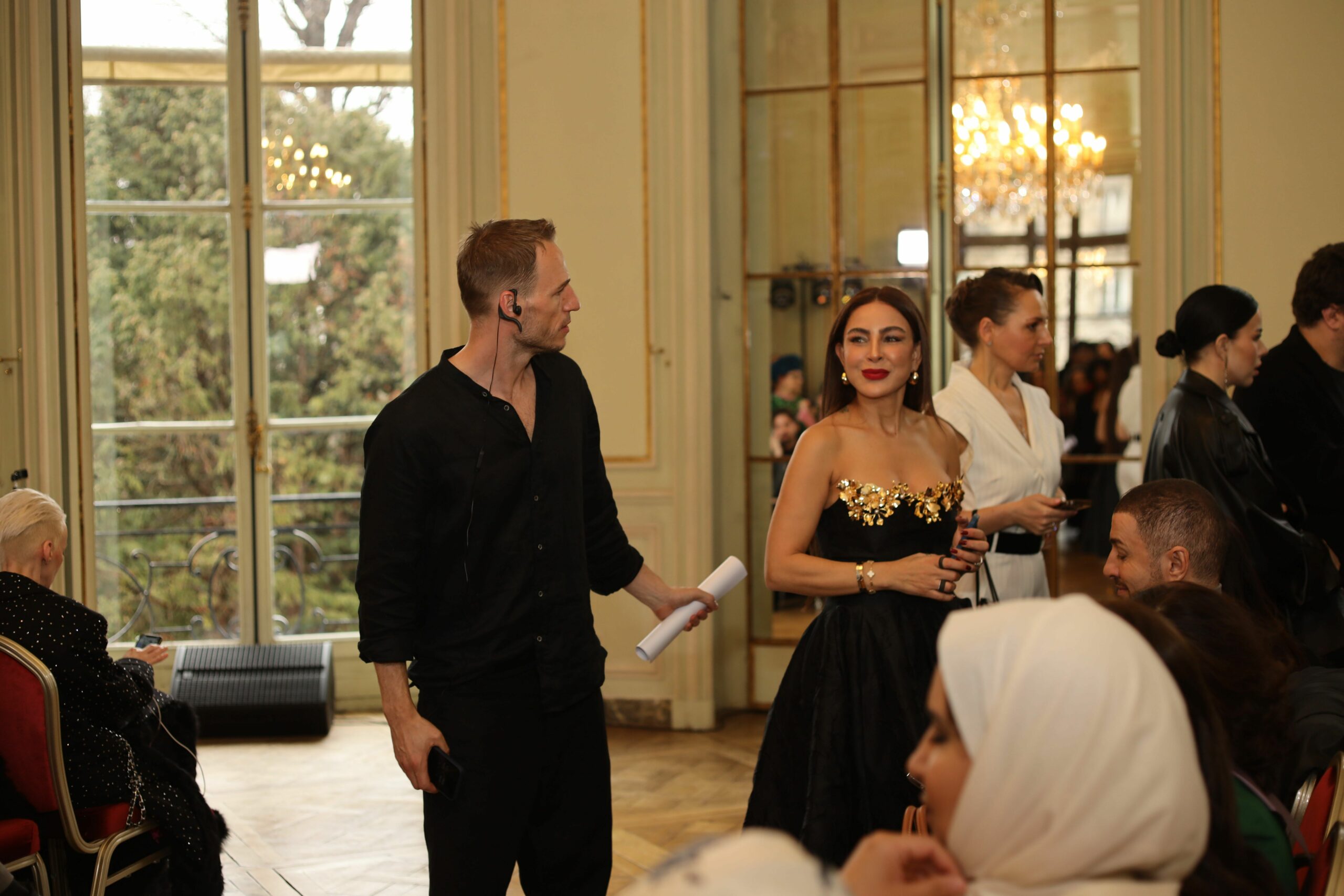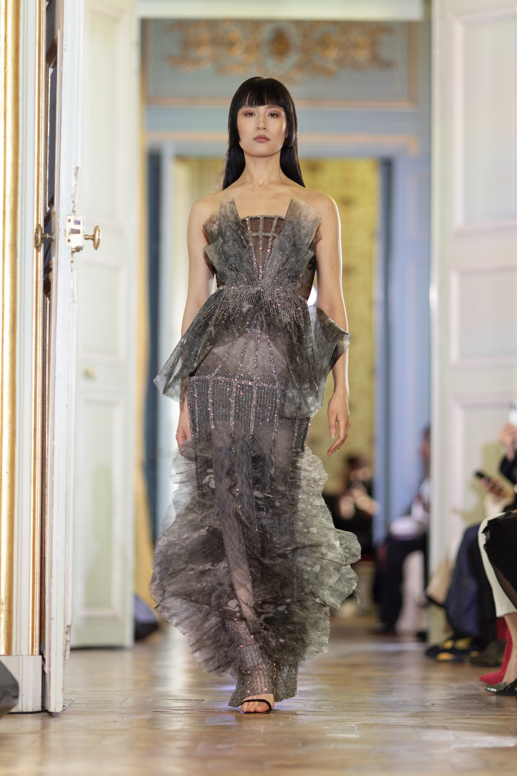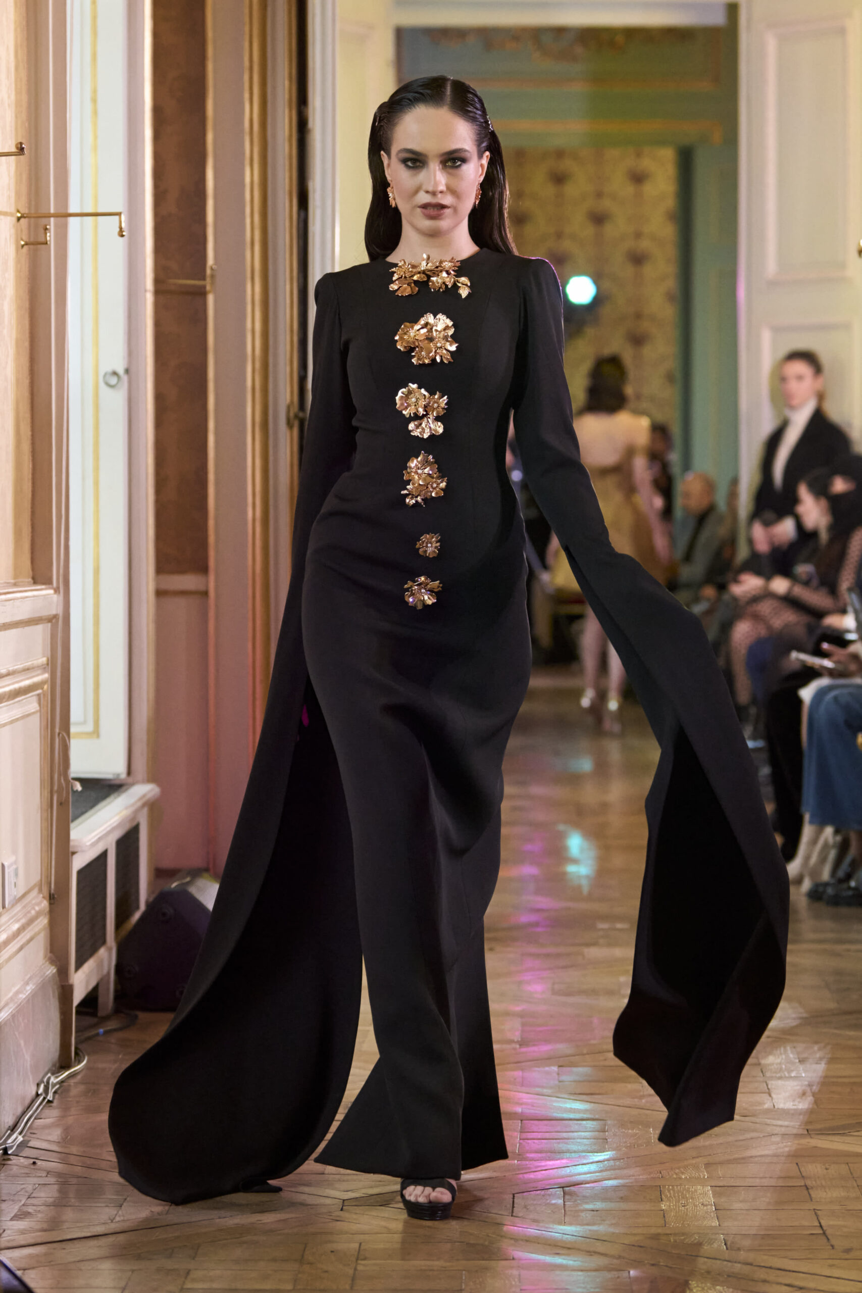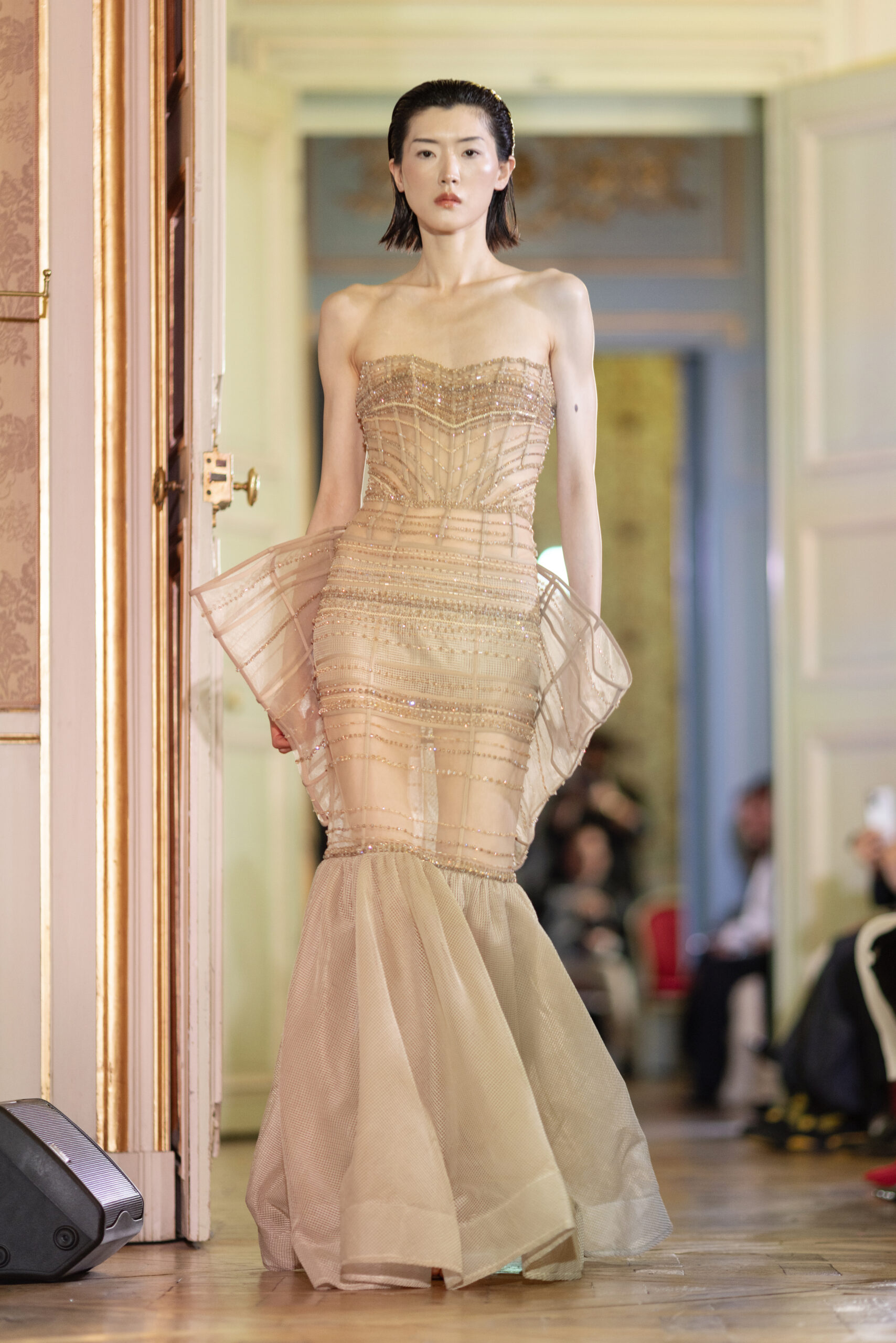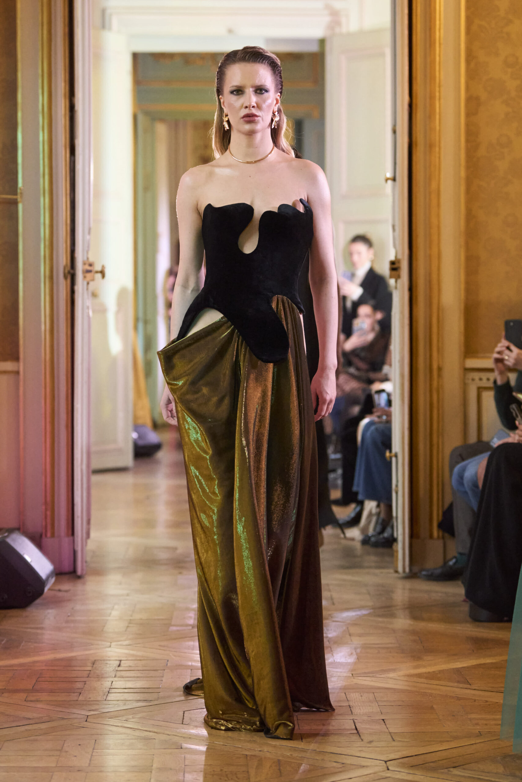 Laith Maalouf a enchanté l’audience avec sa collection inspirée des déesses, Amora: Une Symphonie de Structure et de Fluidité. Fusionnant design structuré et fluidité, chaque création rend hommage aux courbes gracieuses des statues de la Renaissance, incarnant l’essence divine de la déesse Amora à travers draperies aériennes et ornements dorés luxuriants.