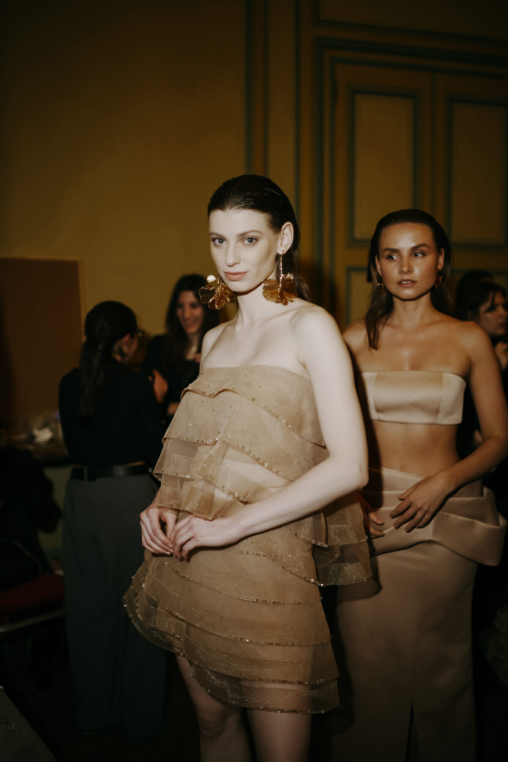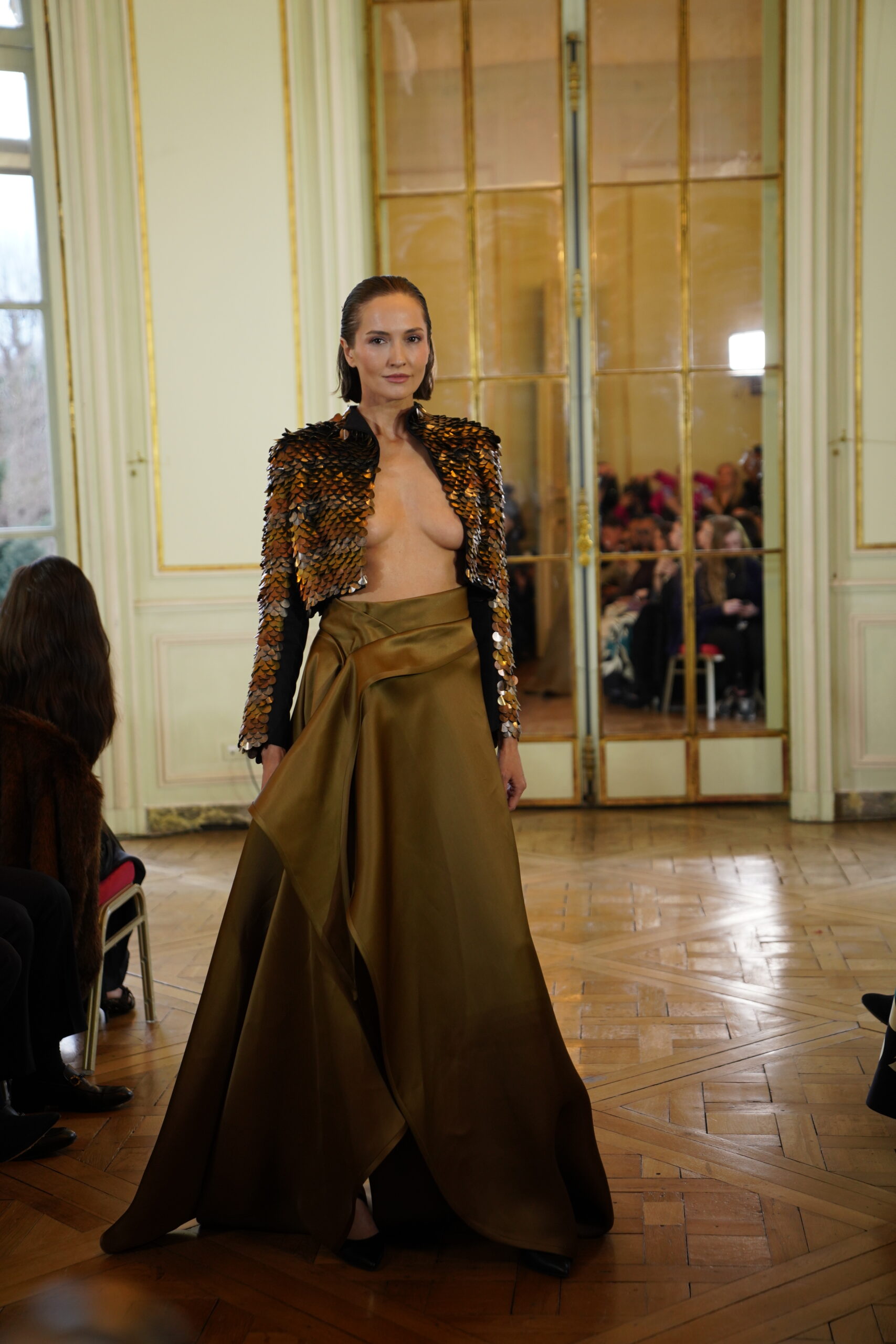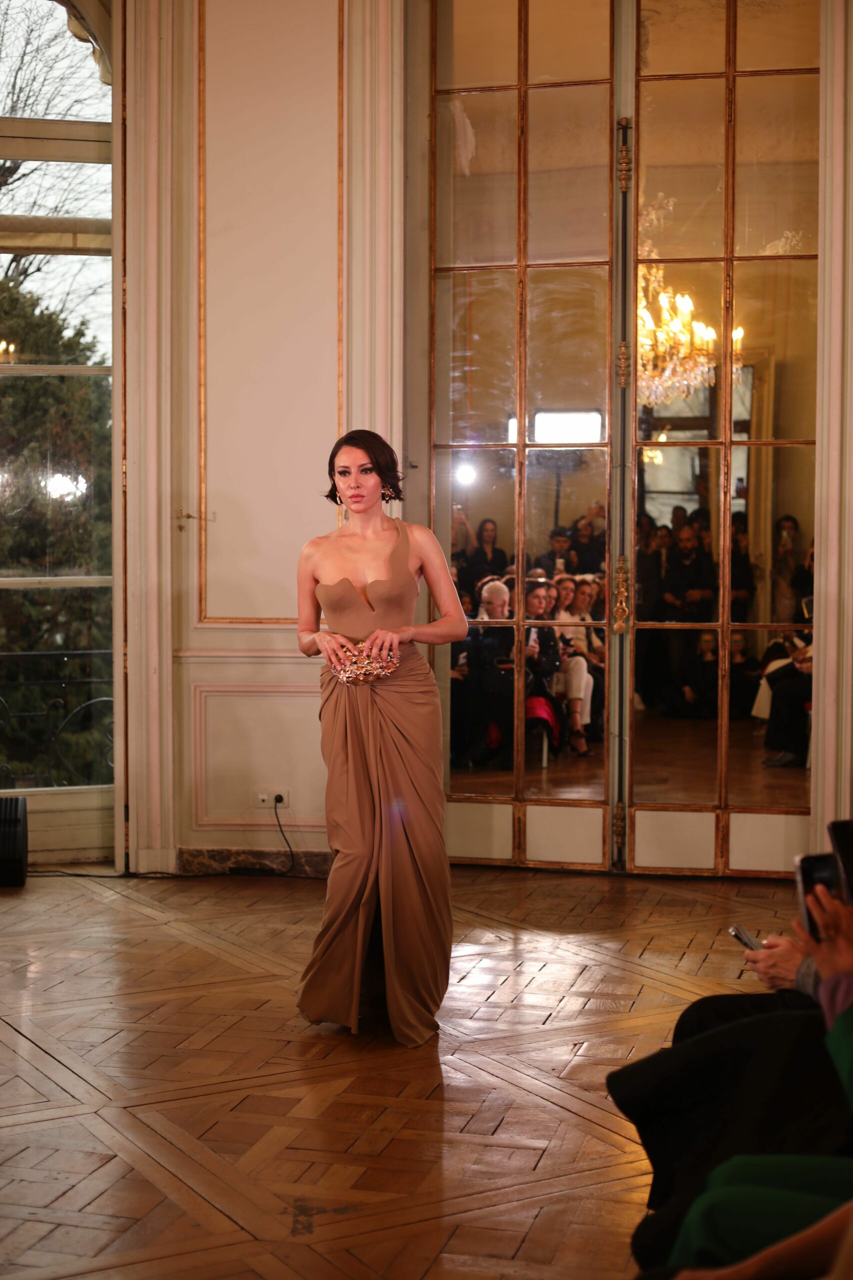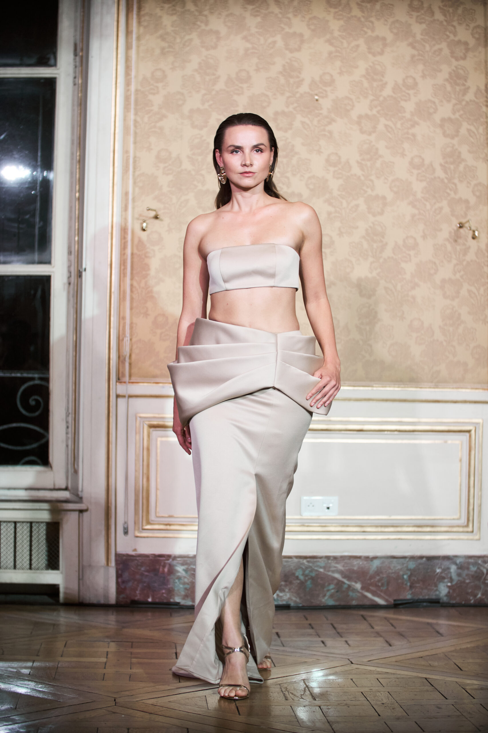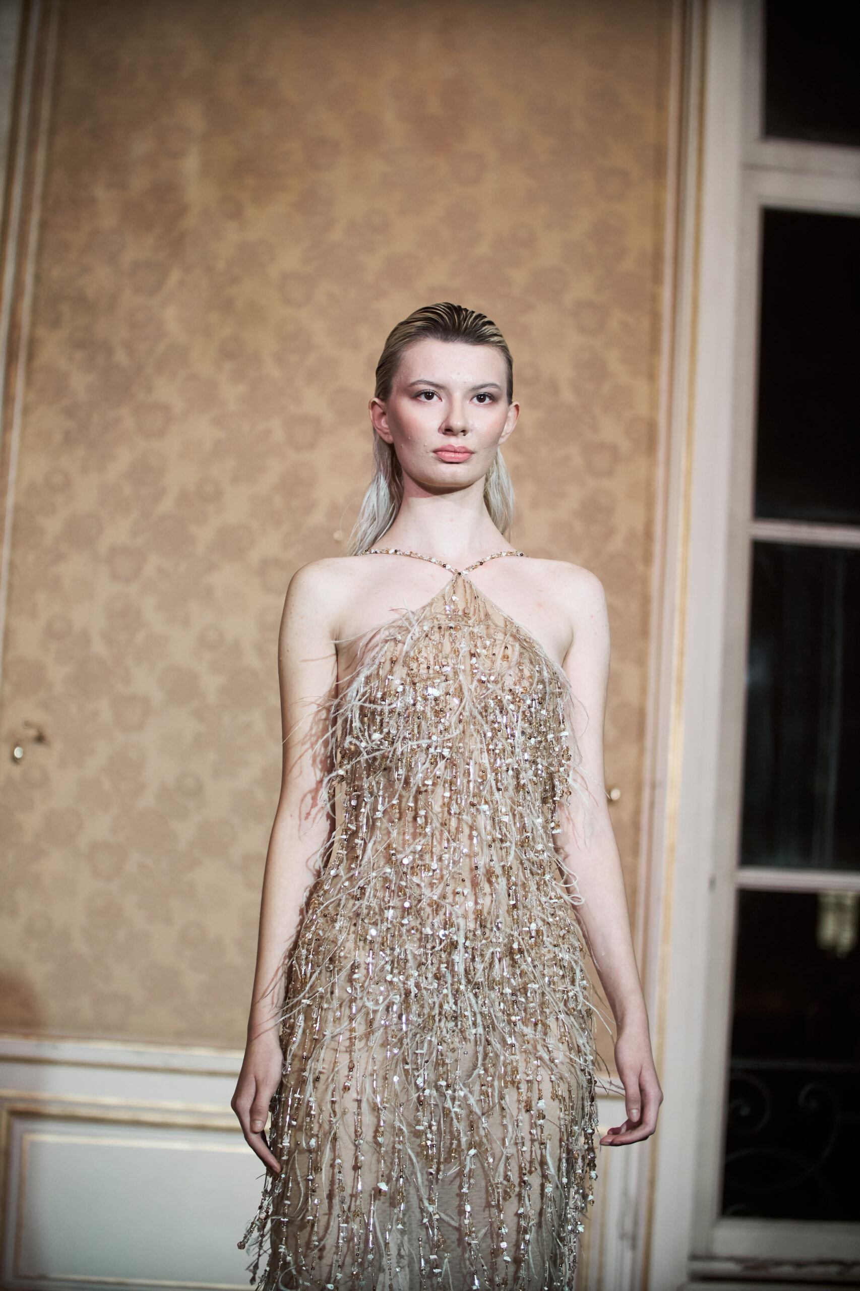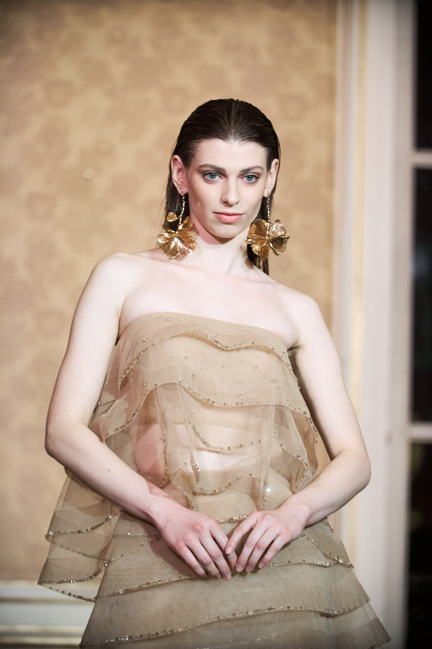 Laith Maalouf a enchanté l’audience avec sa collection inspirée des déesses, Amora: Une Symphonie de Structure et de Fluidité. Fusionnant design structuré et fluidité, chaque création rend hommage aux courbes gracieuses des statues de la Renaissance, incarnant l’essence divine de la déesse Amora à travers draperies aériennes et ornements dorés luxuriants.