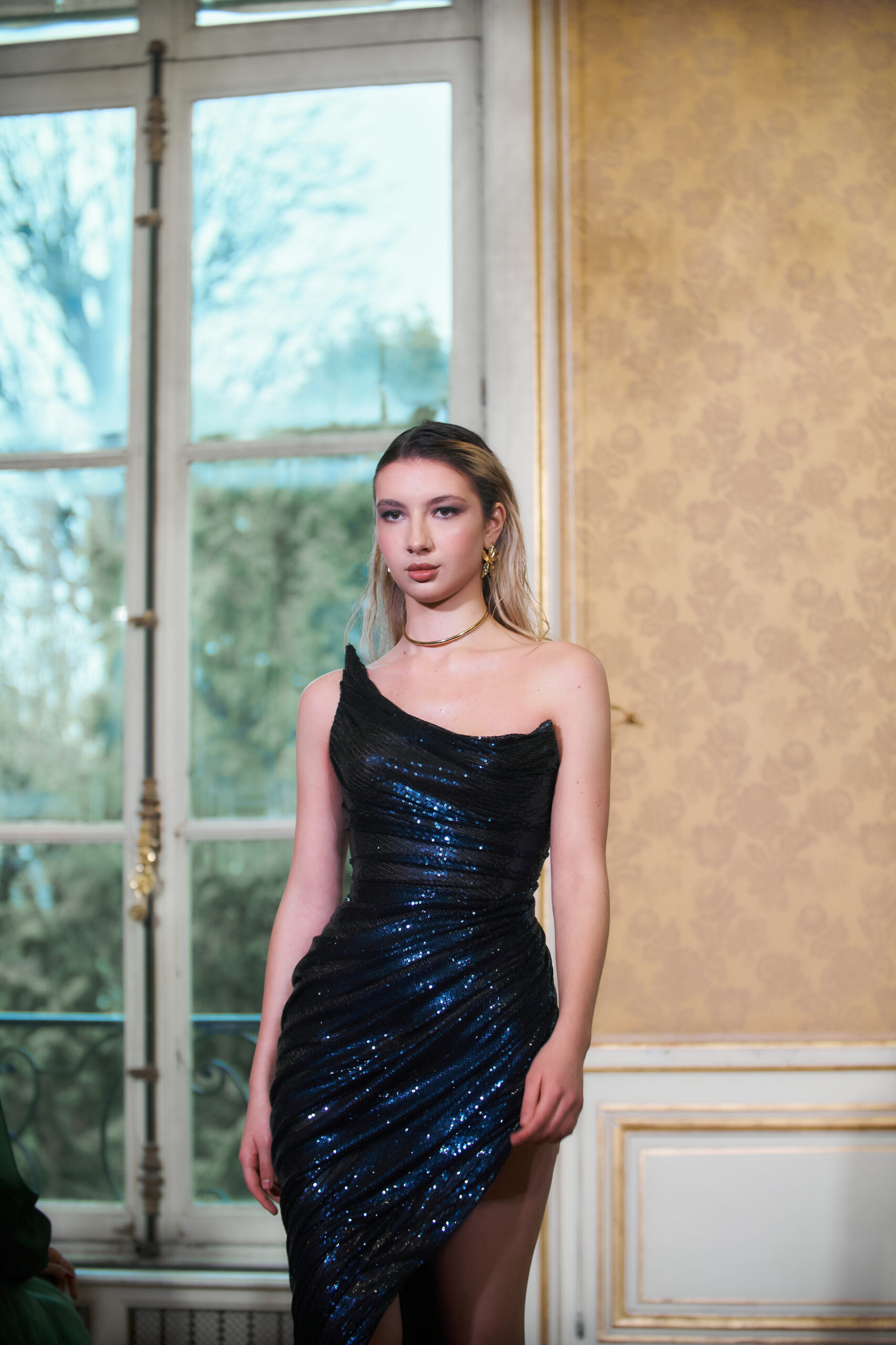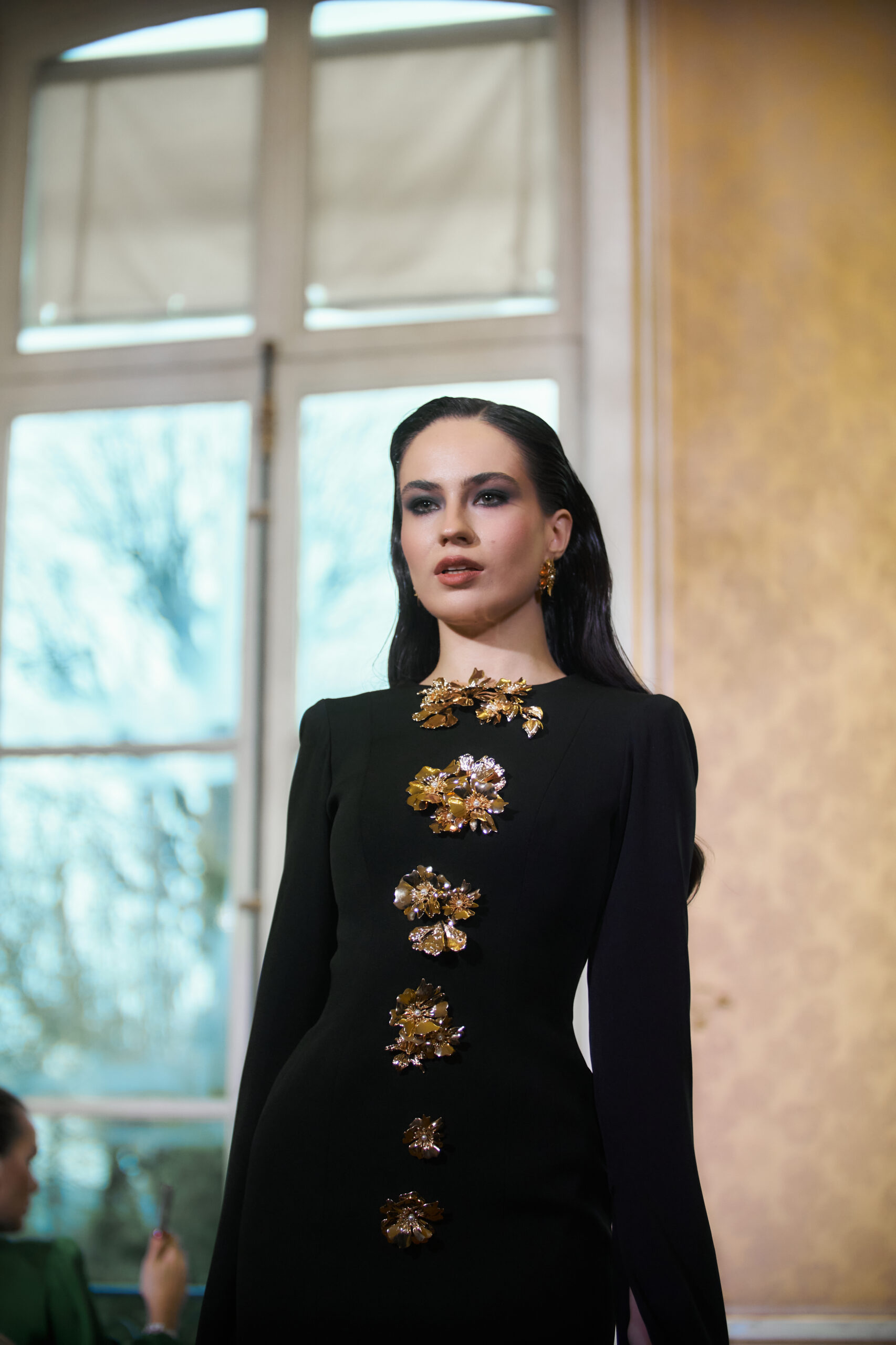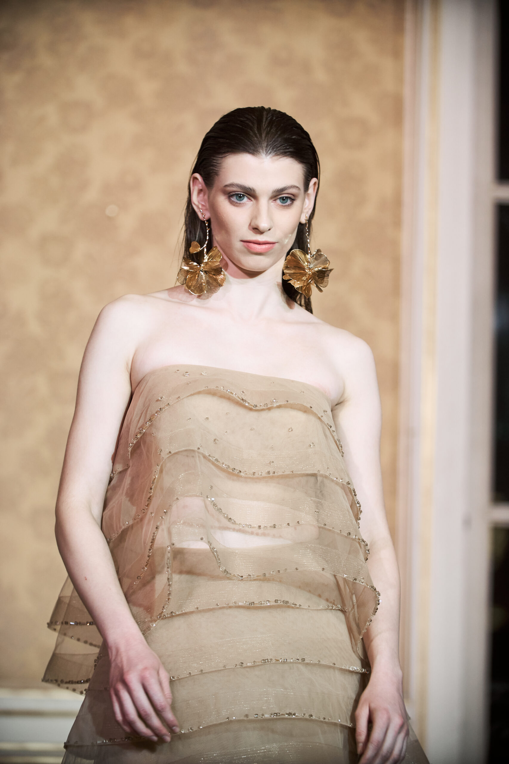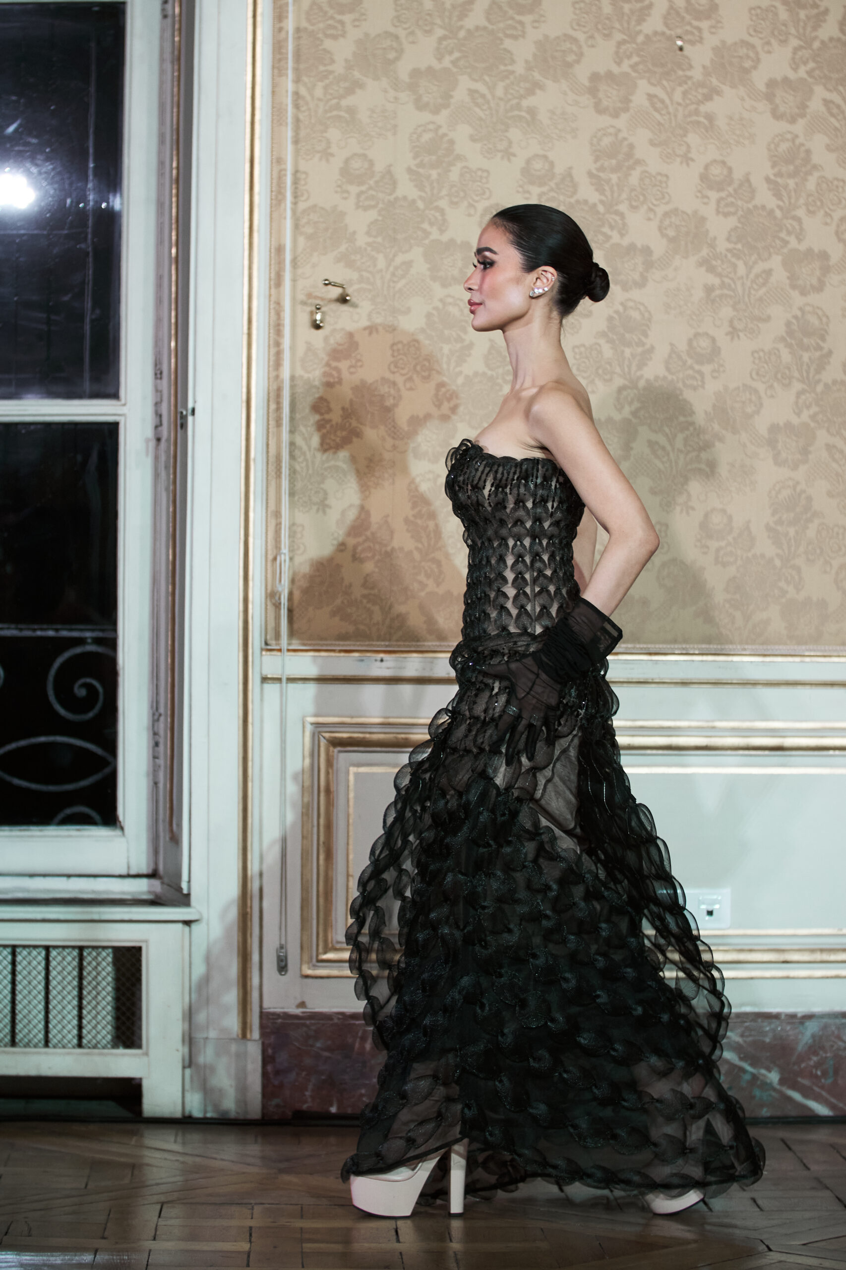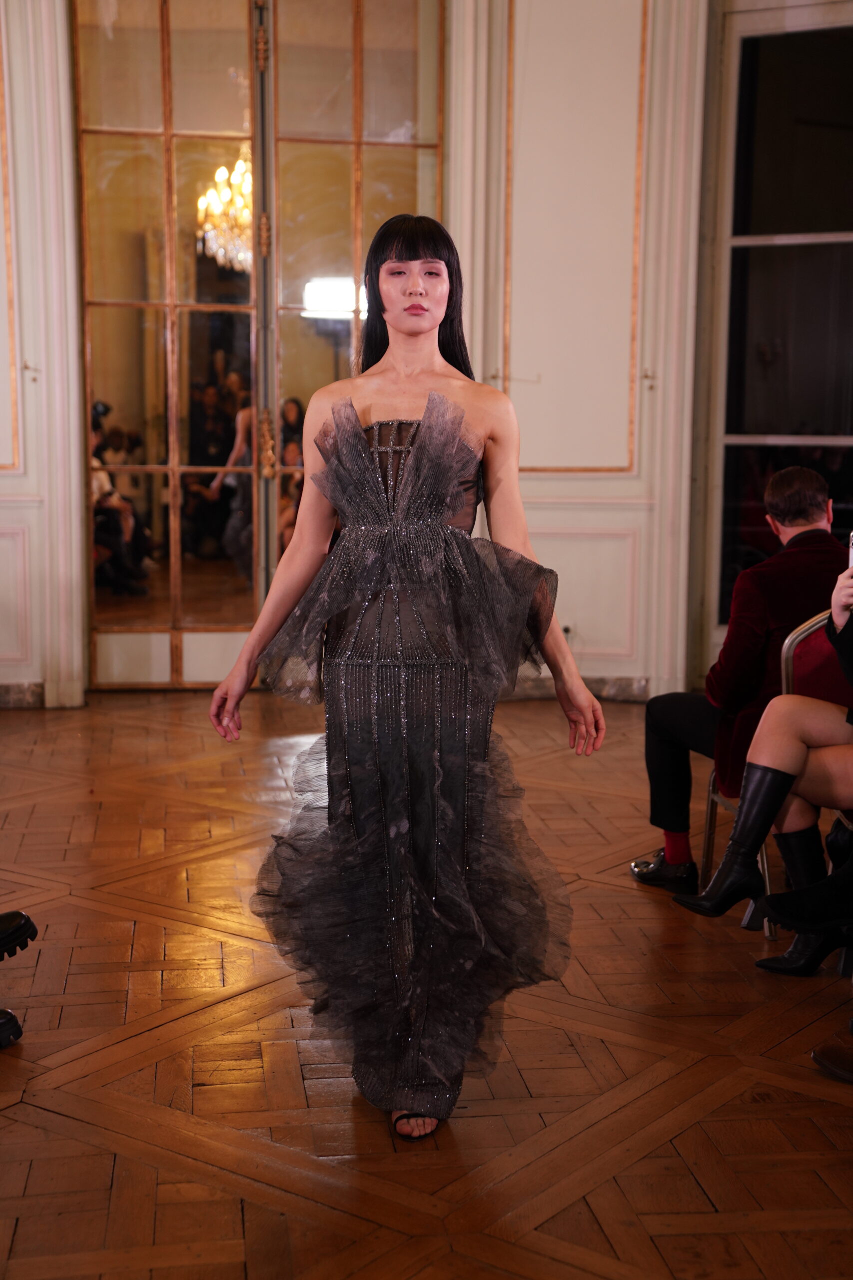 Laith Maalouf a enchanté l’audience avec sa collection inspirée des déesses, Amora: Une Symphonie de Structure et de Fluidité. Fusionnant design structuré et fluidité, chaque création rend hommage aux courbes gracieuses des statues de la Renaissance, incarnant l’essence divine de la déesse Amora à travers draperies aériennes et ornements dorés luxuriants.