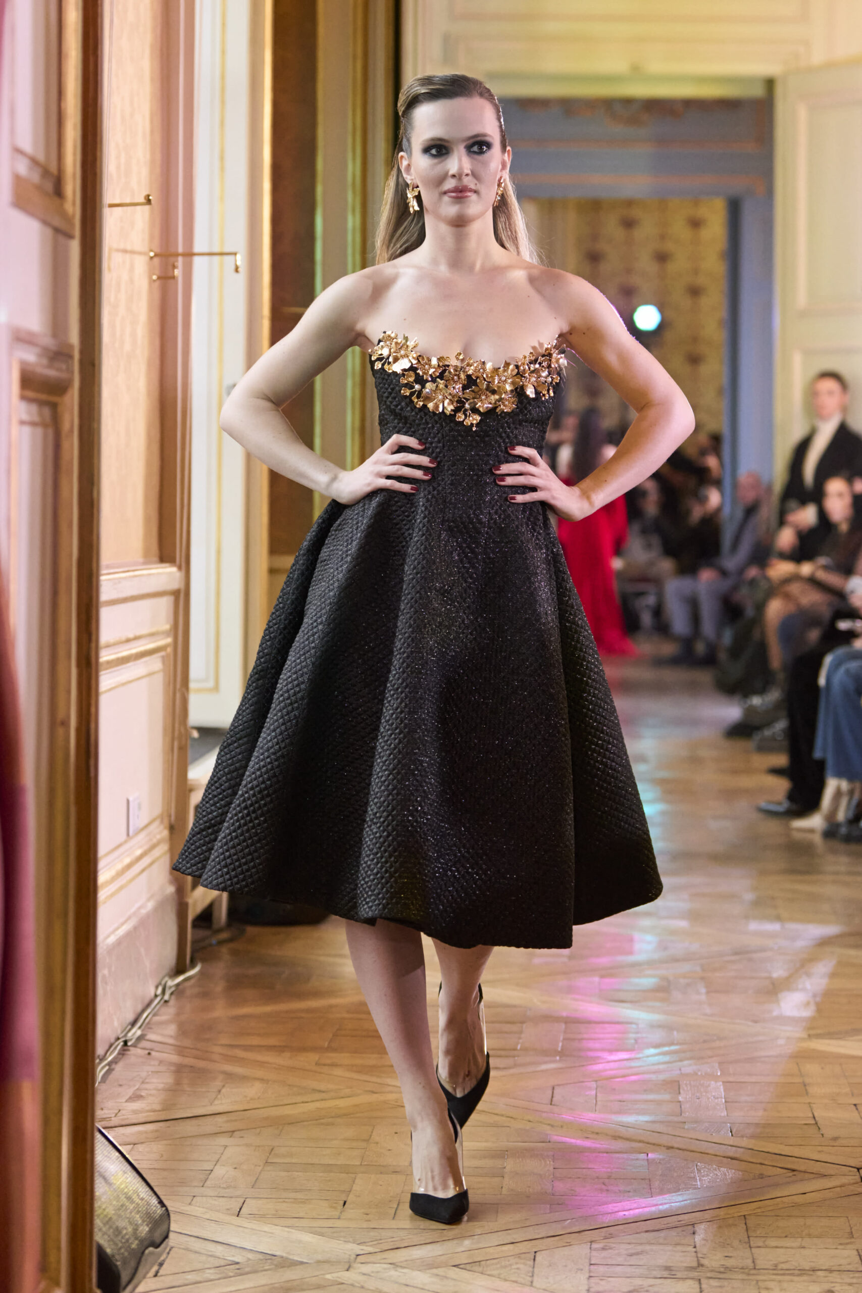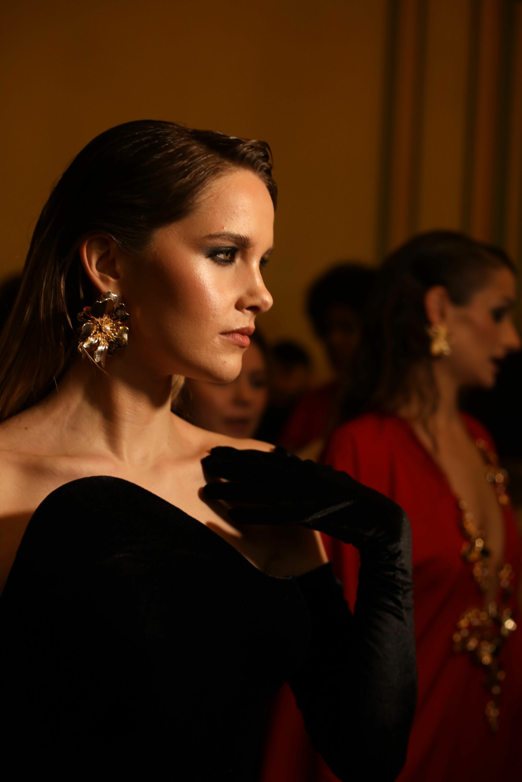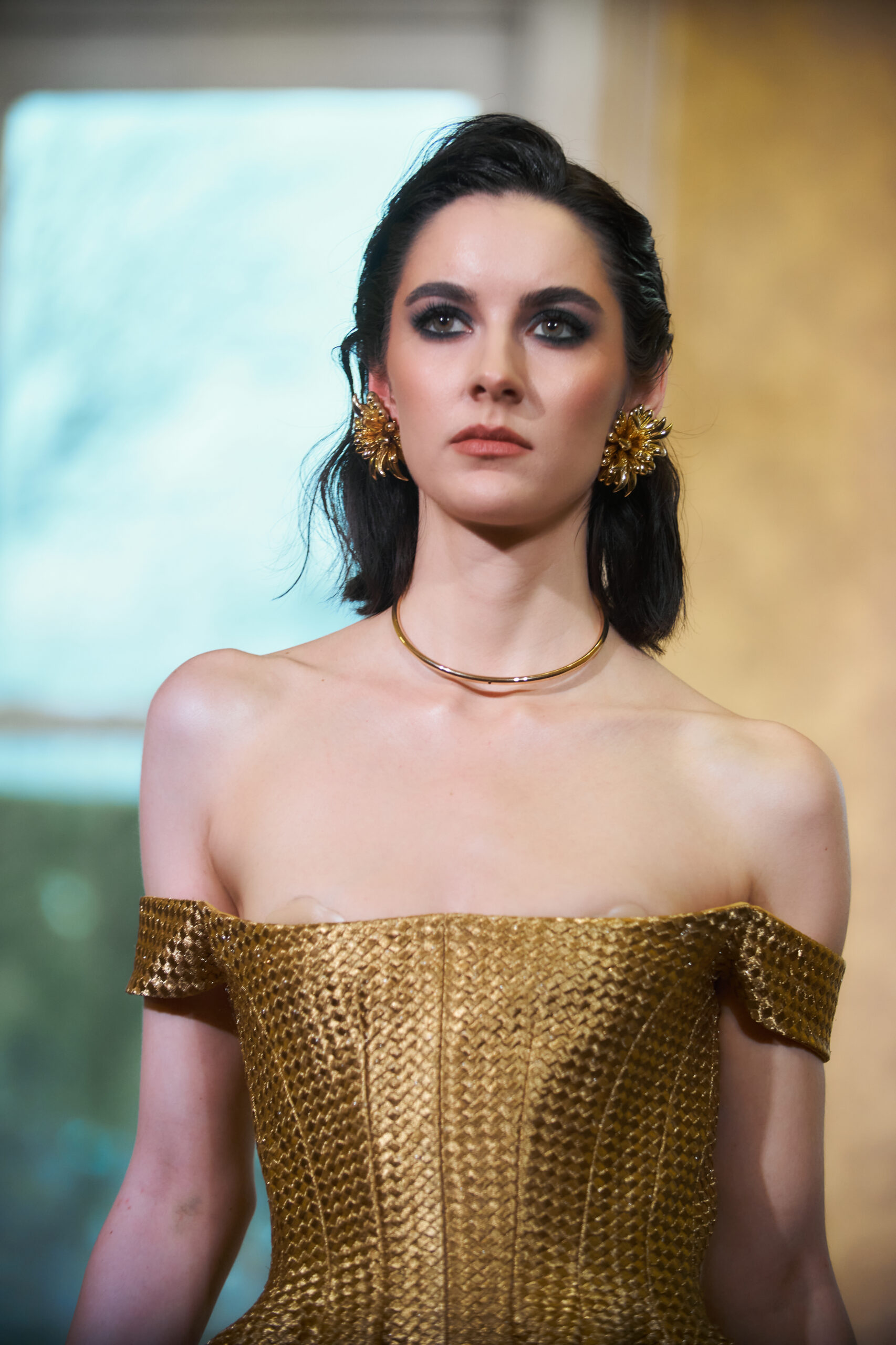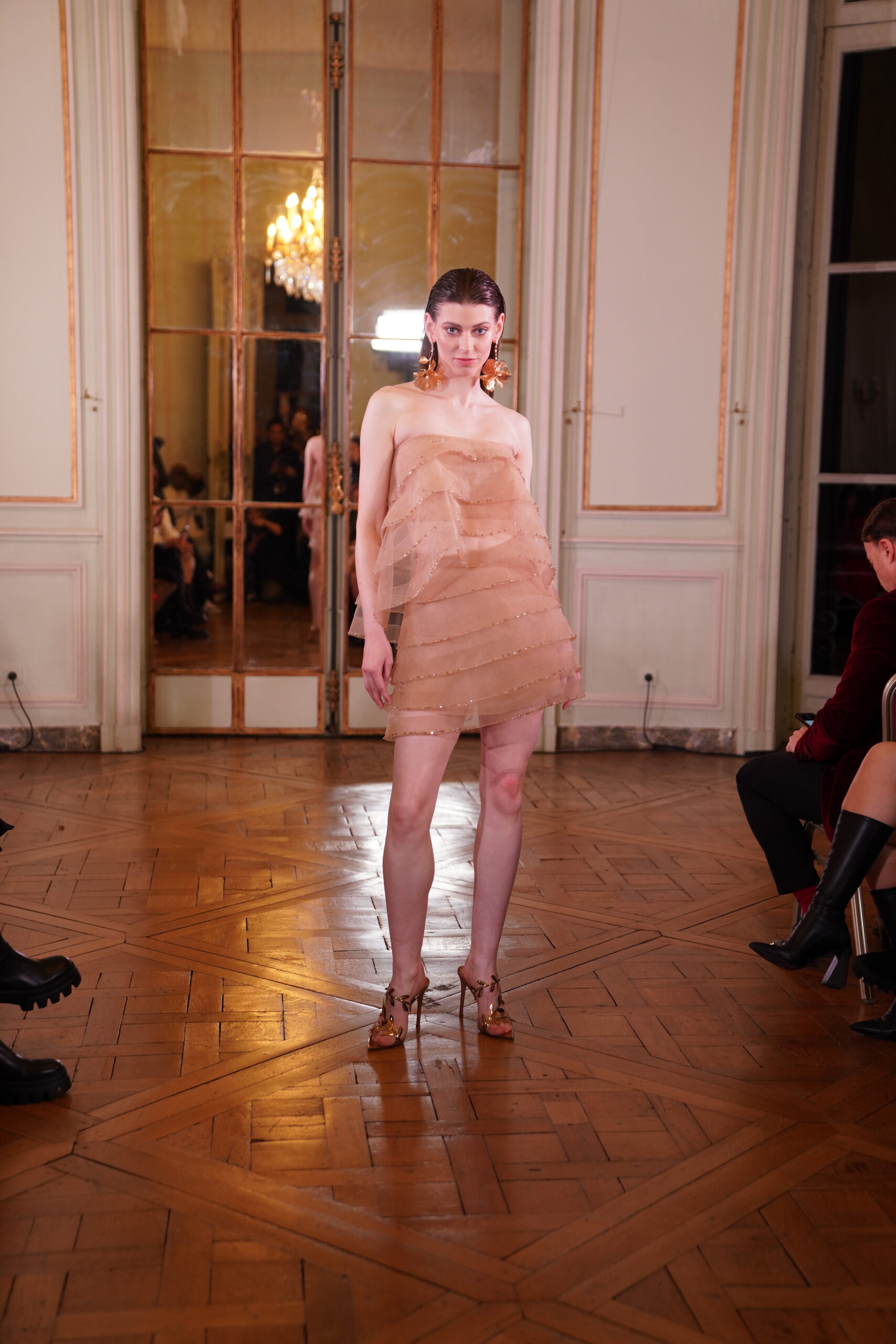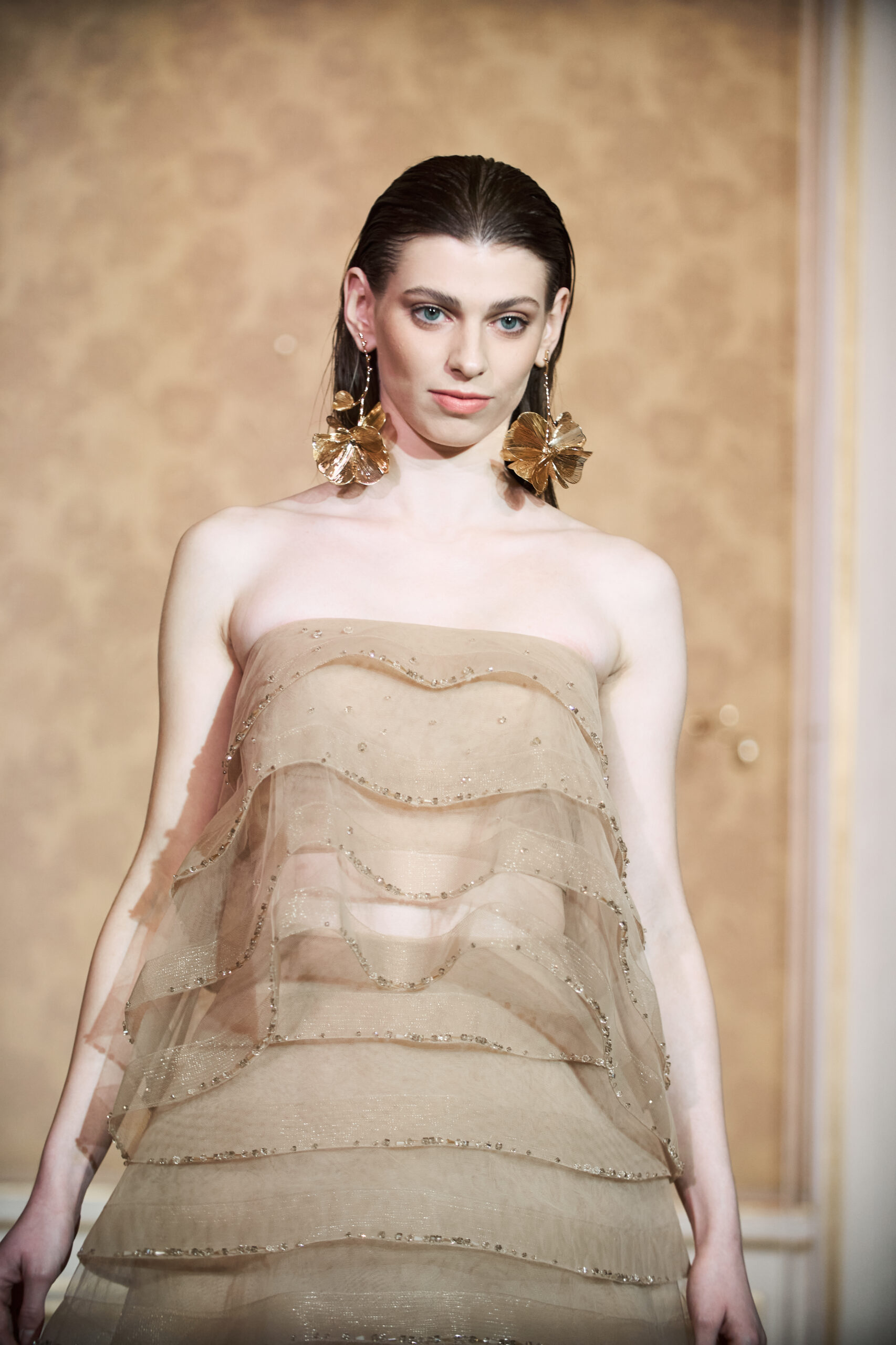 Laith Maalouf a enchanté l’audience avec sa collection inspirée des déesses, Amora: Une Symphonie de Structure et de Fluidité. Fusionnant design structuré et fluidité, chaque création rend hommage aux courbes gracieuses des statues de la Renaissance, incarnant l’essence divine de la déesse Amora à travers draperies aériennes et ornements dorés luxuriants.
