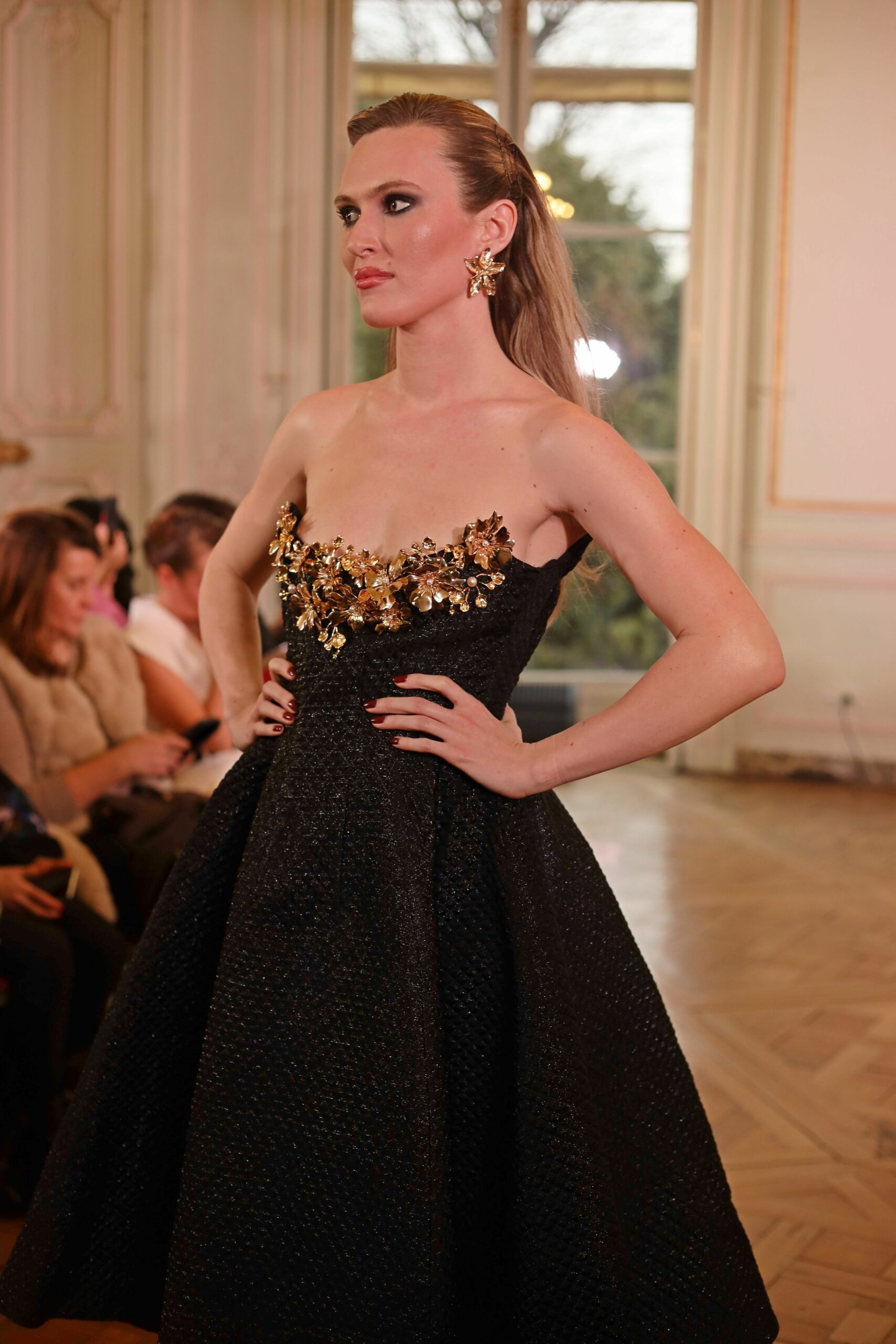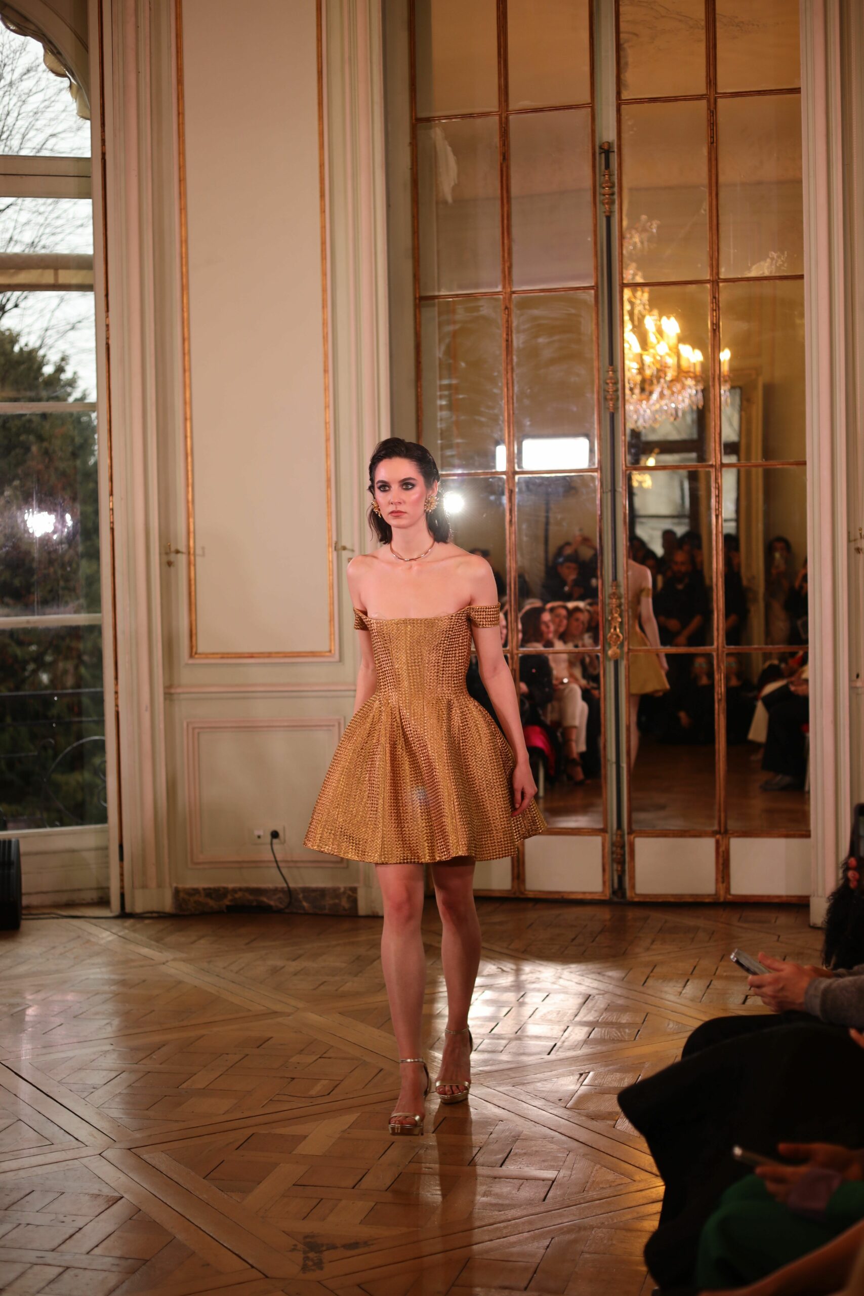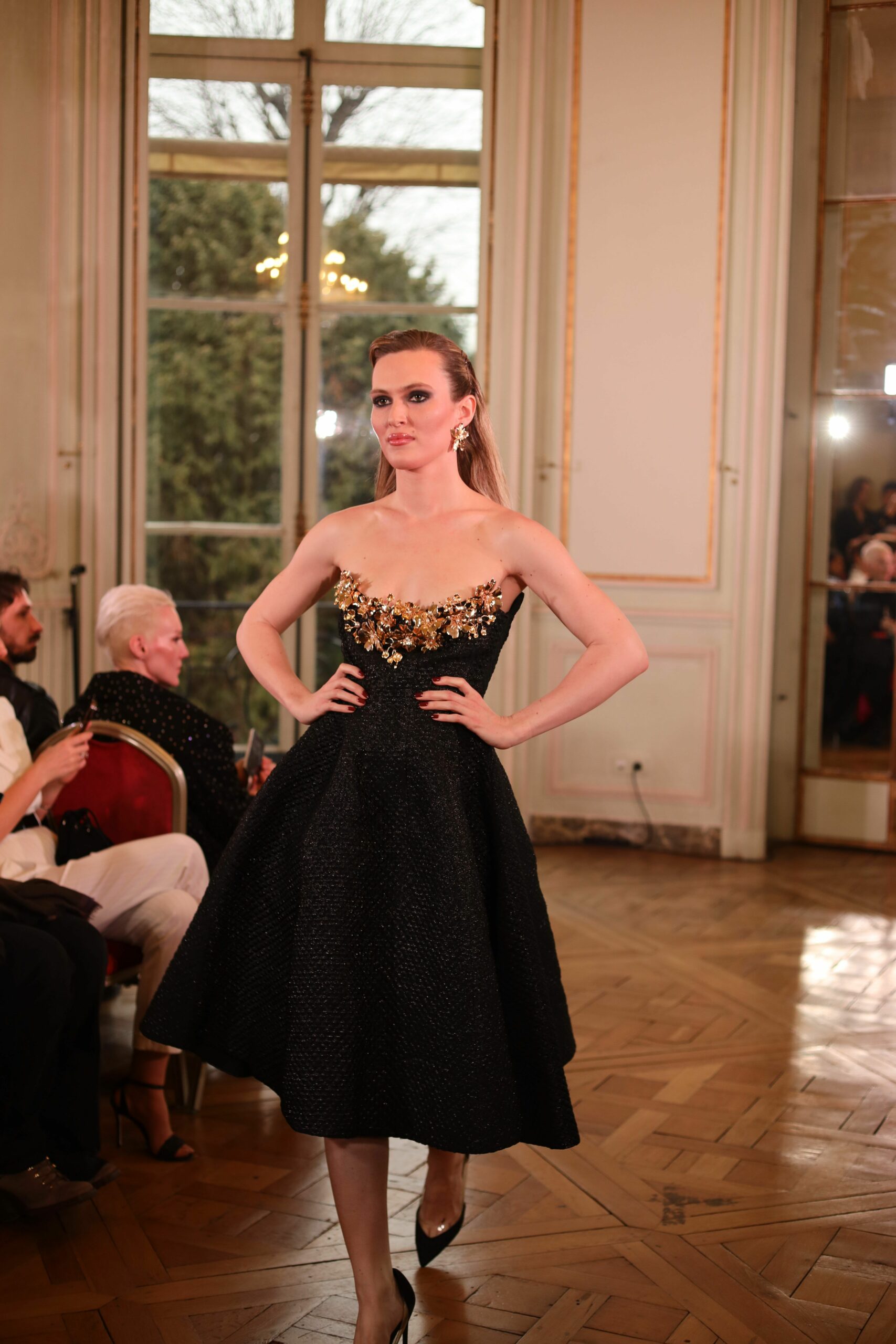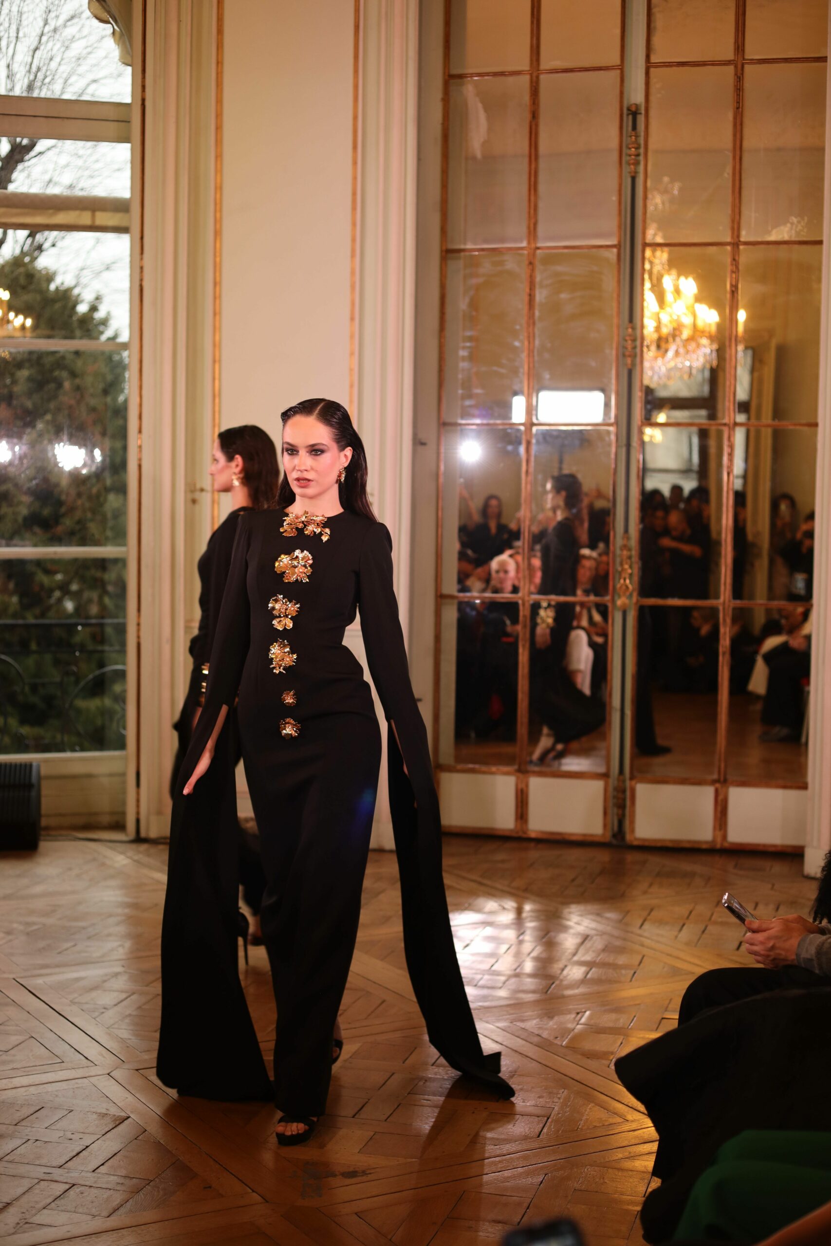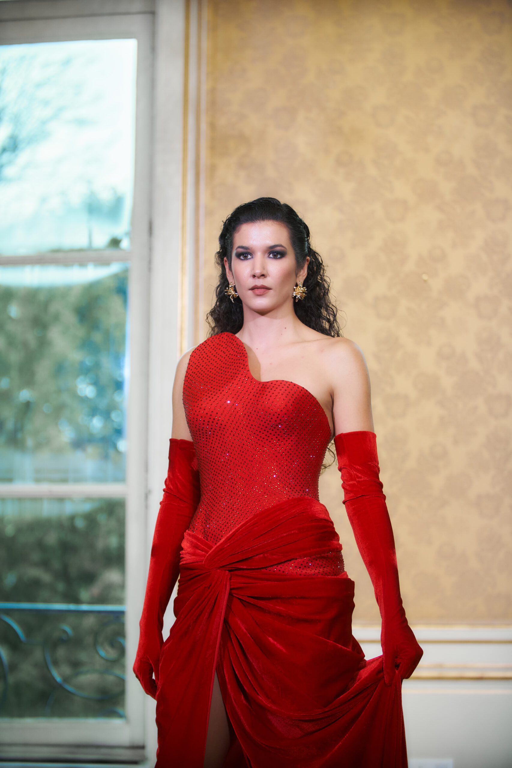 Laith Maalouf a enchanté l’audience avec sa collection inspirée des déesses, Amora: Une Symphonie de Structure et de Fluidité. Fusionnant design structuré et fluidité, chaque création rend hommage aux courbes gracieuses des statues de la Renaissance, incarnant l’essence divine de la déesse Amora à travers draperies aériennes et ornements dorés luxuriants.