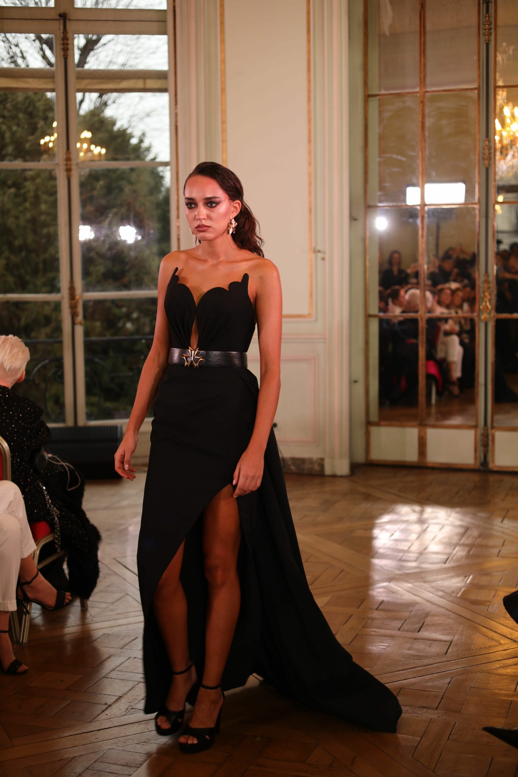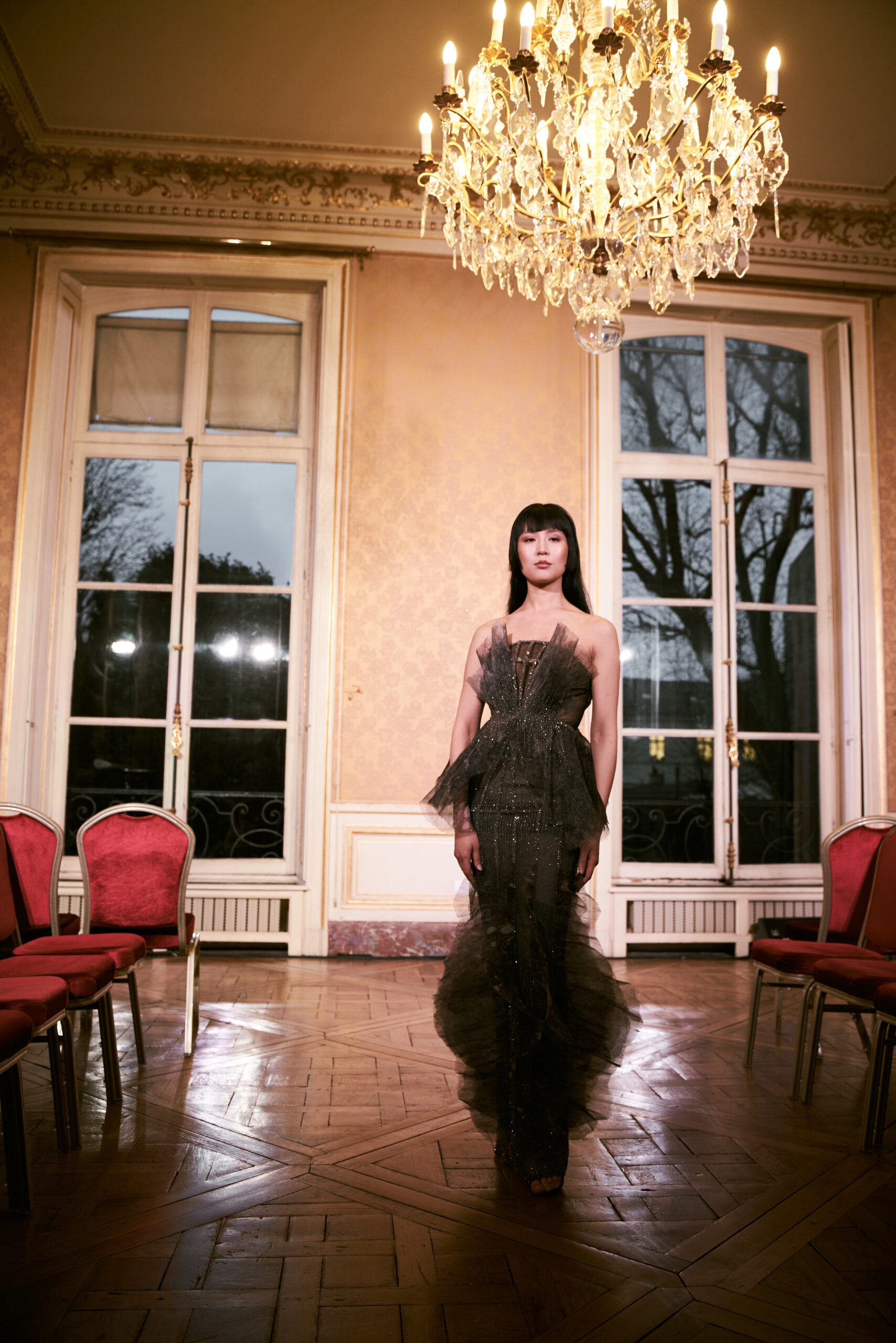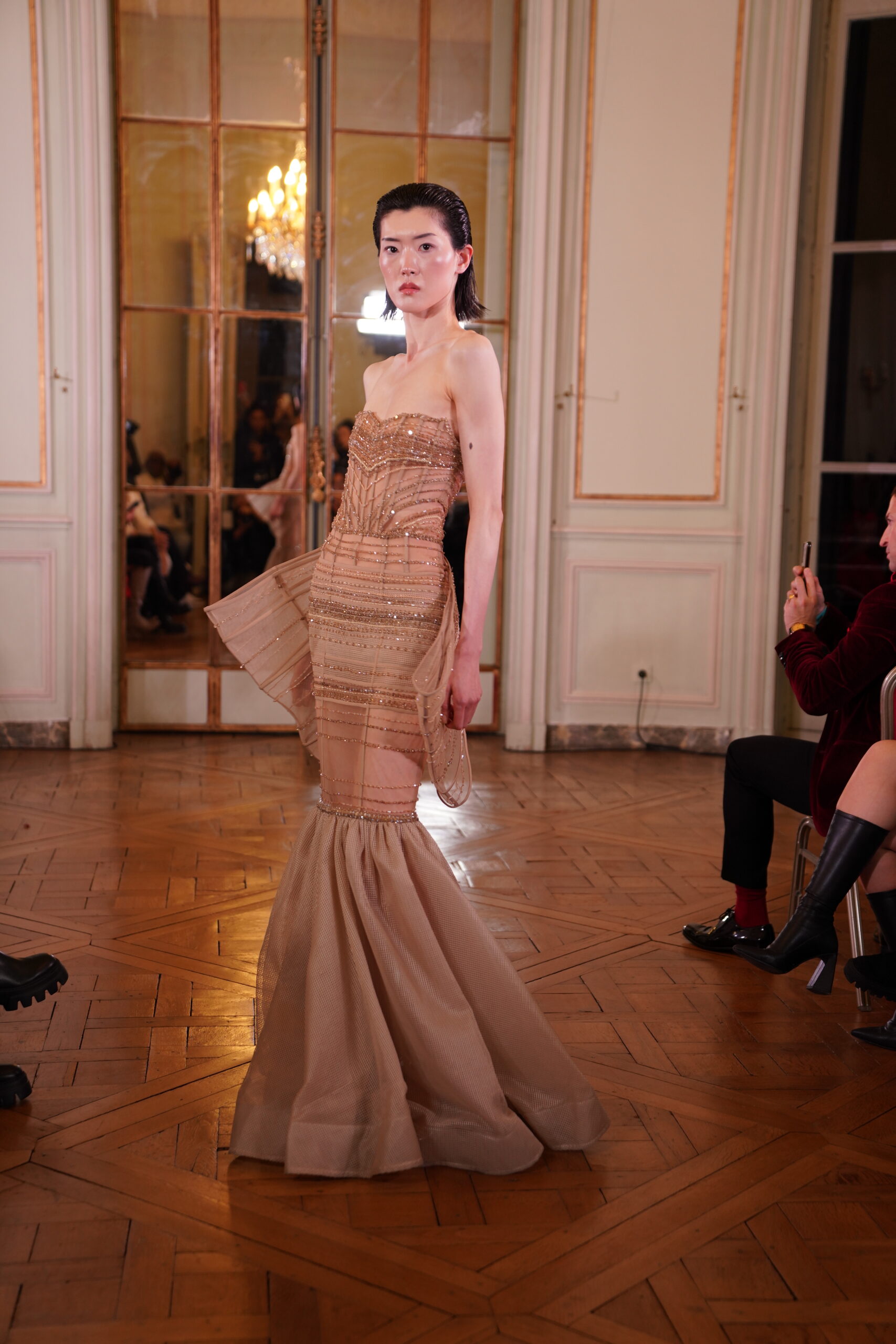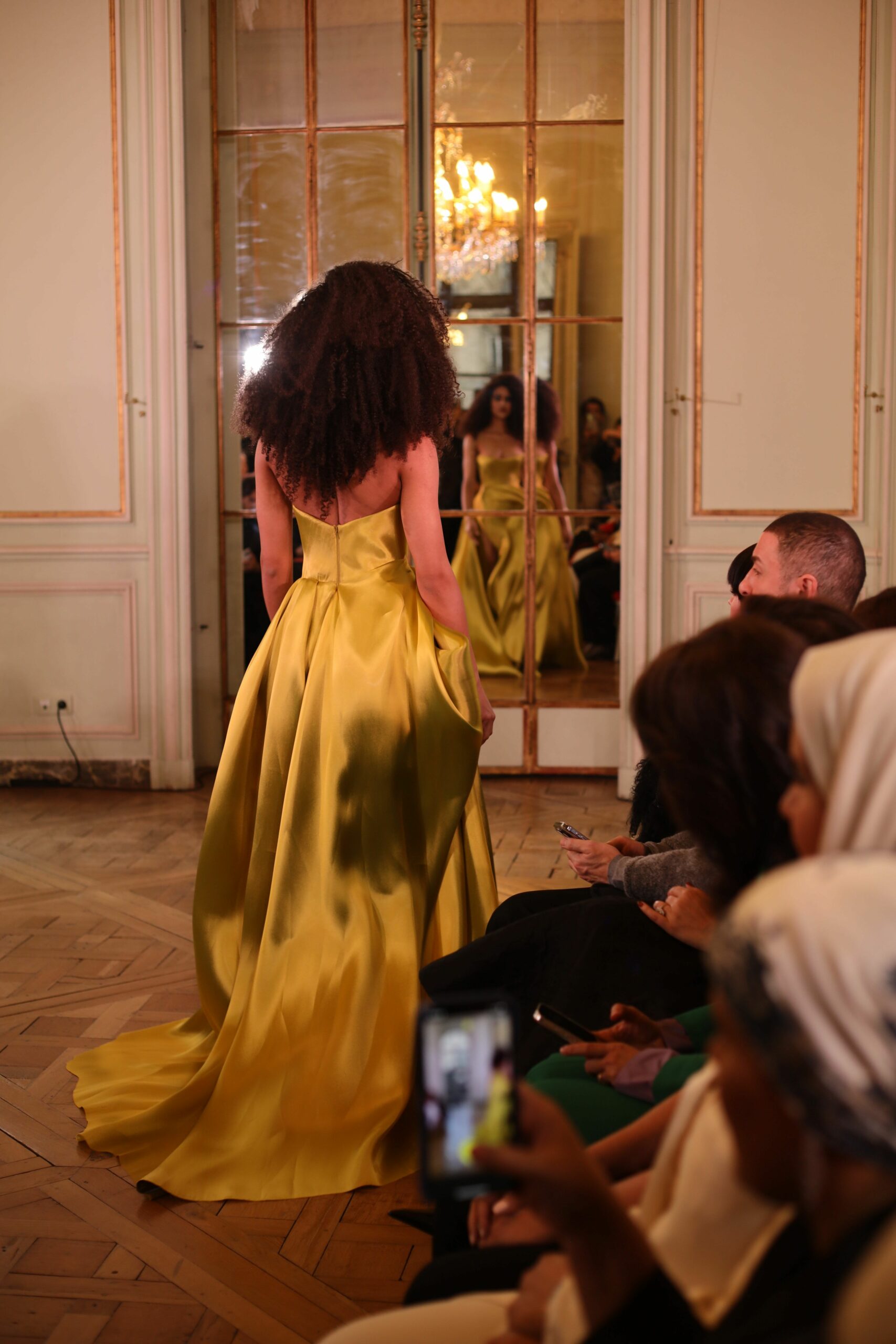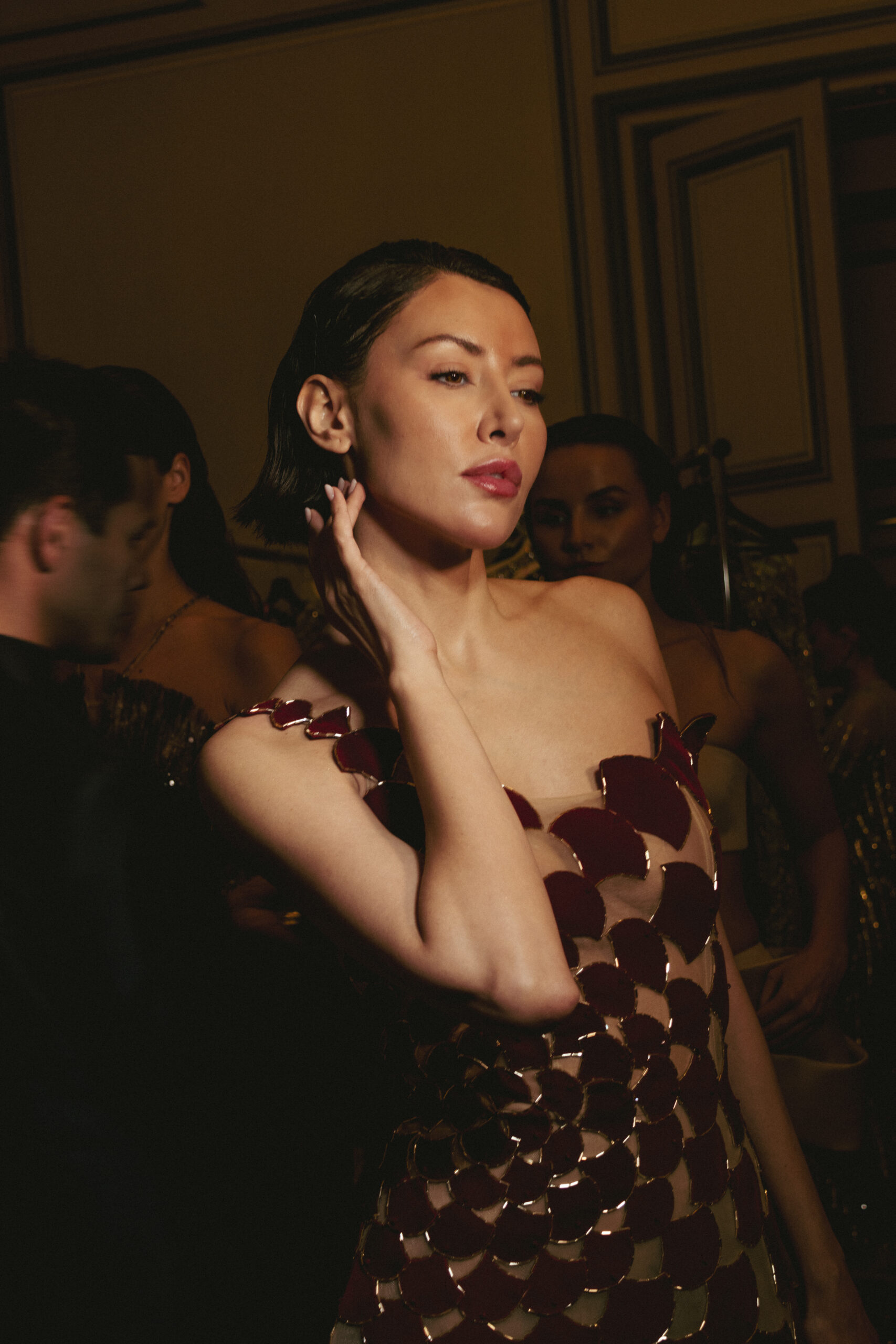 Laith Maalouf a enchanté l’audience avec sa collection inspirée des déesses, Amora: Une Symphonie de Structure et de Fluidité. Fusionnant design structuré et fluidité, chaque création rend hommage aux courbes gracieuses des statues de la Renaissance, incarnant l’essence divine de la déesse Amora à travers draperies aériennes et ornements dorés luxuriants.
