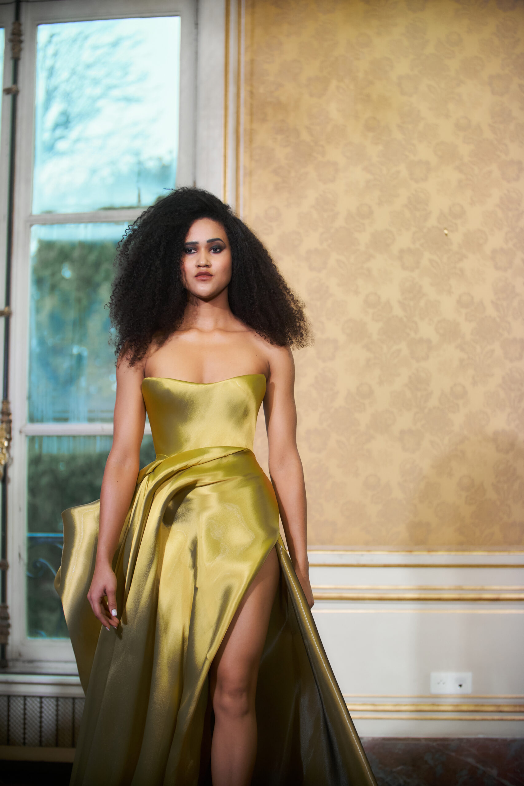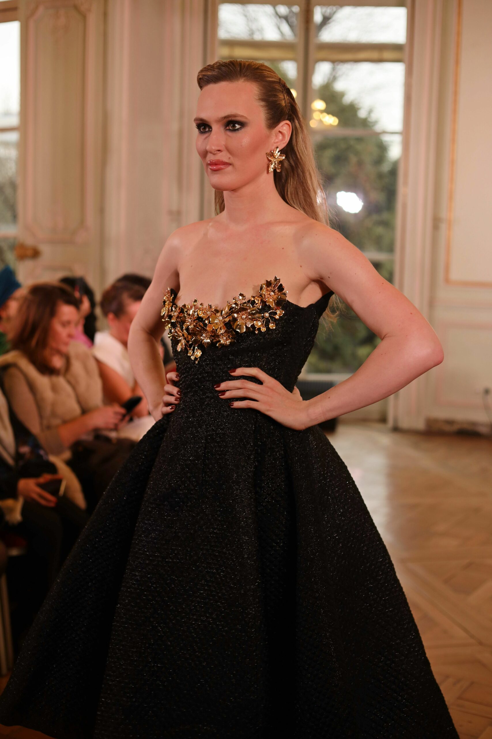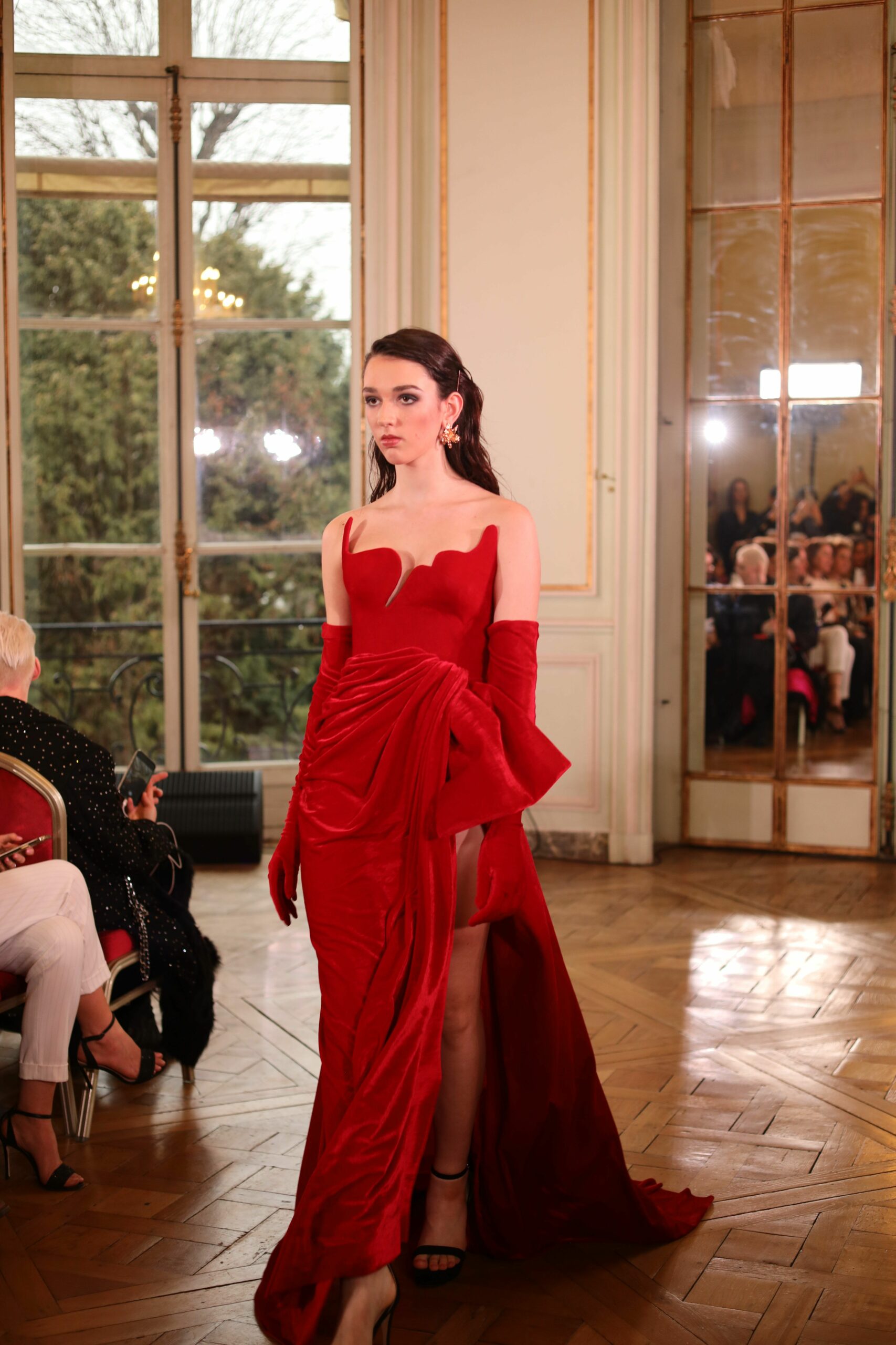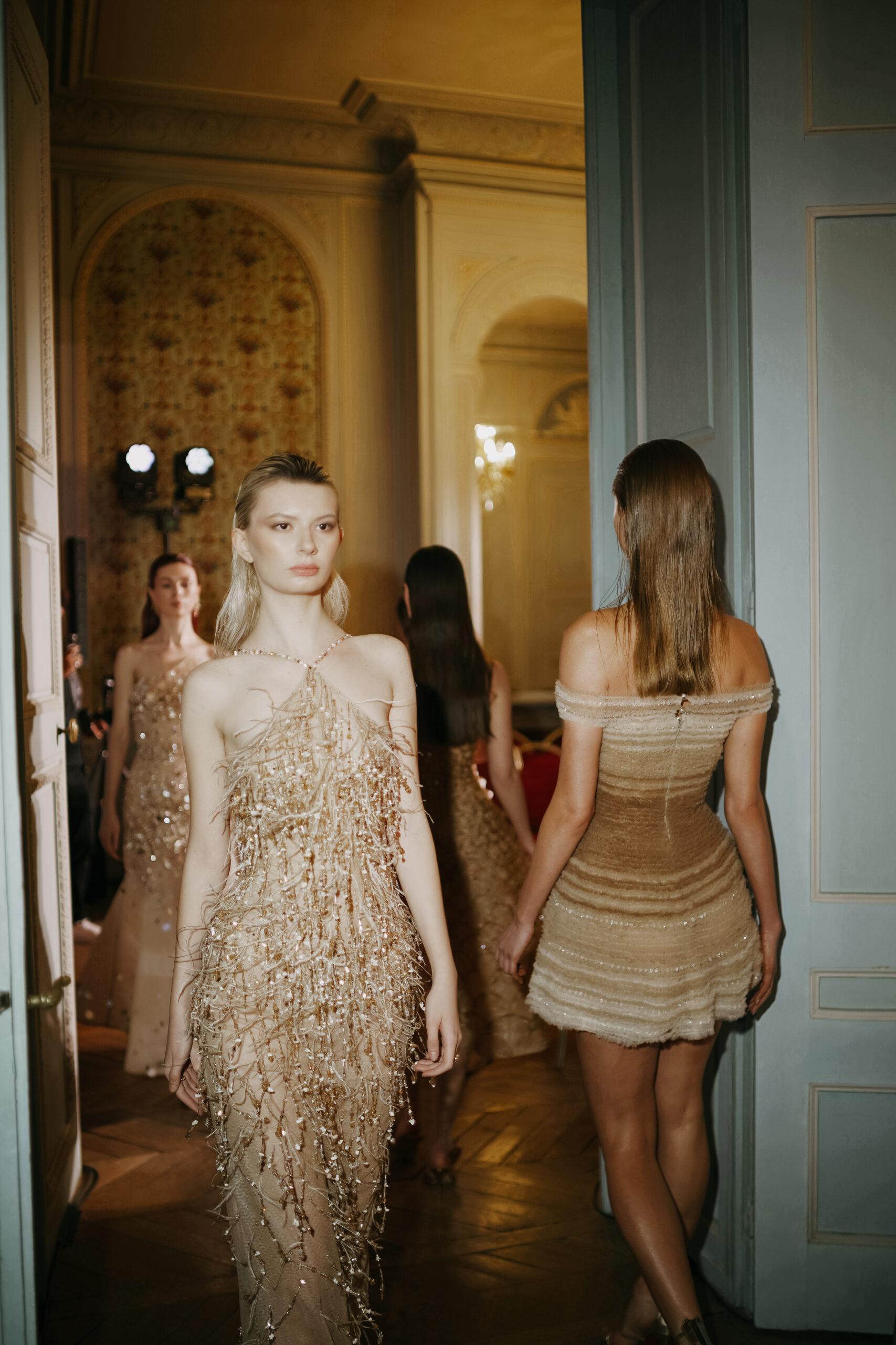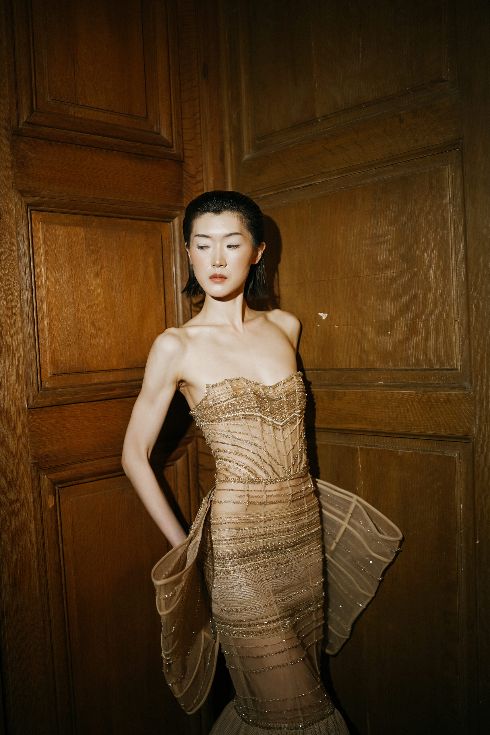 Laith Maalouf a enchanté l’audience avec sa collection inspirée des déesses, Amora: Une Symphonie de Structure et de Fluidité. Fusionnant design structuré et fluidité, chaque création rend hommage aux courbes gracieuses des statues de la Renaissance, incarnant l’essence divine de la déesse Amora à travers draperies aériennes et ornements dorés luxuriants.