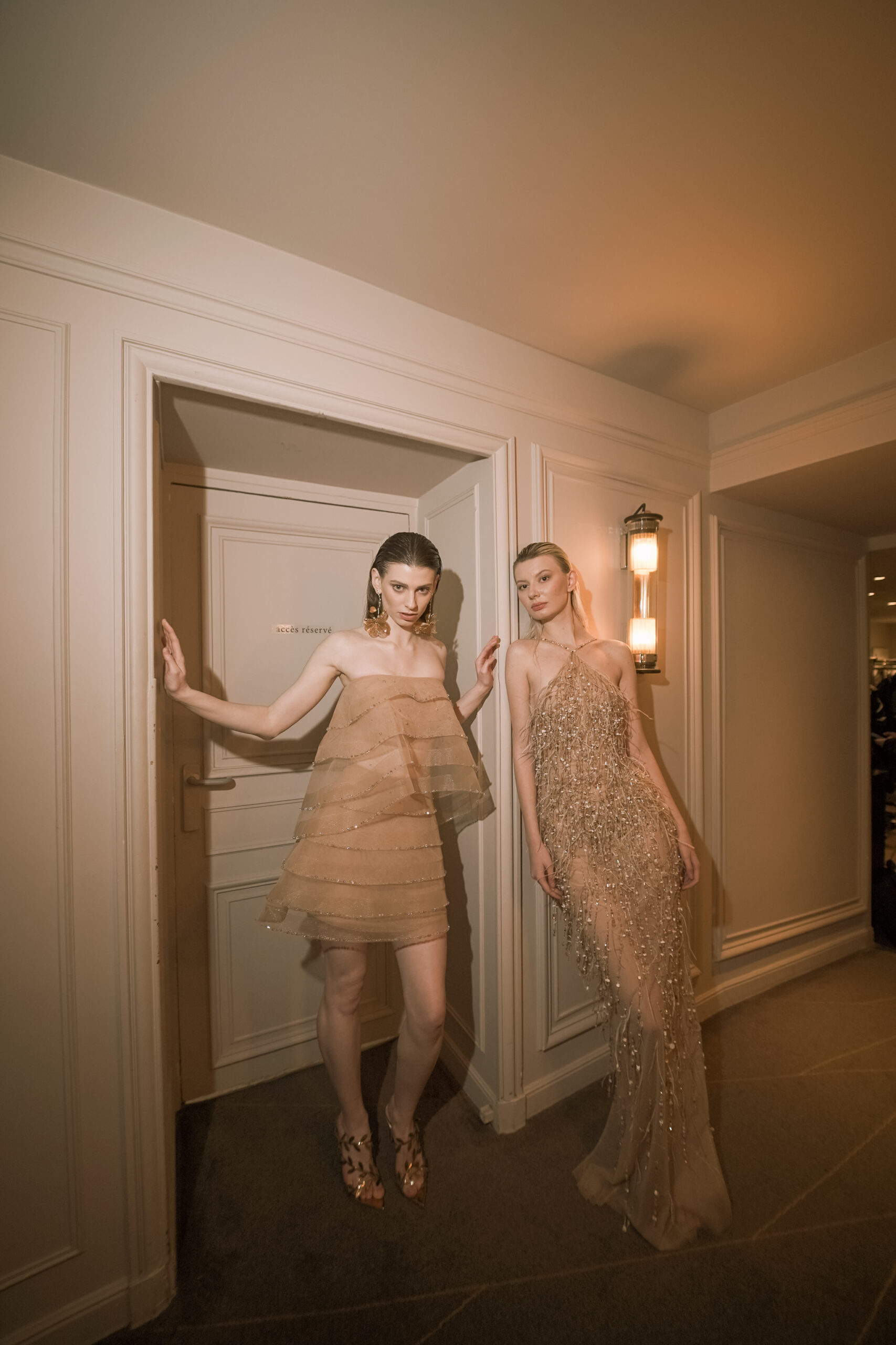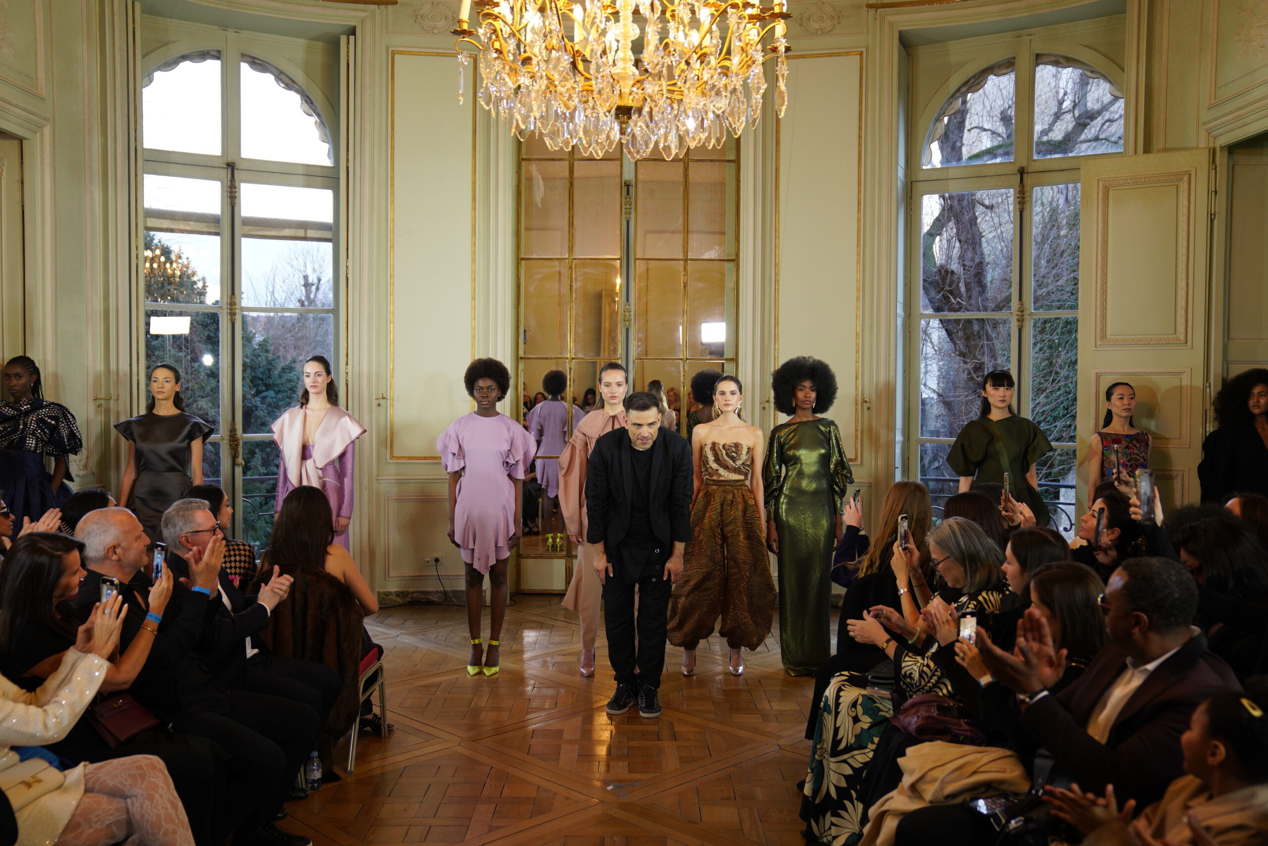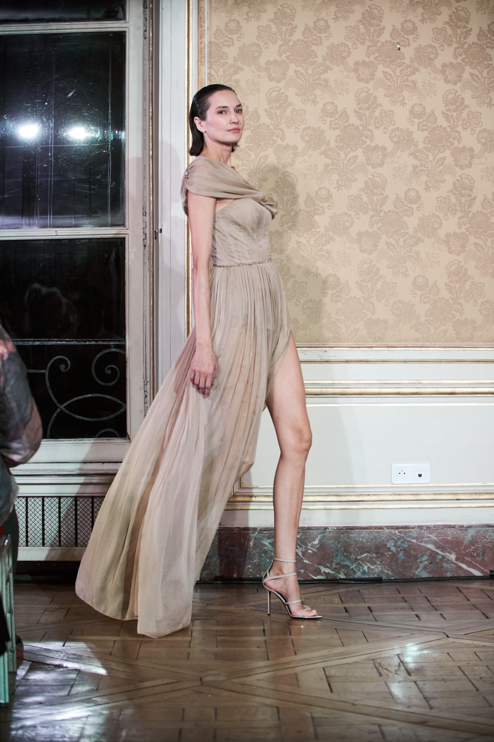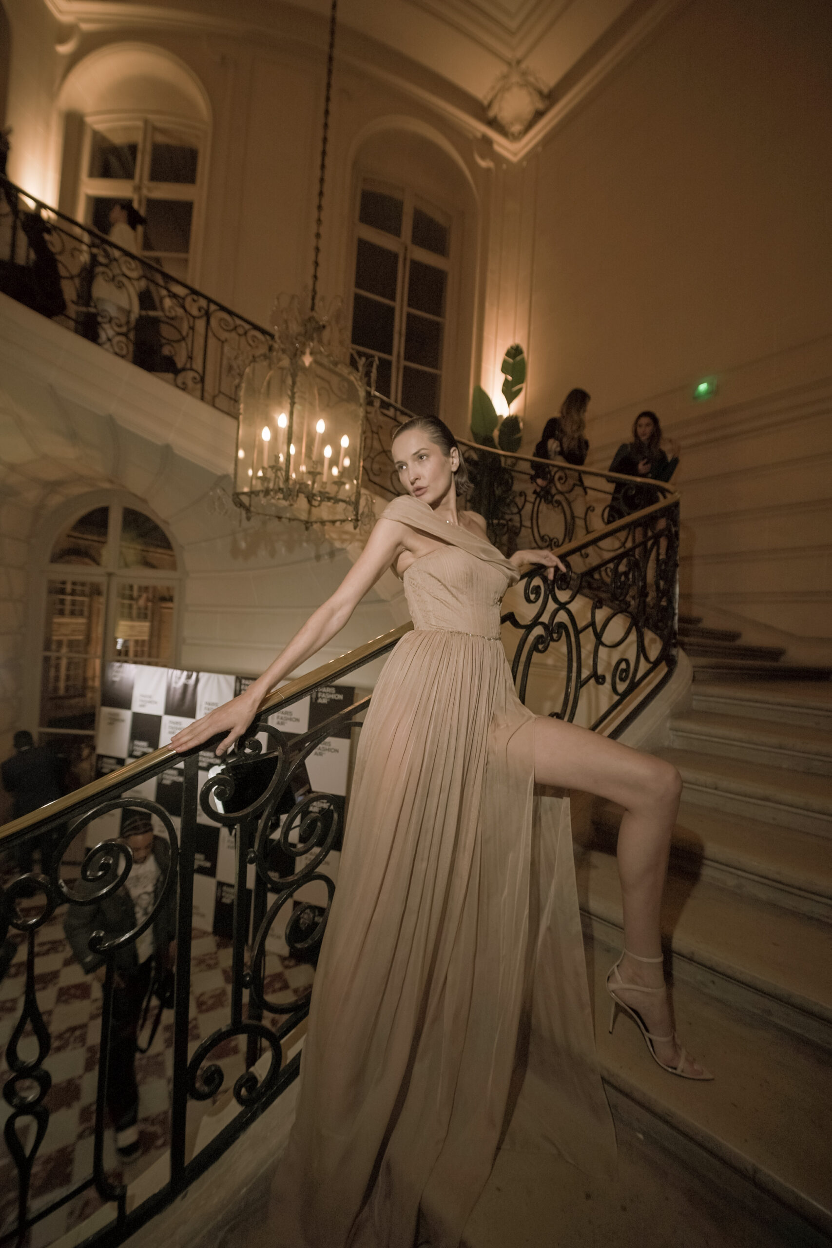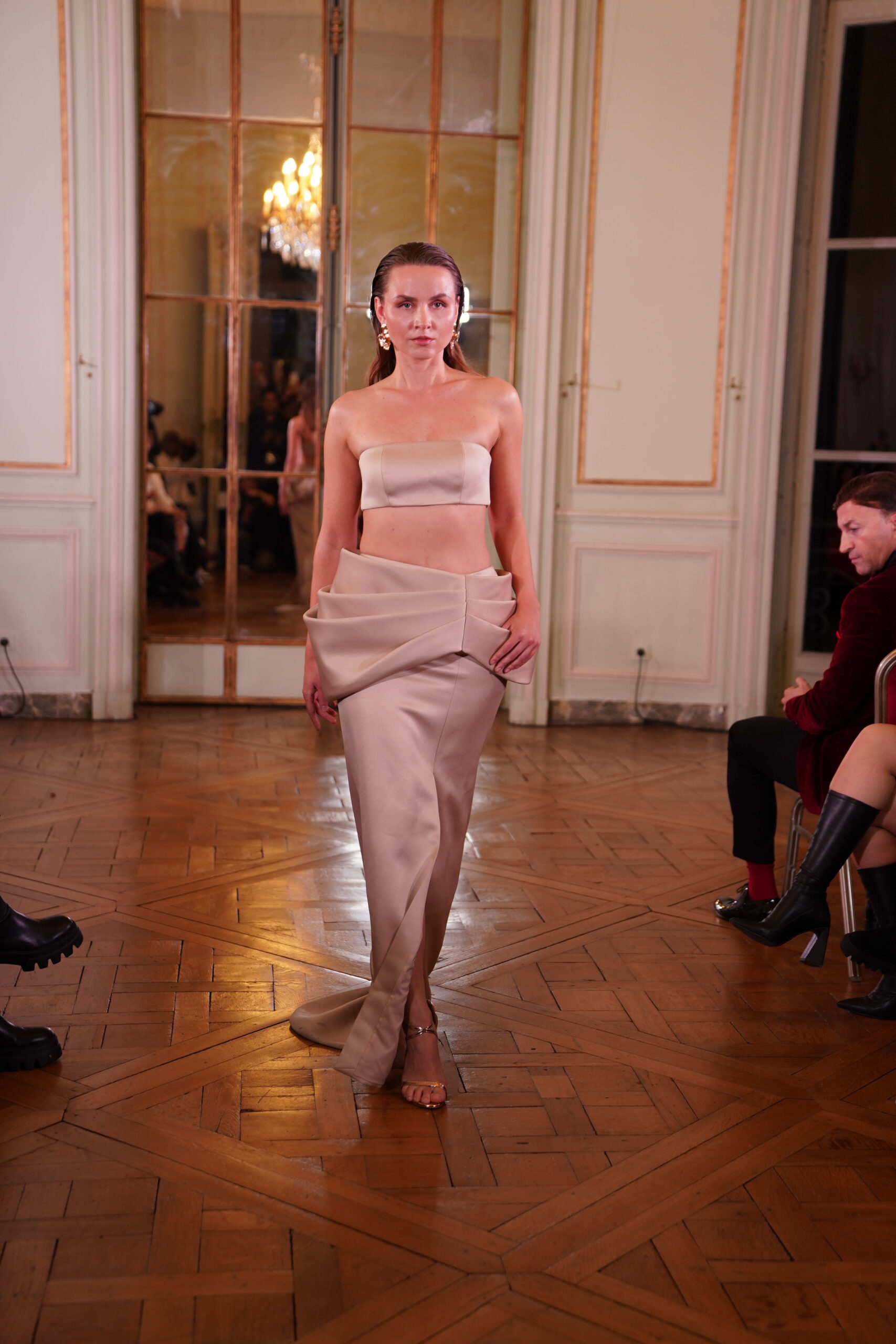 Laith Maalouf a enchanté l’audience avec sa collection inspirée des déesses, Amora: Une Symphonie de Structure et de Fluidité. Fusionnant design structuré et fluidité, chaque création rend hommage aux courbes gracieuses des statues de la Renaissance, incarnant l’essence divine de la déesse Amora à travers draperies aériennes et ornements dorés luxuriants.