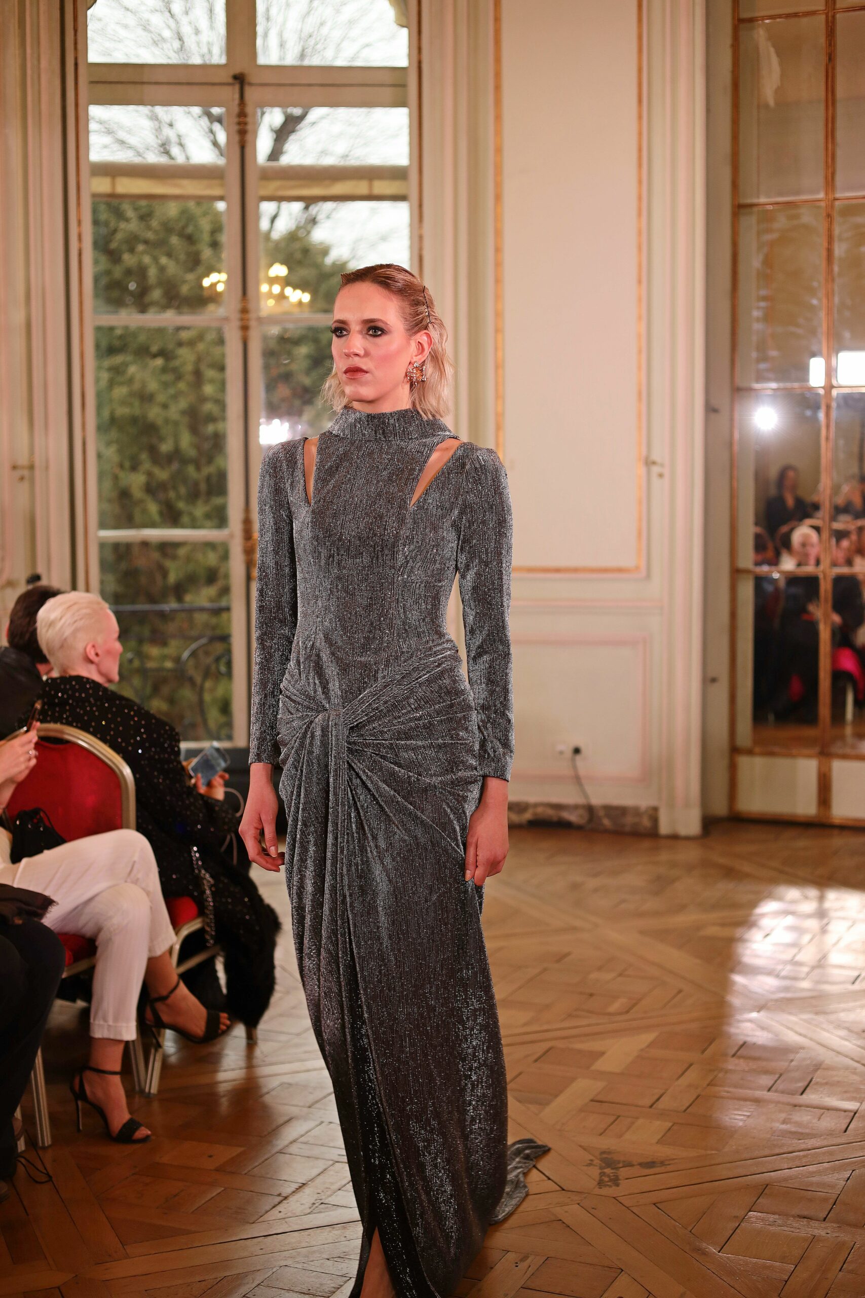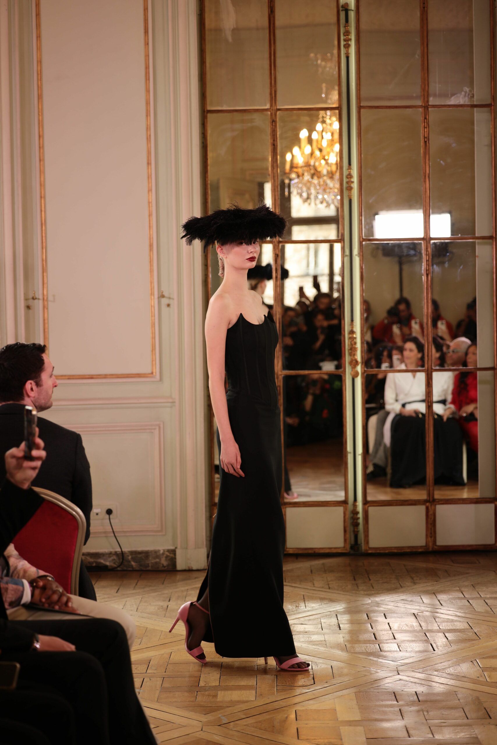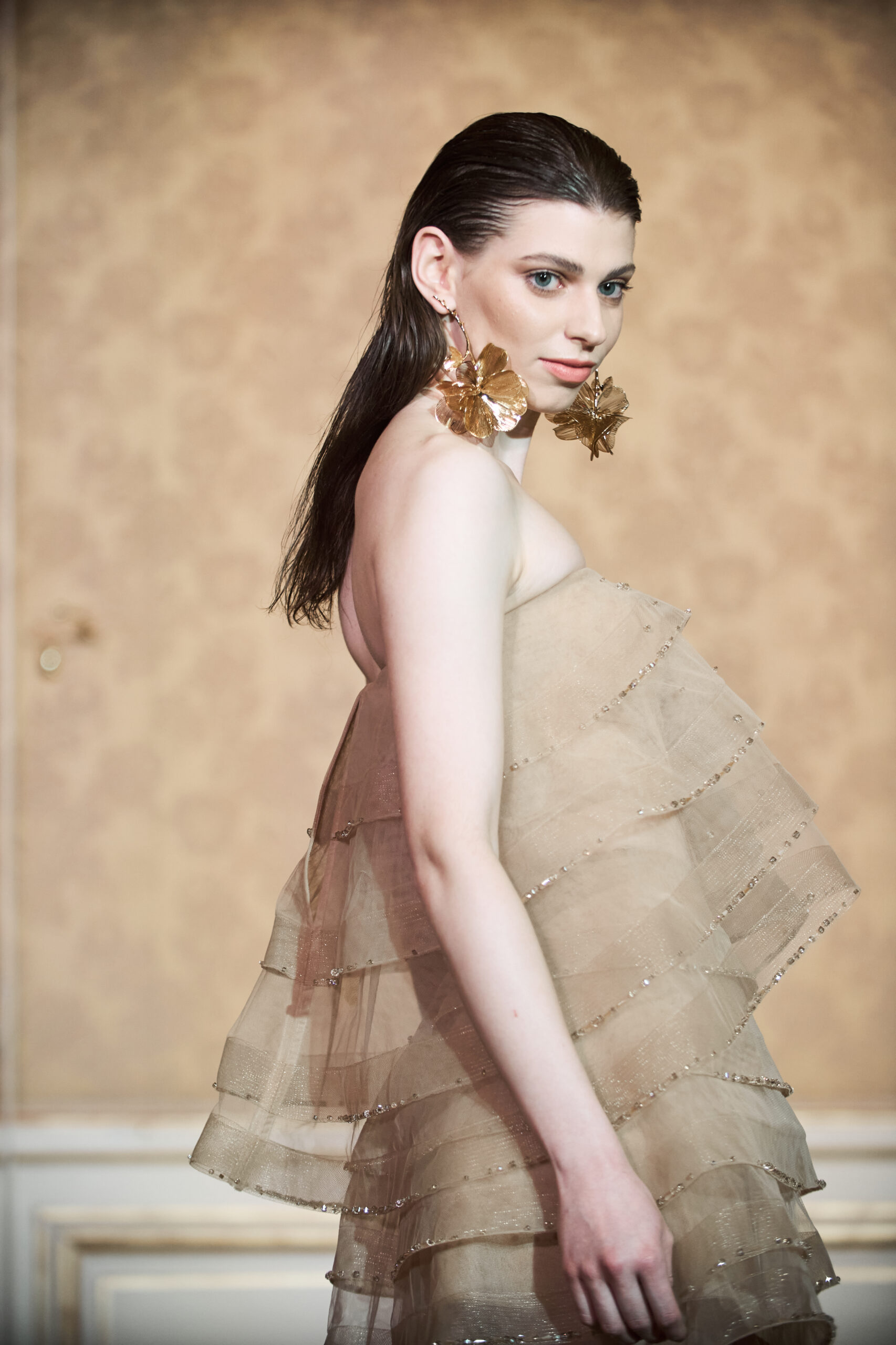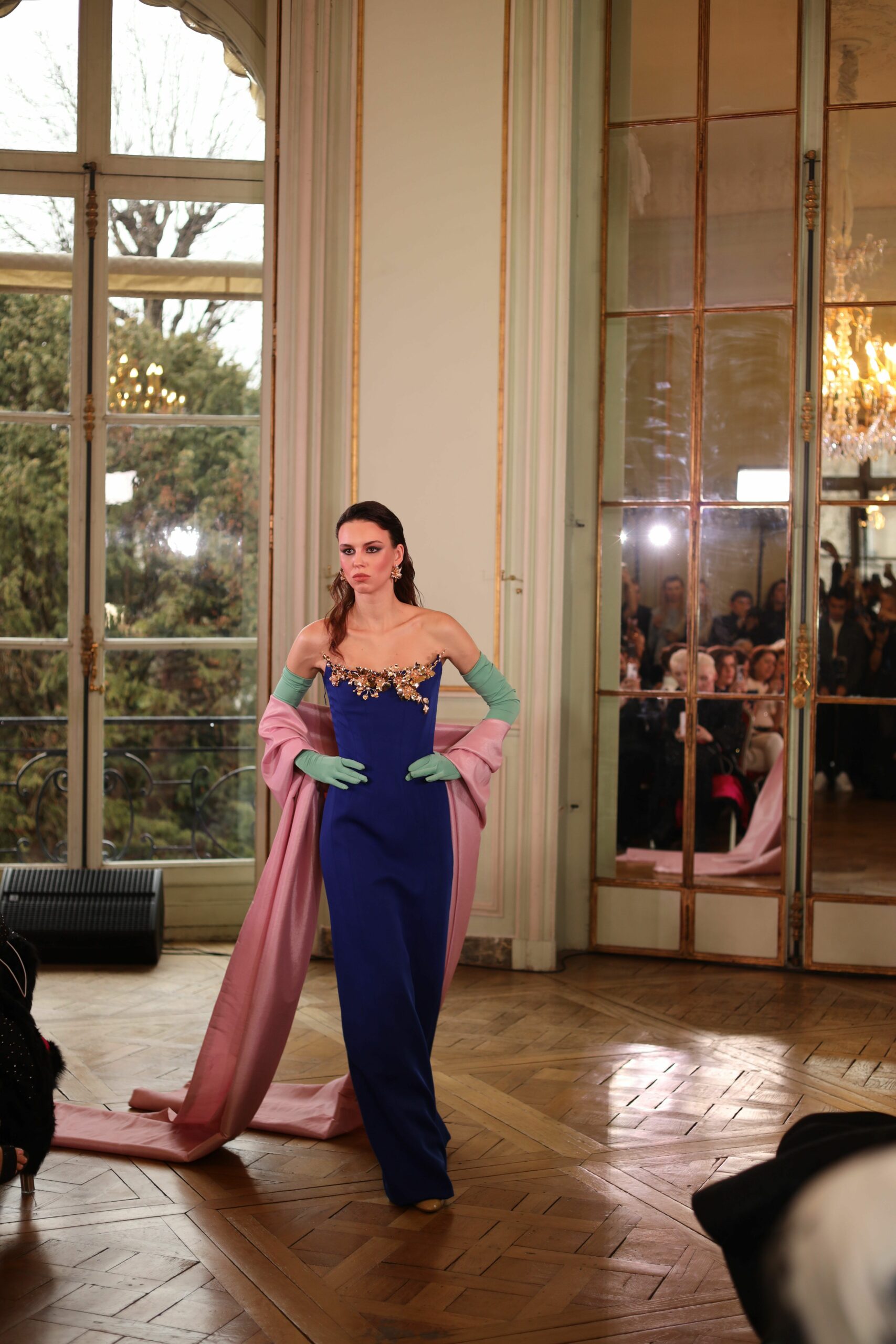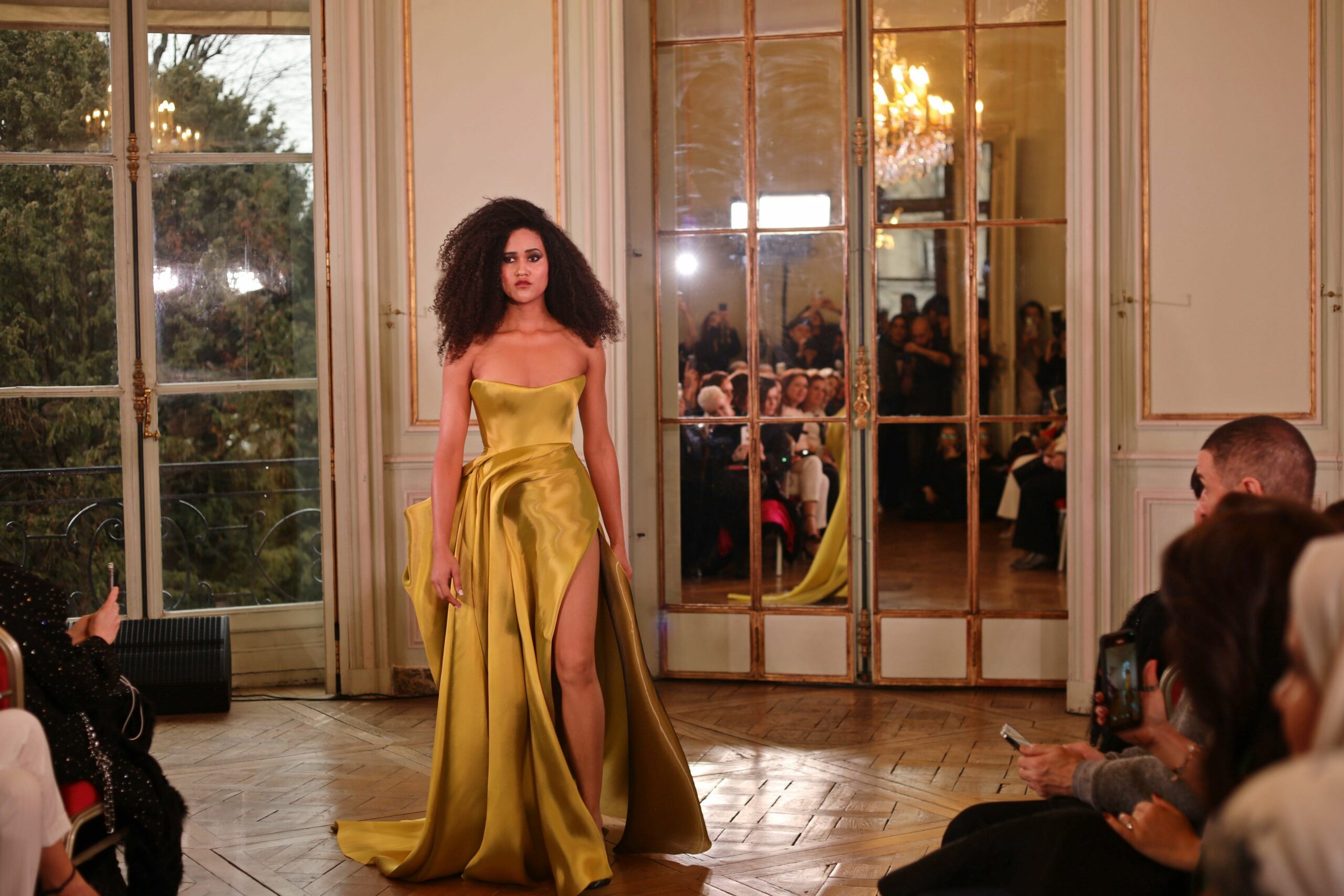 Laith Maalouf a enchanté l’audience avec sa collection inspirée des déesses, Amora: Une Symphonie de Structure et de Fluidité. Fusionnant design structuré et fluidité, chaque création rend hommage aux courbes gracieuses des statues de la Renaissance, incarnant l’essence divine de la déesse Amora à travers draperies aériennes et ornements dorés luxuriants.