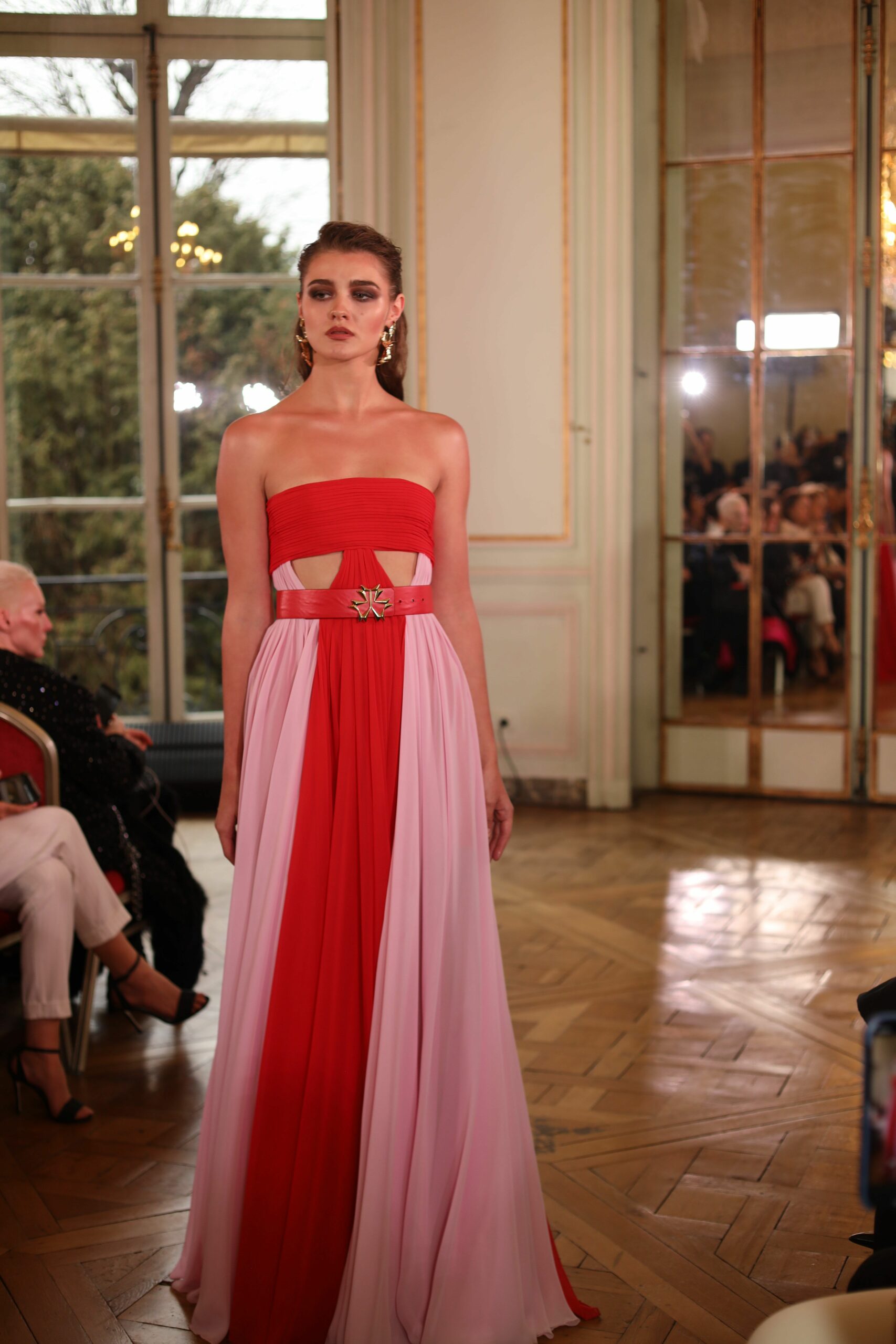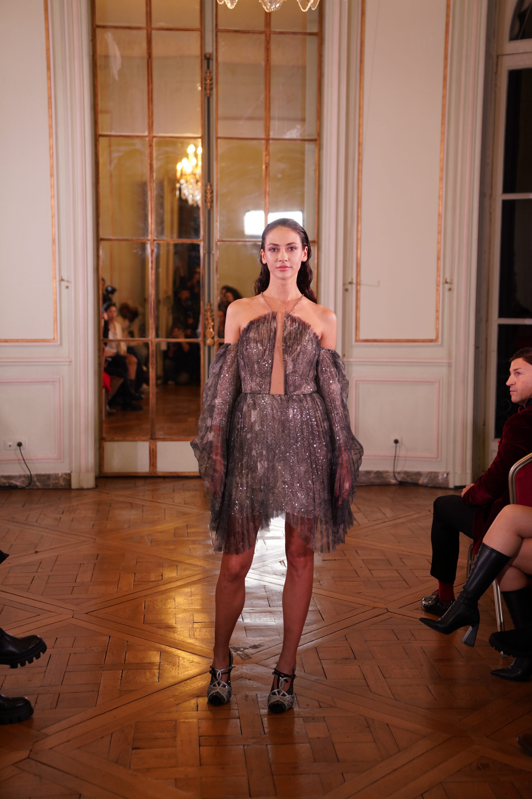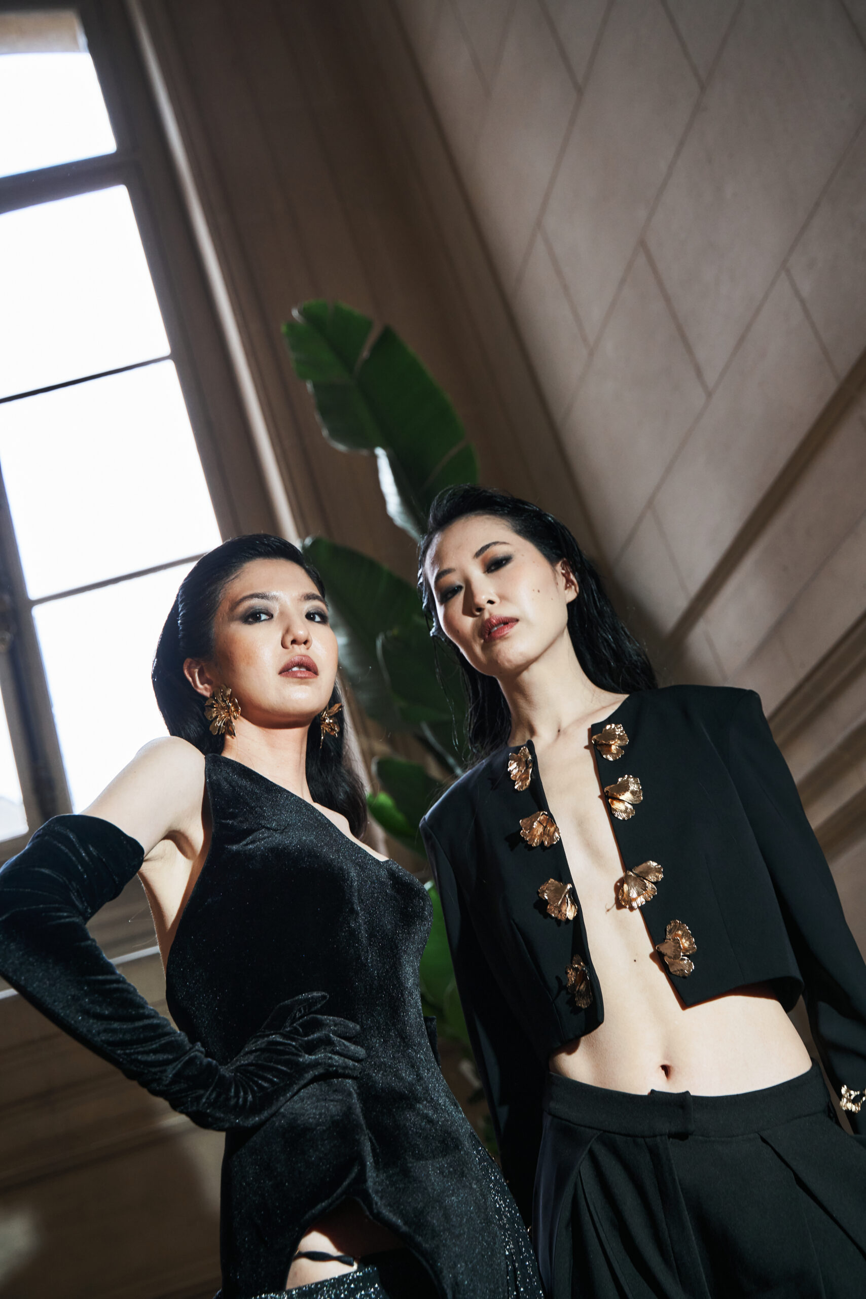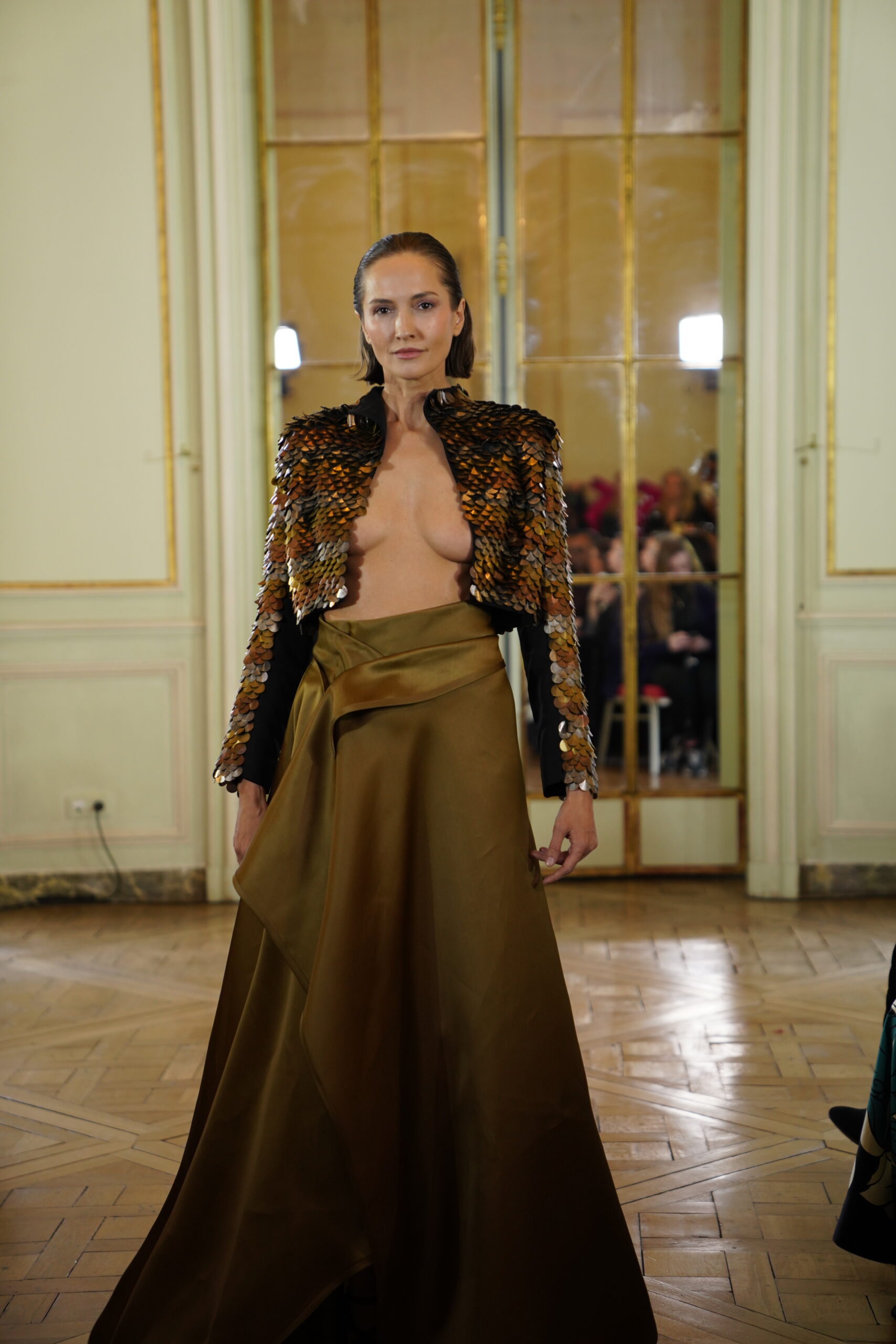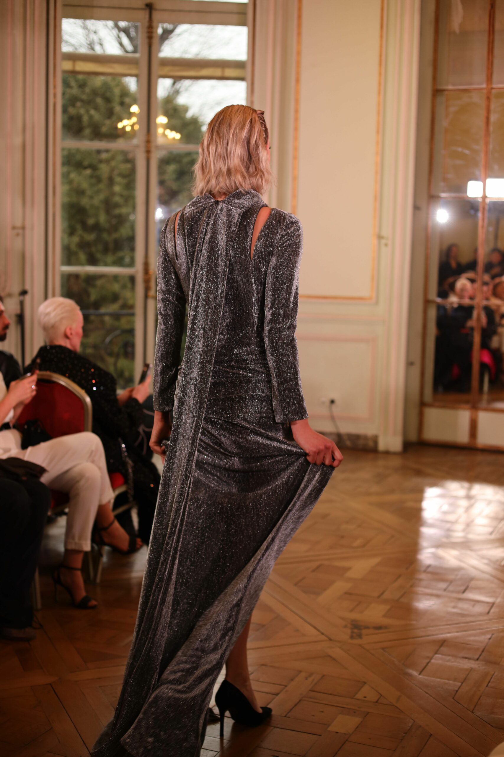 Laith Maalouf a enchanté l’audience avec sa collection inspirée des déesses, Amora: Une Symphonie de Structure et de Fluidité. Fusionnant design structuré et fluidité, chaque création rend hommage aux courbes gracieuses des statues de la Renaissance, incarnant l’essence divine de la déesse Amora à travers draperies aériennes et ornements dorés luxuriants.
