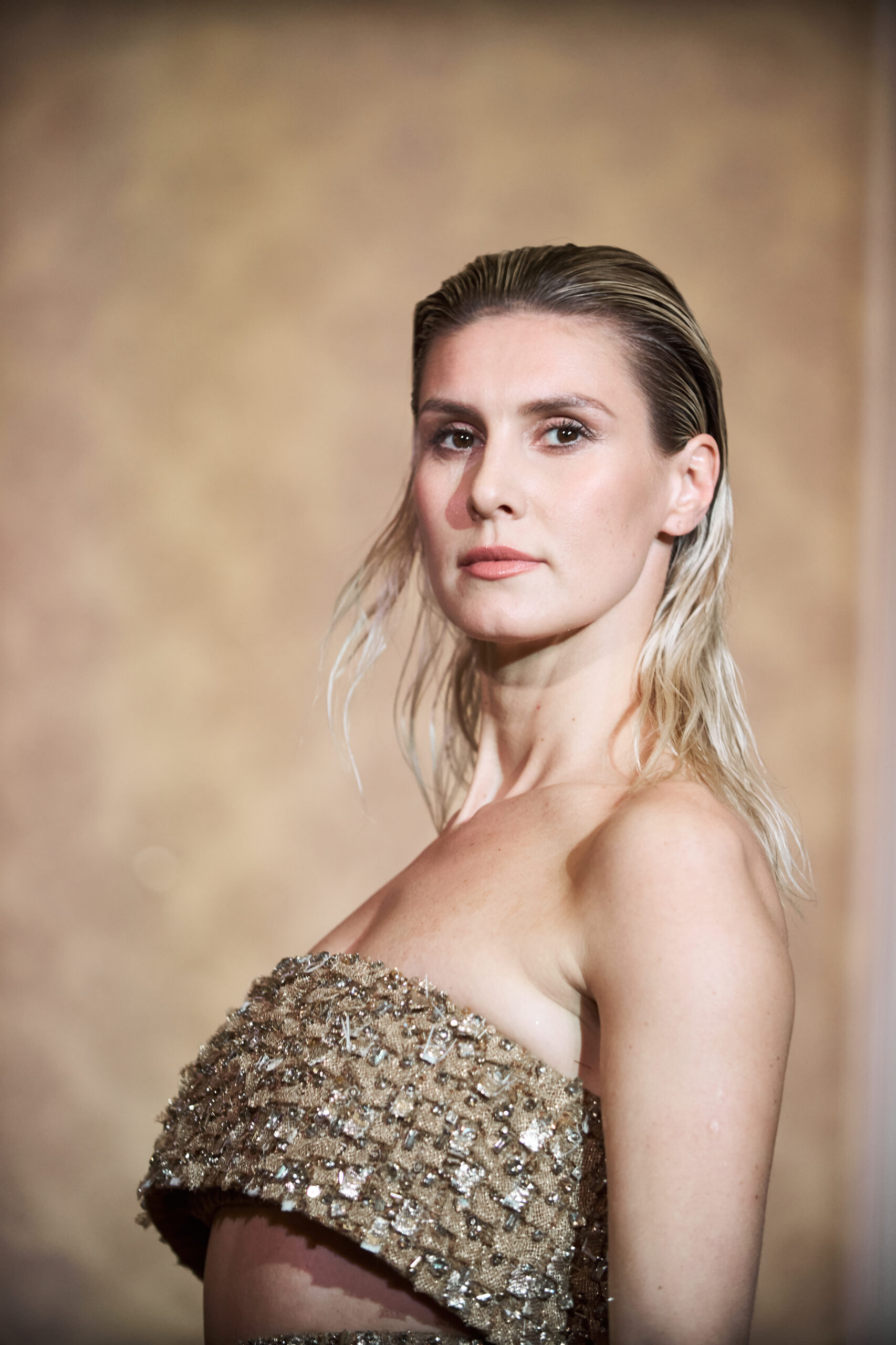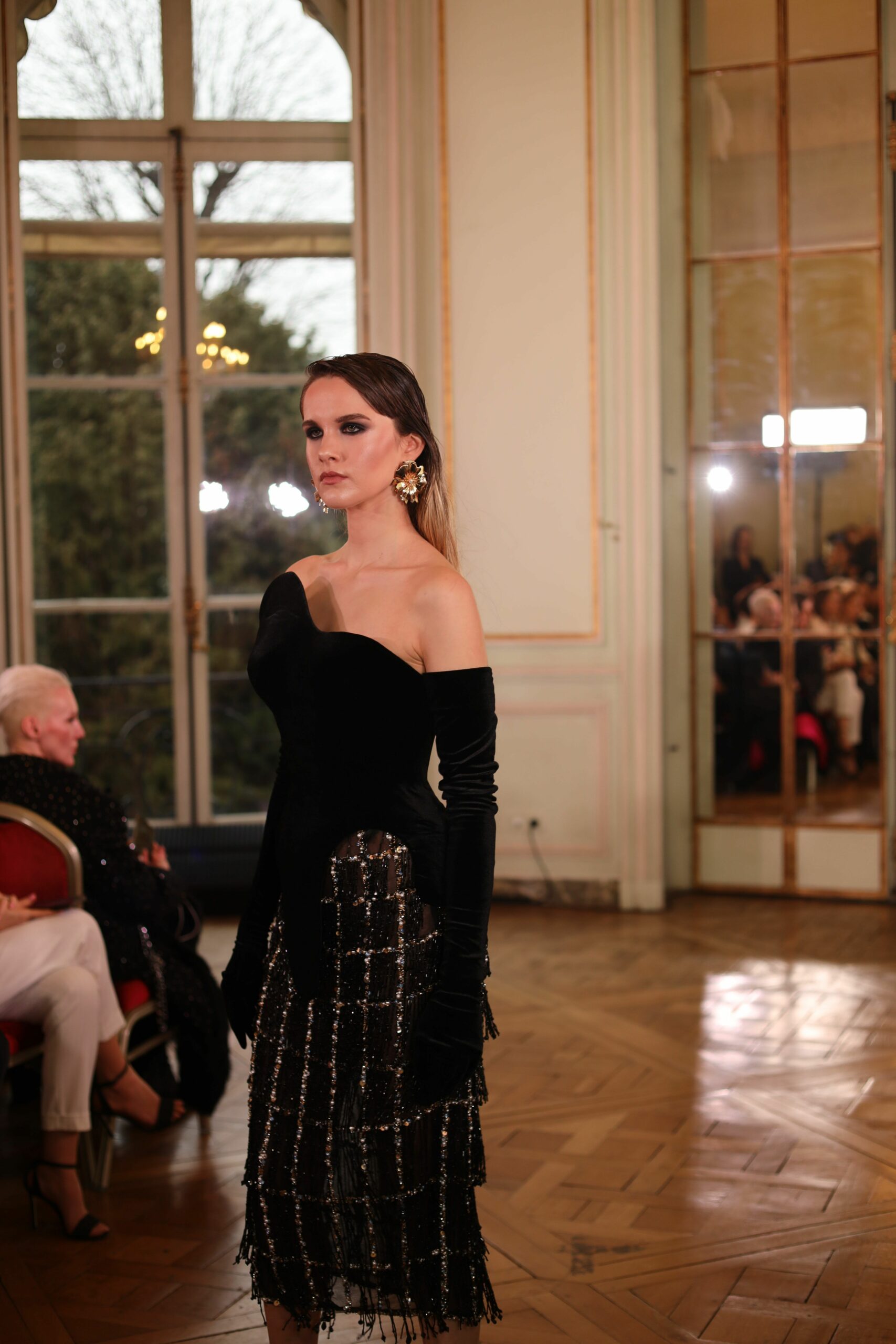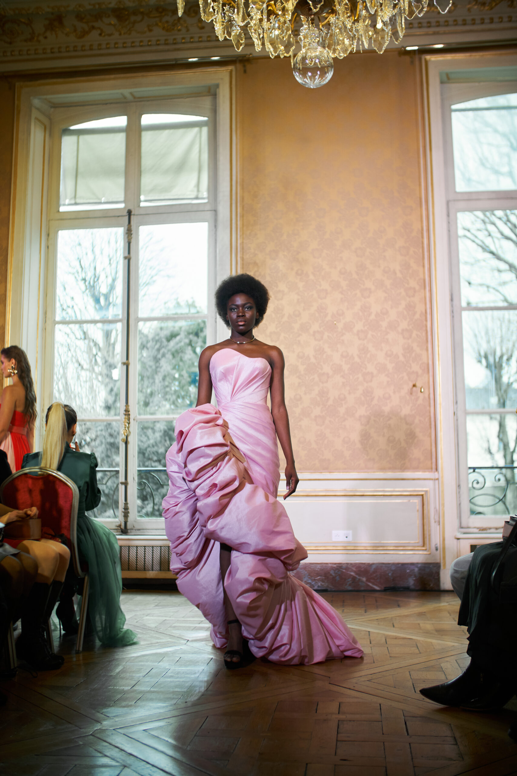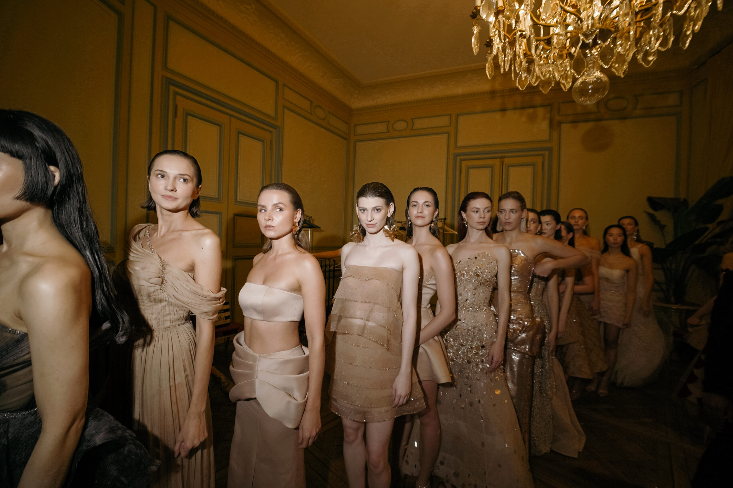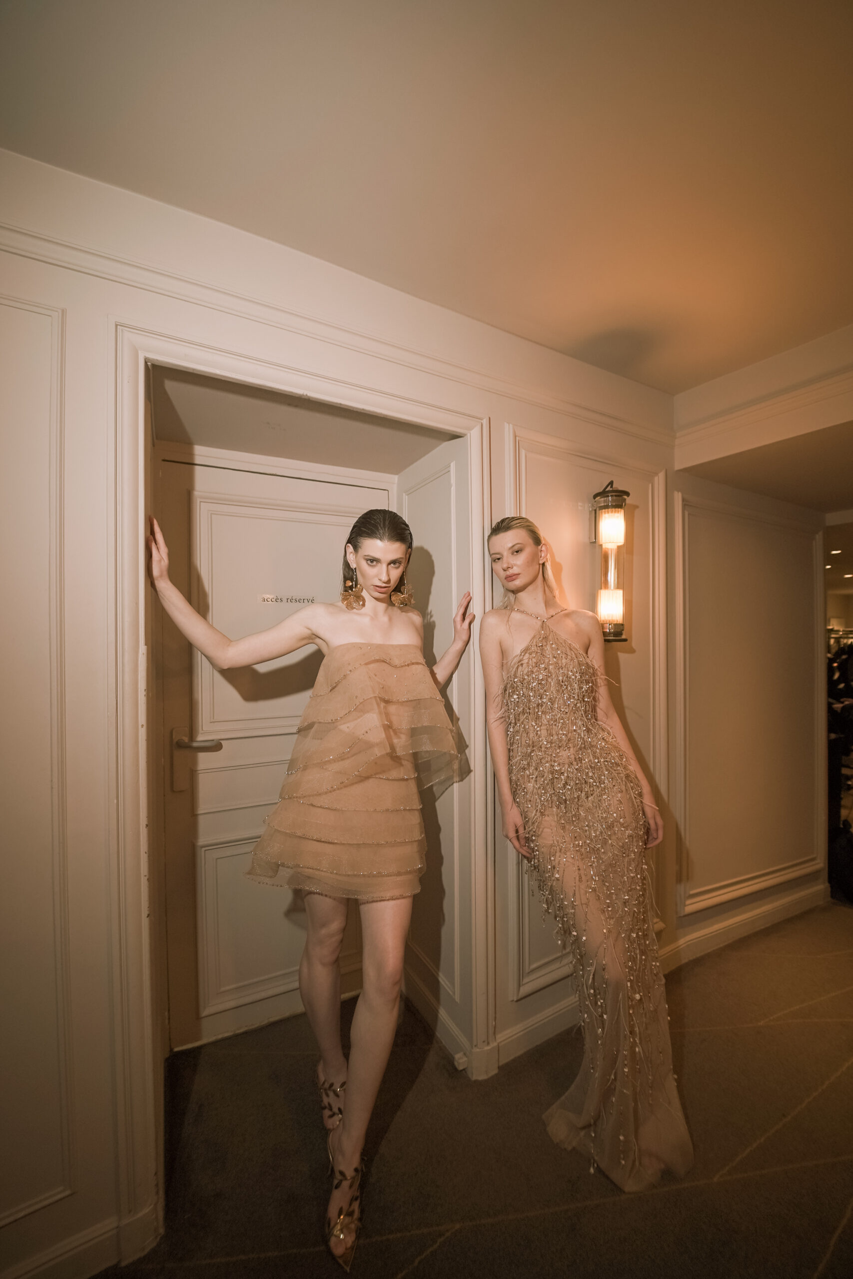 Laith Maalouf a enchanté l’audience avec sa collection inspirée des déesses, Amora: Une Symphonie de Structure et de Fluidité. Fusionnant design structuré et fluidité, chaque création rend hommage aux courbes gracieuses des statues de la Renaissance, incarnant l’essence divine de la déesse Amora à travers draperies aériennes et ornements dorés luxuriants.
