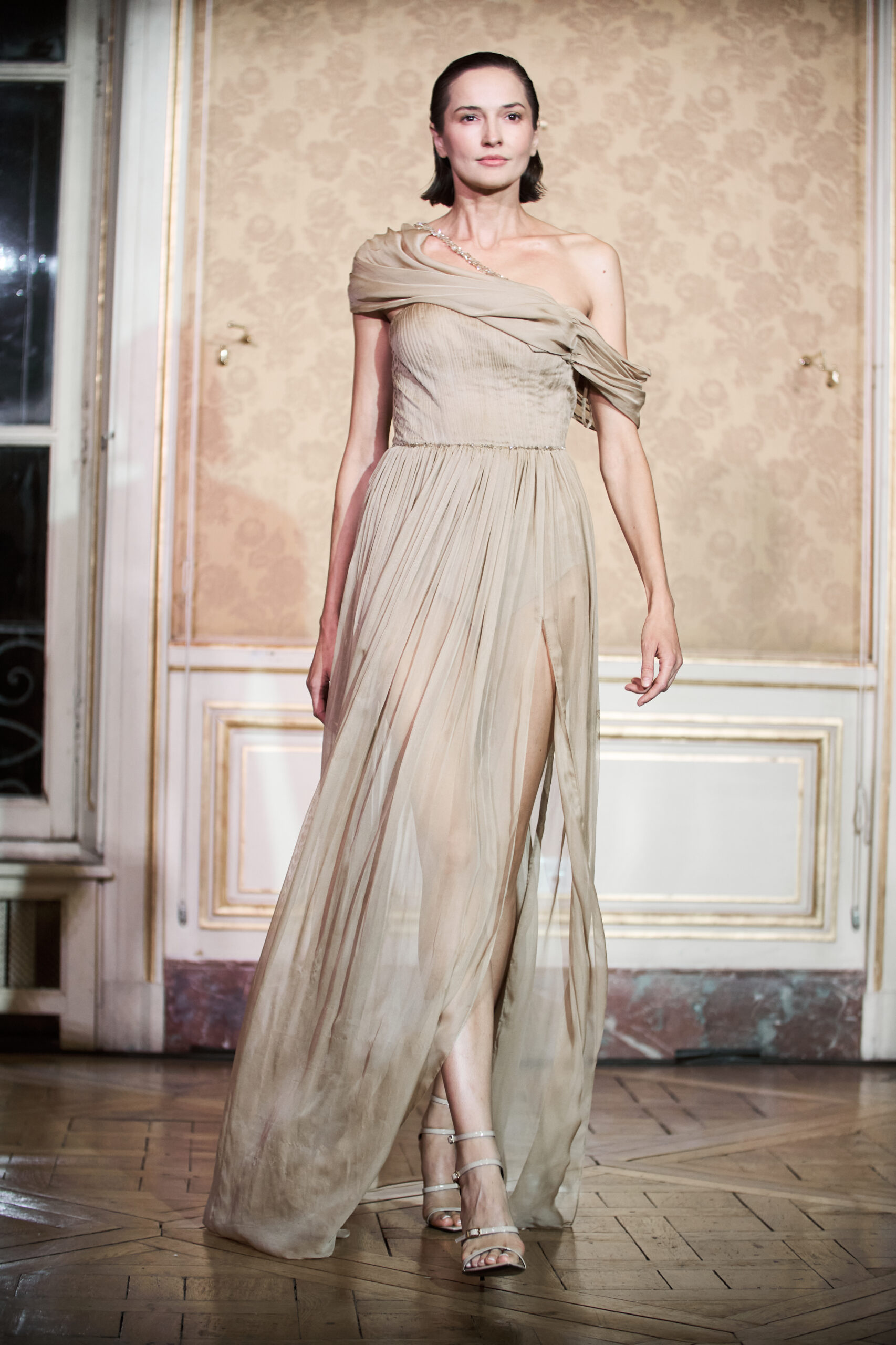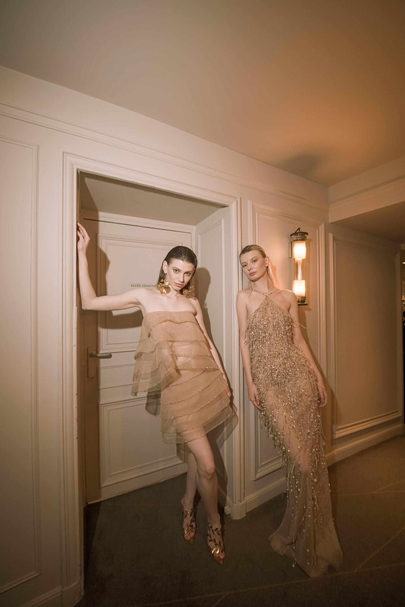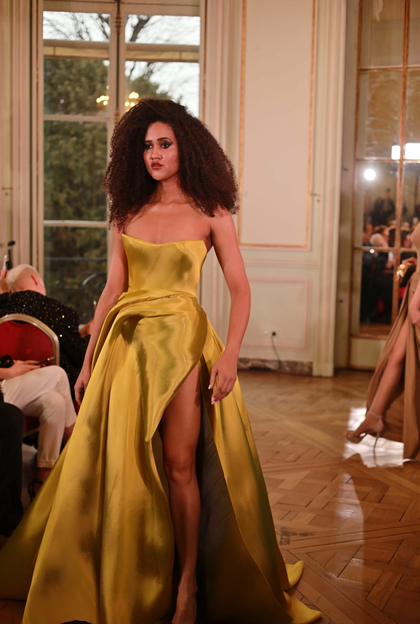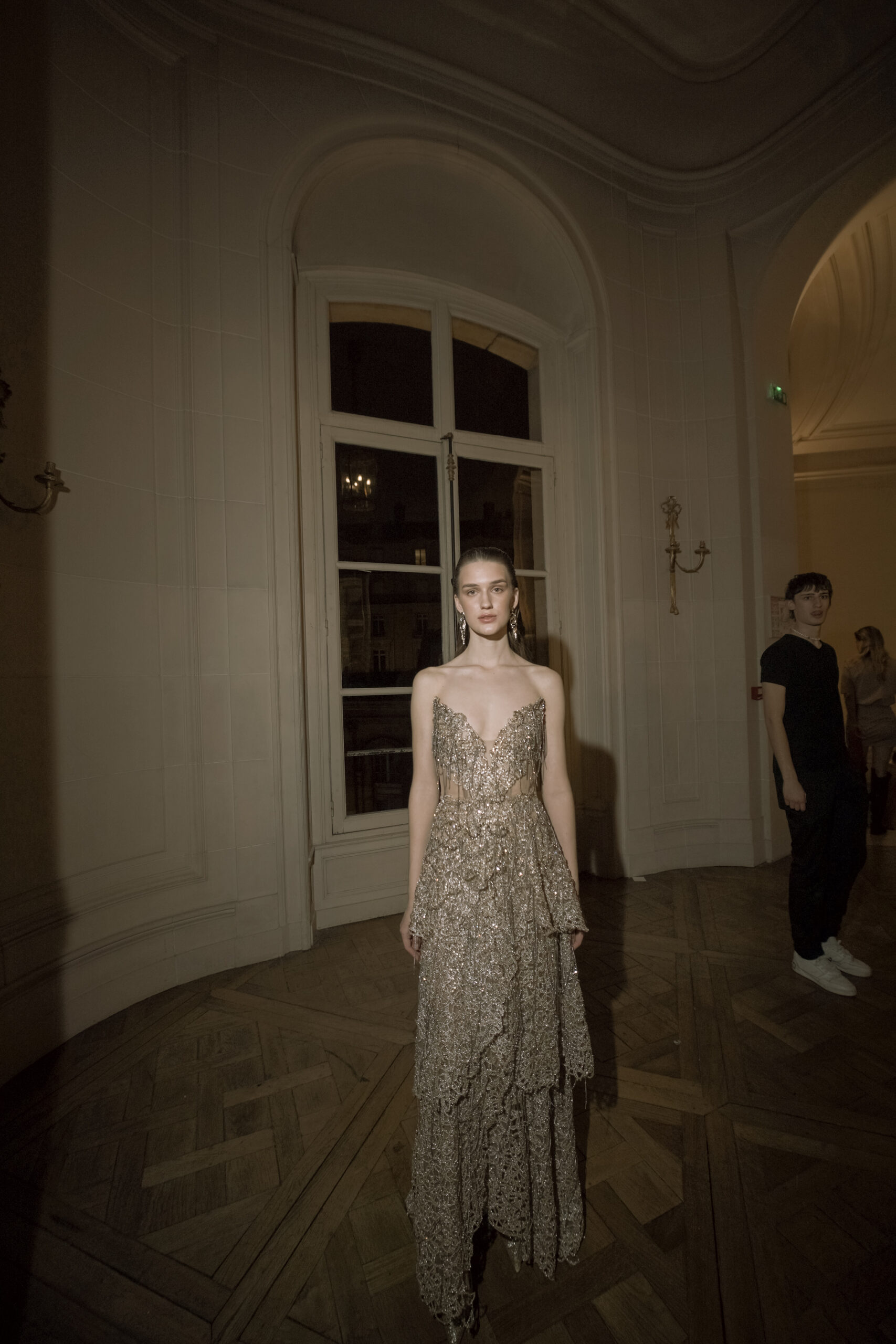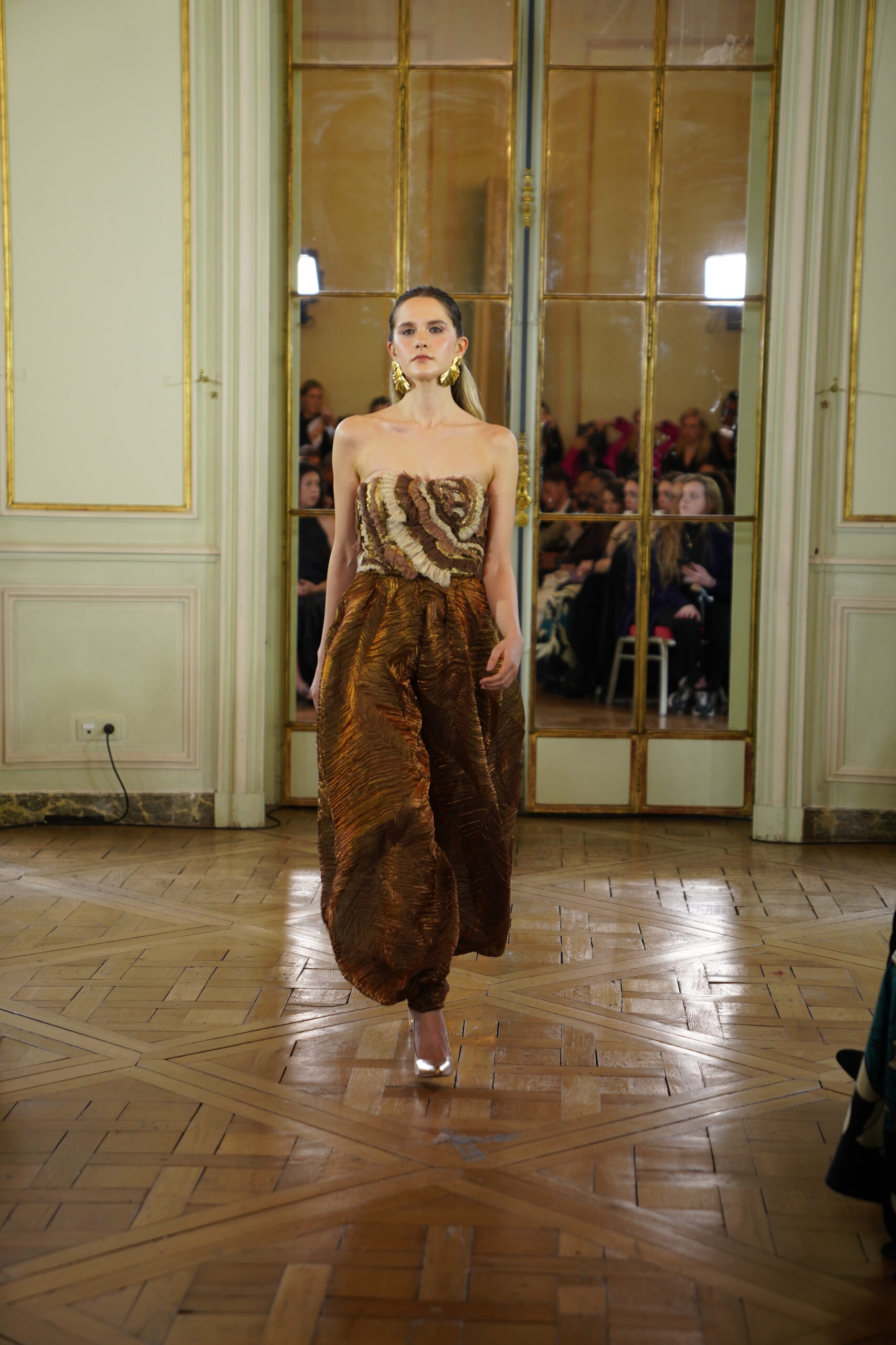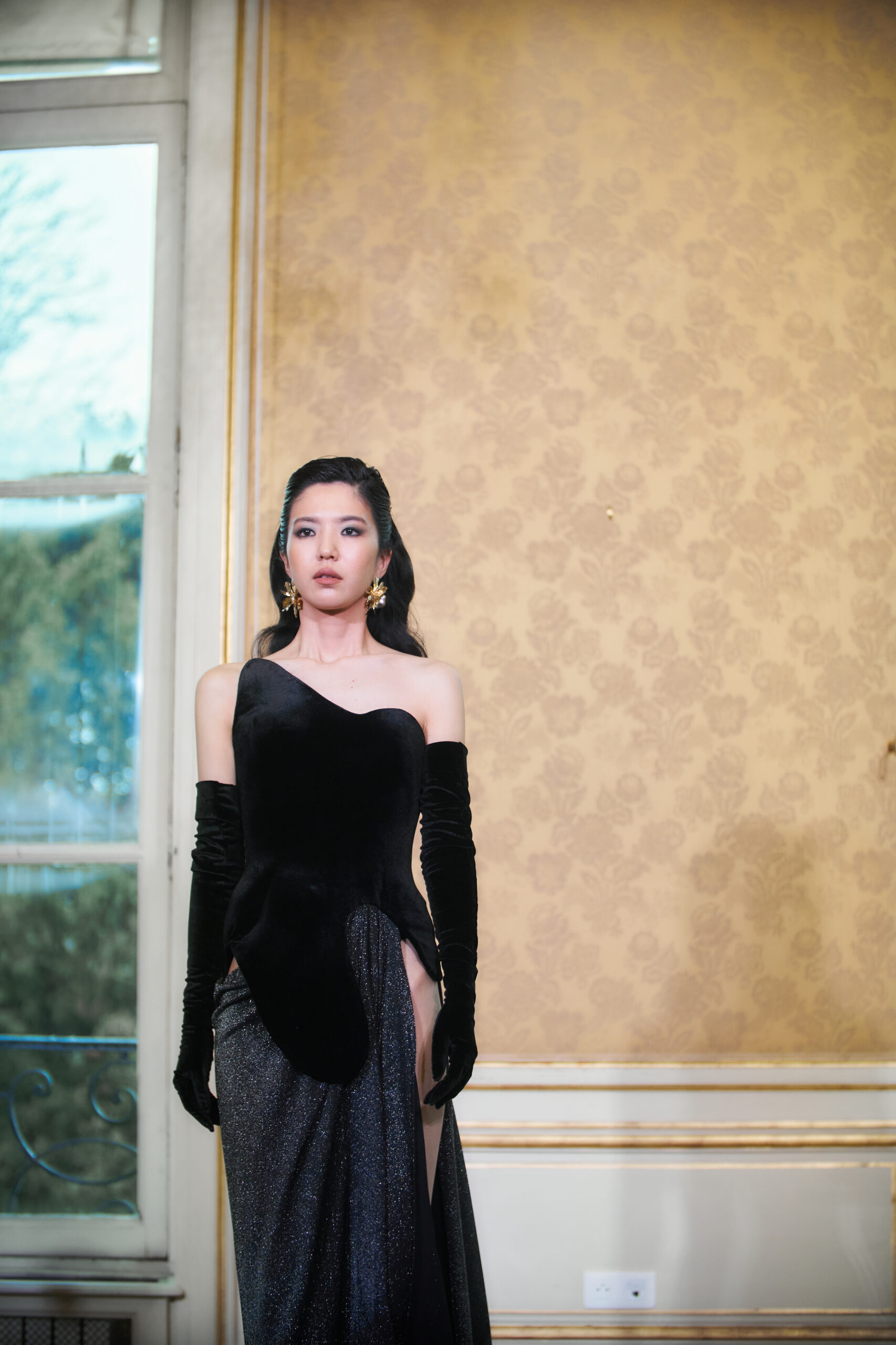 Laith Maalouf a enchanté l’audience avec sa collection inspirée des déesses, Amora: Une Symphonie de Structure et de Fluidité. Fusionnant design structuré et fluidité, chaque création rend hommage aux courbes gracieuses des statues de la Renaissance, incarnant l’essence divine de la déesse Amora à travers draperies aériennes et ornements dorés luxuriants.