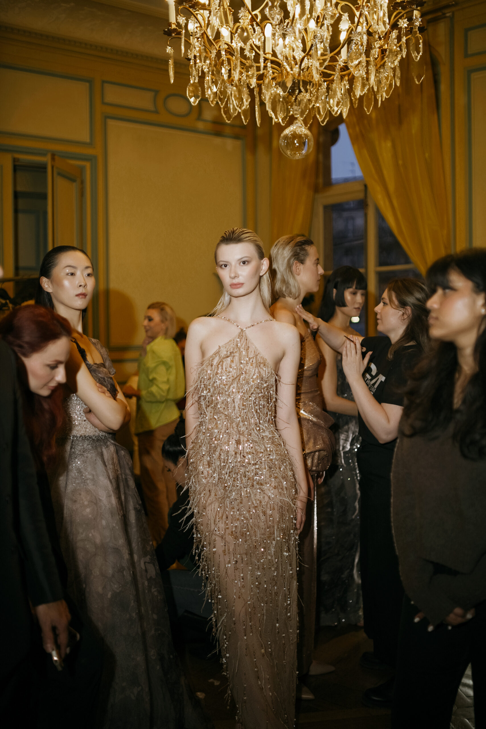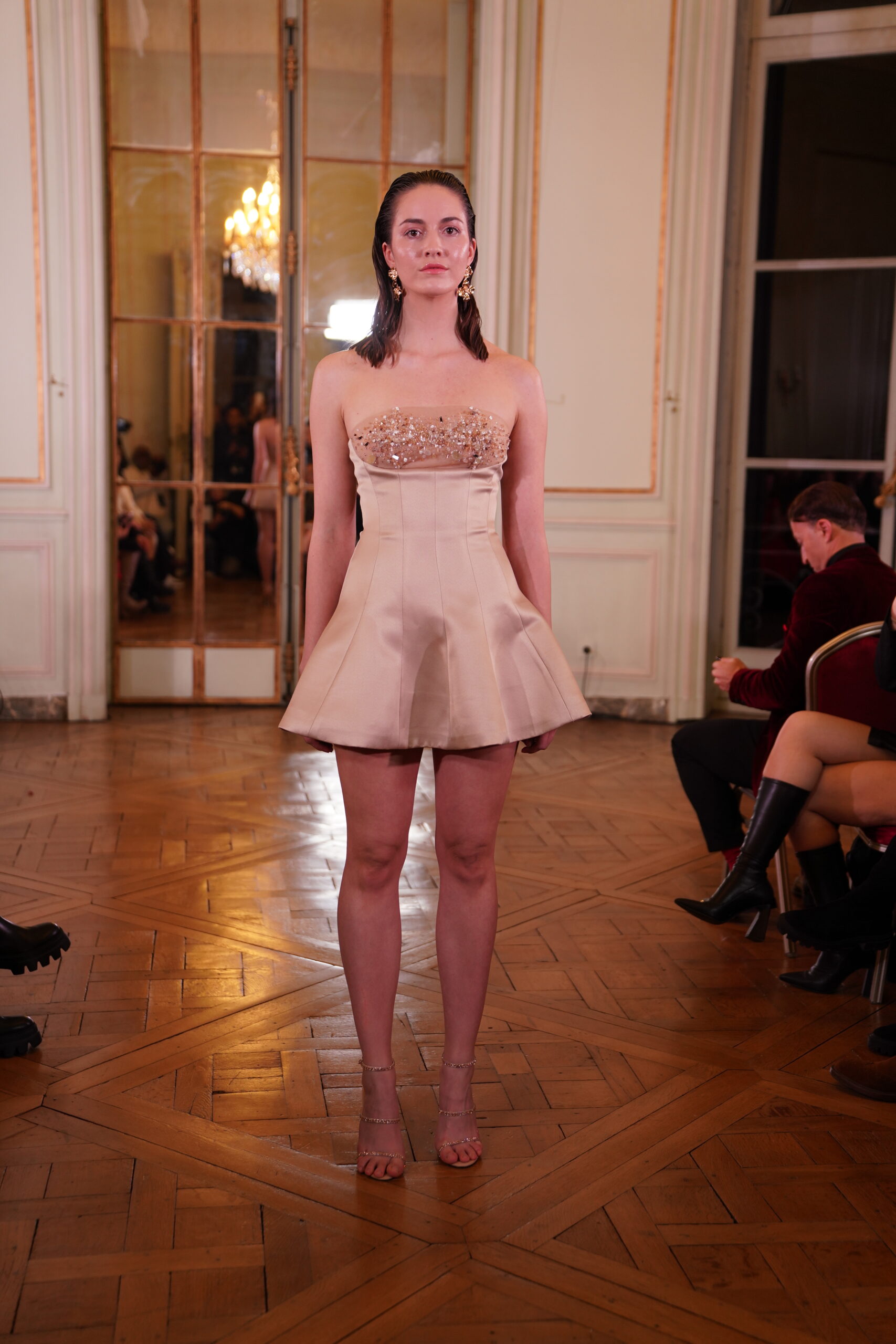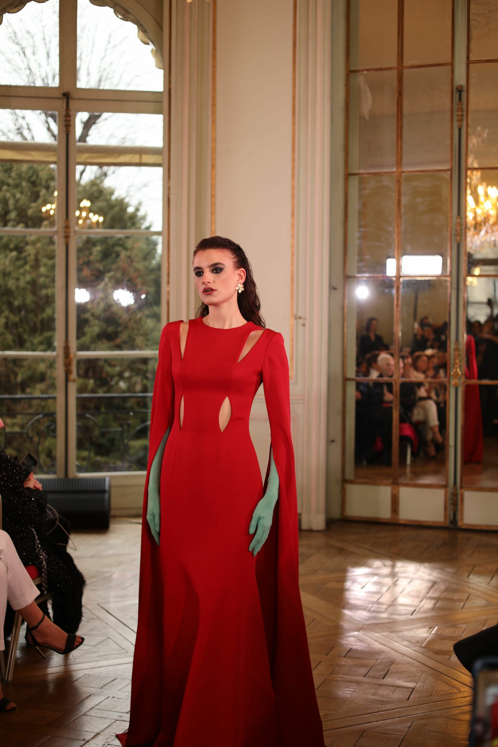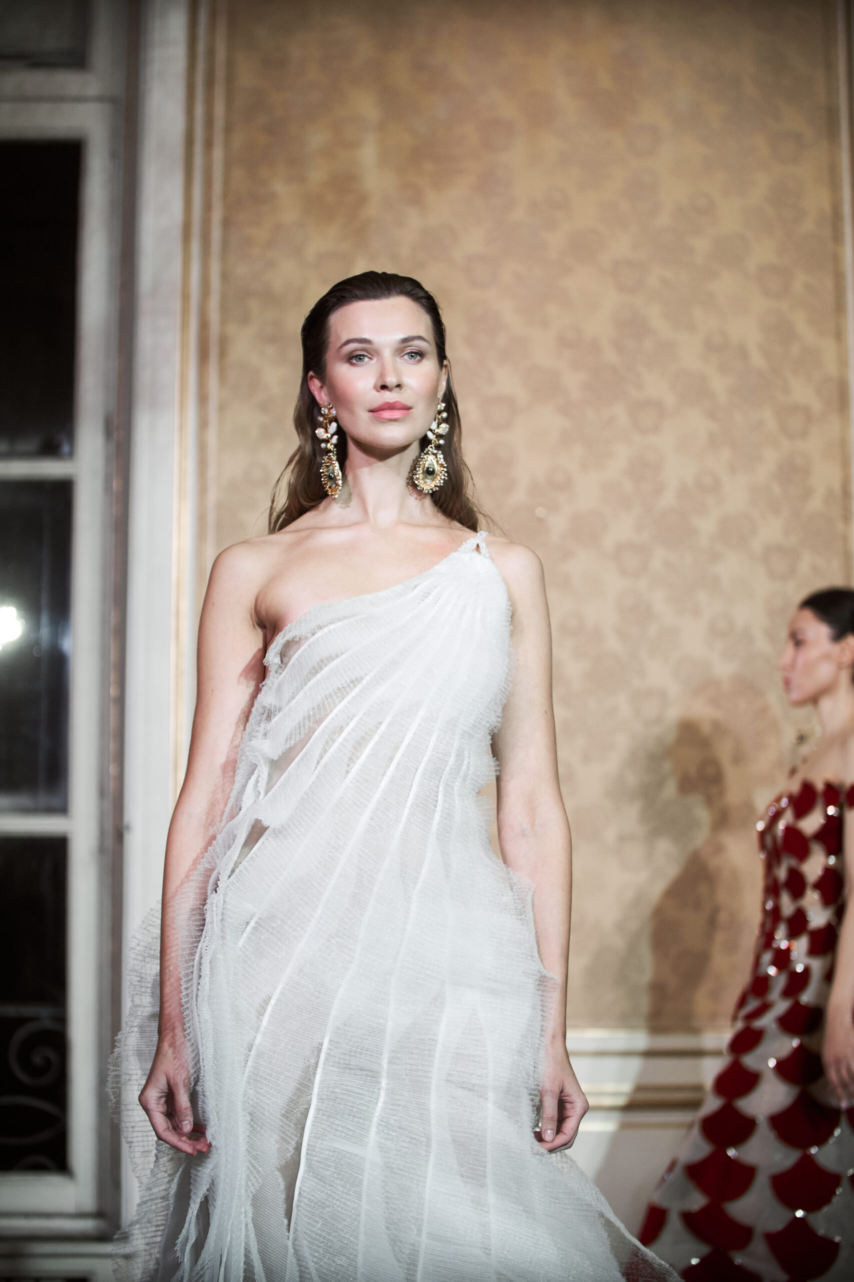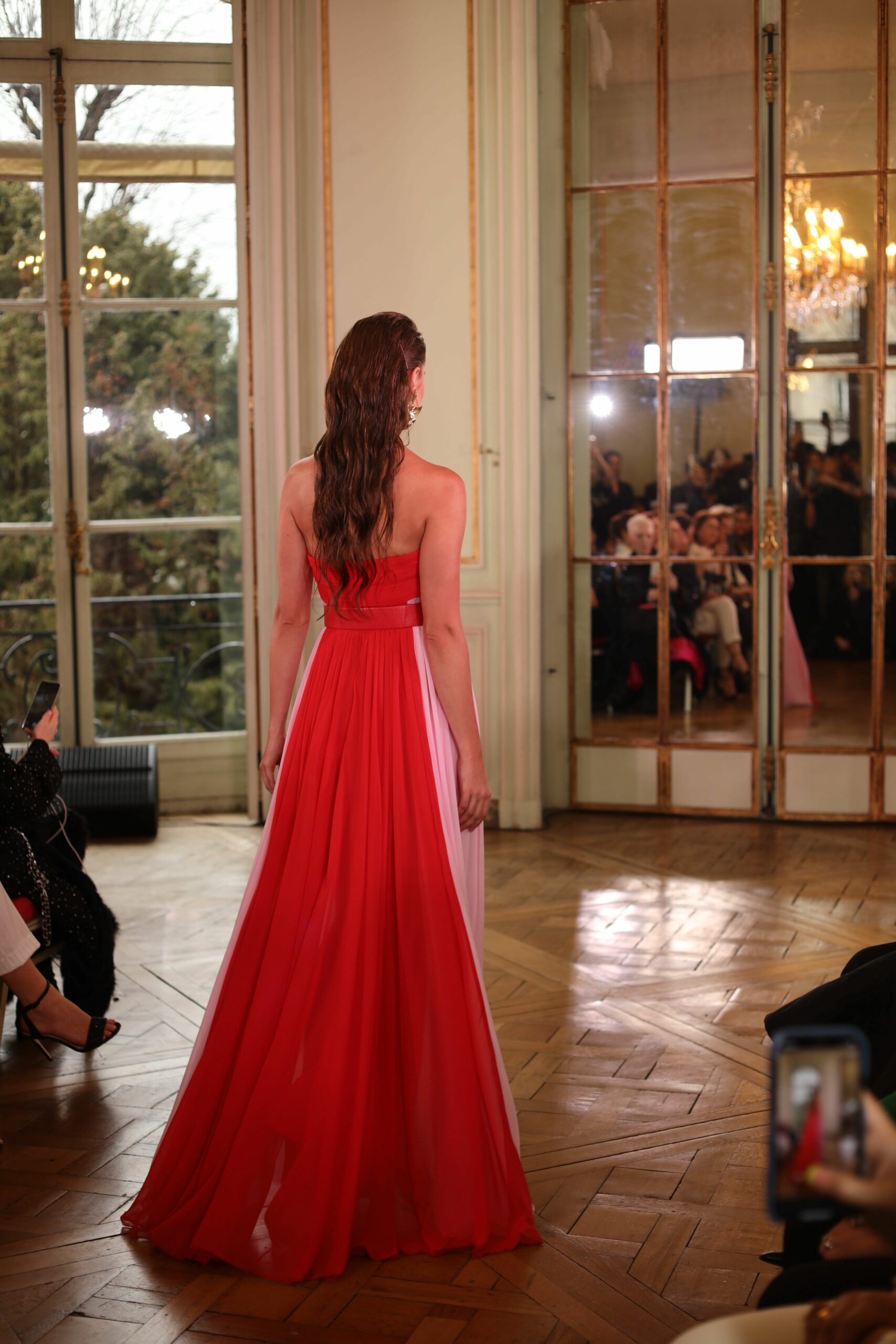 Laith Maalouf a enchanté l’audience avec sa collection inspirée des déesses, Amora: Une Symphonie de Structure et de Fluidité. Fusionnant design structuré et fluidité, chaque création rend hommage aux courbes gracieuses des statues de la Renaissance, incarnant l’essence divine de la déesse Amora à travers draperies aériennes et ornements dorés luxuriants.