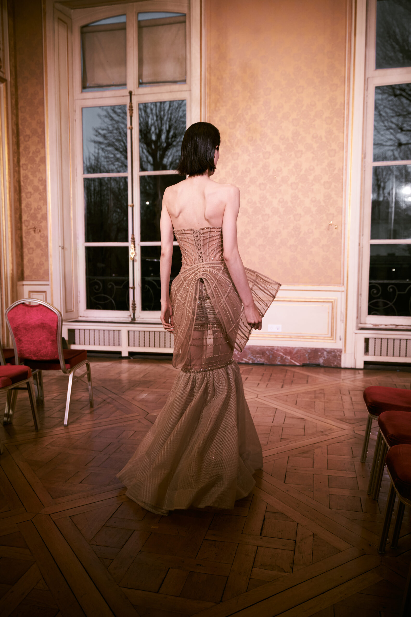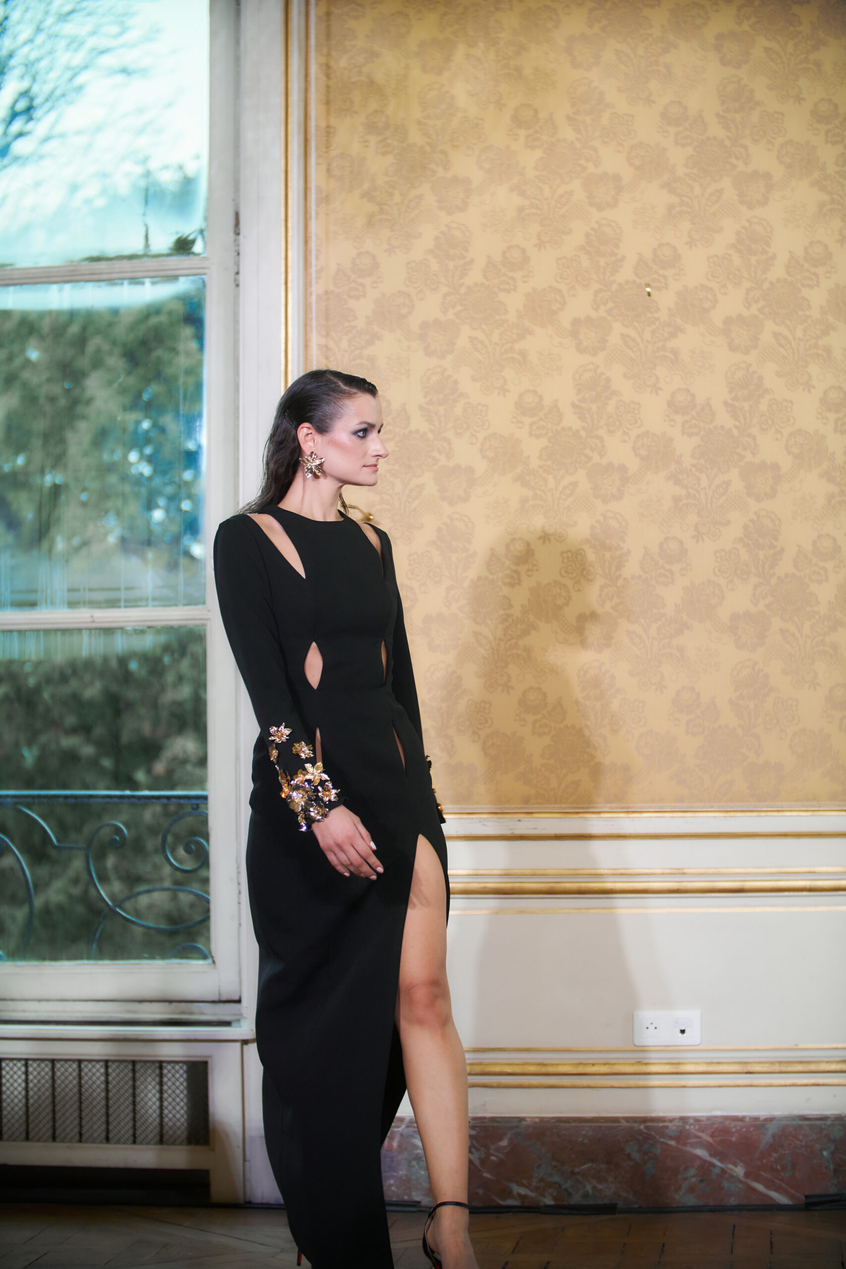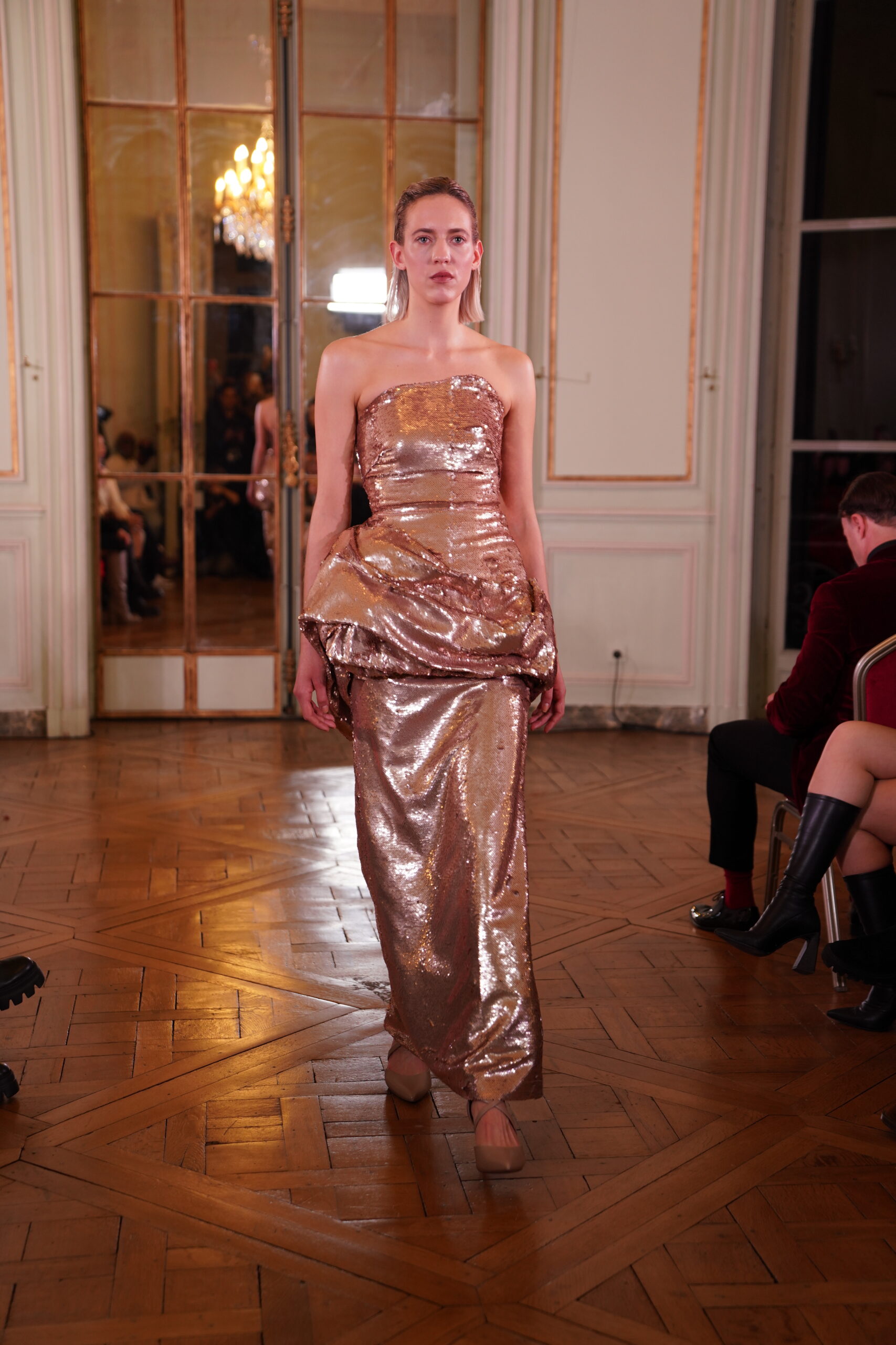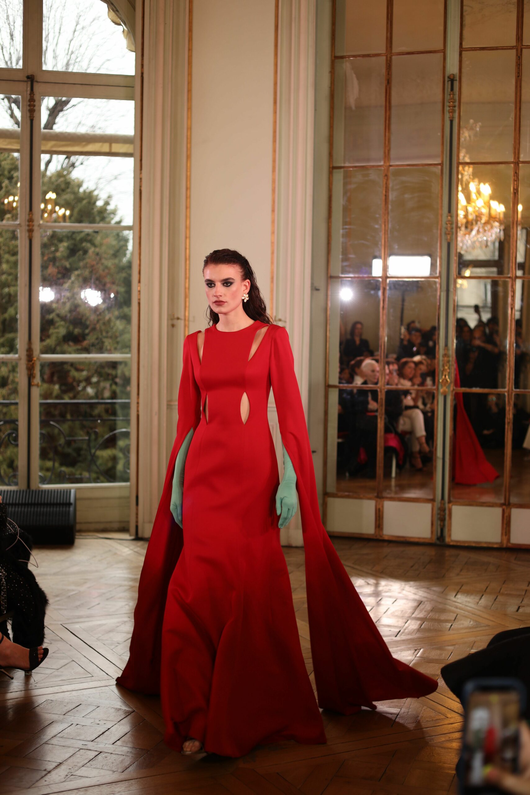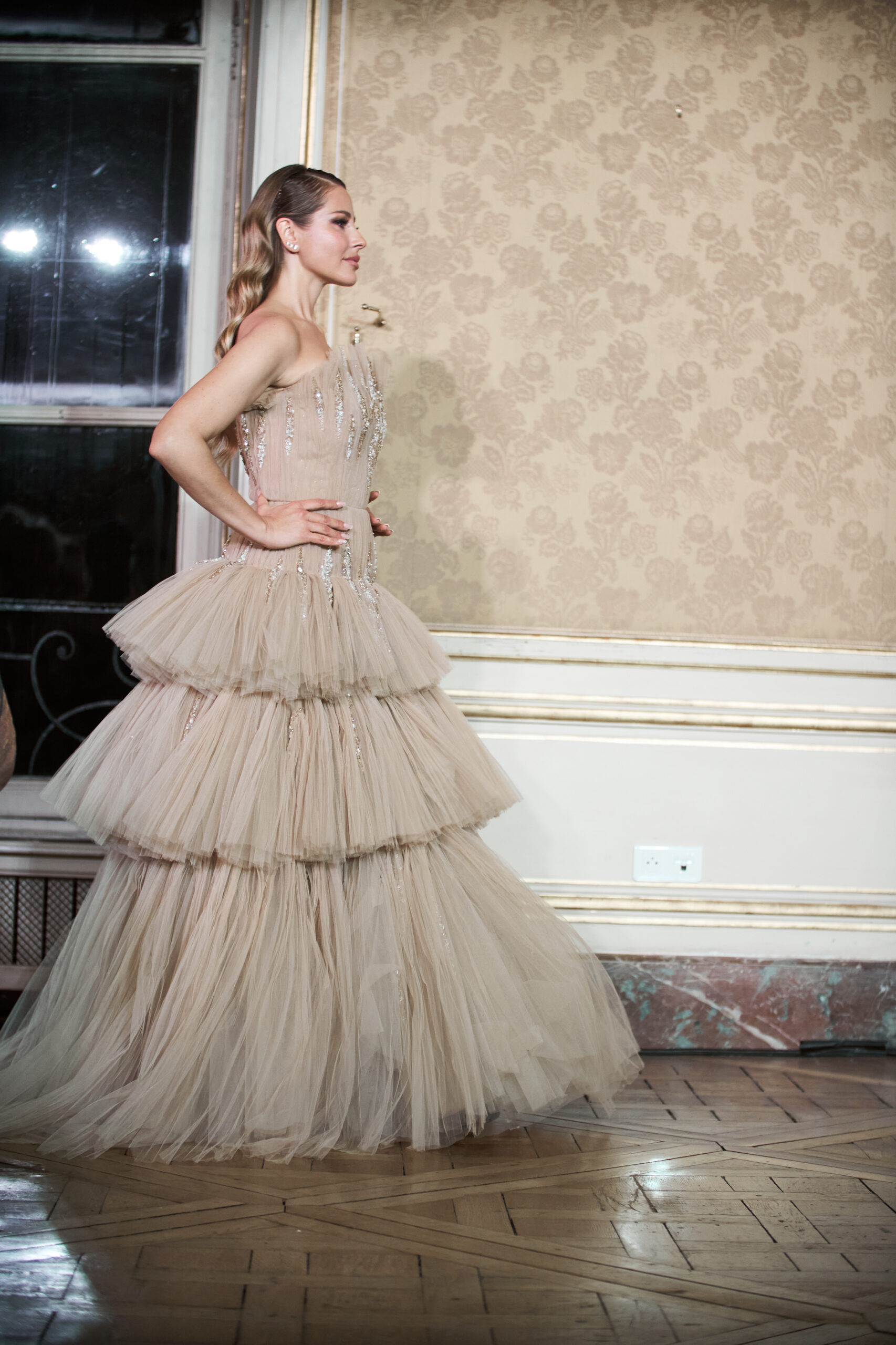 Laith Maalouf a enchanté l’audience avec sa collection inspirée des déesses, Amora: Une Symphonie de Structure et de Fluidité. Fusionnant design structuré et fluidité, chaque création rend hommage aux courbes gracieuses des statues de la Renaissance, incarnant l’essence divine de la déesse Amora à travers draperies aériennes et ornements dorés luxuriants.