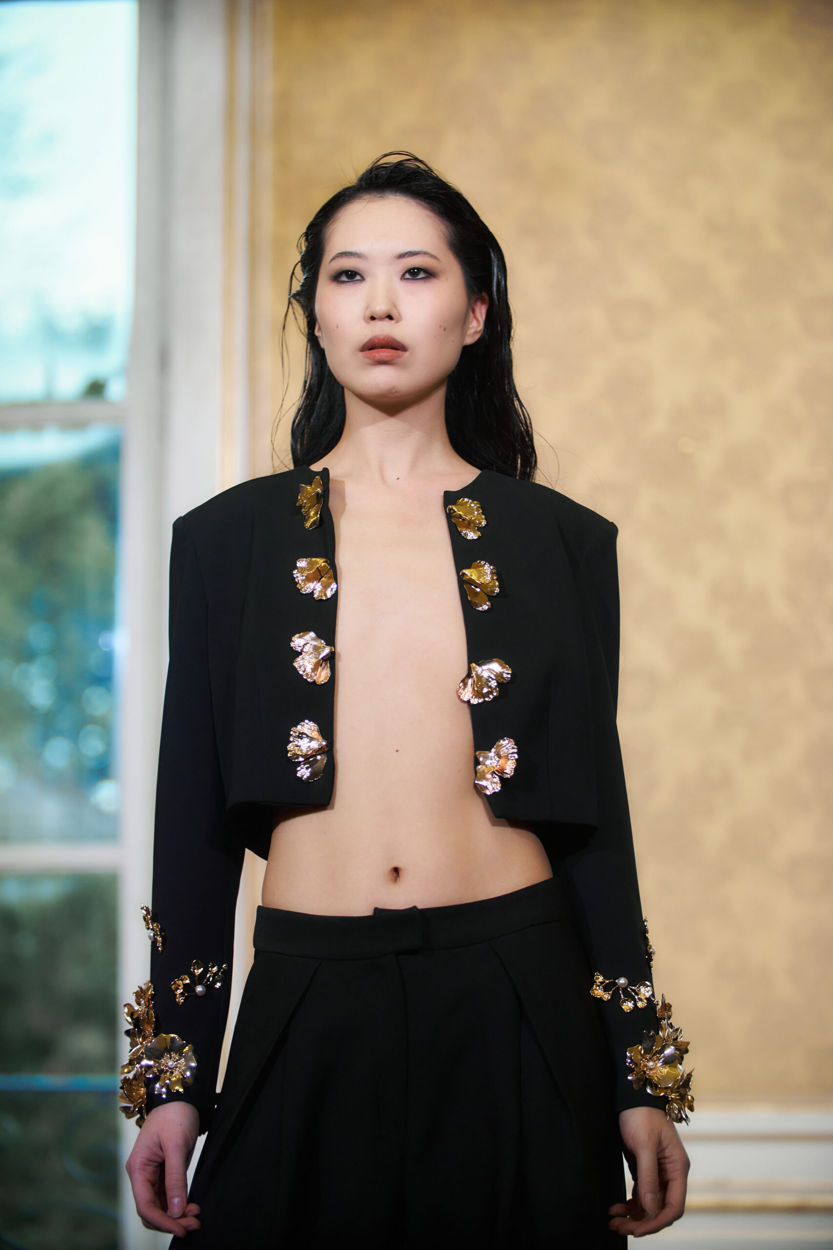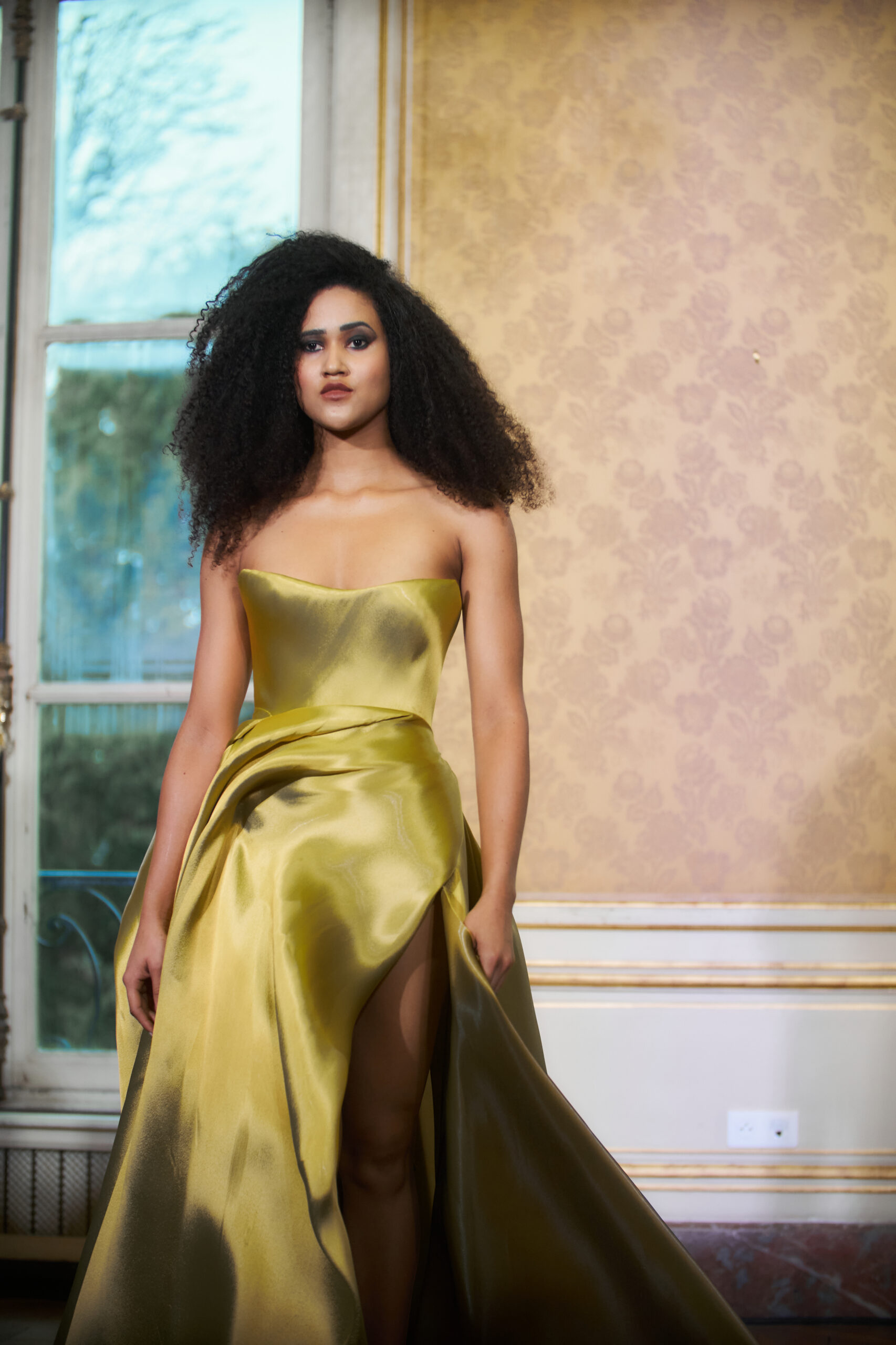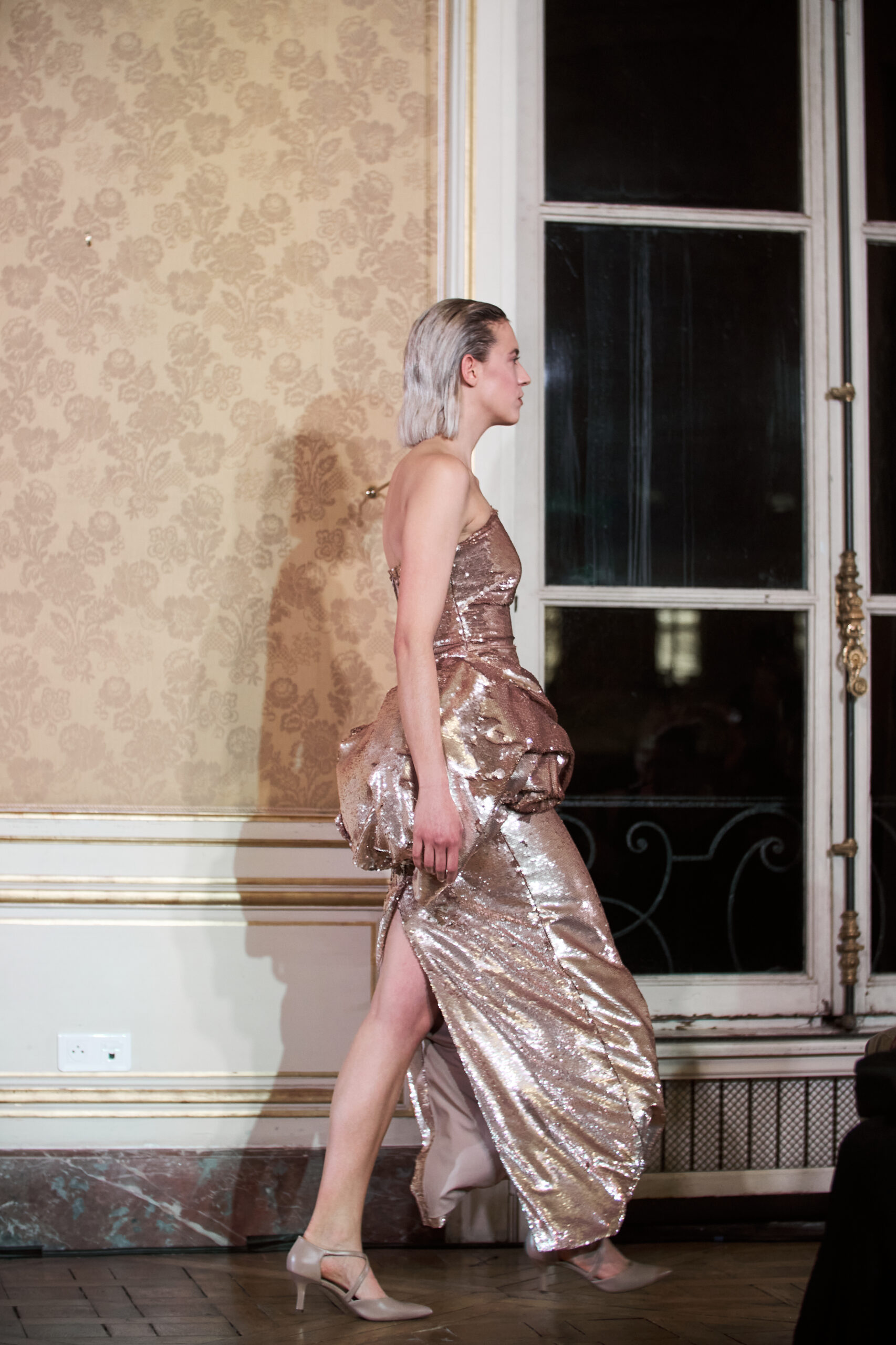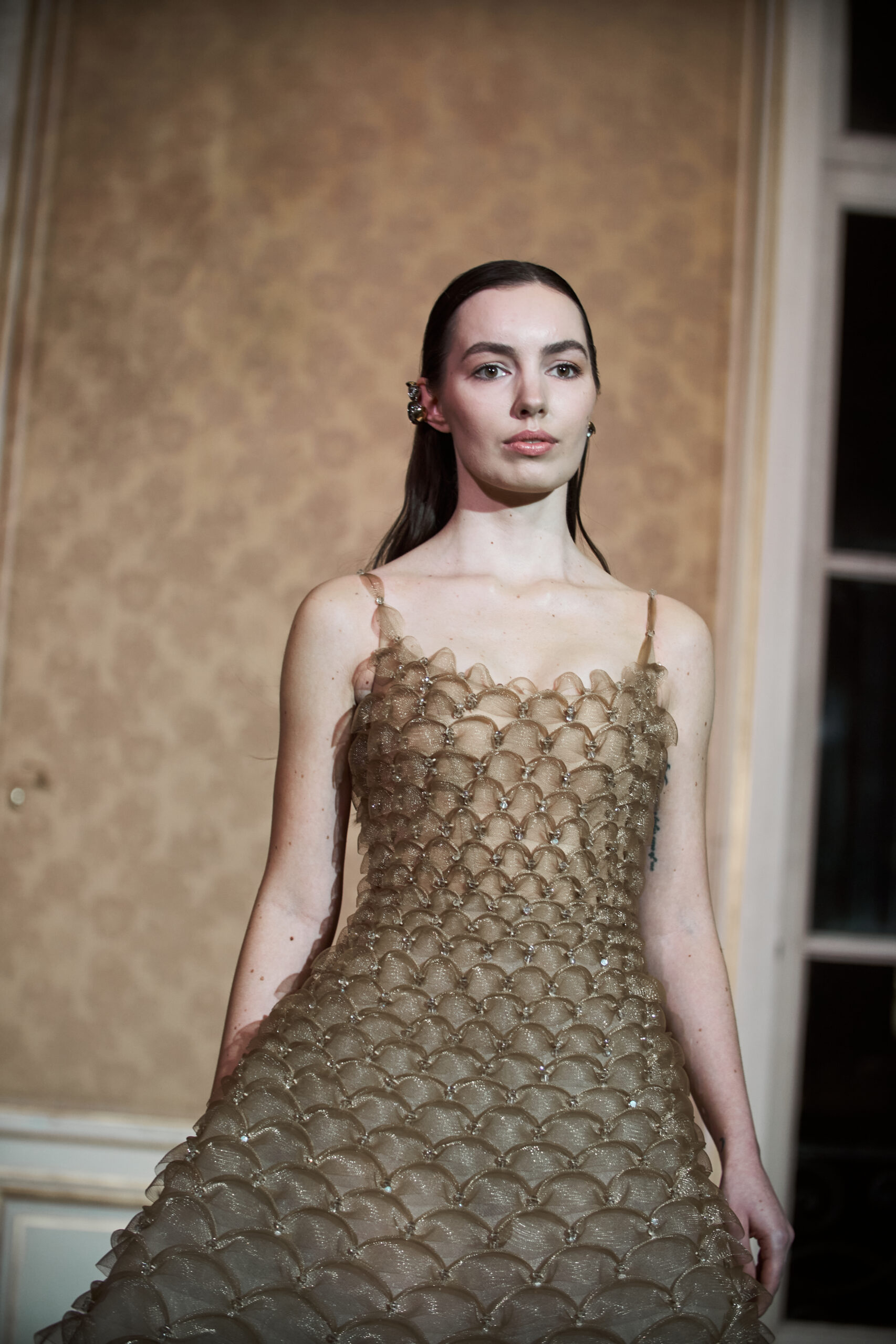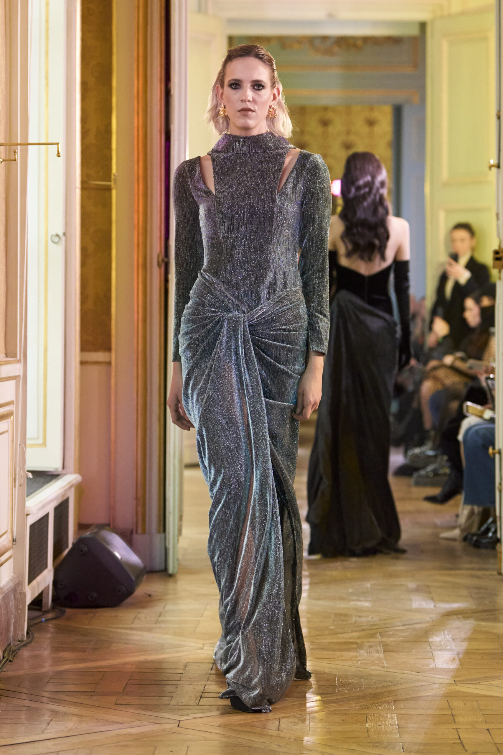 Laith Maalouf a enchanté l’audience avec sa collection inspirée des déesses, Amora: Une Symphonie de Structure et de Fluidité. Fusionnant design structuré et fluidité, chaque création rend hommage aux courbes gracieuses des statues de la Renaissance, incarnant l’essence divine de la déesse Amora à travers draperies aériennes et ornements dorés luxuriants.