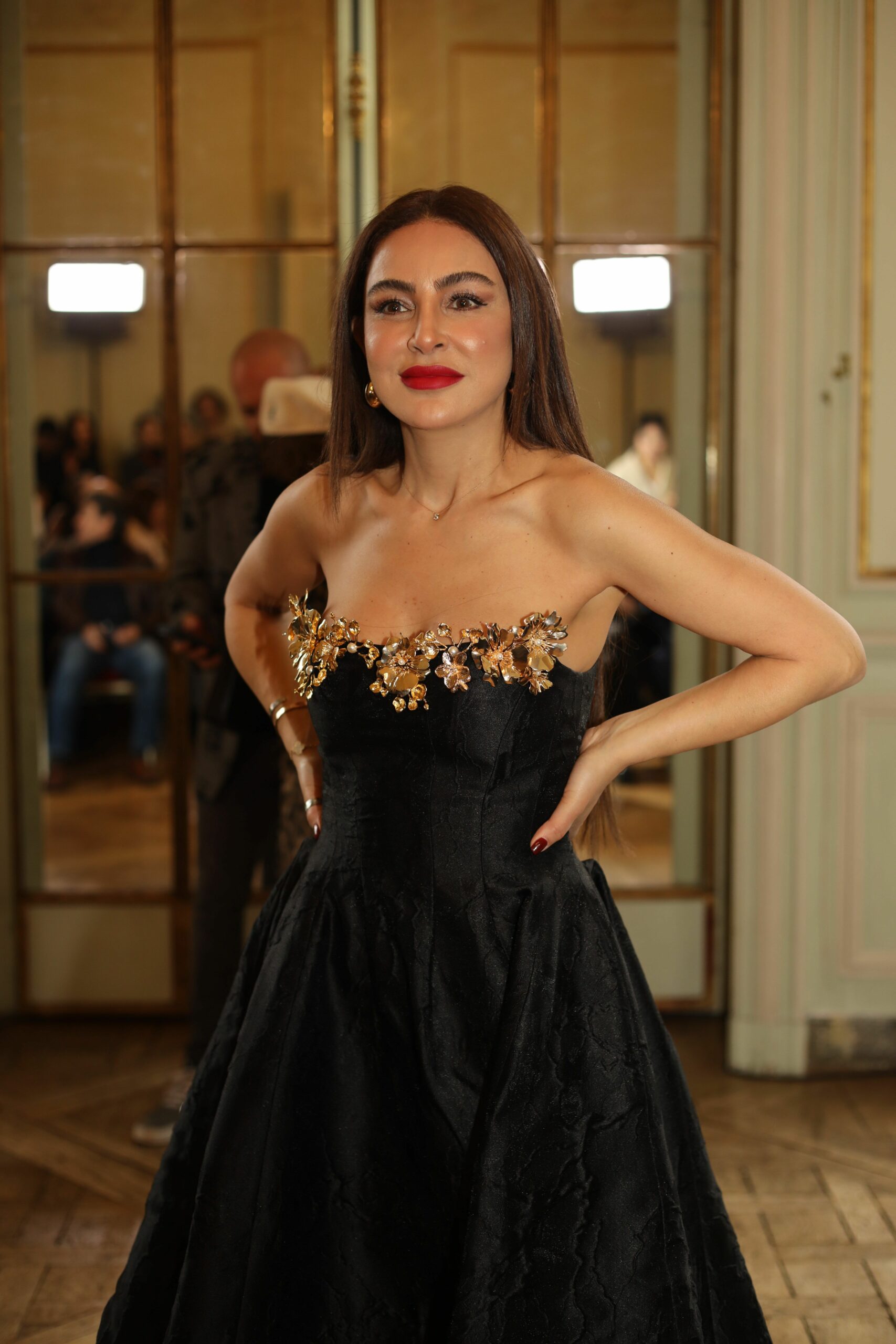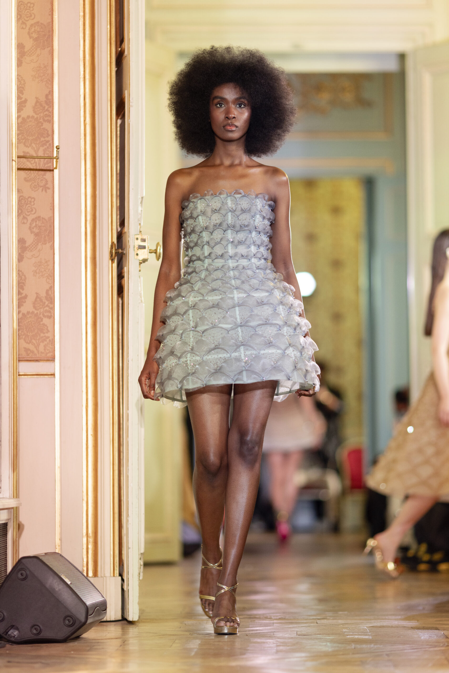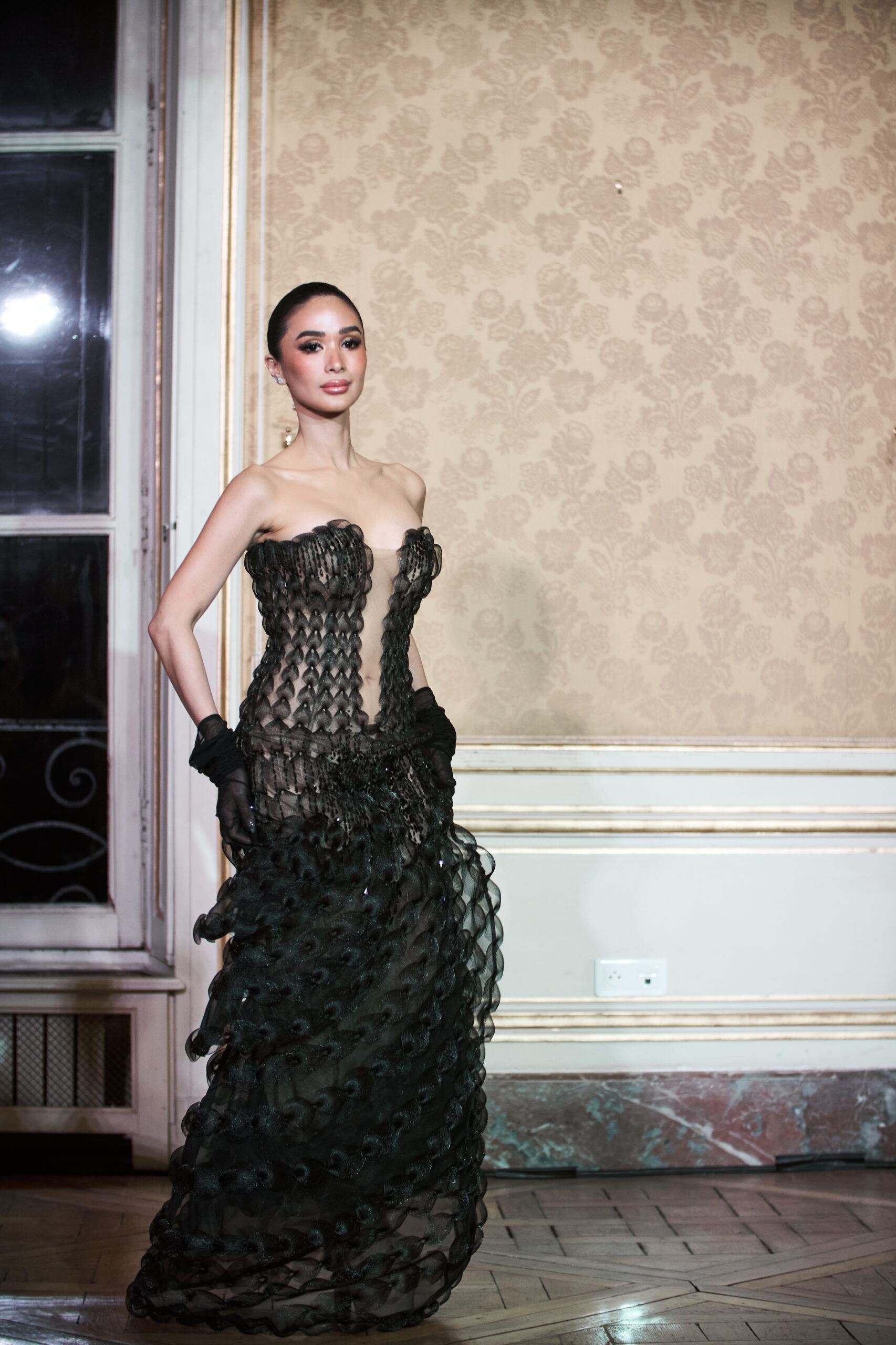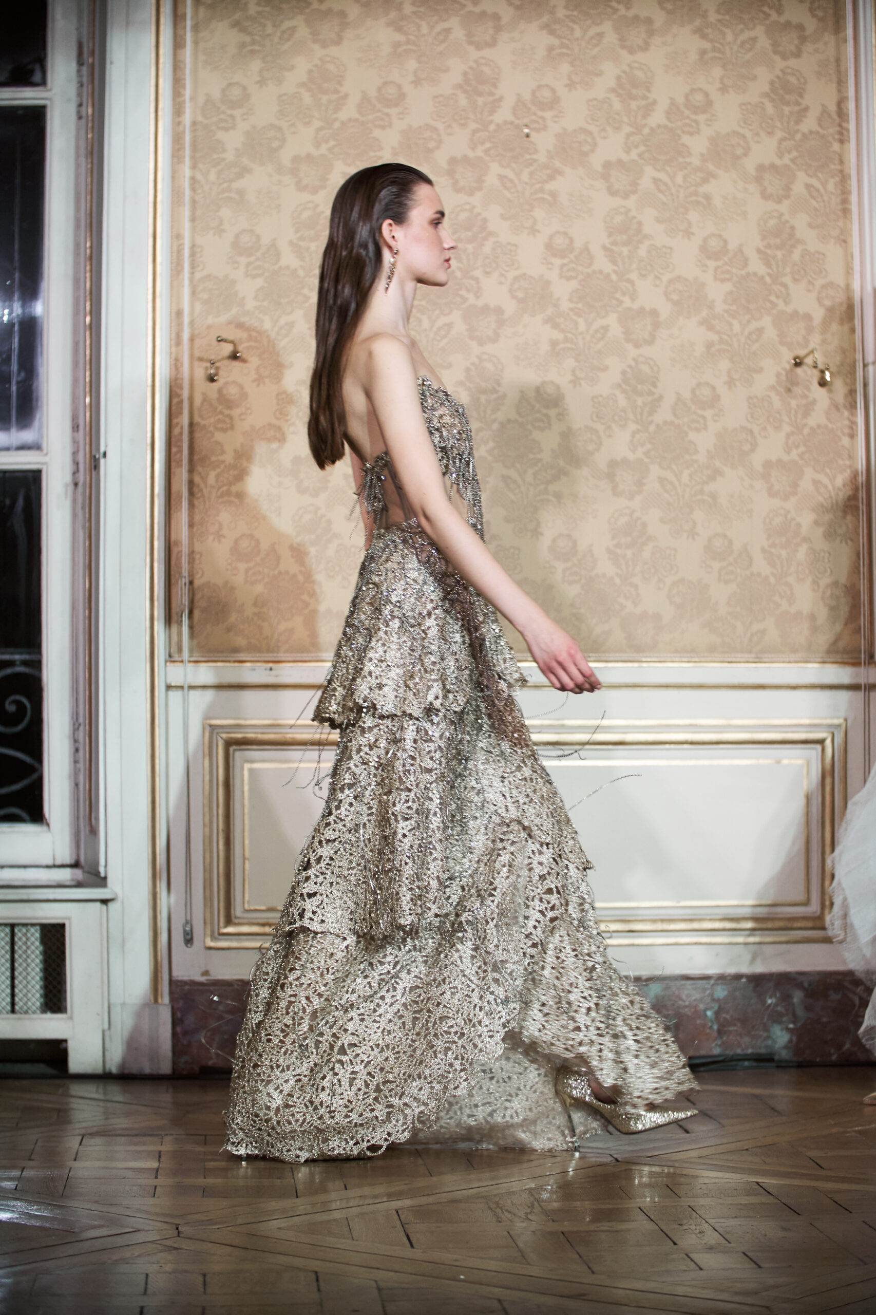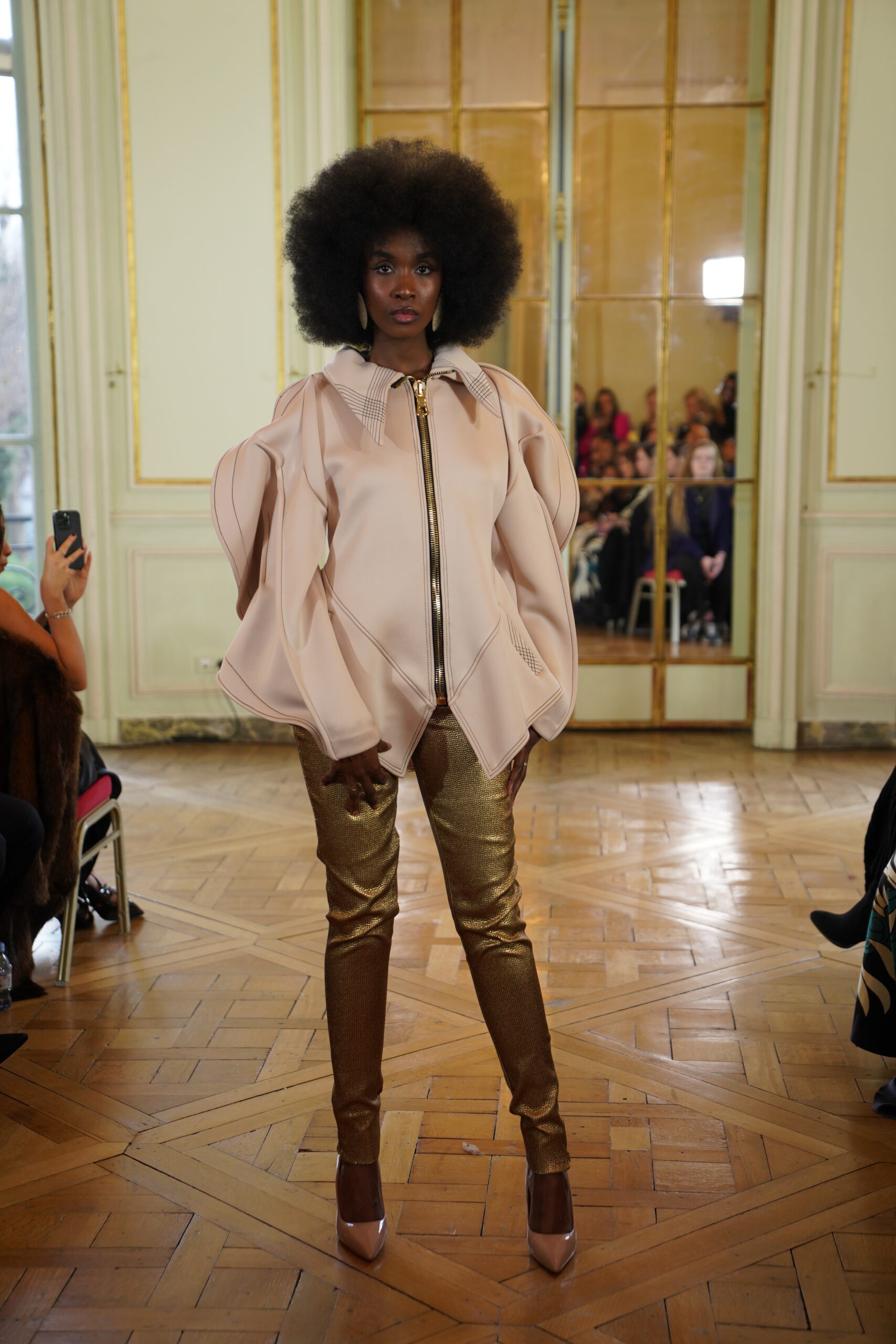 Laith Maalouf a enchanté l’audience avec sa collection inspirée des déesses, Amora: Une Symphonie de Structure et de Fluidité. Fusionnant design structuré et fluidité, chaque création rend hommage aux courbes gracieuses des statues de la Renaissance, incarnant l’essence divine de la déesse Amora à travers draperies aériennes et ornements dorés luxuriants.