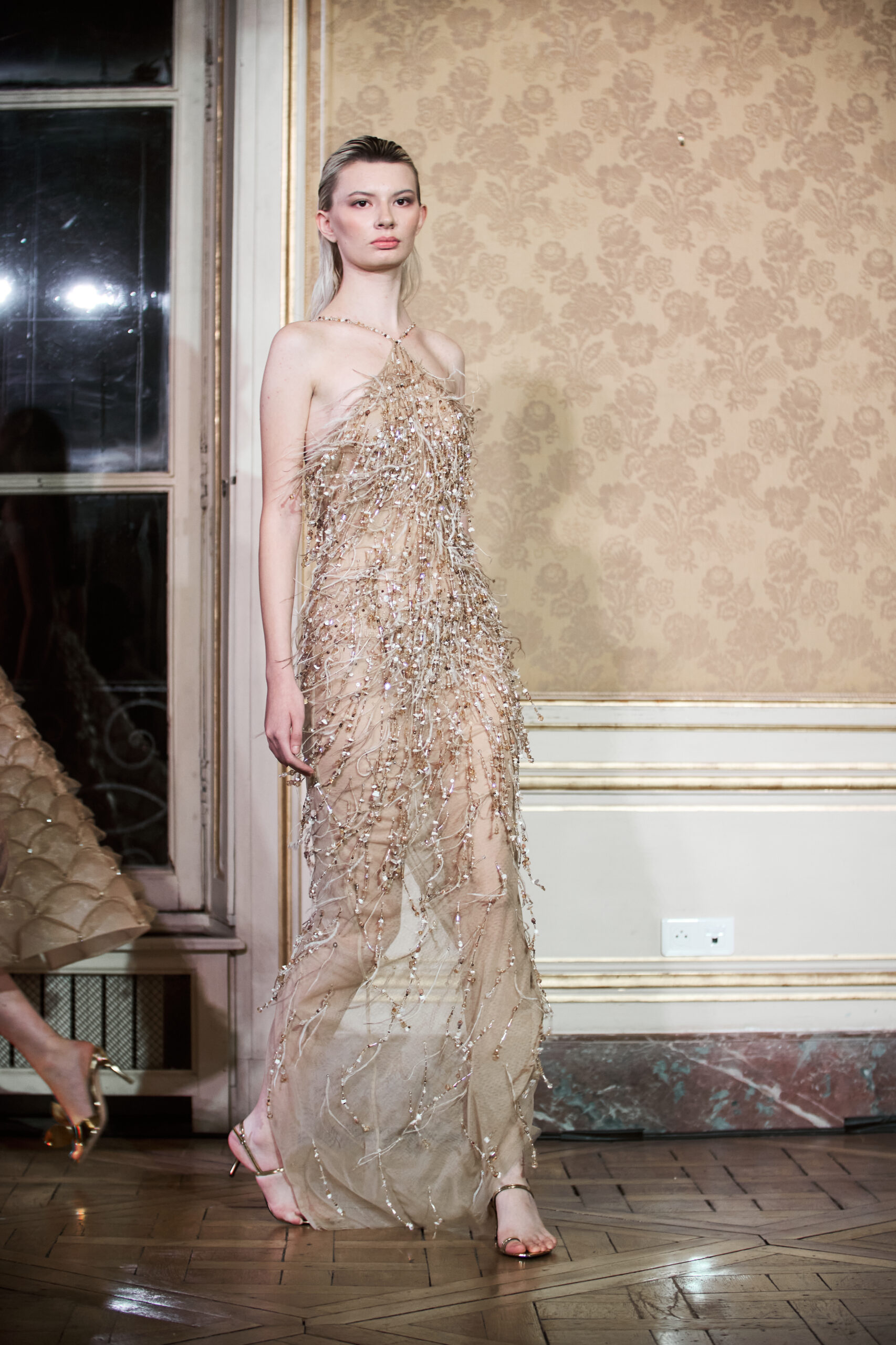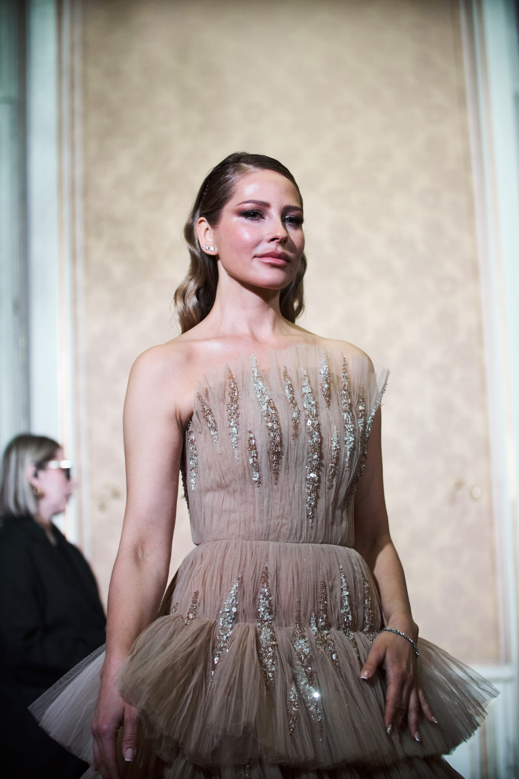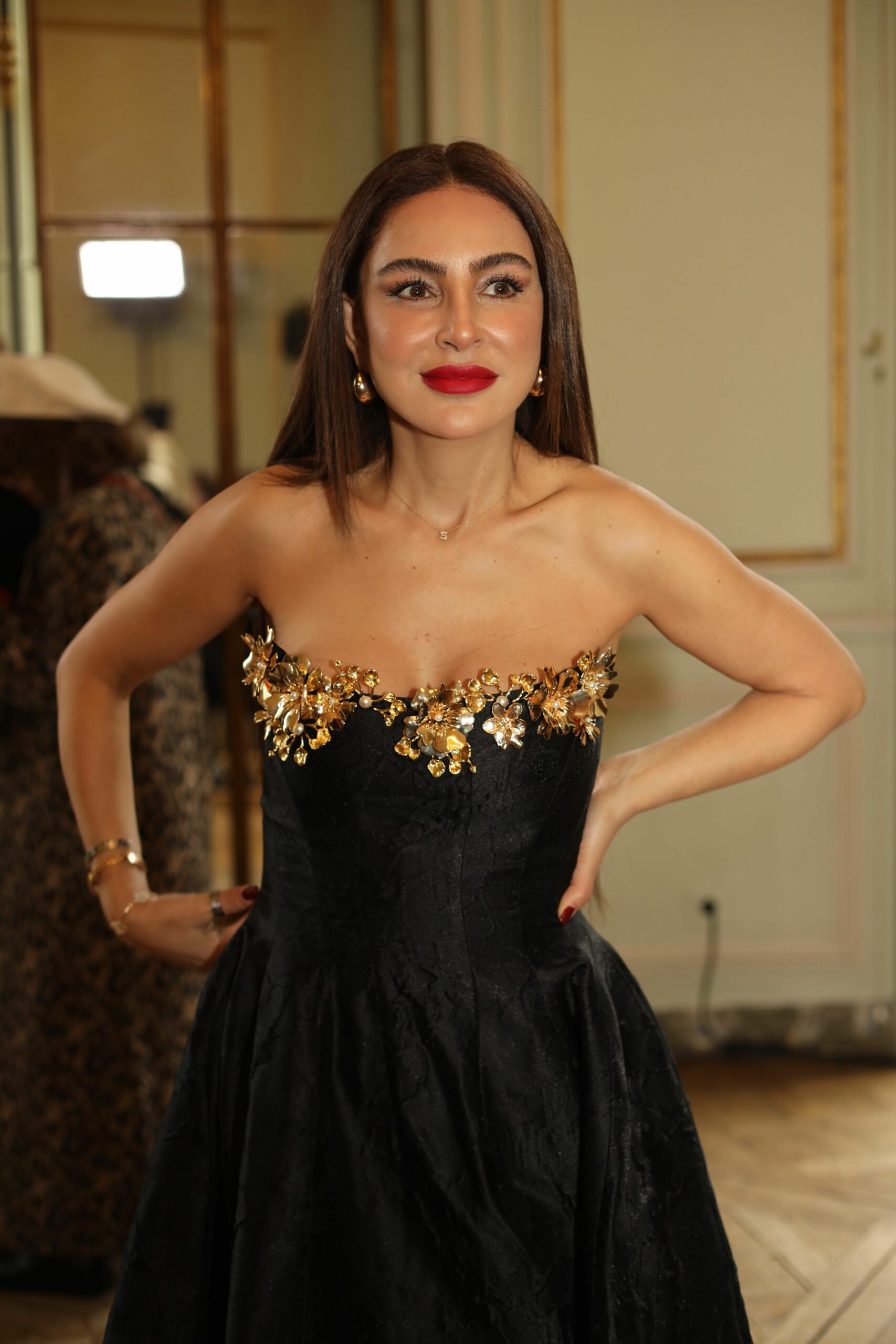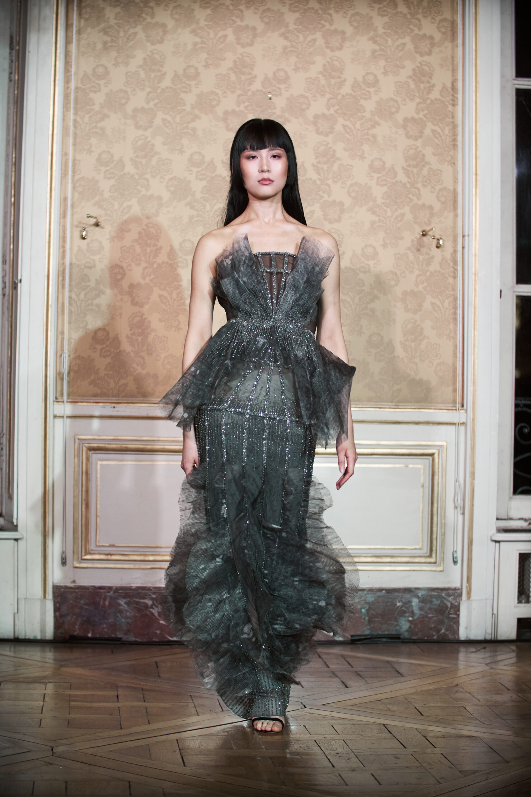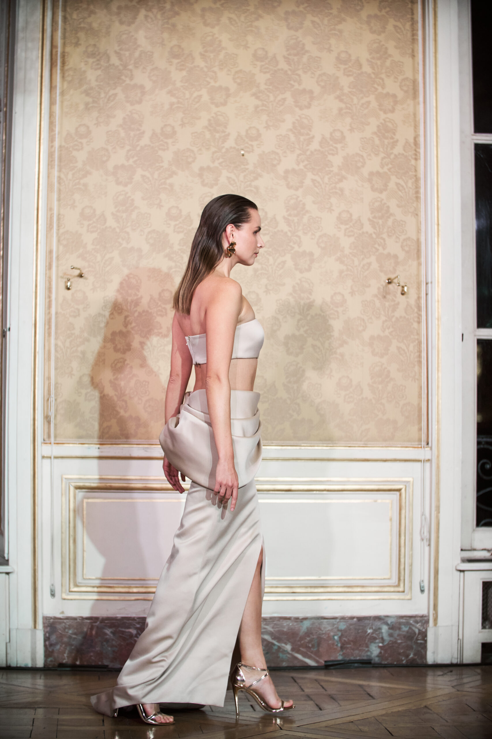 Laith Maalouf a enchanté l’audience avec sa collection inspirée des déesses, Amora: Une Symphonie de Structure et de Fluidité. Fusionnant design structuré et fluidité, chaque création rend hommage aux courbes gracieuses des statues de la Renaissance, incarnant l’essence divine de la déesse Amora à travers draperies aériennes et ornements dorés luxuriants.