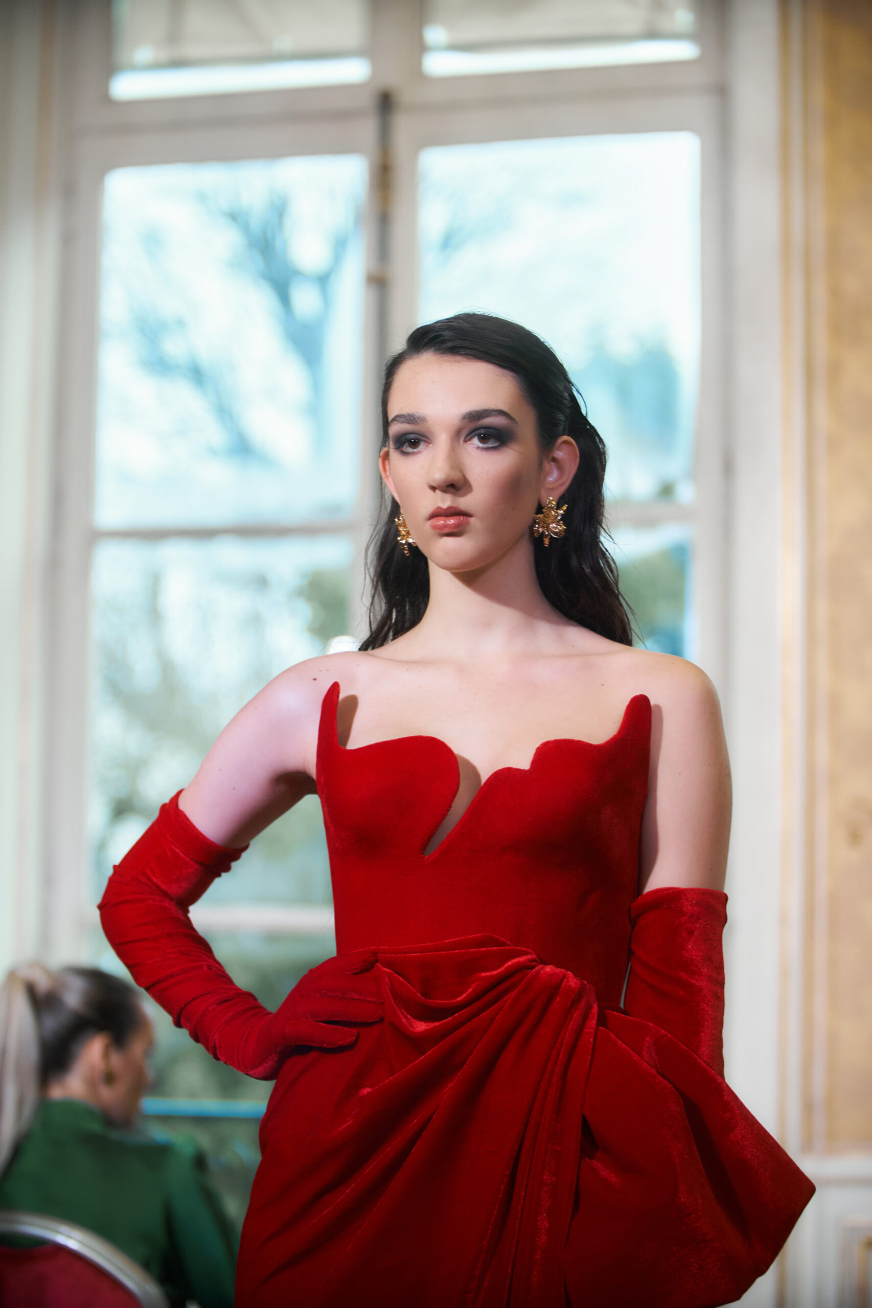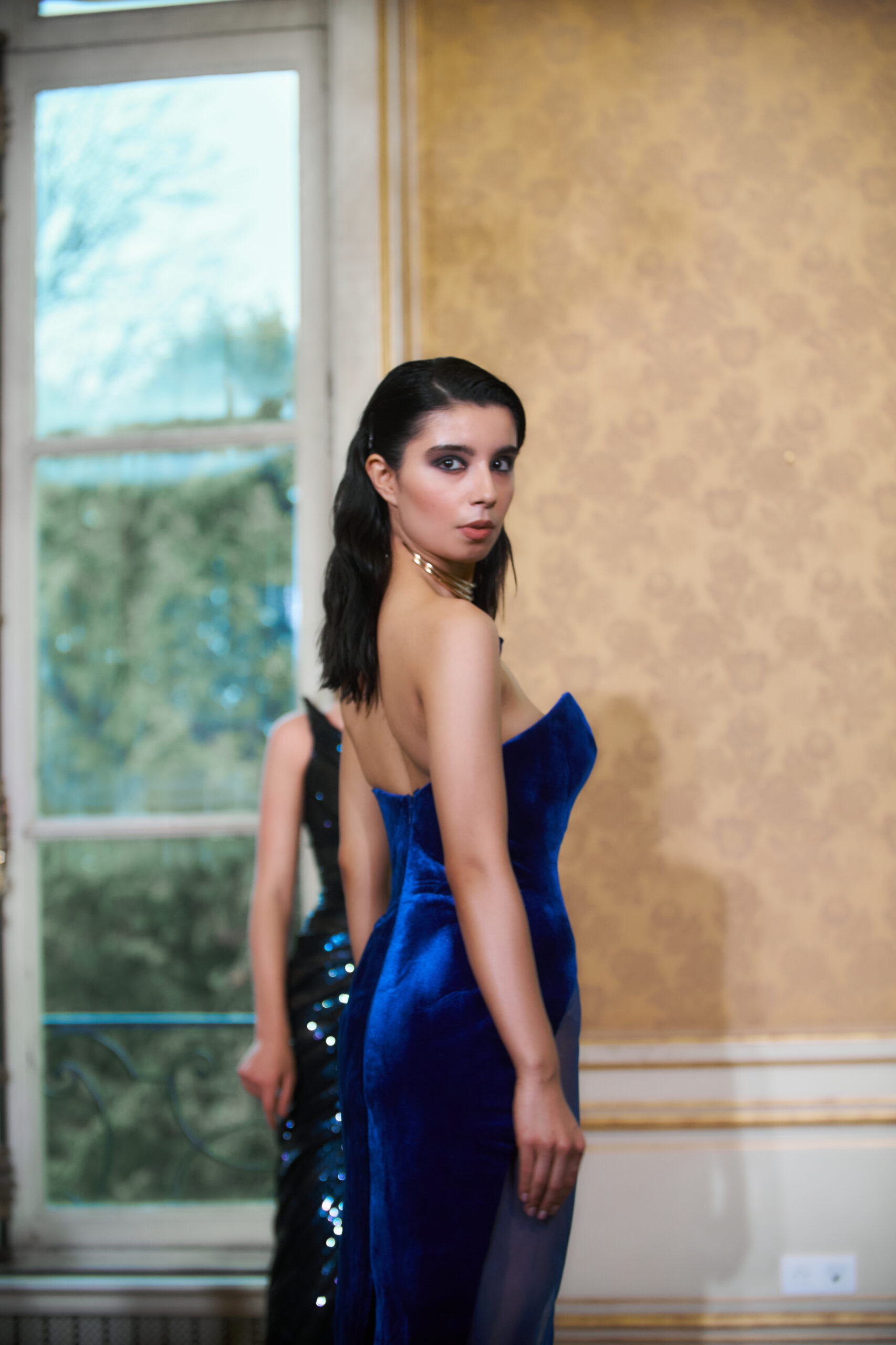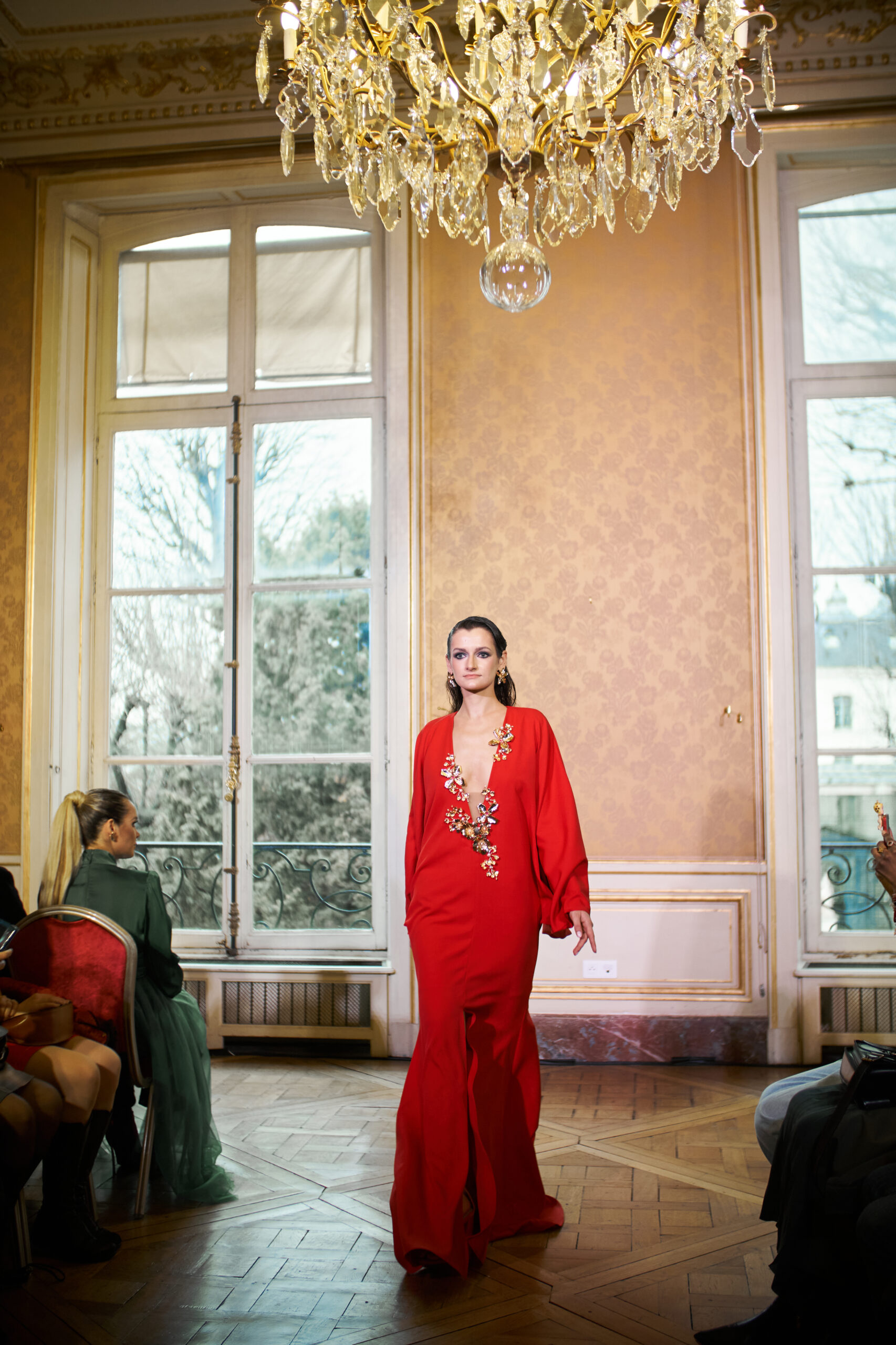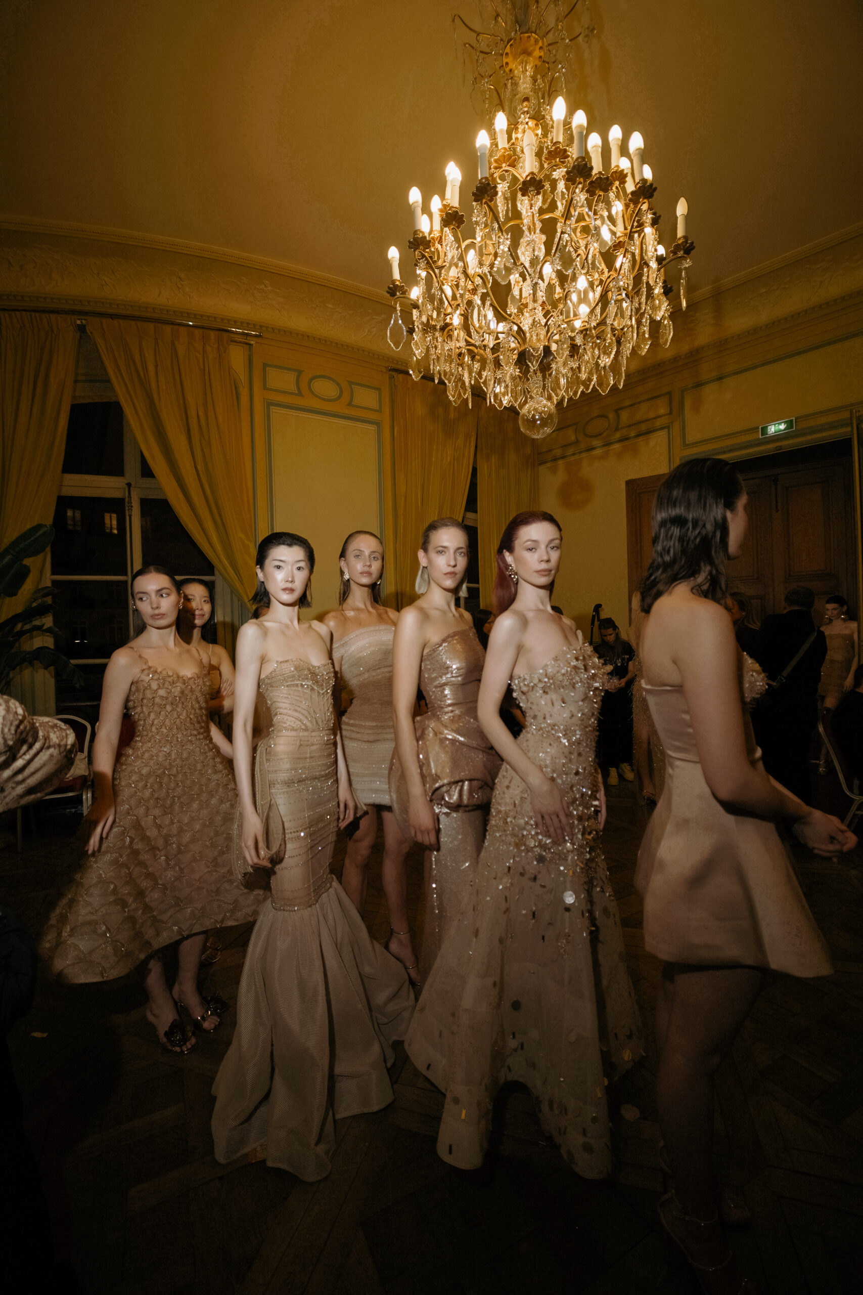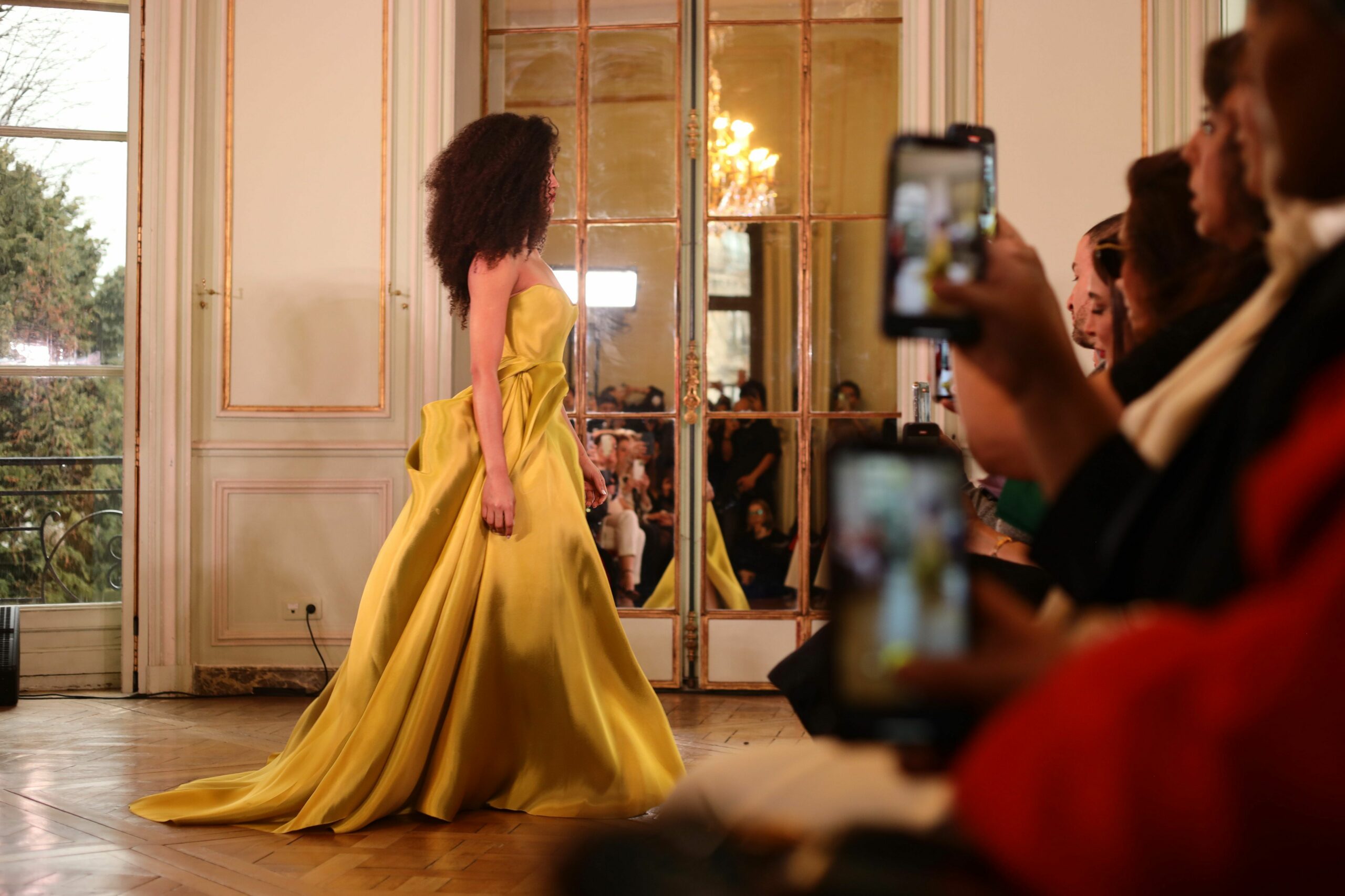Laith Maalouf a enchanté l’audience avec sa collection inspirée des déesses, Amora: Une Symphonie de Structure et de Fluidité. Fusionnant design structuré et fluidité, chaque création rend hommage aux courbes gracieuses des statues de la Renaissance, incarnant l’essence divine de la déesse Amora à travers draperies aériennes et ornements dorés luxuriants.
