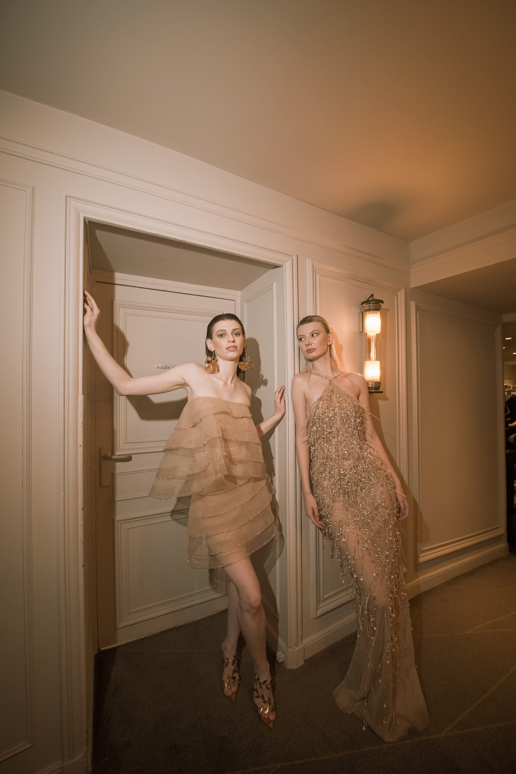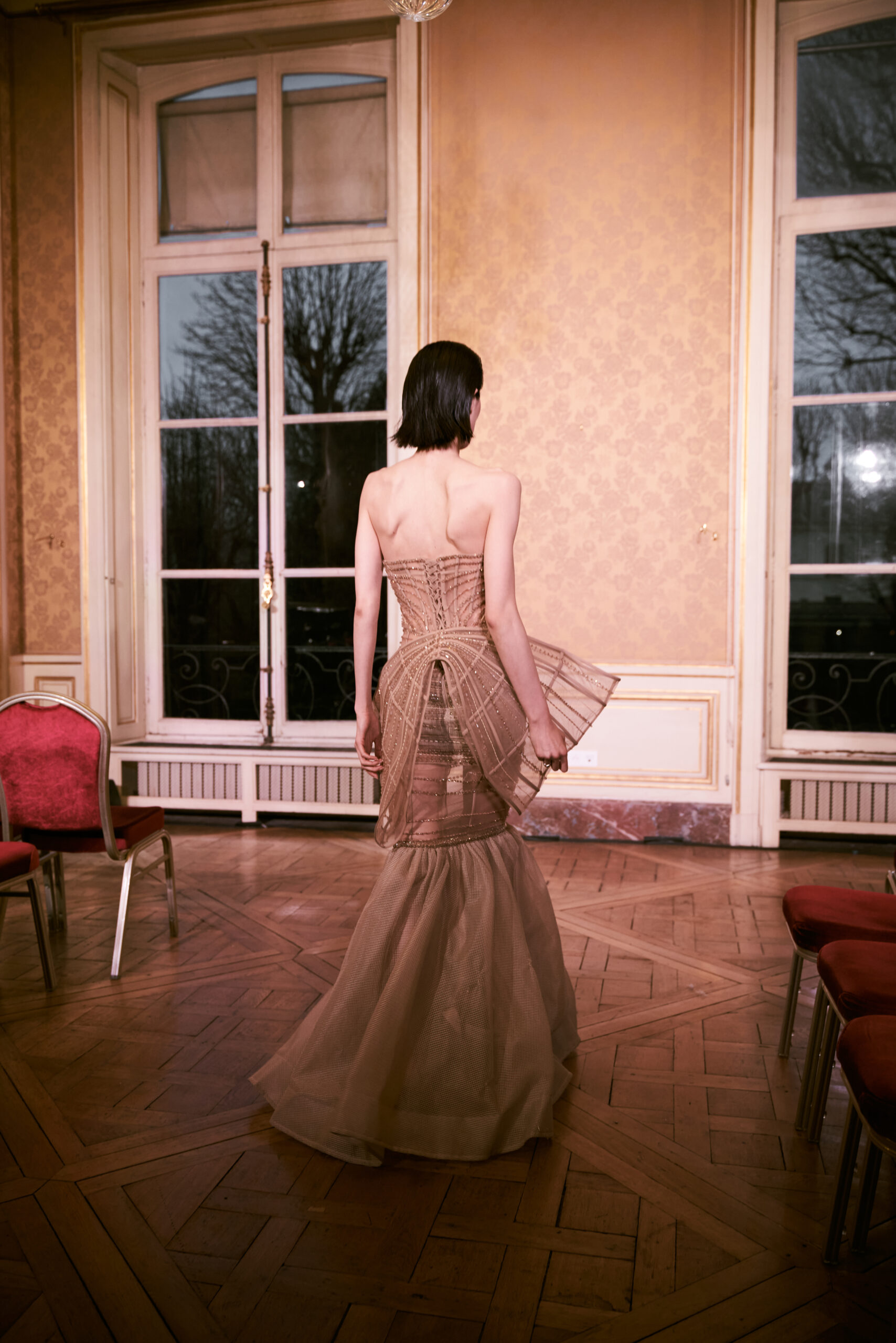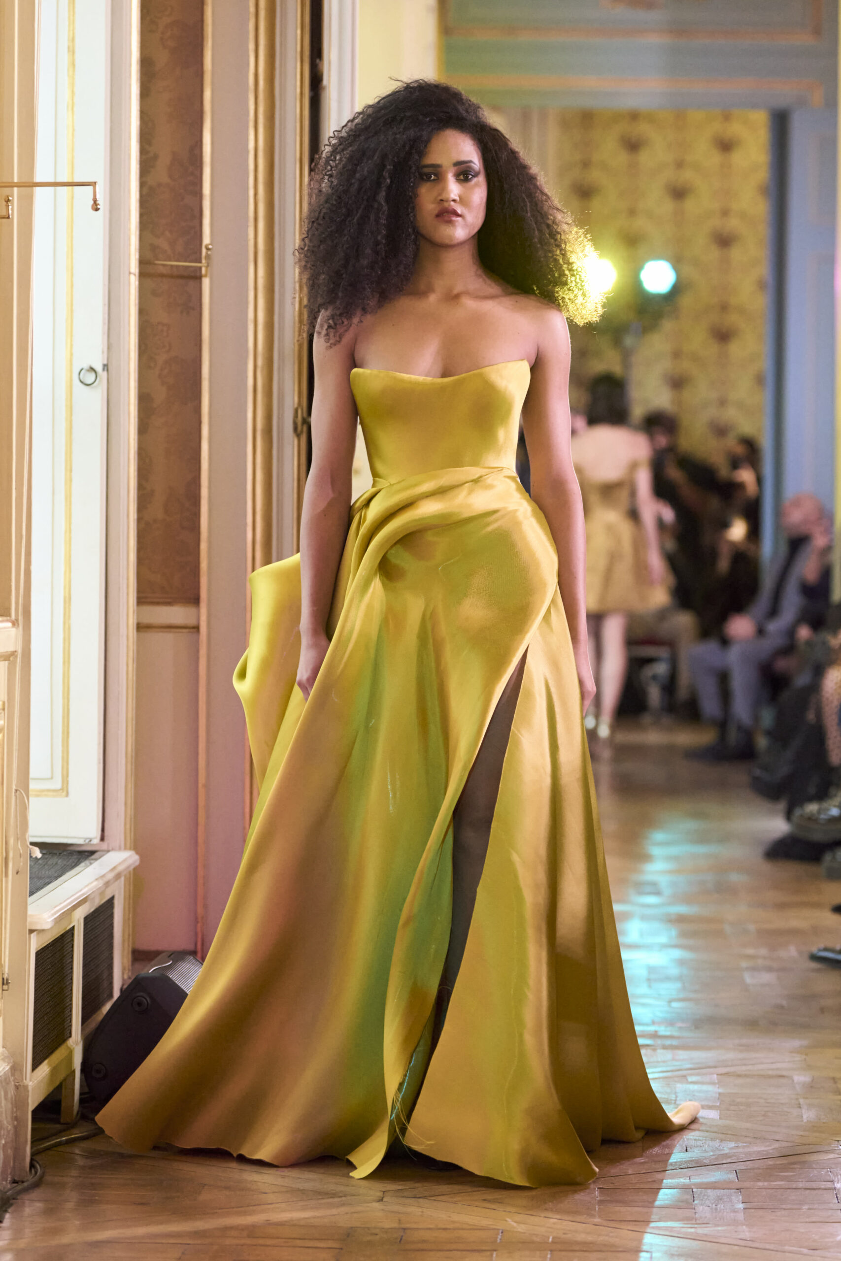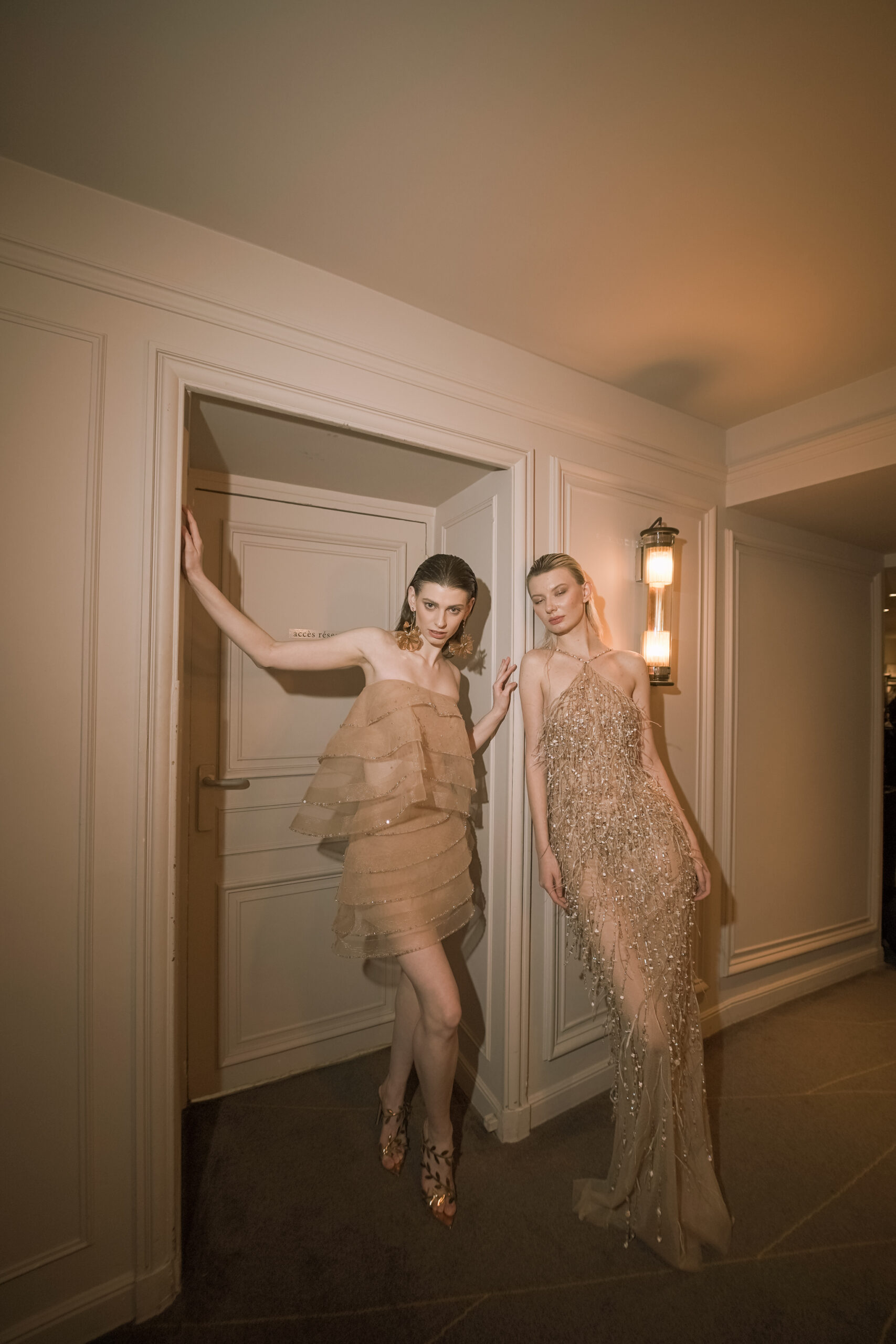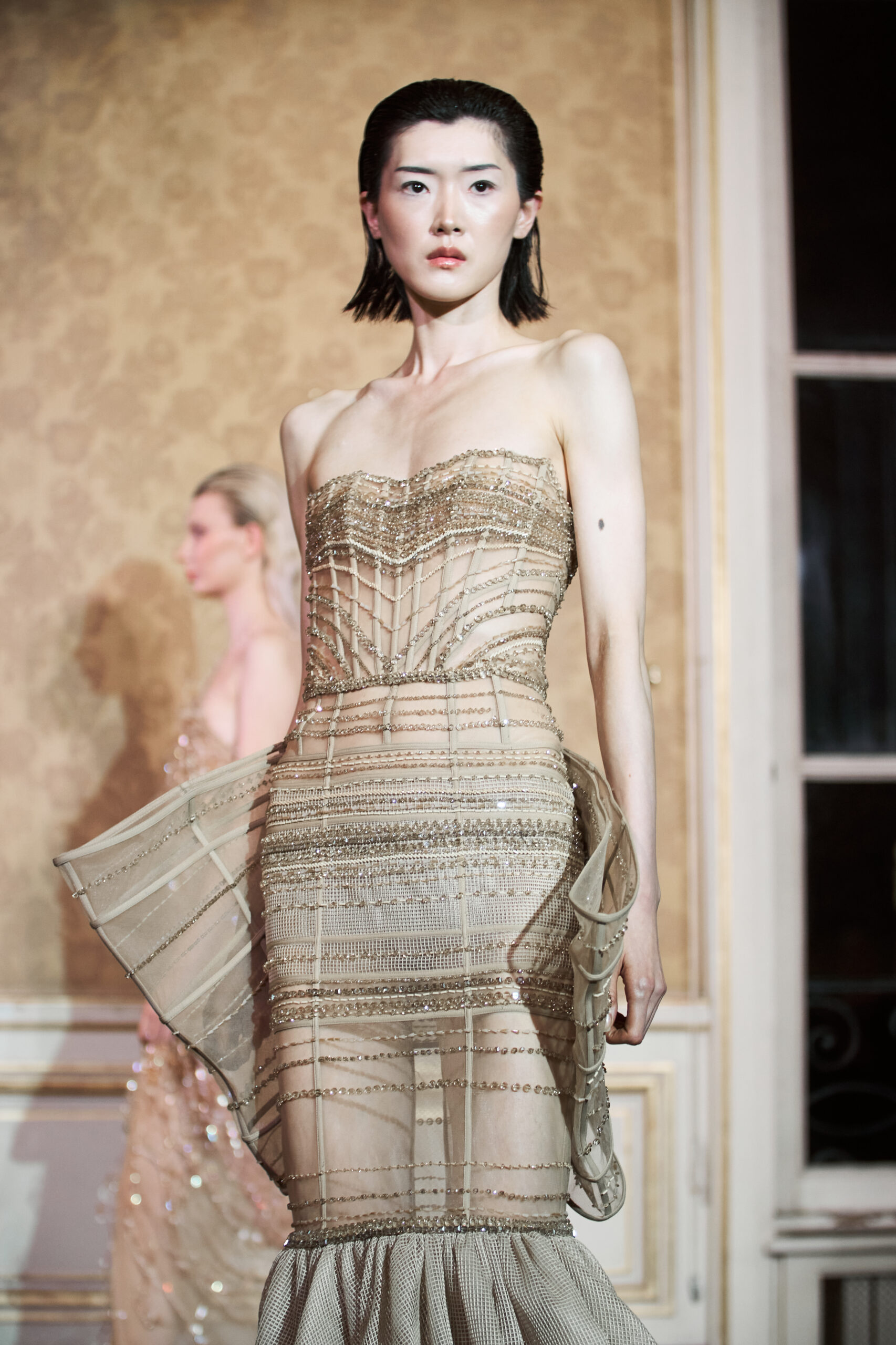 Laith Maalouf a enchanté l’audience avec sa collection inspirée des déesses, Amora: Une Symphonie de Structure et de Fluidité. Fusionnant design structuré et fluidité, chaque création rend hommage aux courbes gracieuses des statues de la Renaissance, incarnant l’essence divine de la déesse Amora à travers draperies aériennes et ornements dorés luxuriants.