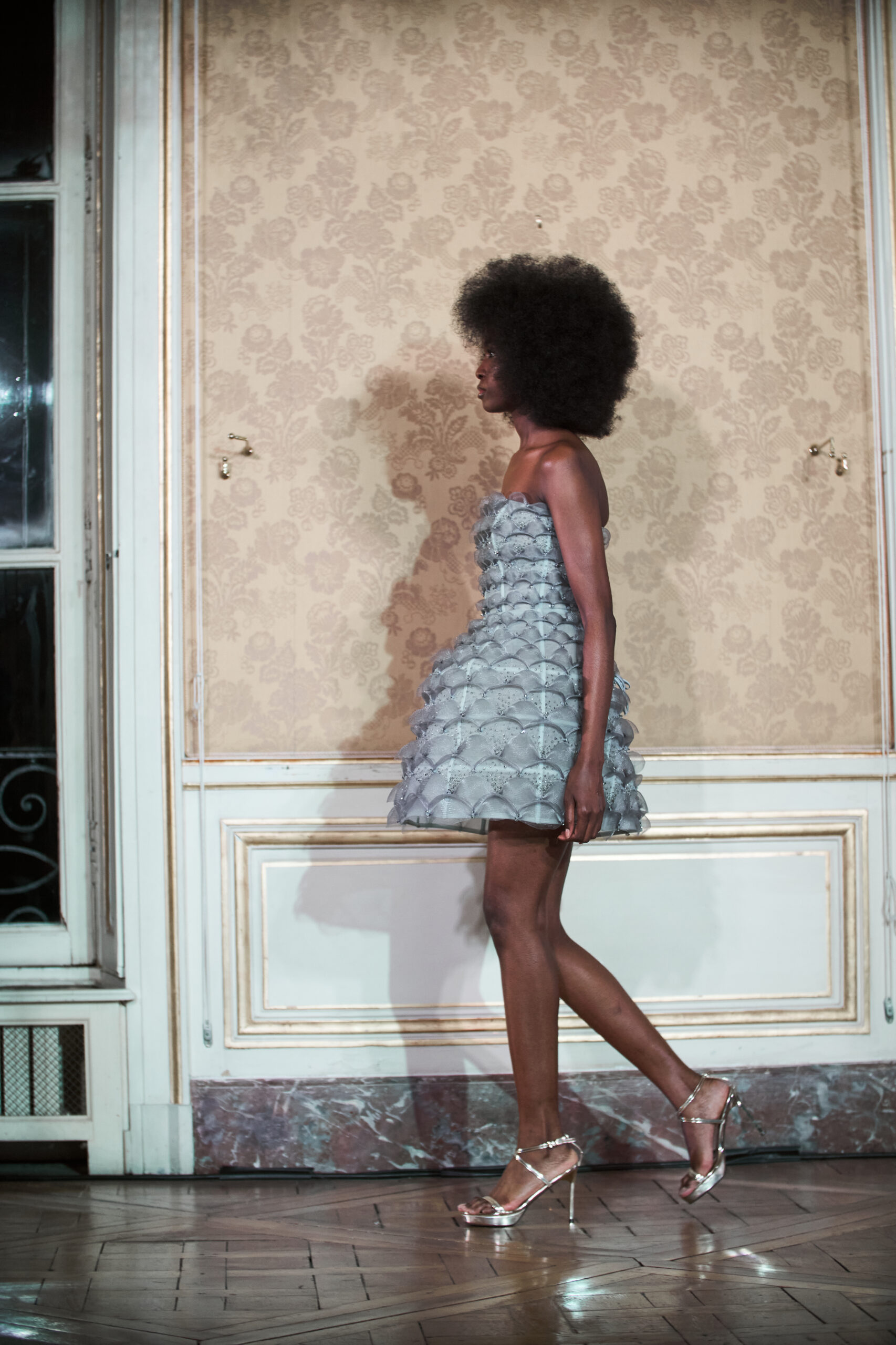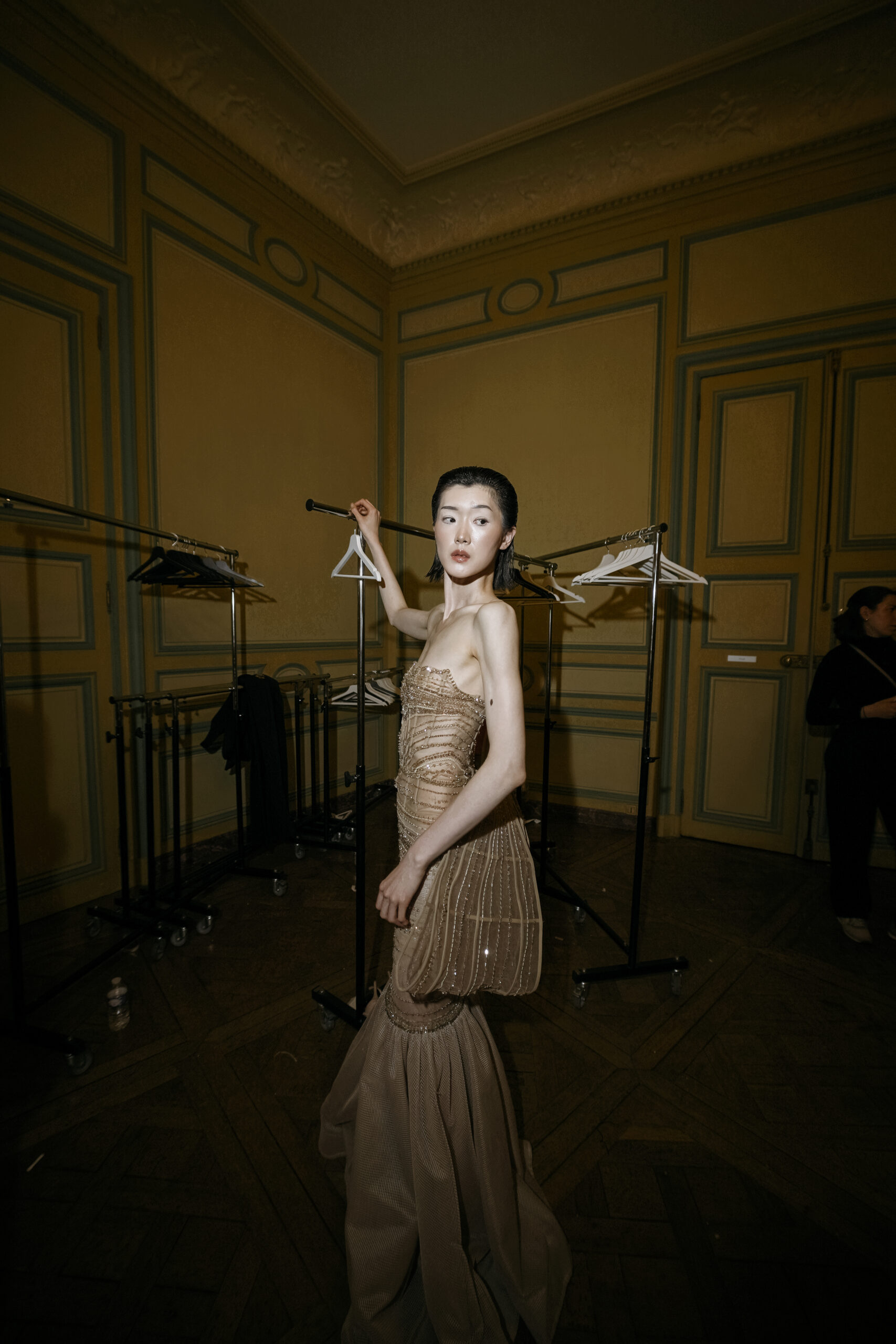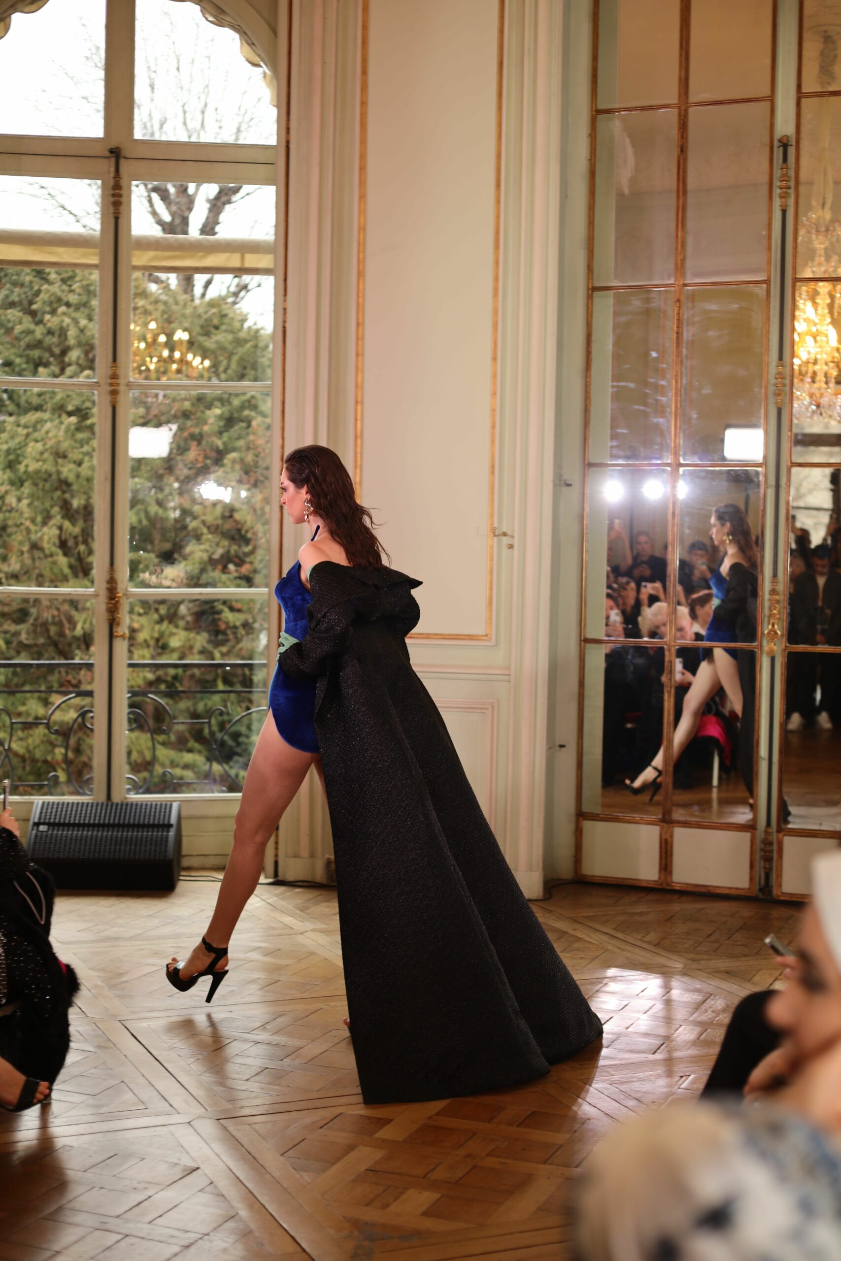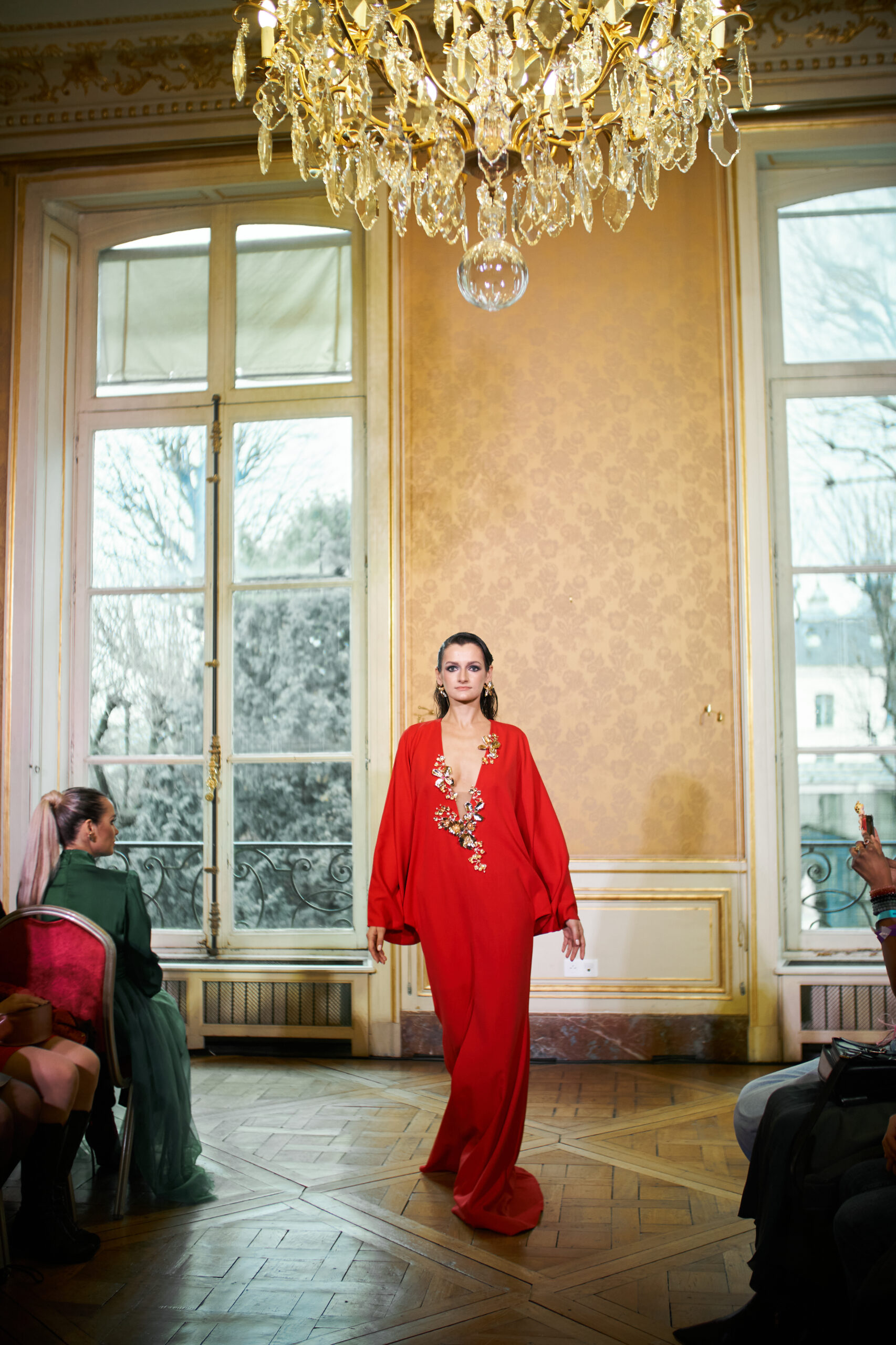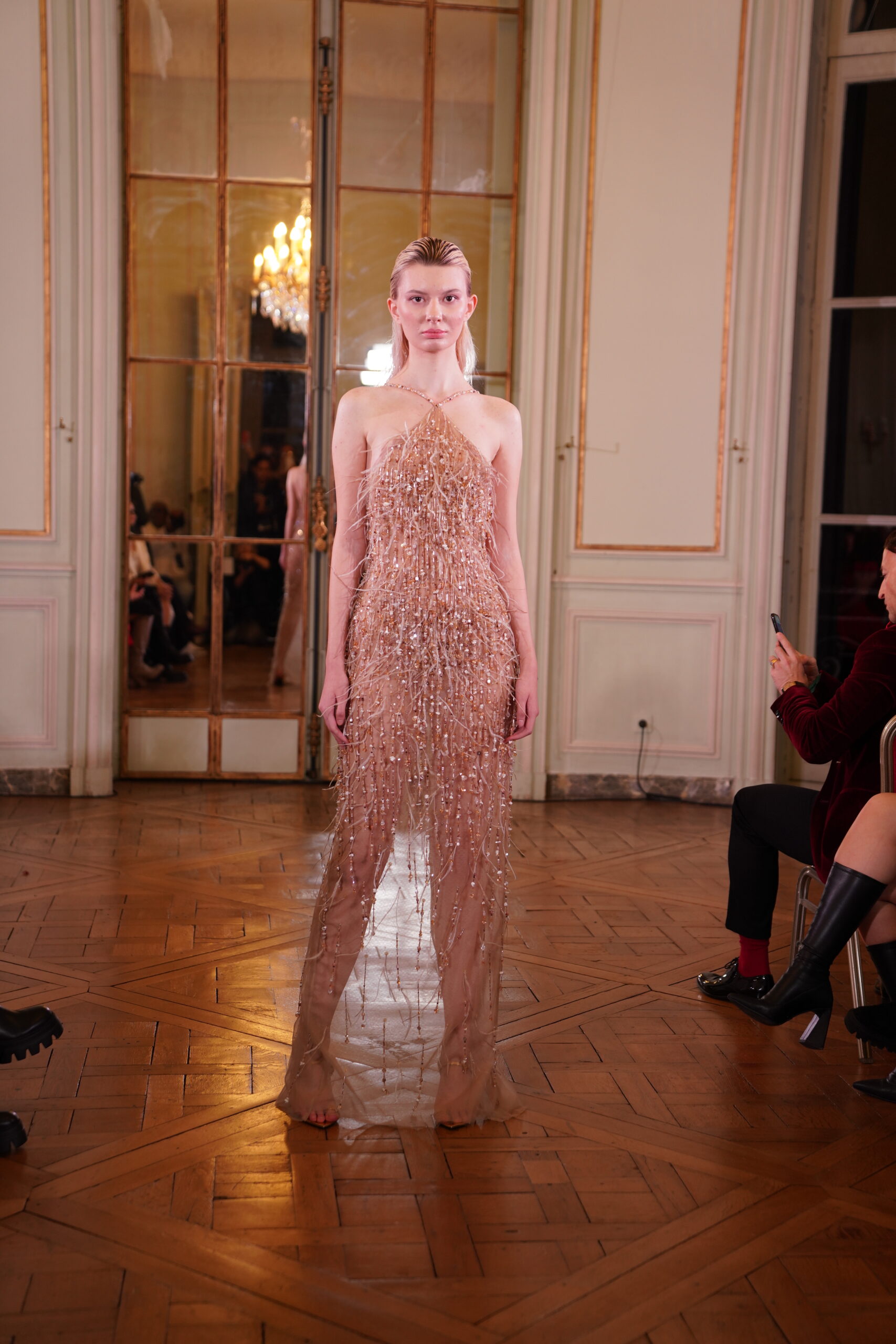 Laith Maalouf a enchanté l’audience avec sa collection inspirée des déesses, Amora: Une Symphonie de Structure et de Fluidité. Fusionnant design structuré et fluidité, chaque création rend hommage aux courbes gracieuses des statues de la Renaissance, incarnant l’essence divine de la déesse Amora à travers draperies aériennes et ornements dorés luxuriants.